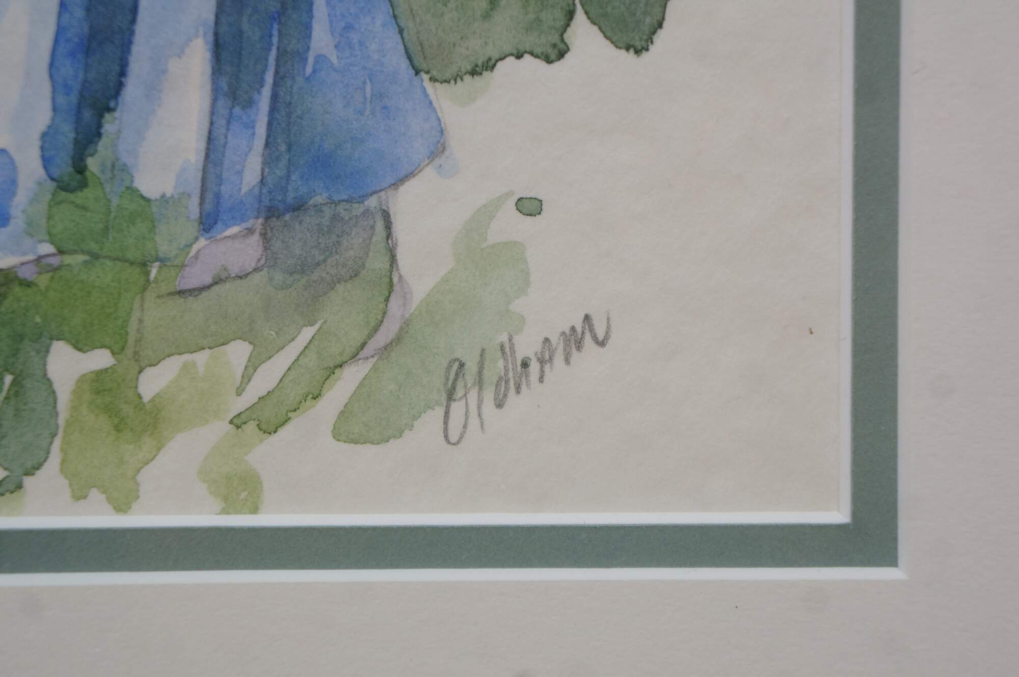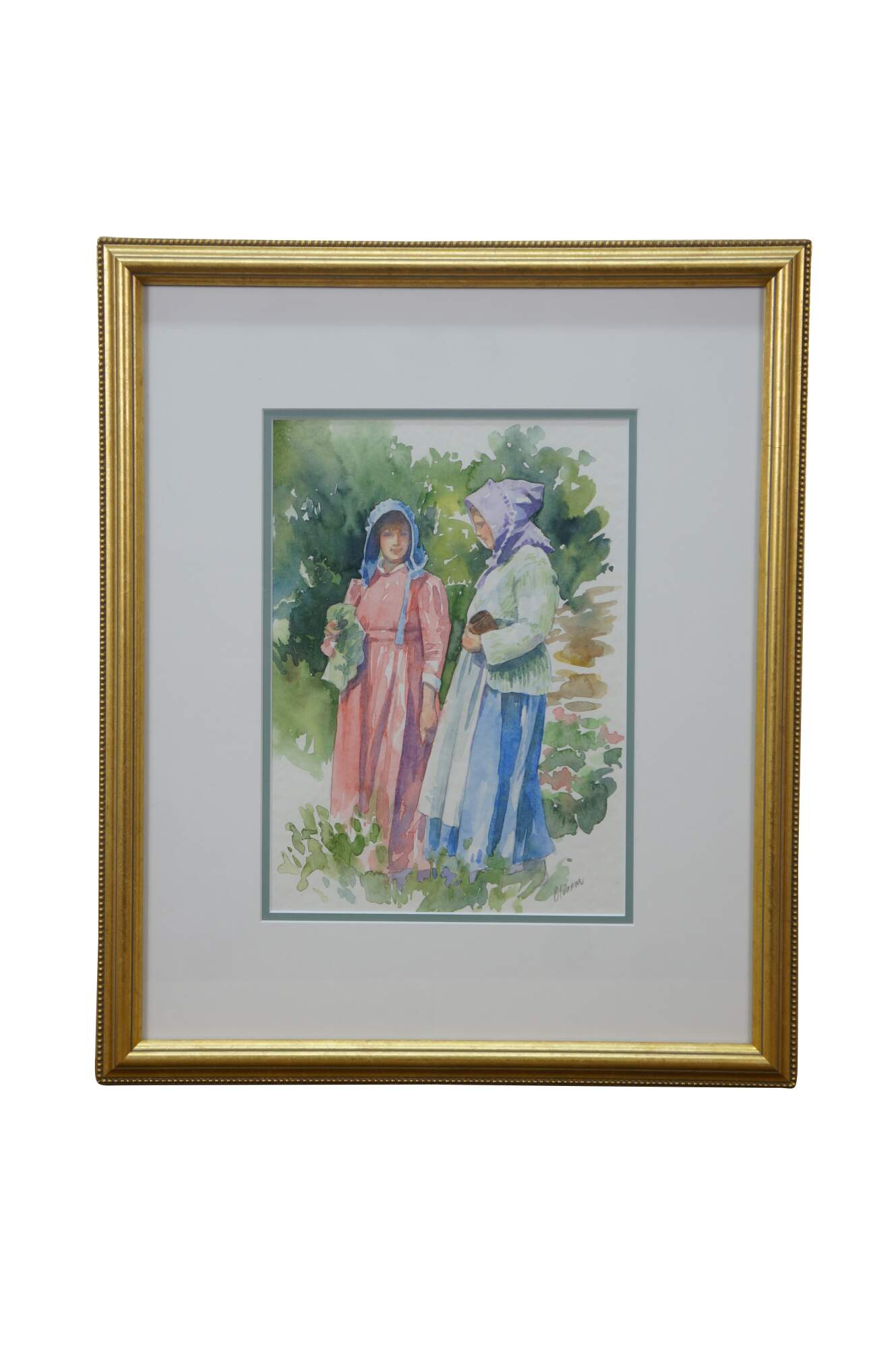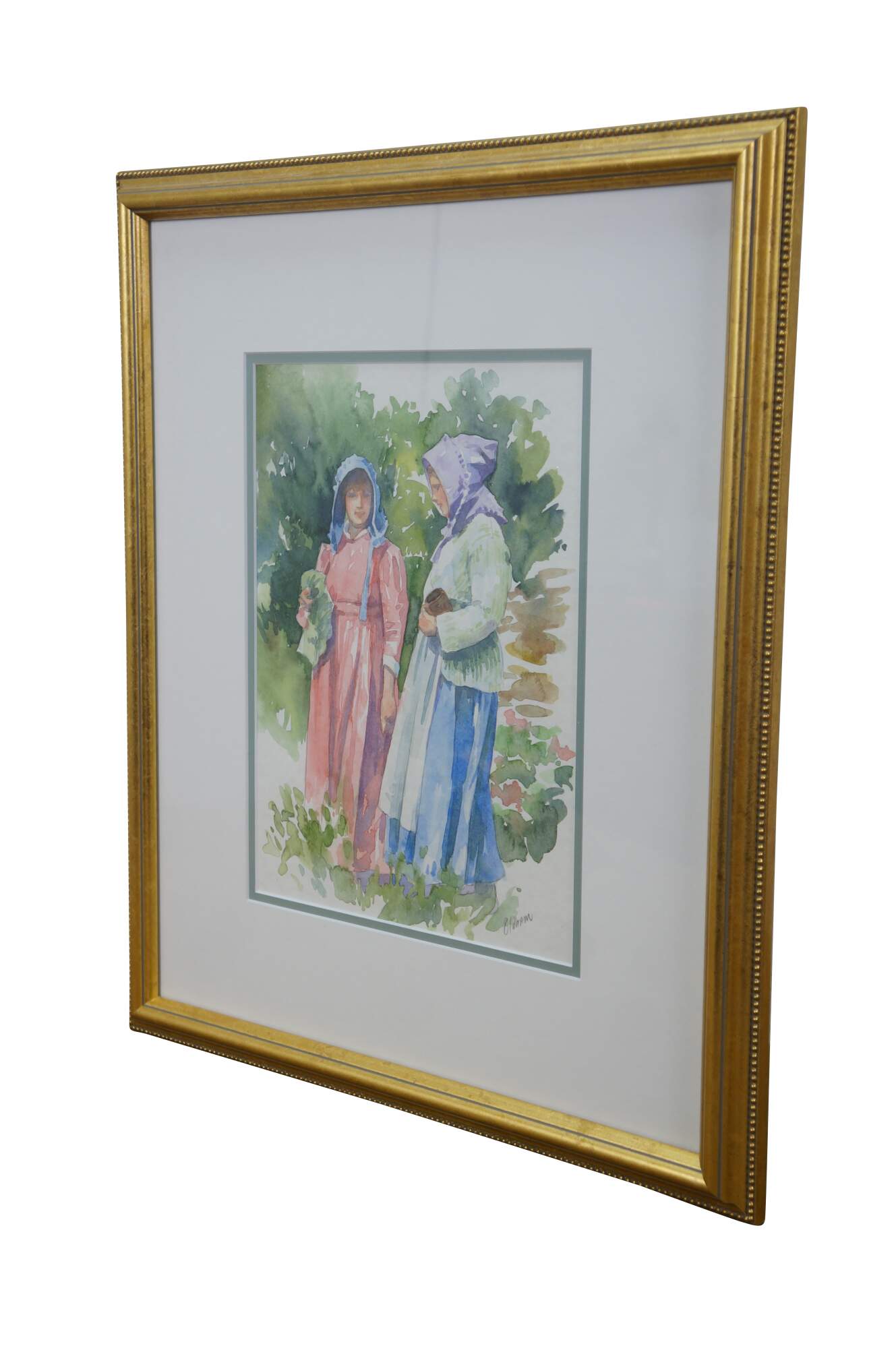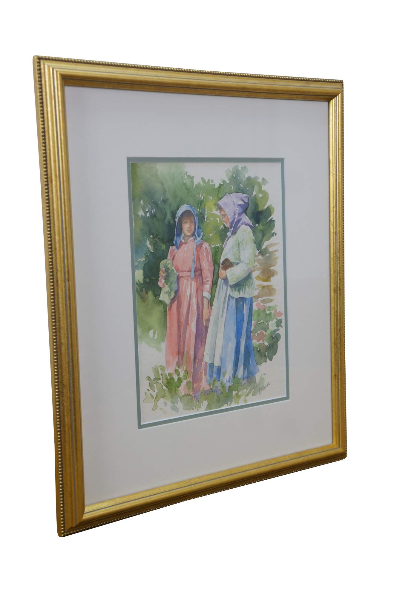 Vintage watercolor painting by Oldham. It features a very well done scene with two women in bonnets conversing in the garden.