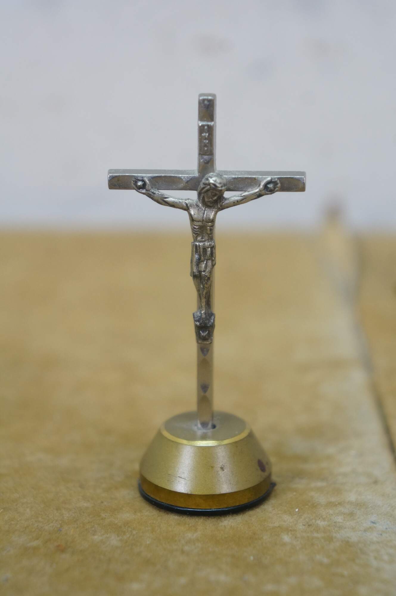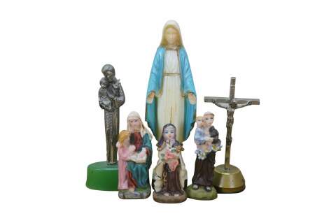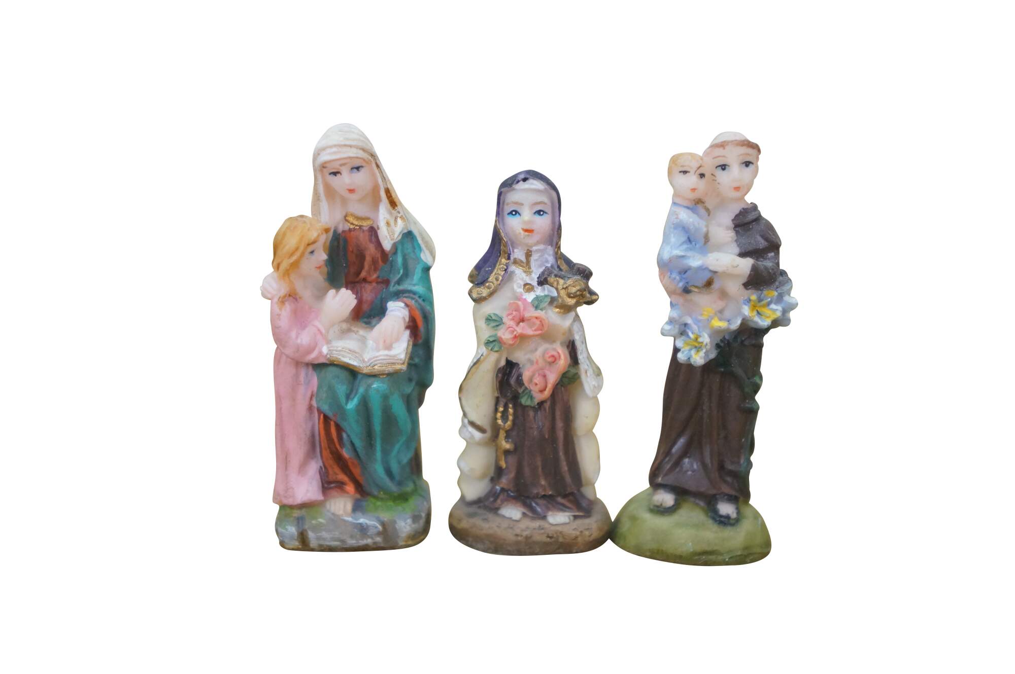 - St. Anthony of Padua figurine, a Catholic saint often depicted holding the Christ Child and lilies. St. Anthony is the patron saint of lost things and miracles. The lily symbolizes his purity, and the Christ Child represents a mystical experience he had during his life. The figurine shows him in a traditional Franciscan robe