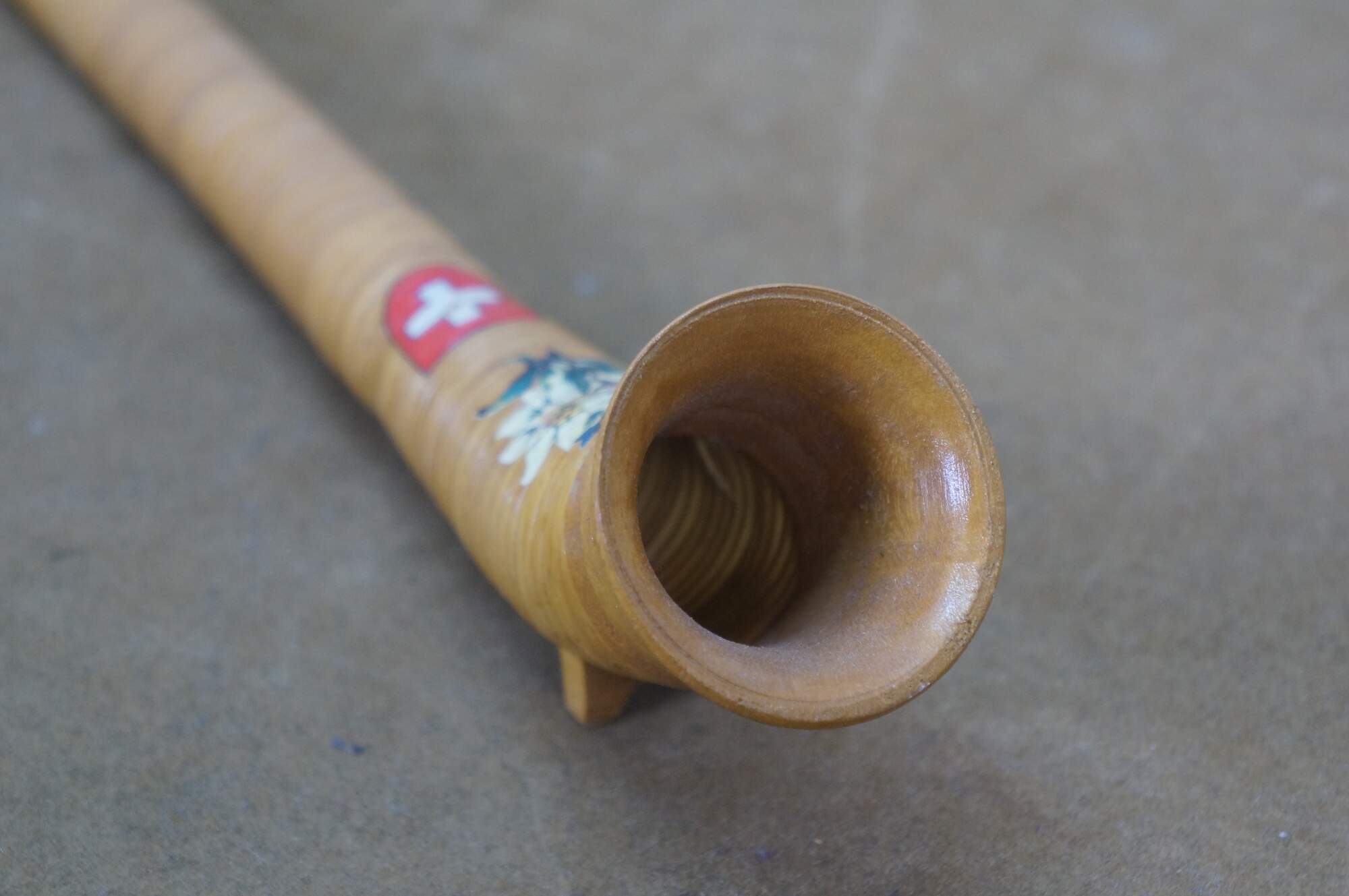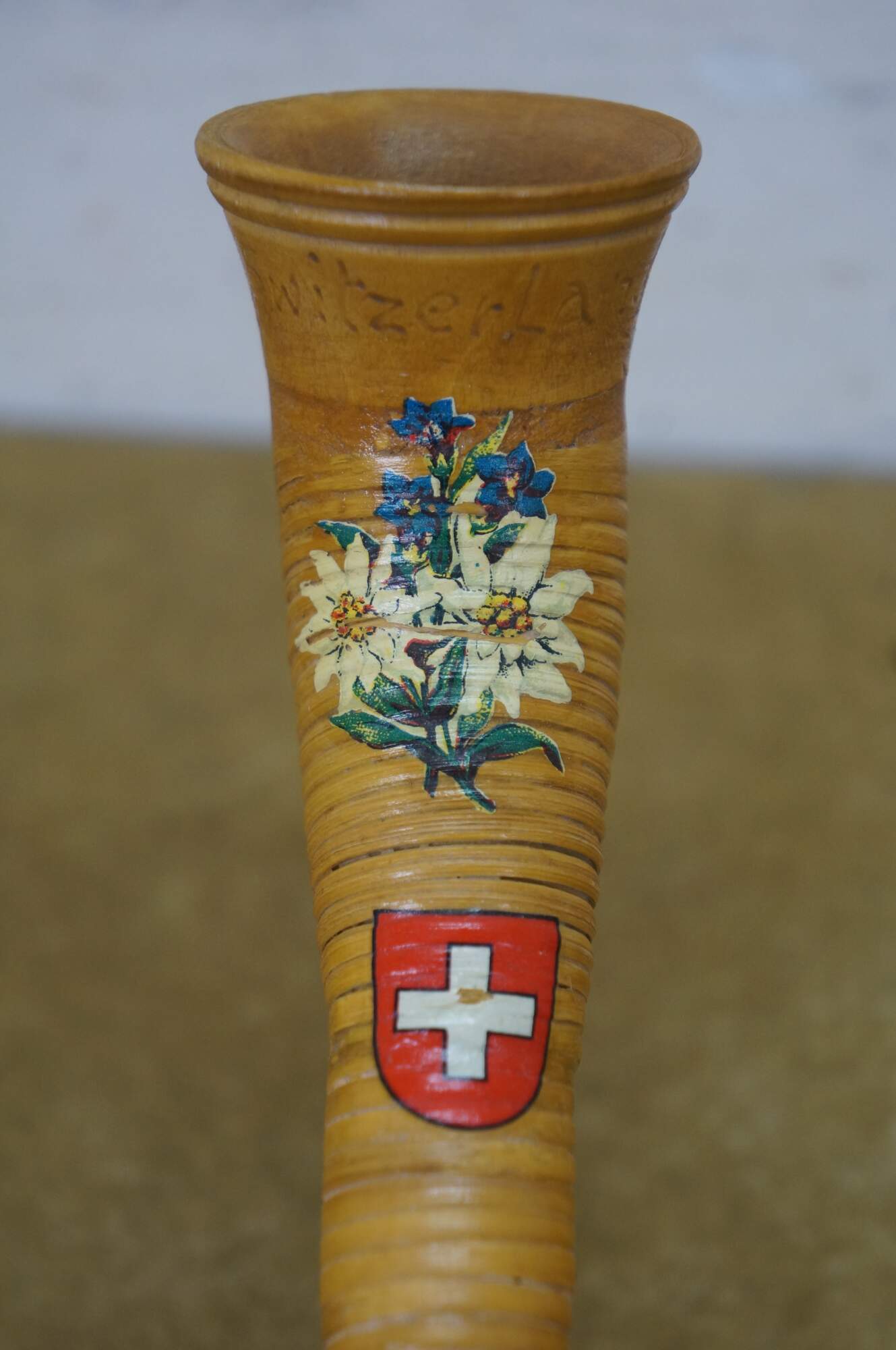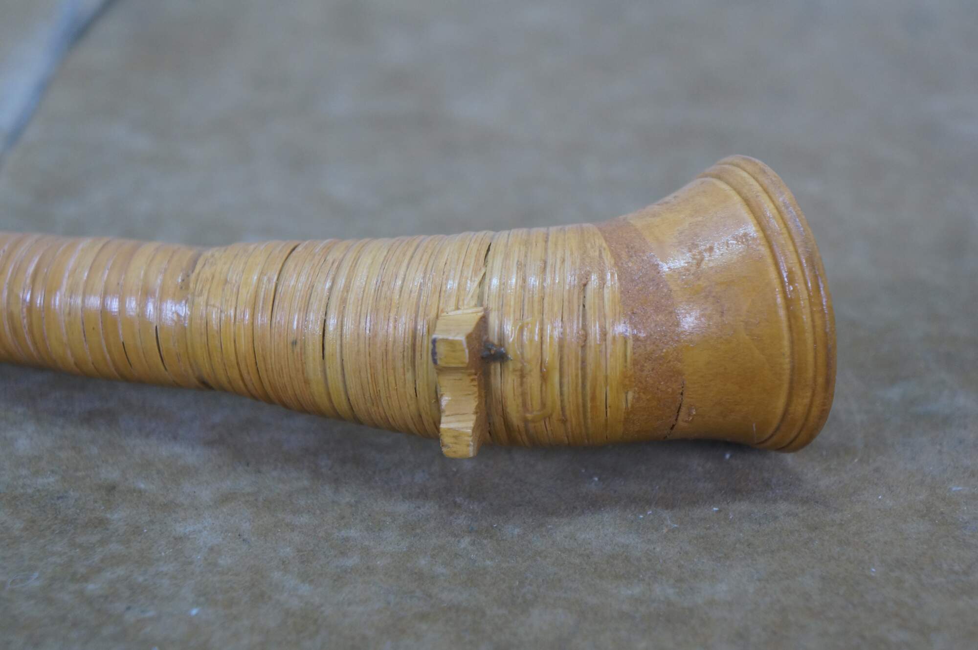 Vintage wicker / rattan Swiss alphorn, a traditional Swiss musical instrument. It is a lip-reed wind instrument, similar to a brass instrument, played by buzzing the lips into a cup-shaped mouthpiece. Traditionally made from solid softwood, such as spruce or pine, it has a conical bore and large ones can measure between 9.8 and 13 feet long. The instrument has no valves and produces notes through lip tension and breath pressure, allowing for a range of several octaves. Historically, it was used by mountain dwellers and shepherds in Switzerland and surrounding regions as a means of communication across valleys.