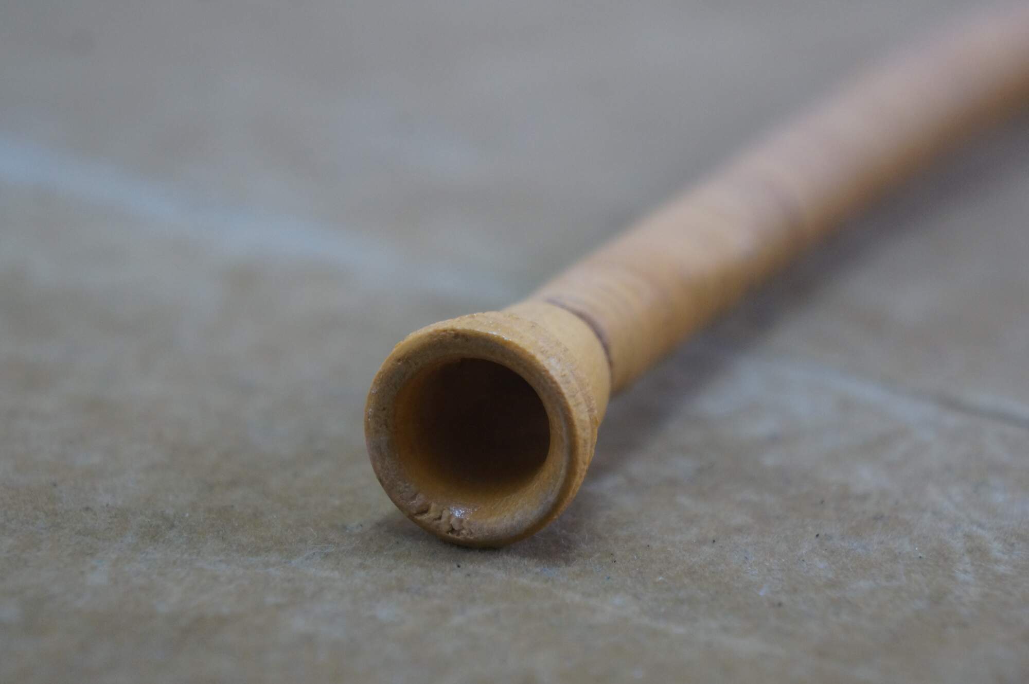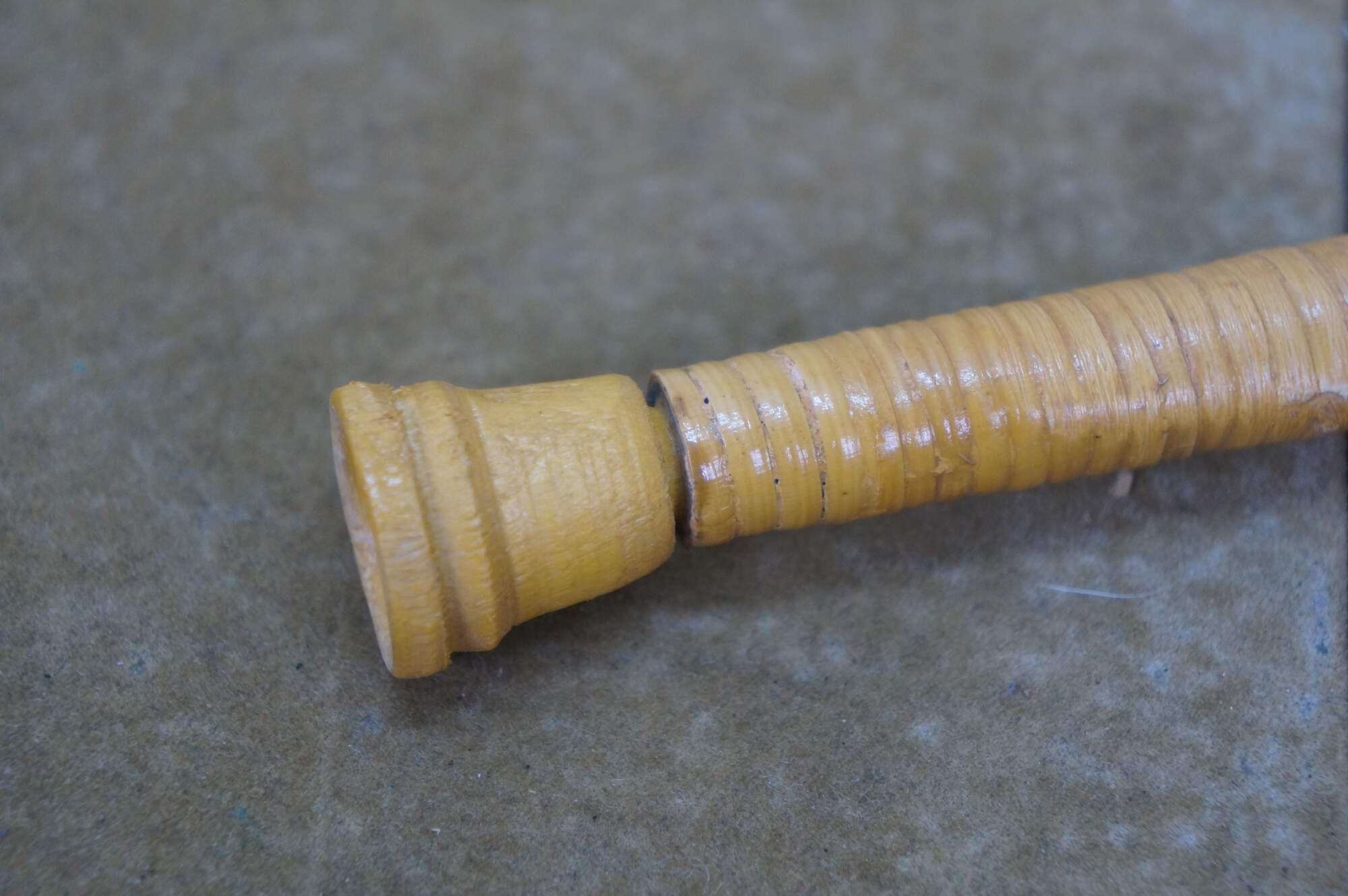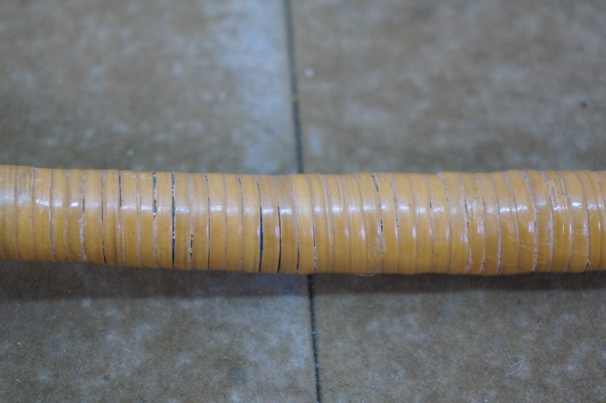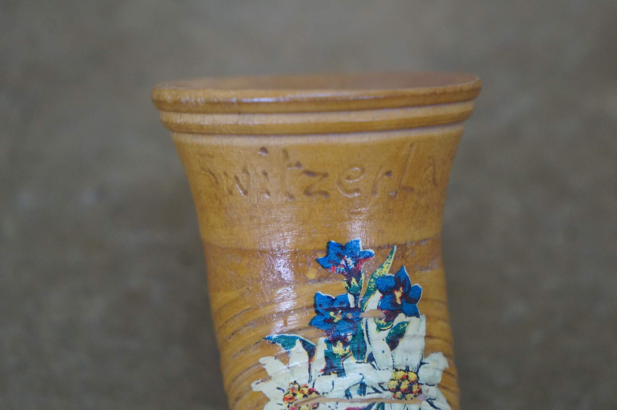 Vintage wicker / rattan Swiss alphorn, a traditional Swiss musical instrument. It is a lip-reed wind instrument, similar to a brass instrument, played by buzzing the lips into a cup-shaped mouthpiece. Traditionally made from solid softwood, such as spruce or pine, it has a conical bore and large ones can measure between 9.8 and 13 feet long. The instrument has no valves and produces notes through lip tension and breath pressure, allowing for a range of several octaves. Historically, it was used by mountain dwellers and shepherds in Switzerland and surrounding regions as a means of communication across valleys.