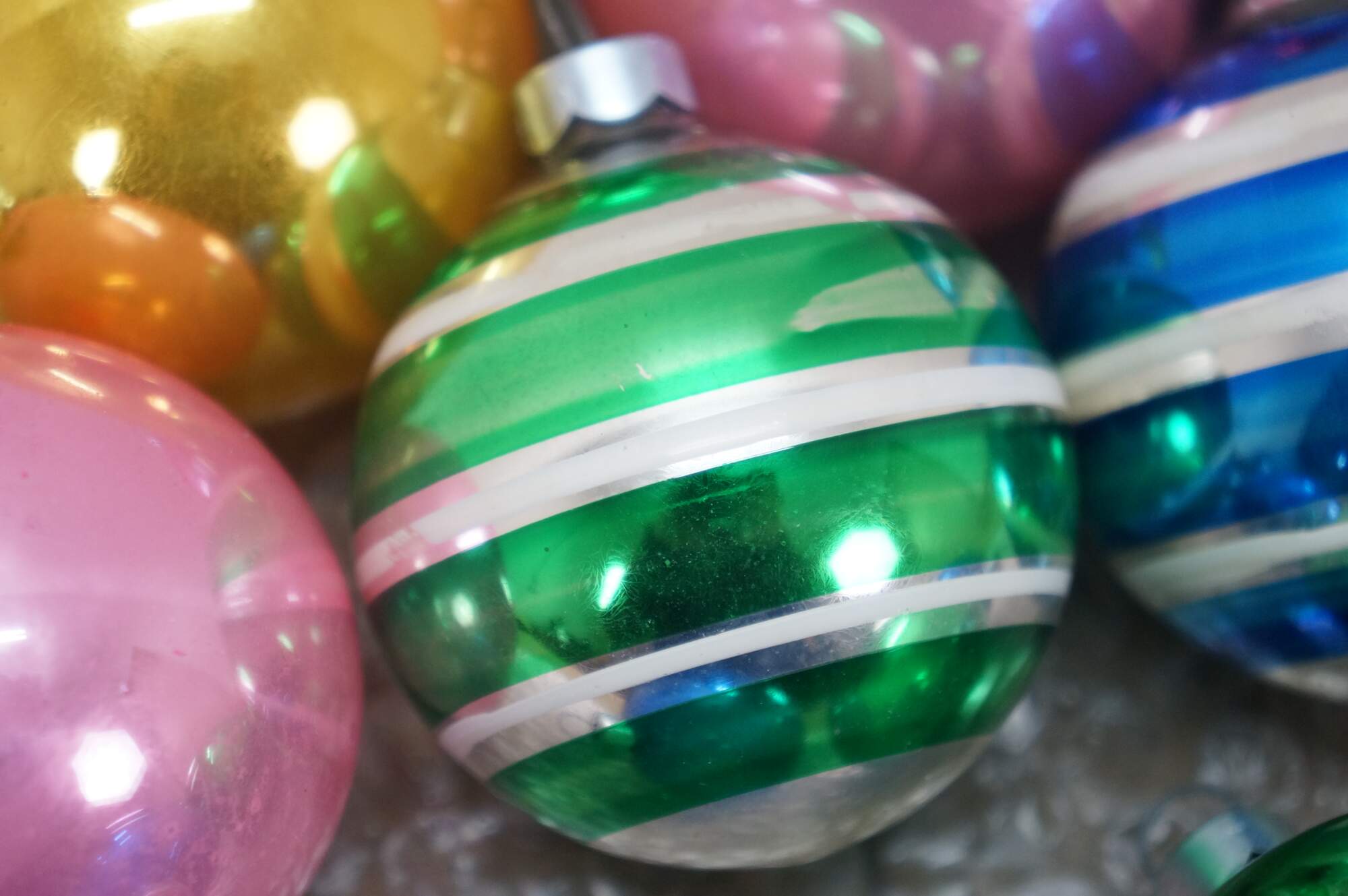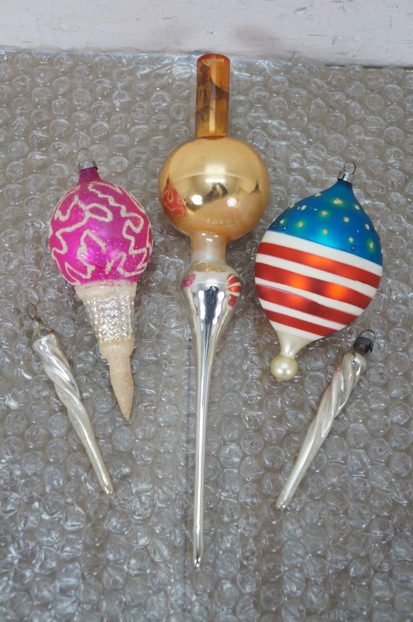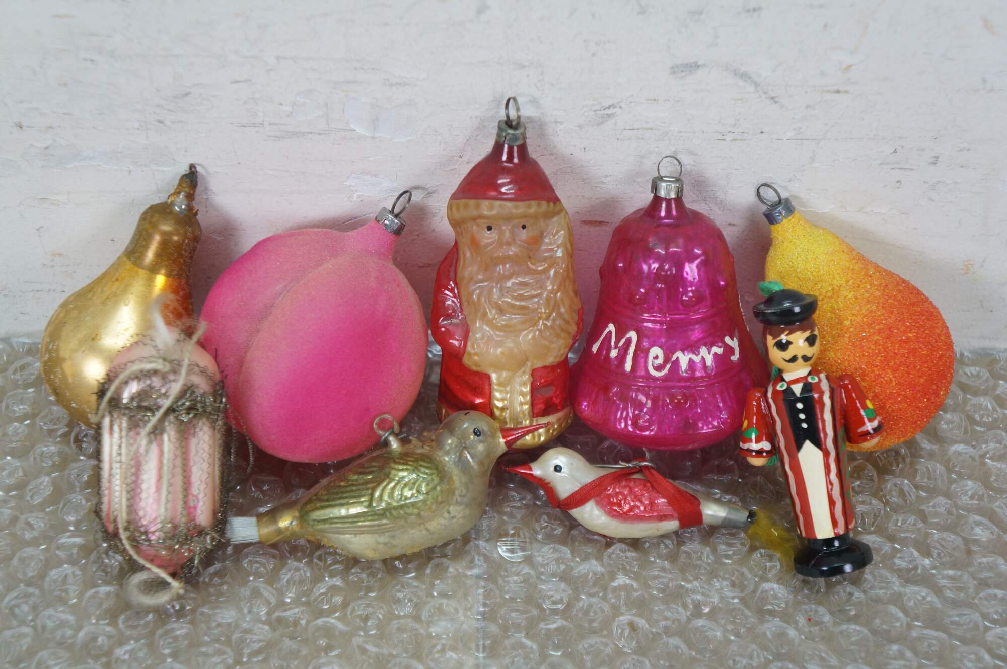 Vintage lot of mercury glass Christmas tree ornaments. Many traditional round solid and striped, with frosted accednts, some birds, bells, and peaches, and an antique German Santa.