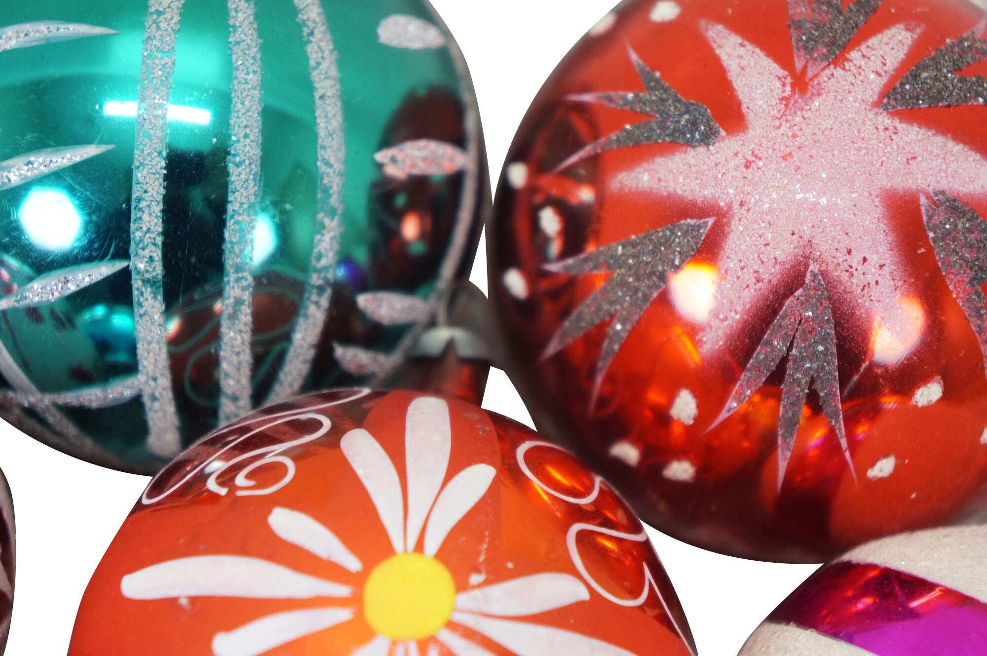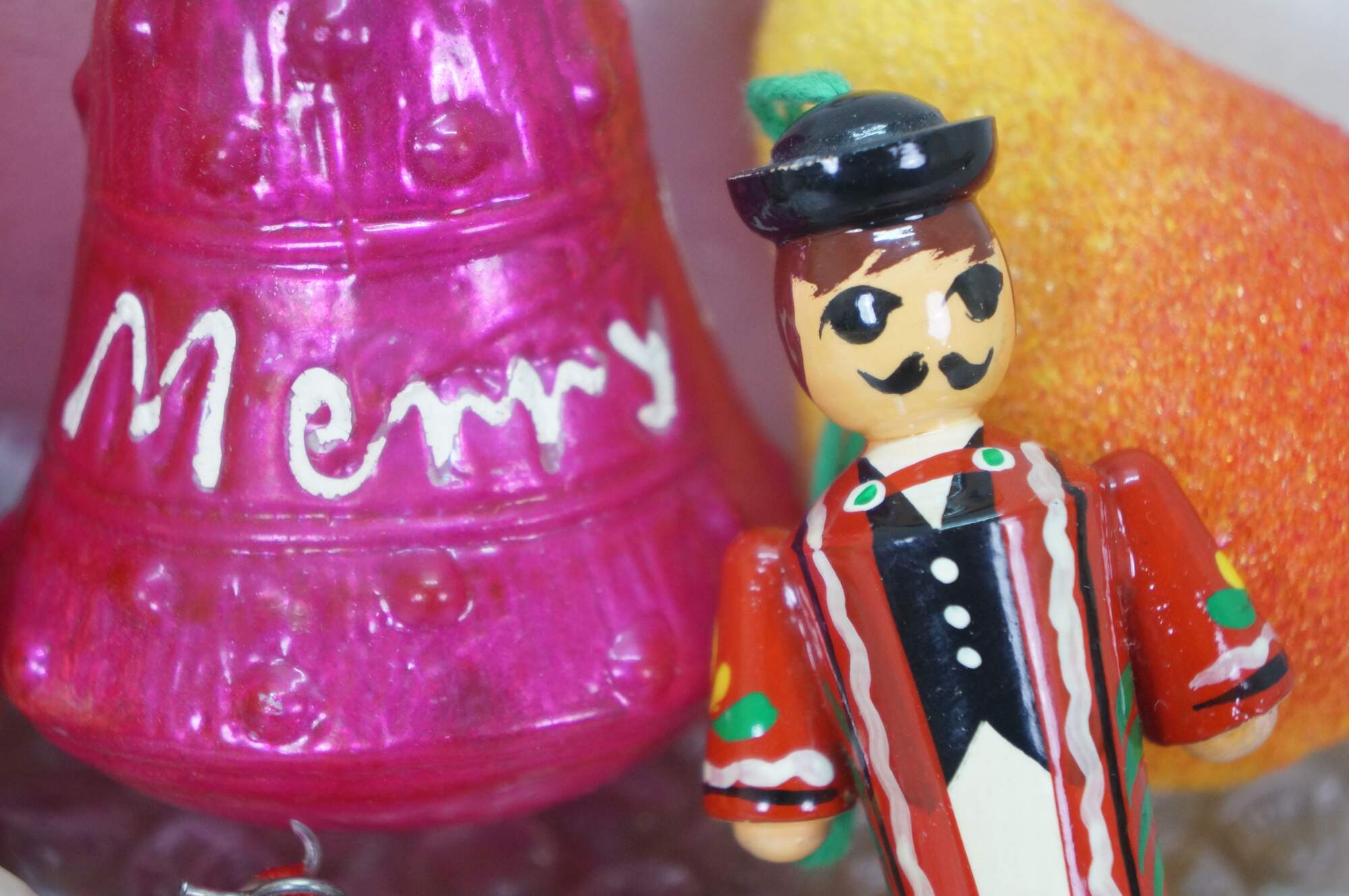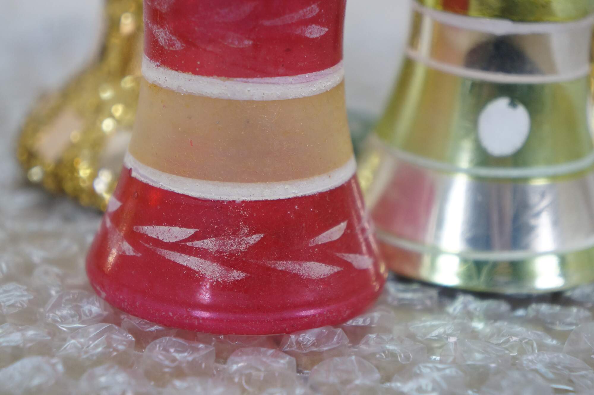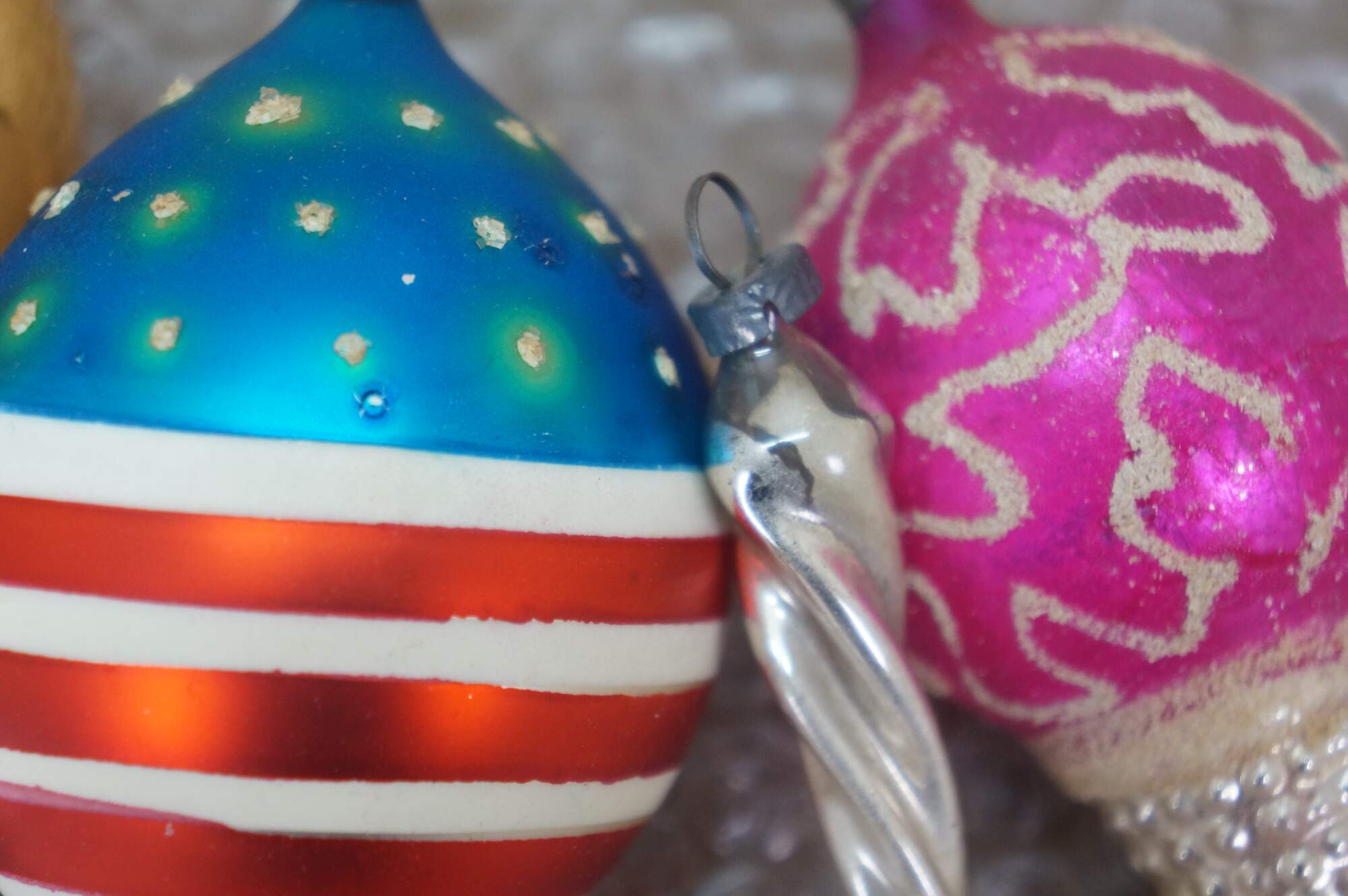 Vintage lot of mercury glass Christmas tree ornaments. Many traditional round solid and striped, with frosted accednts, some birds, bells, and peaches, and an antique German Santa.