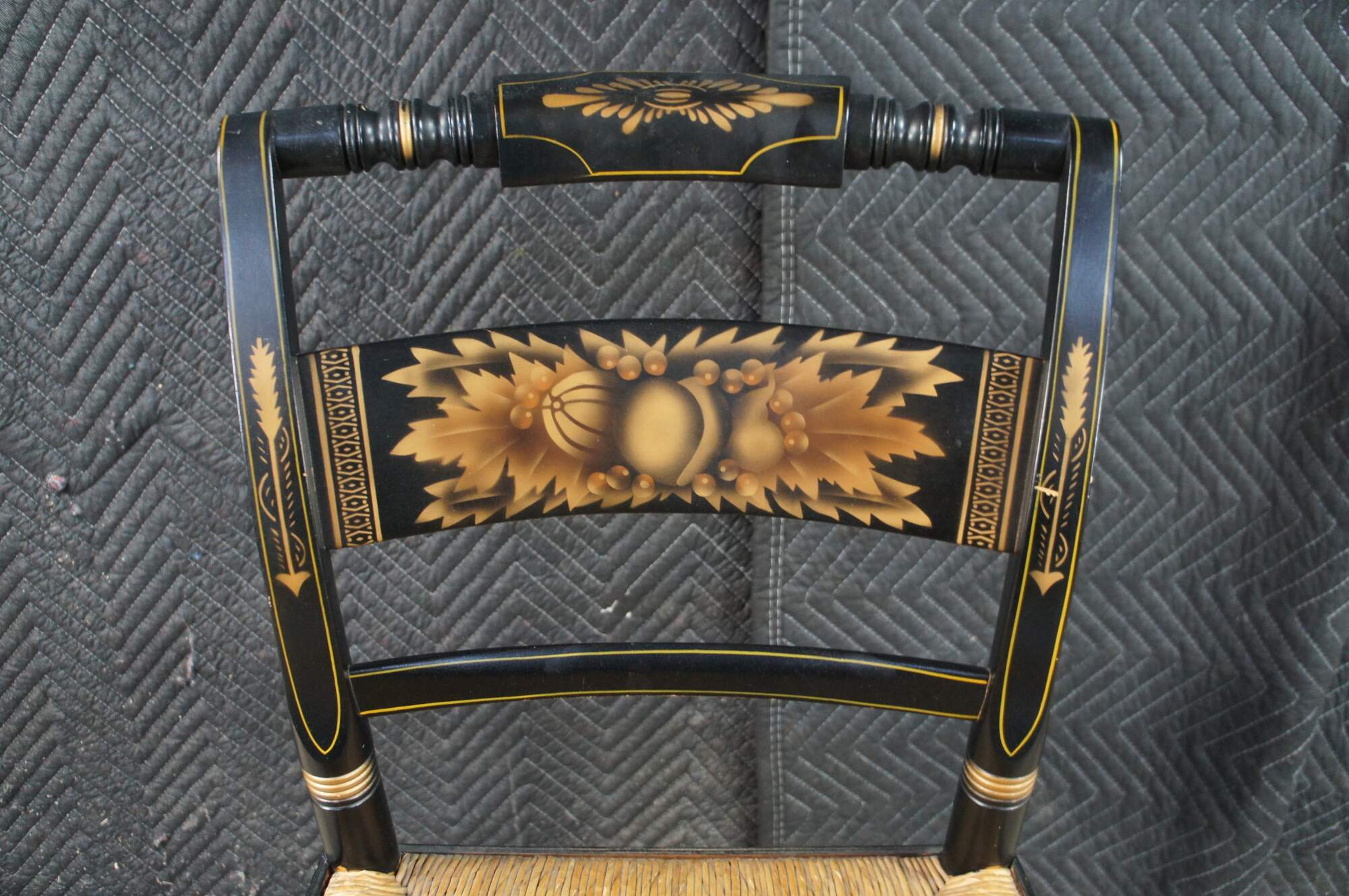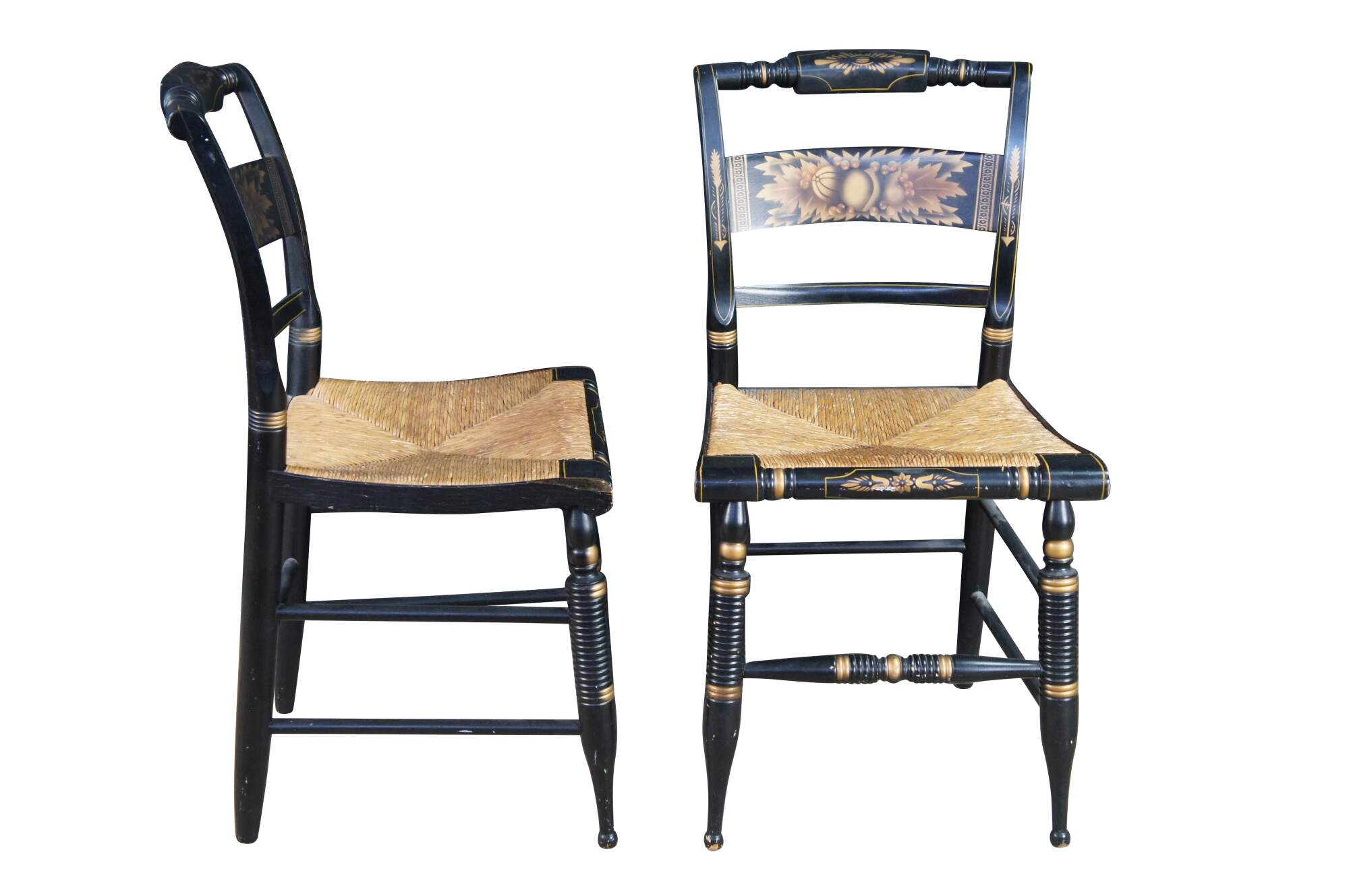 Two antique early 20th Century original L. Hitchcock Harvest Windsor dining chairs. Made with an ebonized finish, gold stenciled accents, and woven rush seat.
