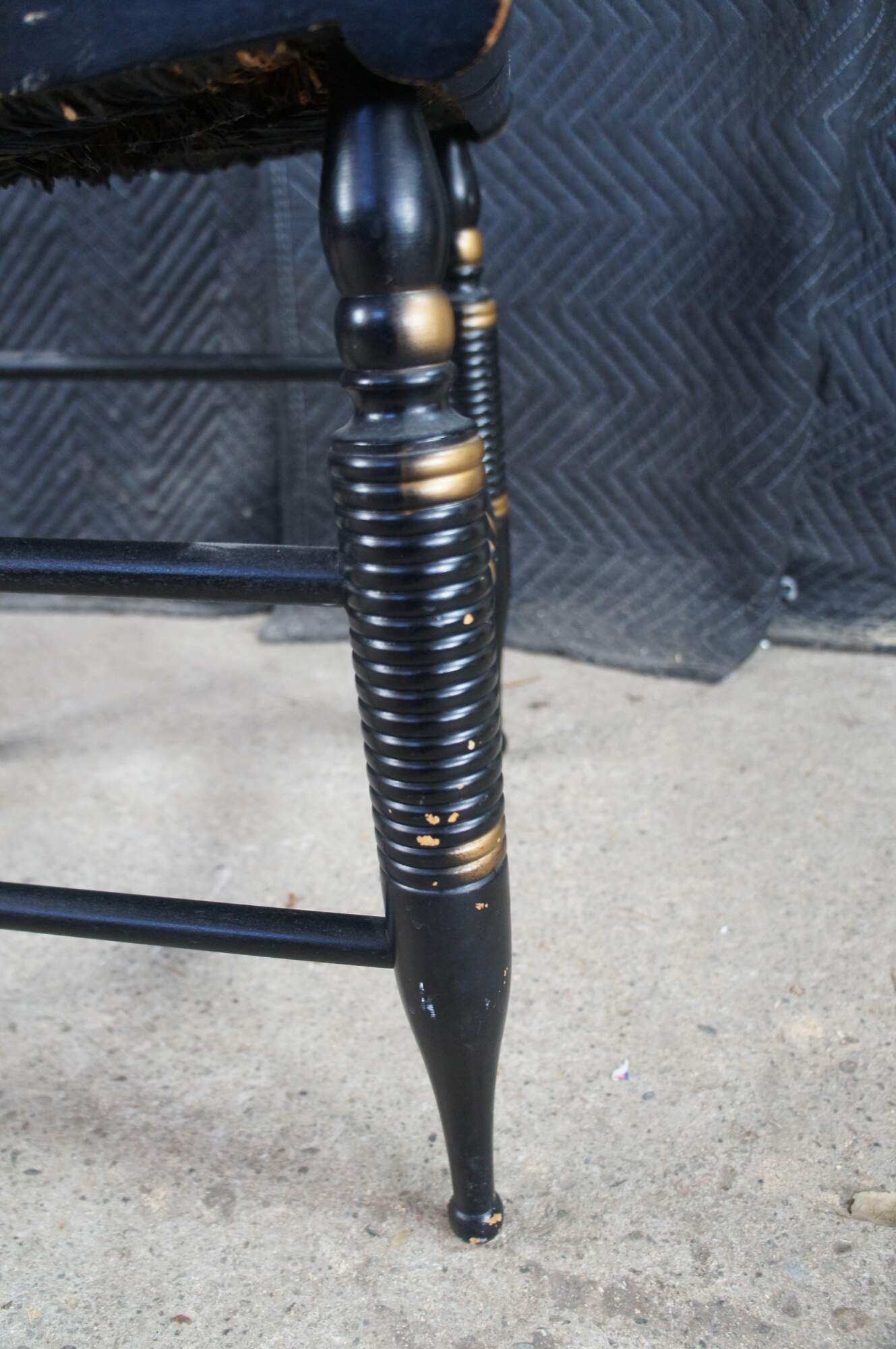 The raw assembled frames were painted black or dark green and received a first coat of clear finish. While the finish was still slightly tacky Hitchcock borrowed the newly developed British technique of “stenciling” to richly decorate the otherwise rather plain chairs. Using a variety of metal stencils, as many as five different ones on a single chair, different colors of metallic powders were applied by brush to produce the mostly floral designs seen on the ubiquitous “Hitchcock” chair of the 1820s. To further reduce the cost, Hitchcock used laborers from a nearby prison to weave cane and rush seats for his chairs.