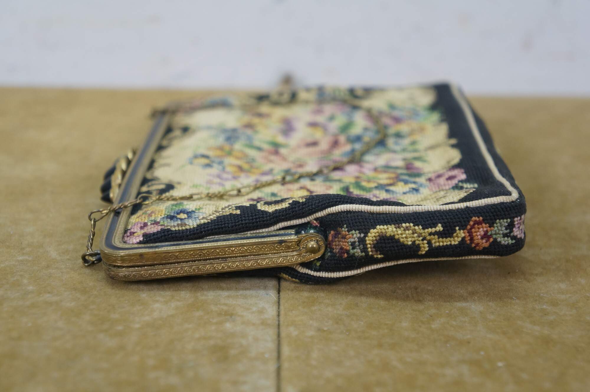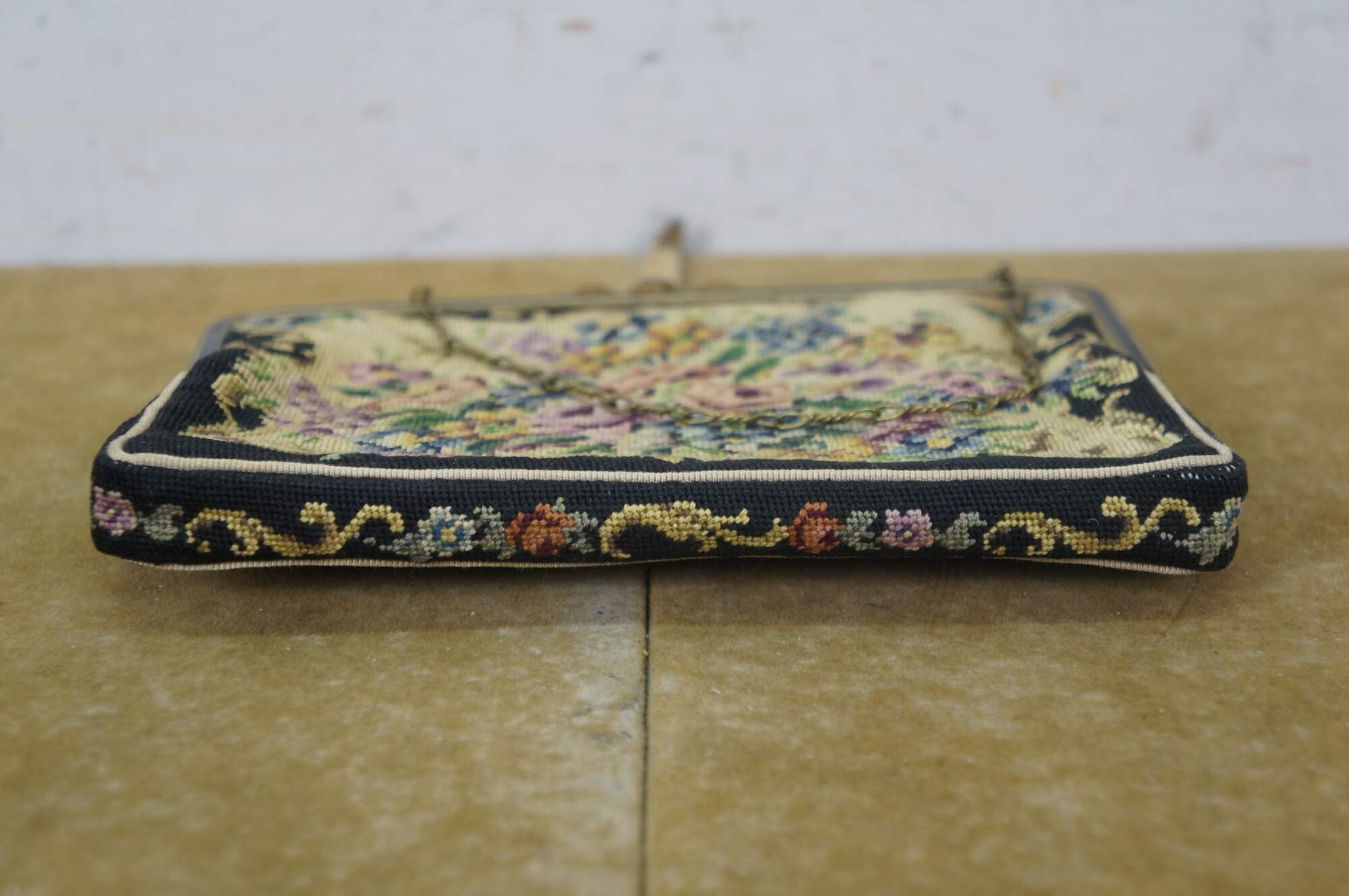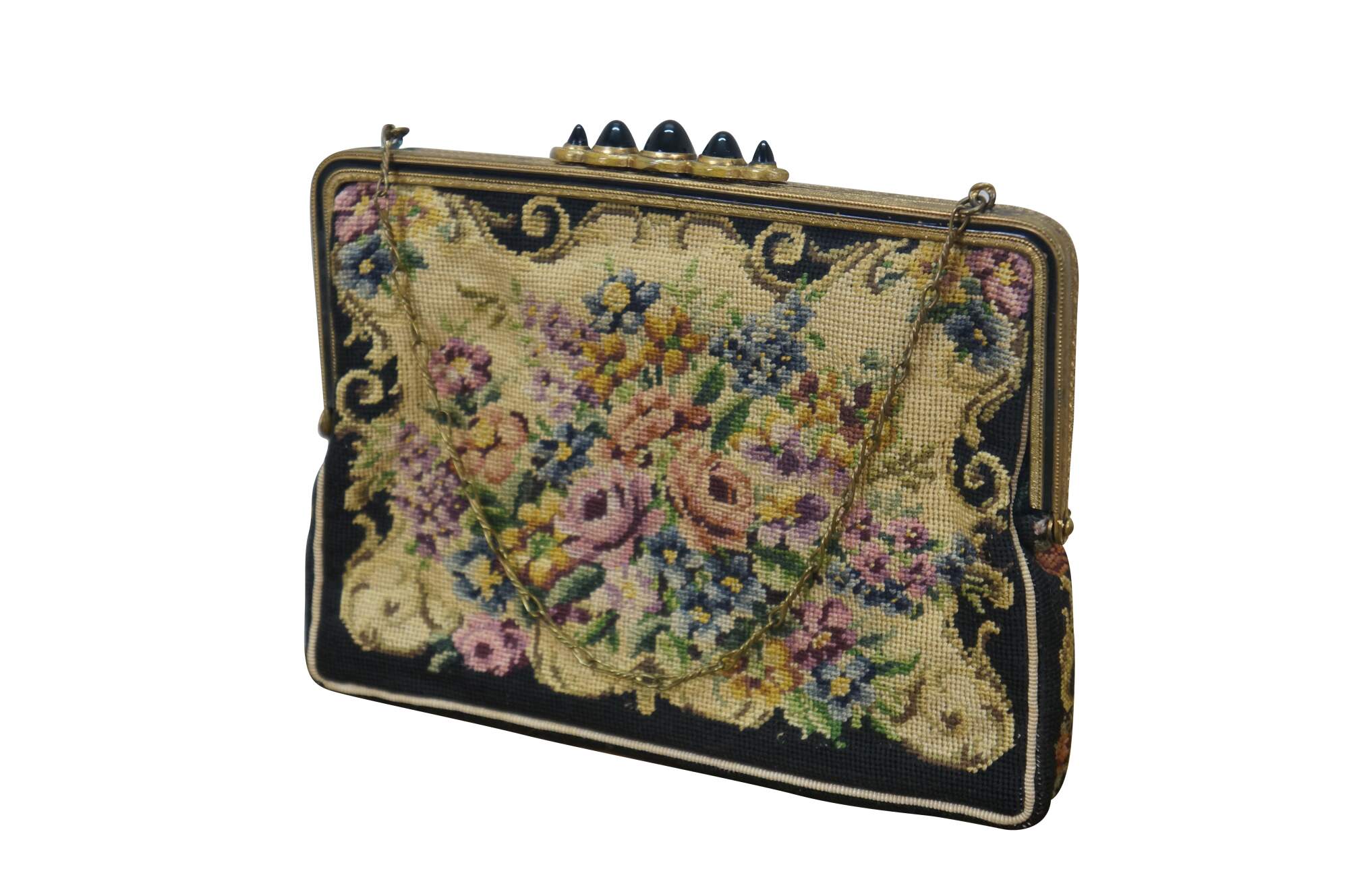 Mid century embroidered floral clutch purse evening bag with rhinestone clasp and wire mesh strap.