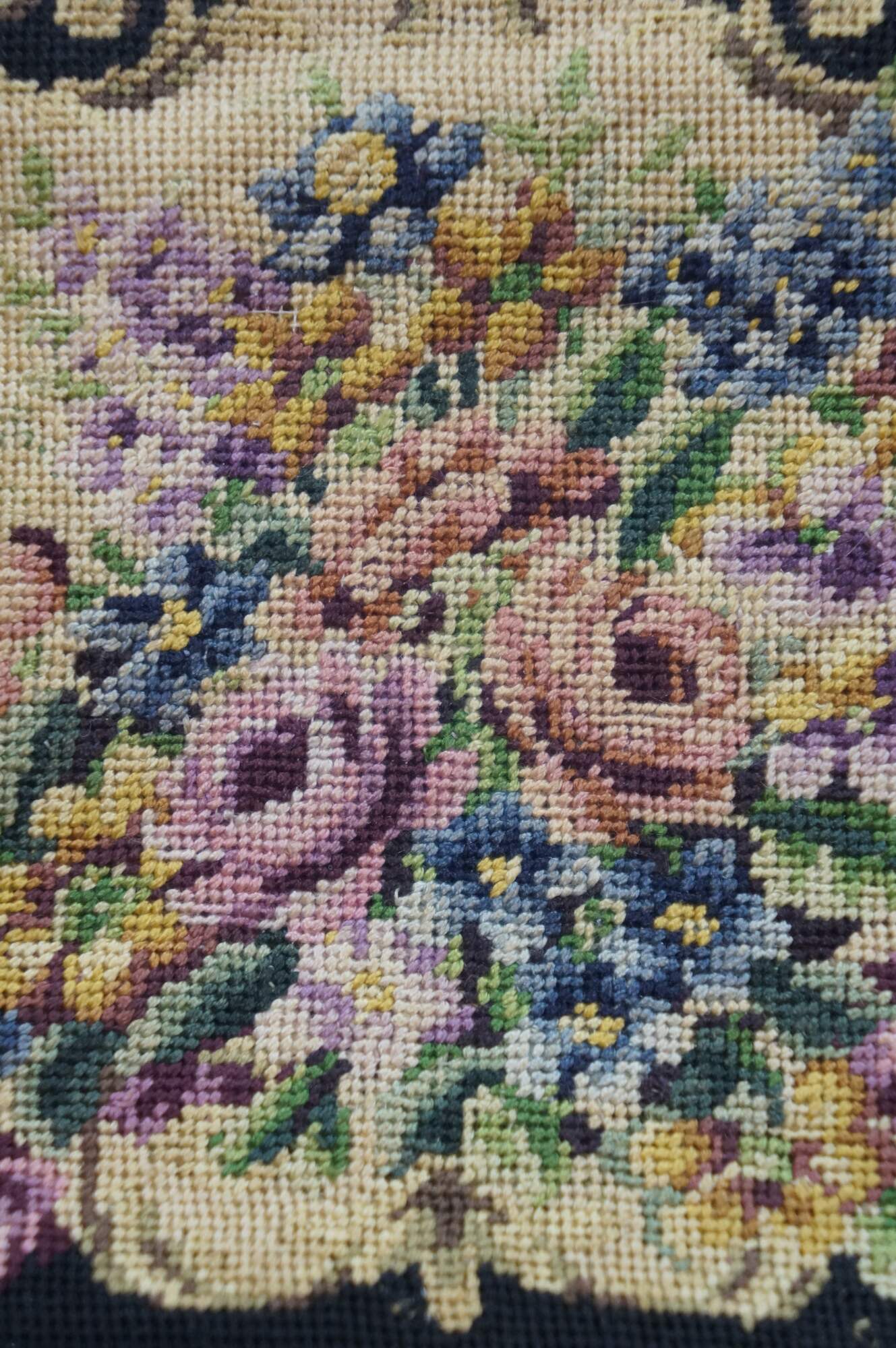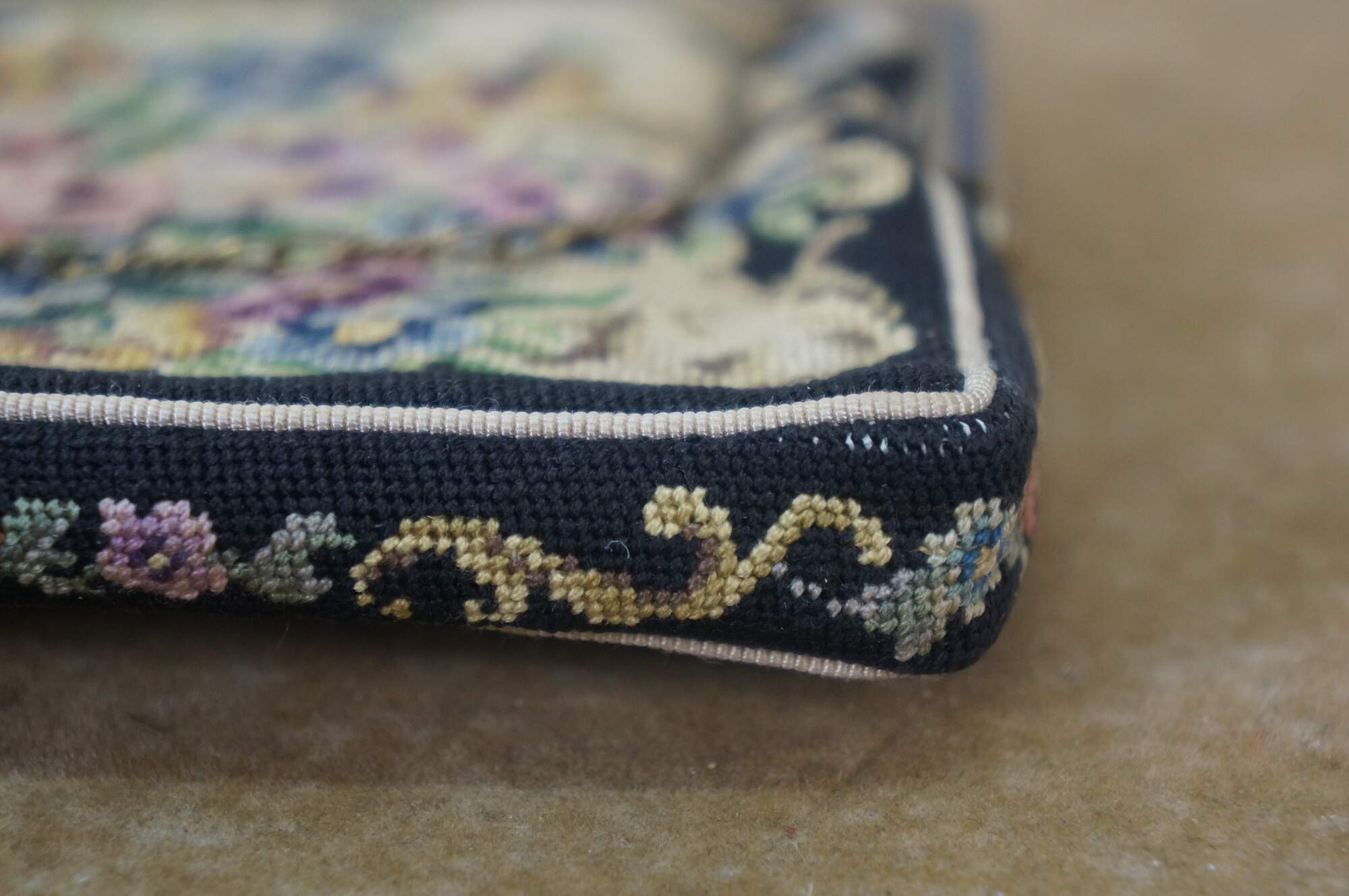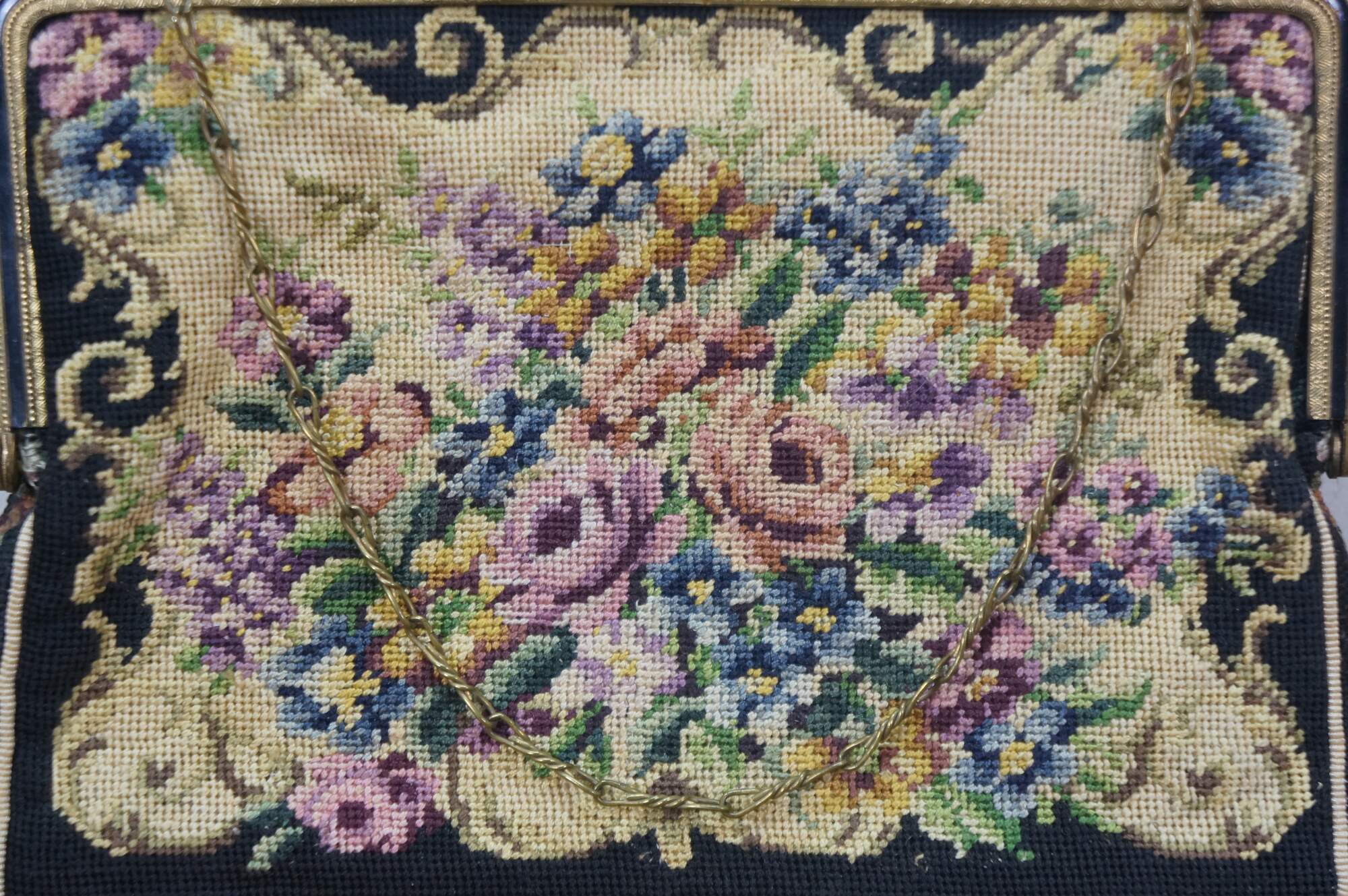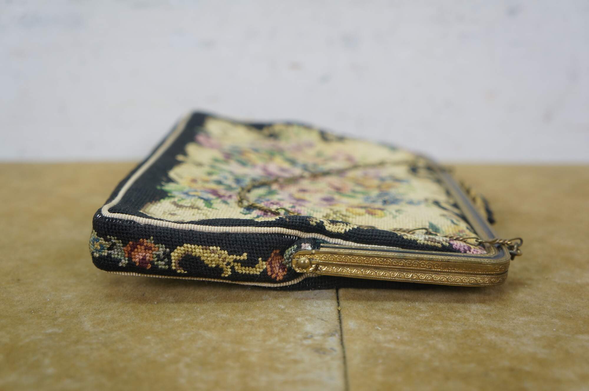 Mid century embroidered floral clutch purse evening bag with rhinestone clasp and wire mesh strap.