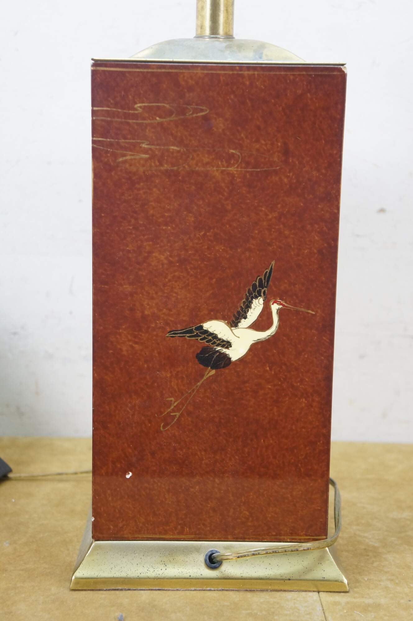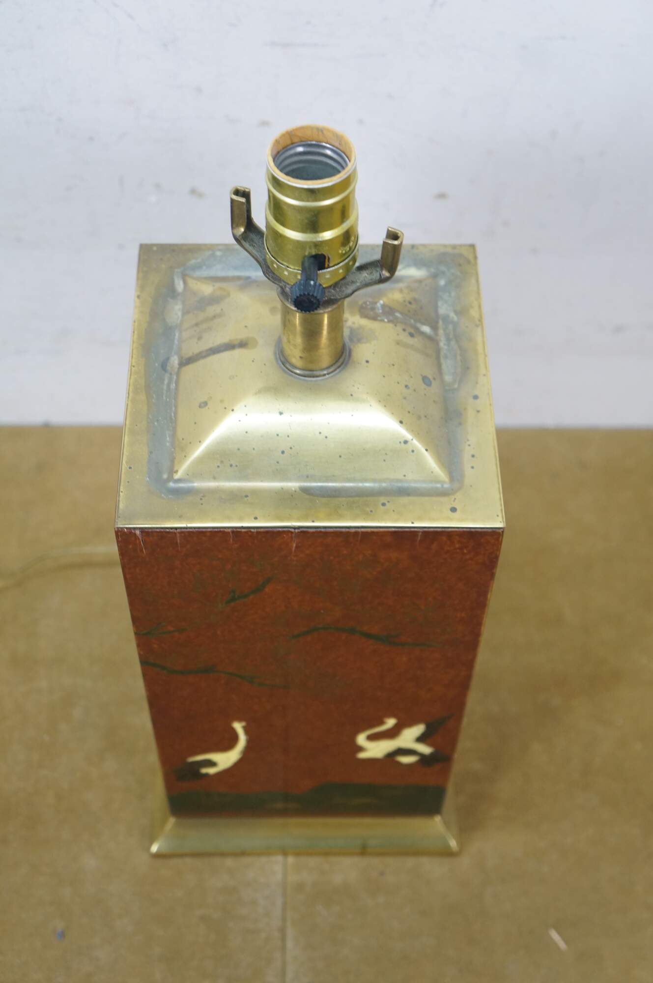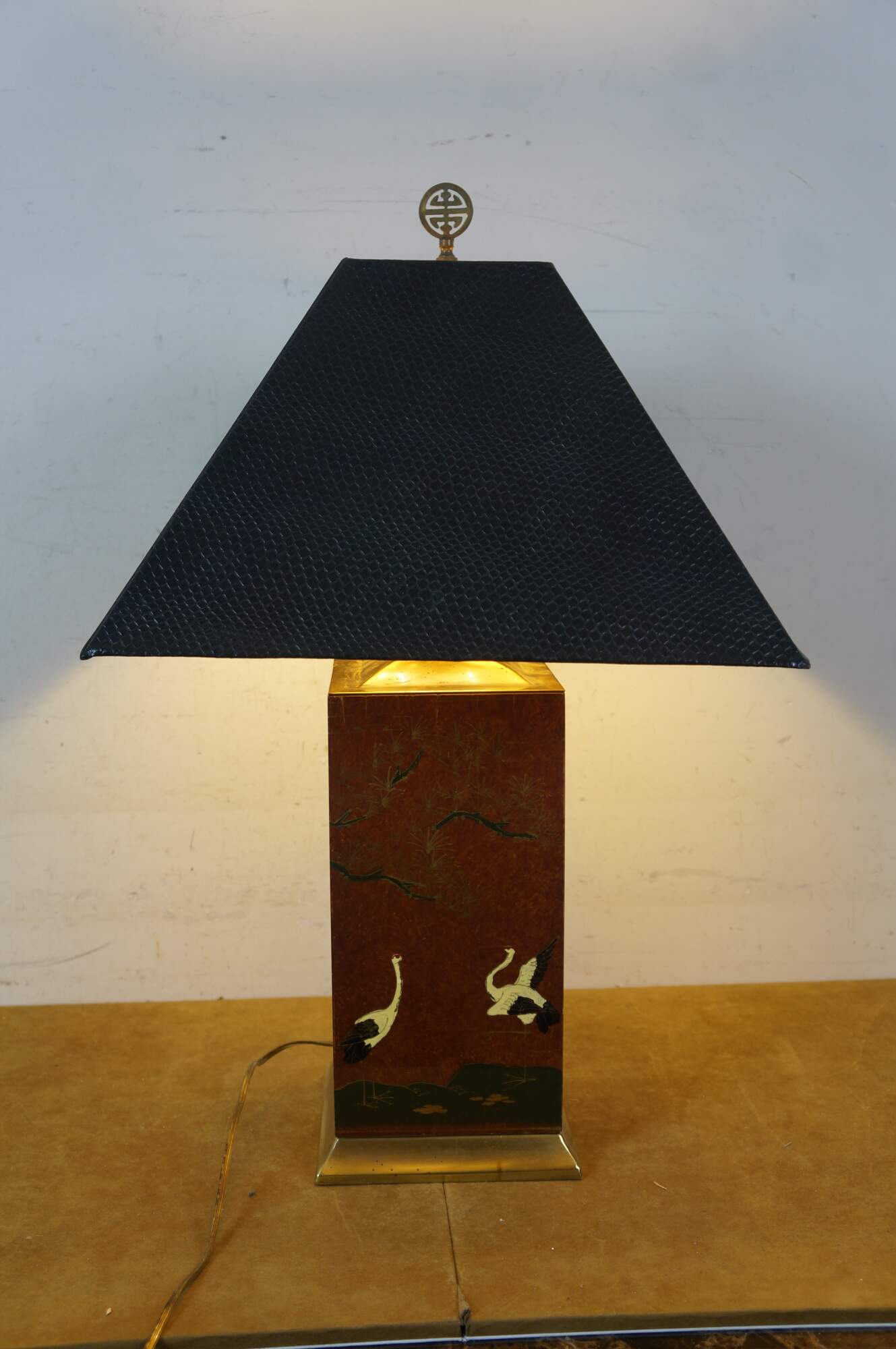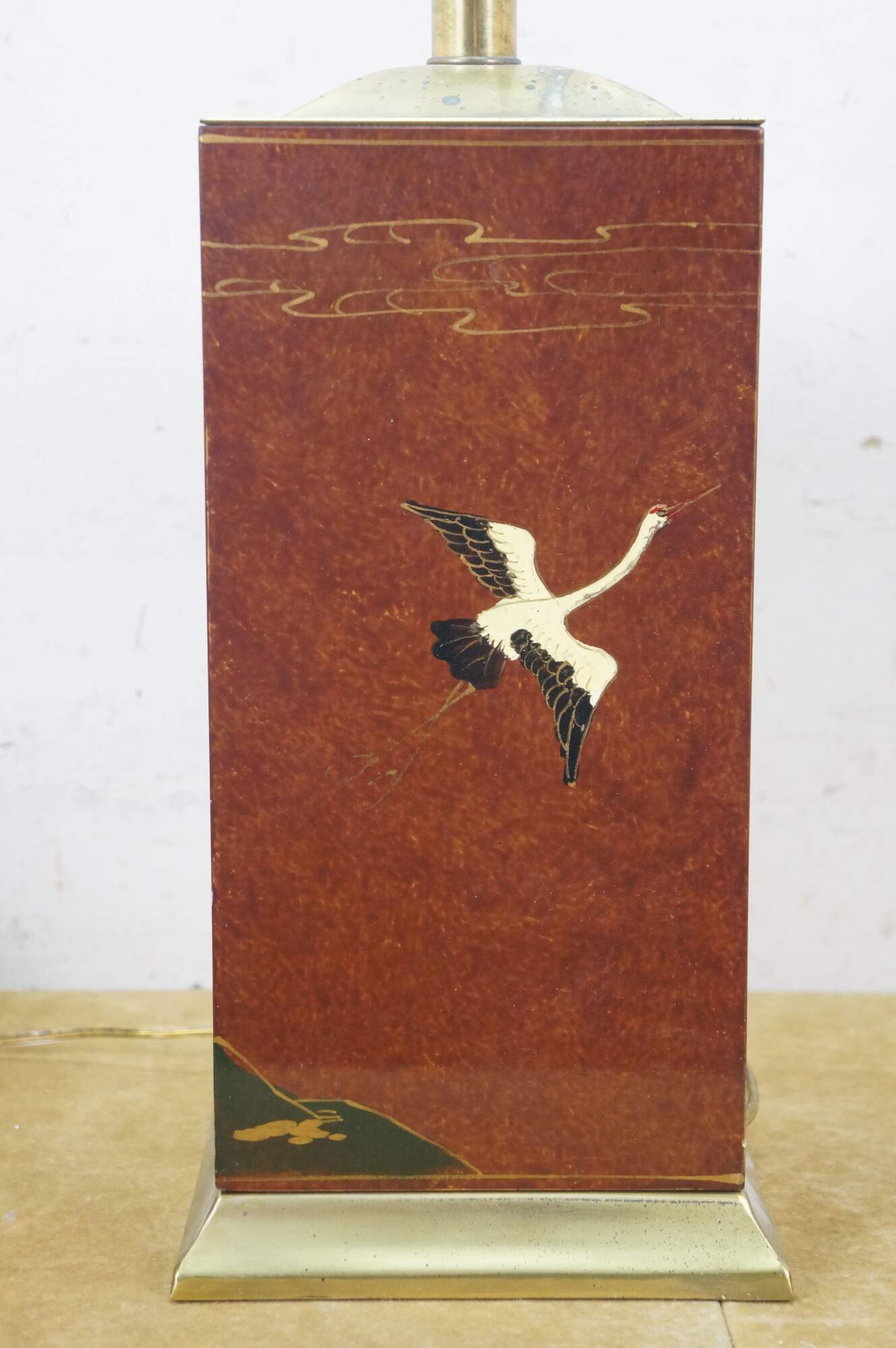 Beautiful vintage Chinese / Asian / Chinoiserie table lamp with a painted landscape scene of crane birds and gnarled pine trees with gilt details and brass base. Tooled leather shade and filigree medallion finial.