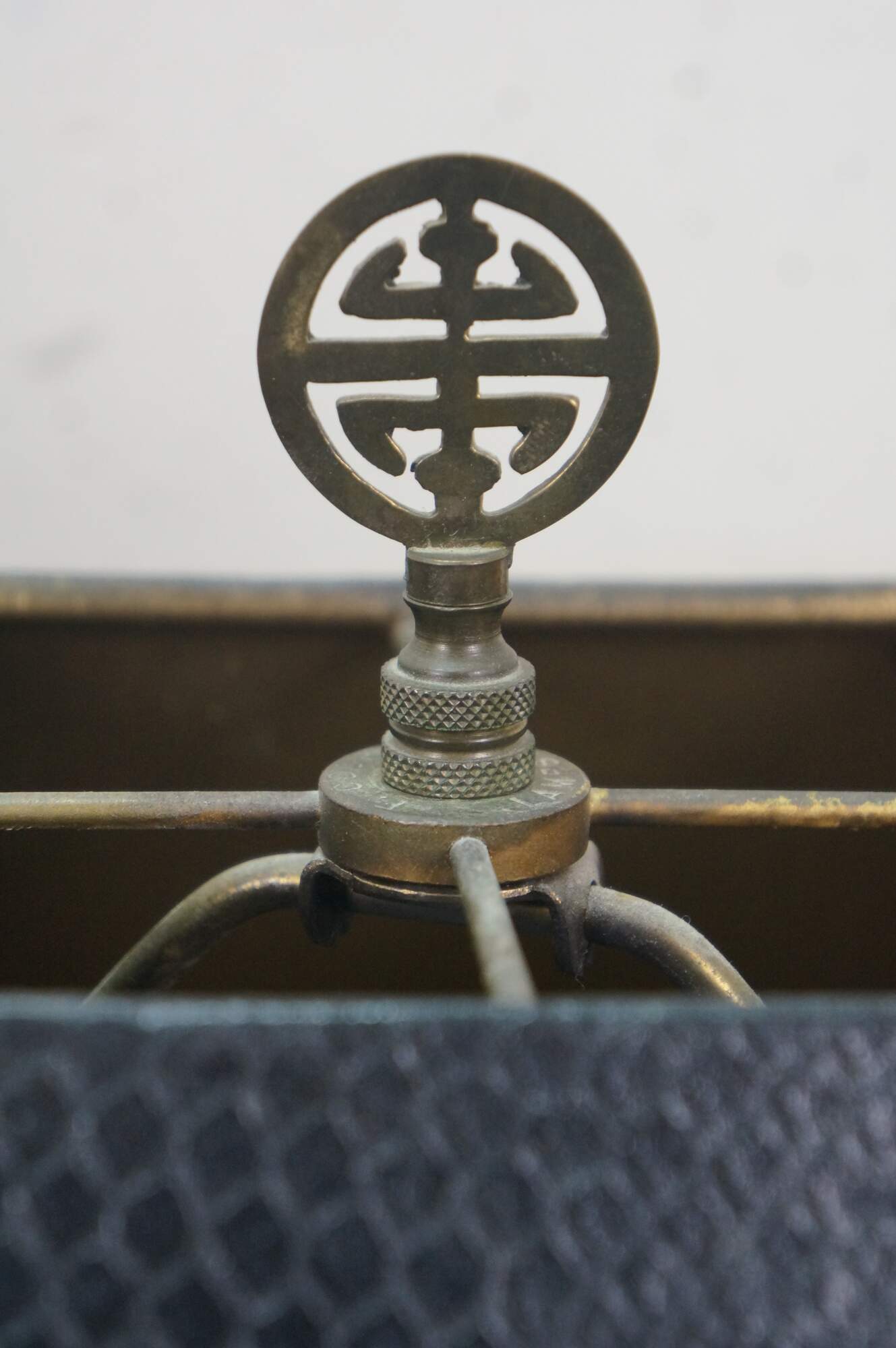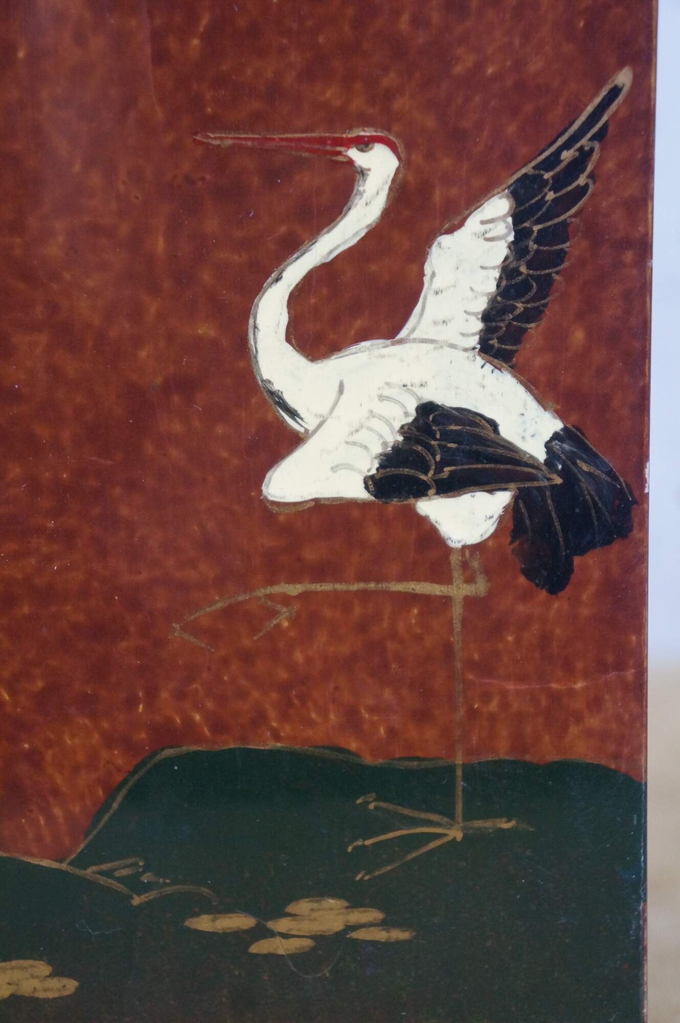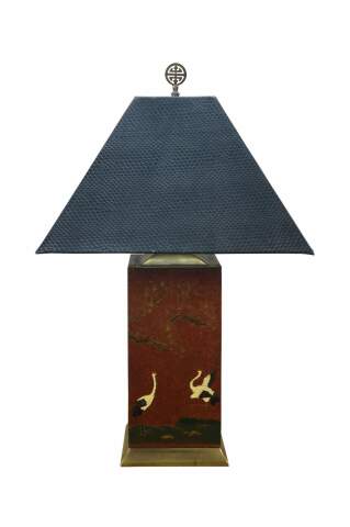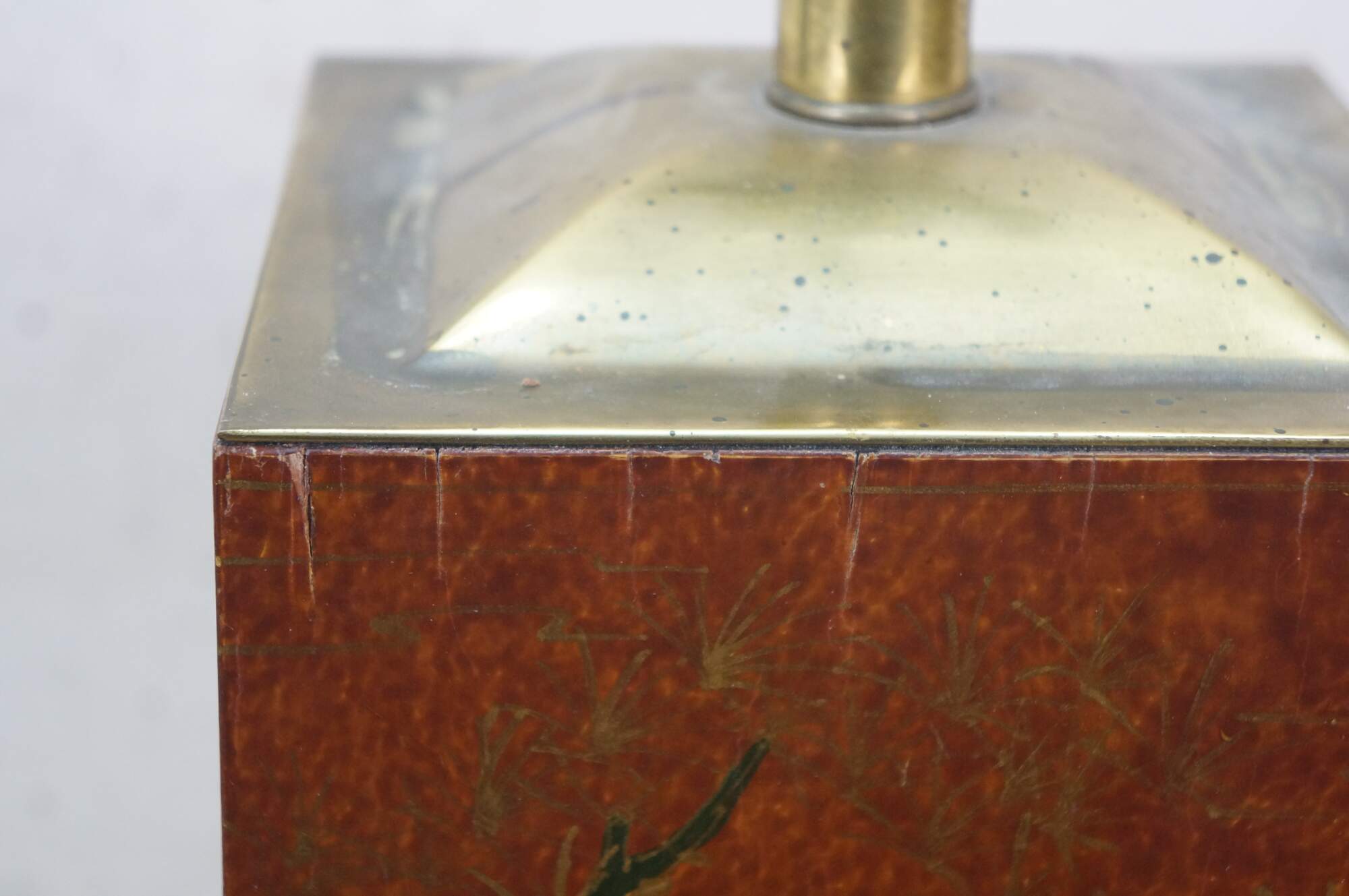 Beautiful vintage Chinese / Asian / Chinoiserie table lamp with a painted landscape scene of crane birds and gnarled pine trees with gilt details and brass base. Tooled leather shade and filigree medallion finial.