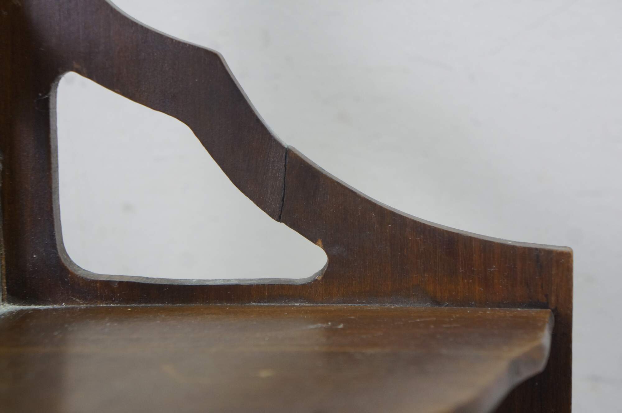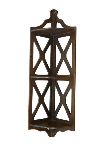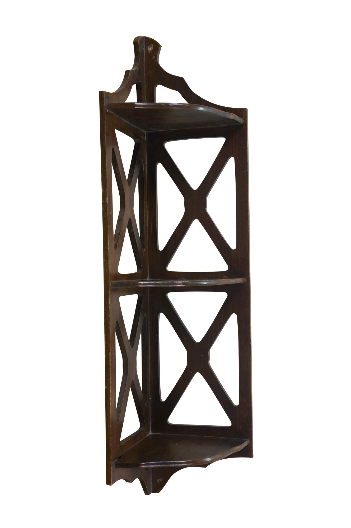 Vintage carved mahogany reticulated corner shelf featuring three tiers and fretwork accents.