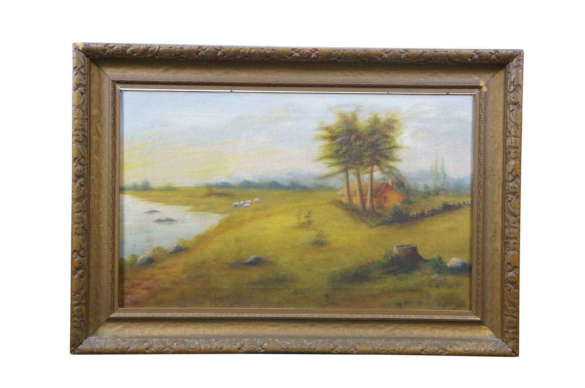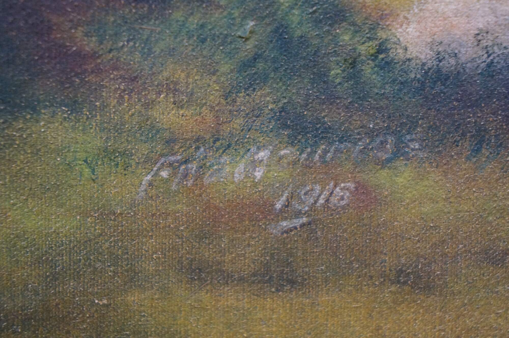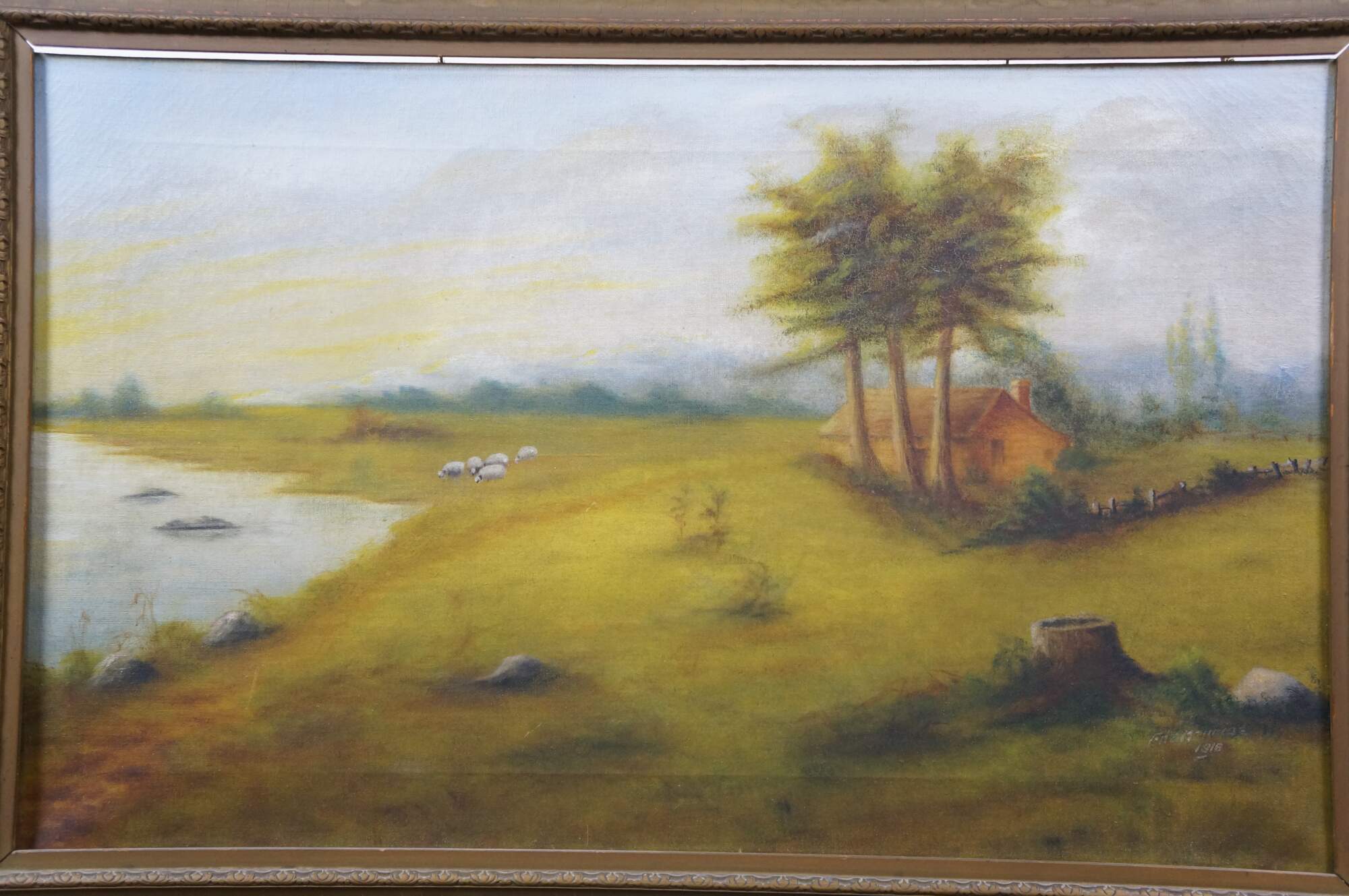Antique 1916 William Edwin Fitzmaurice Impressionist country landscape oil painting on canvas, depicting a tranquil pastoral scene with river / lake, farmhouse and sheep. Signed lower right.