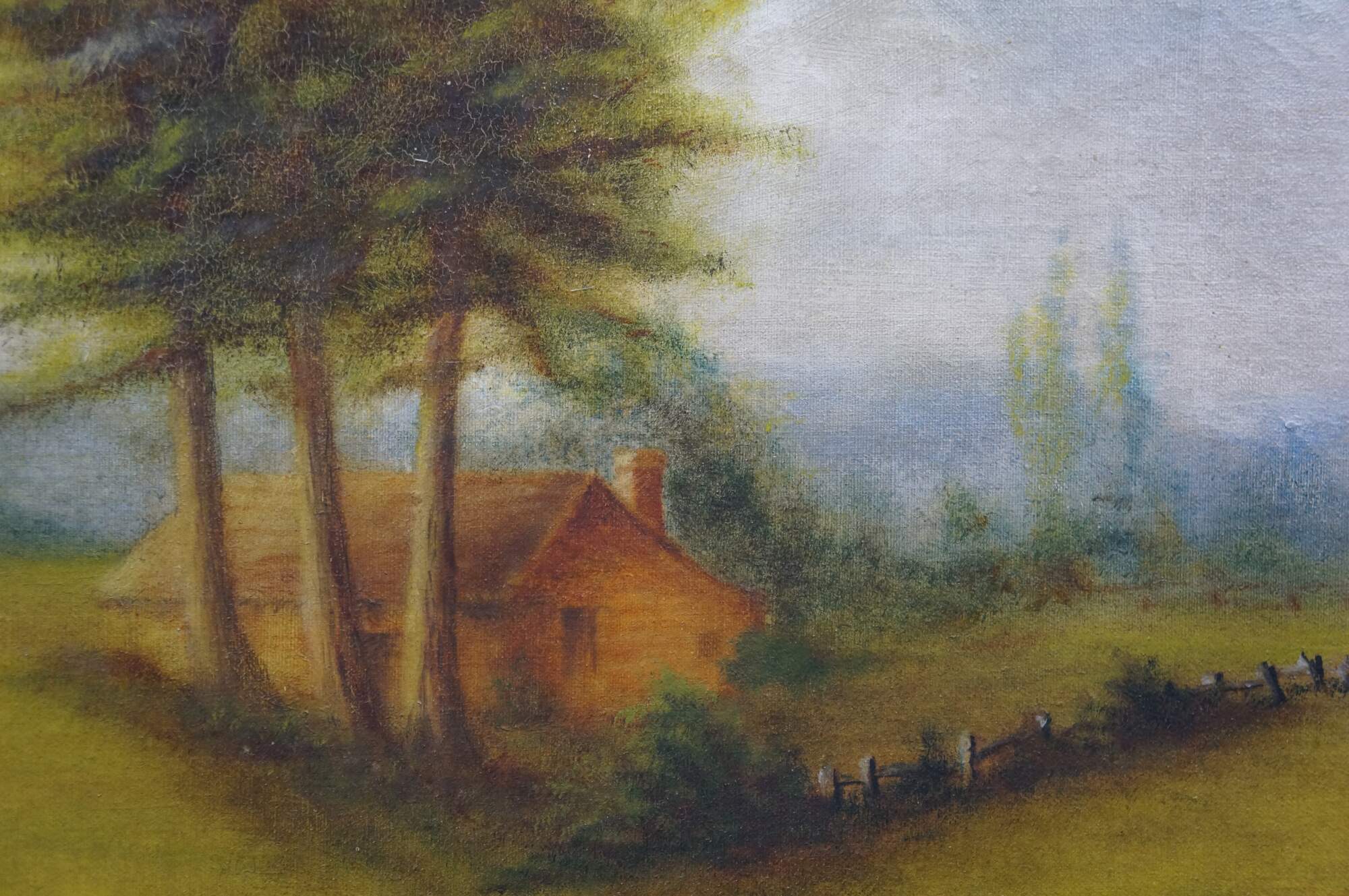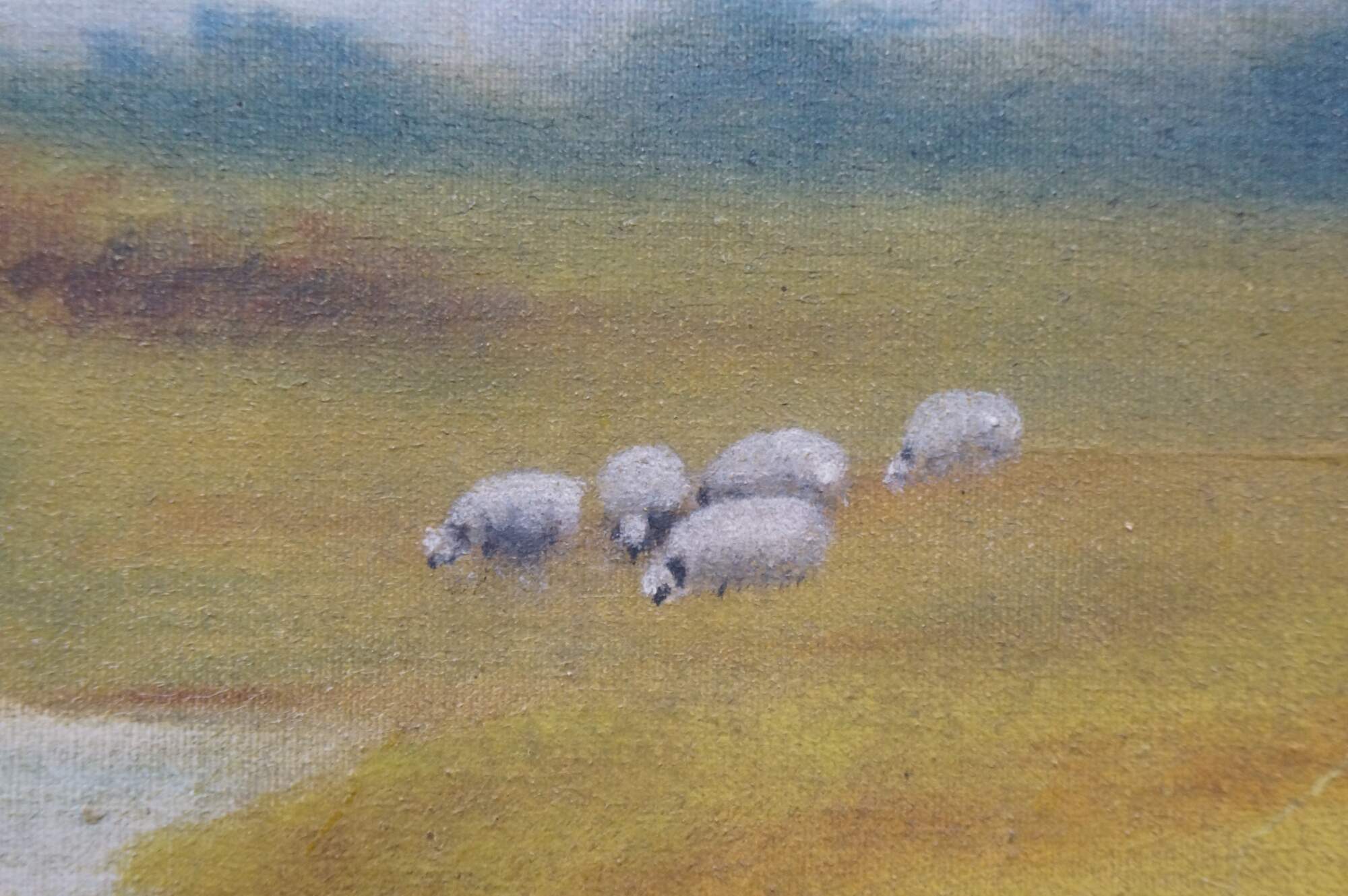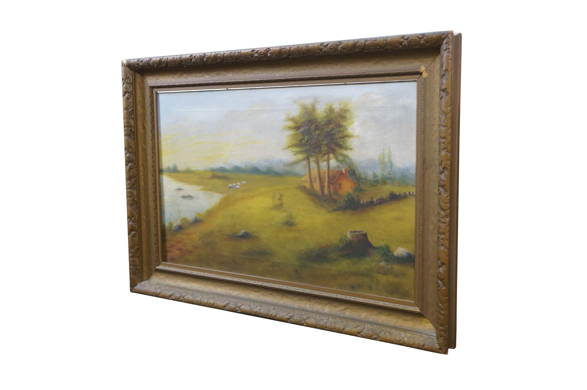 Antique 1916 William Edwin Fitzmaurice Impressionist country landscape oil painting on canvas, depicting a tranquil pastoral scene with river / lake, farmhouse and sheep. Signed lower right.