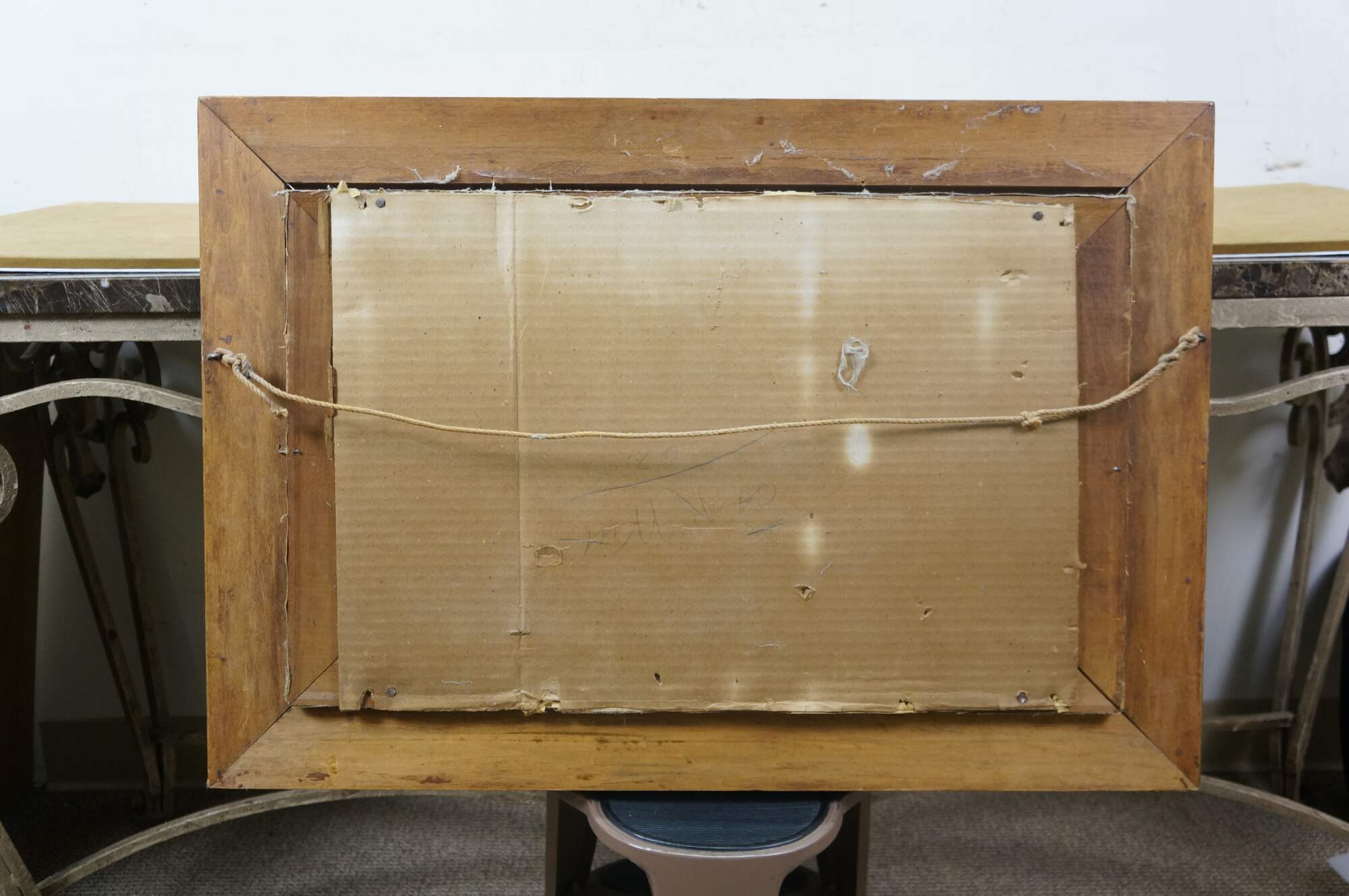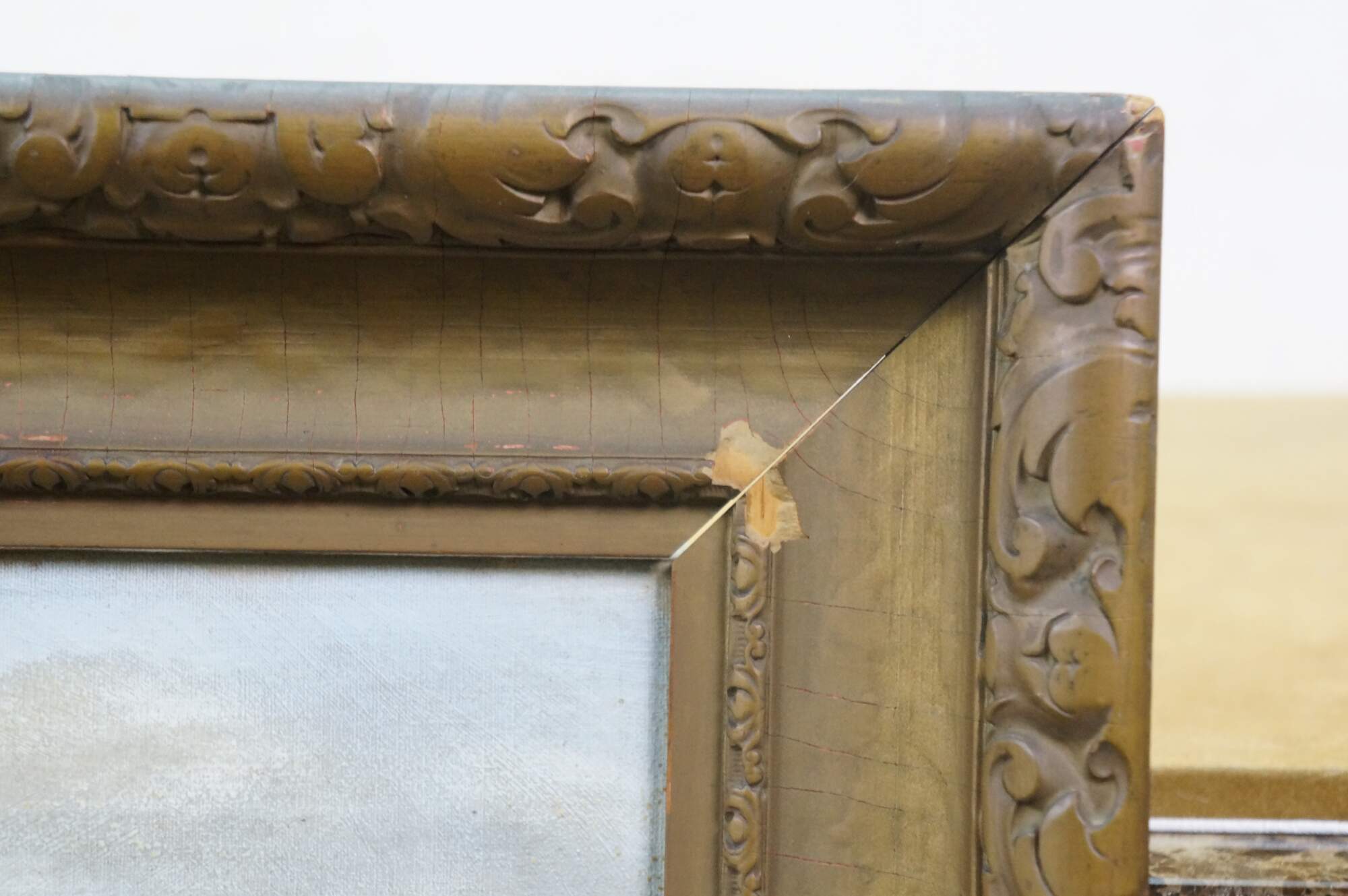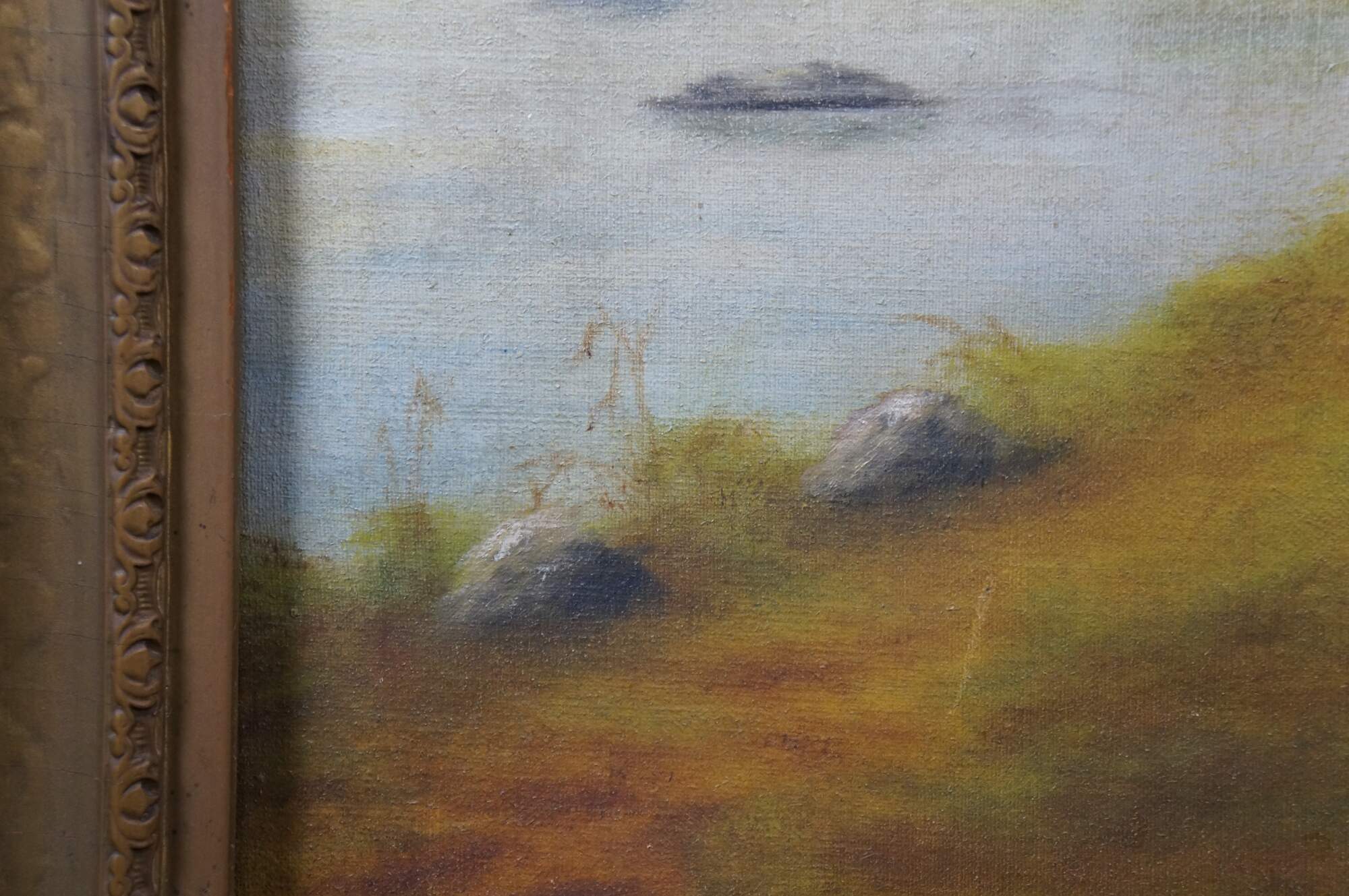 Wear from age; some discoloration / creasing to canvas; not attached to frame; crazing / trim loss / splitting to frame.