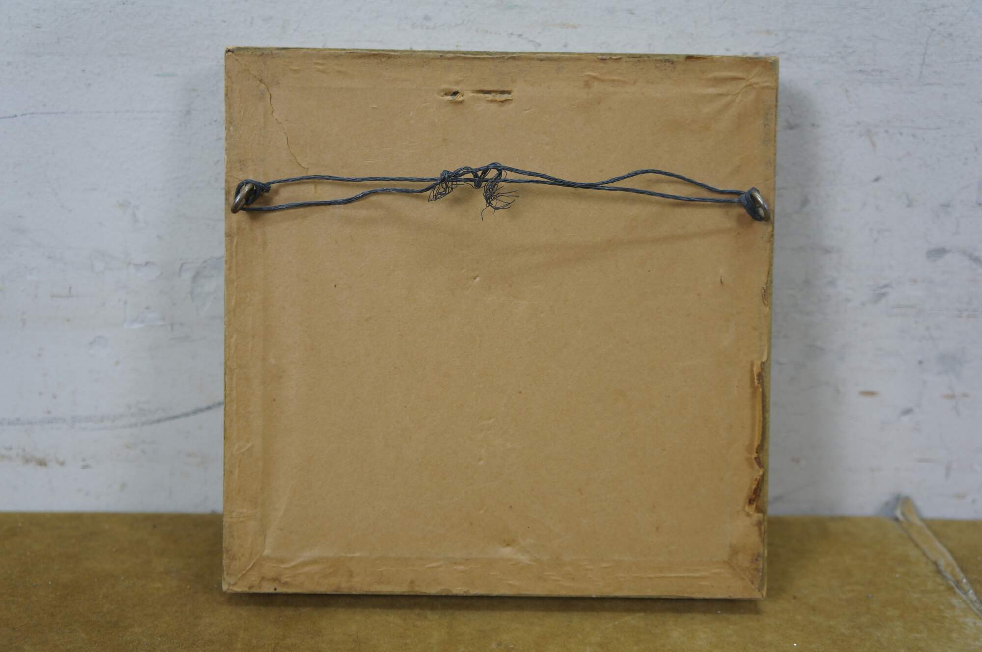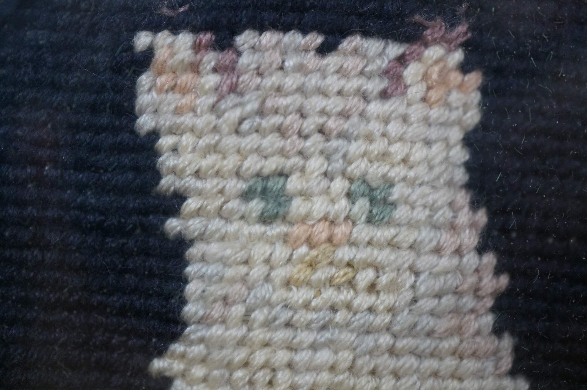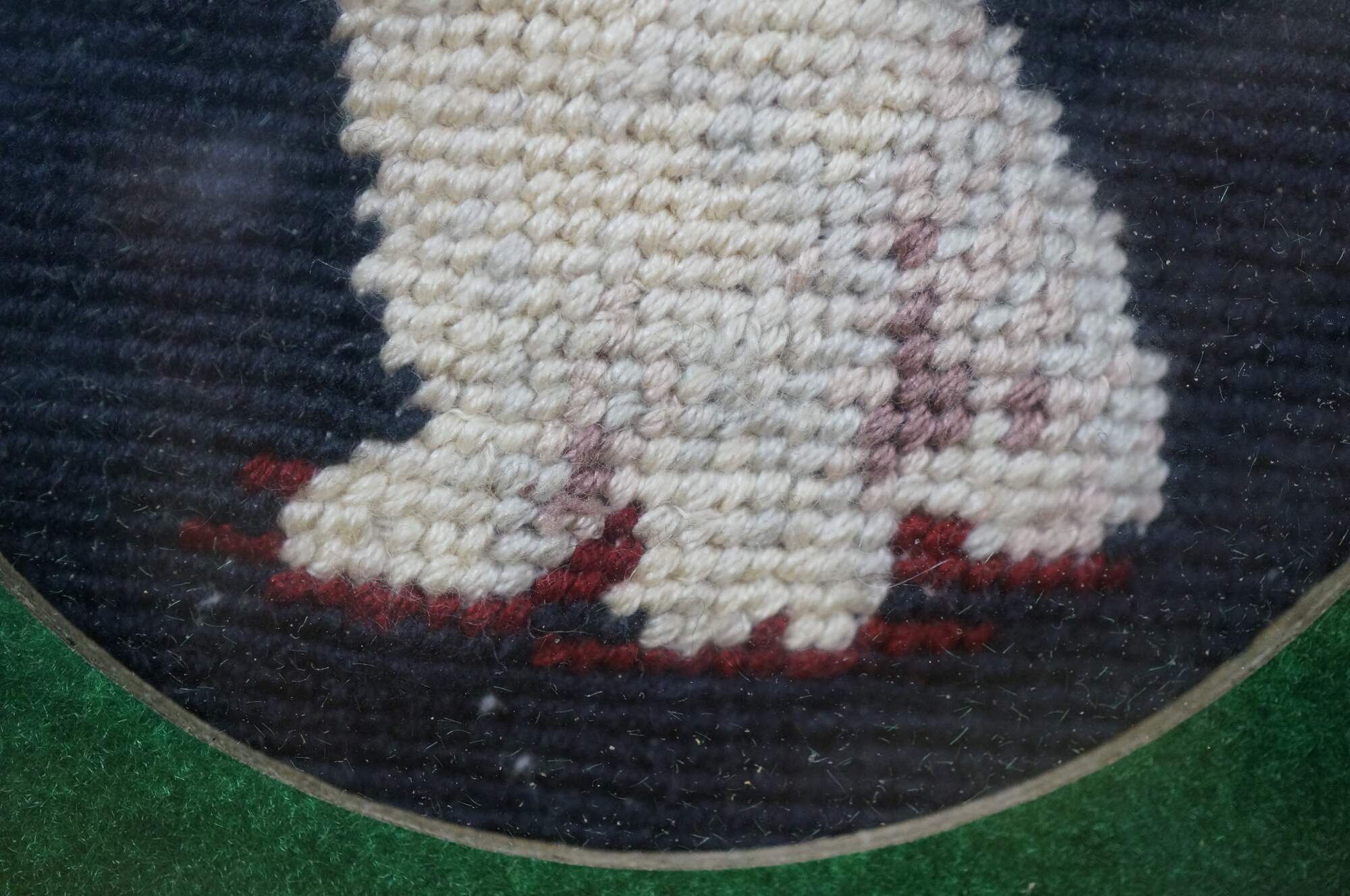 Antique Victorian folk art needlepoint portrait of a white cat against a black background with green felt mat.