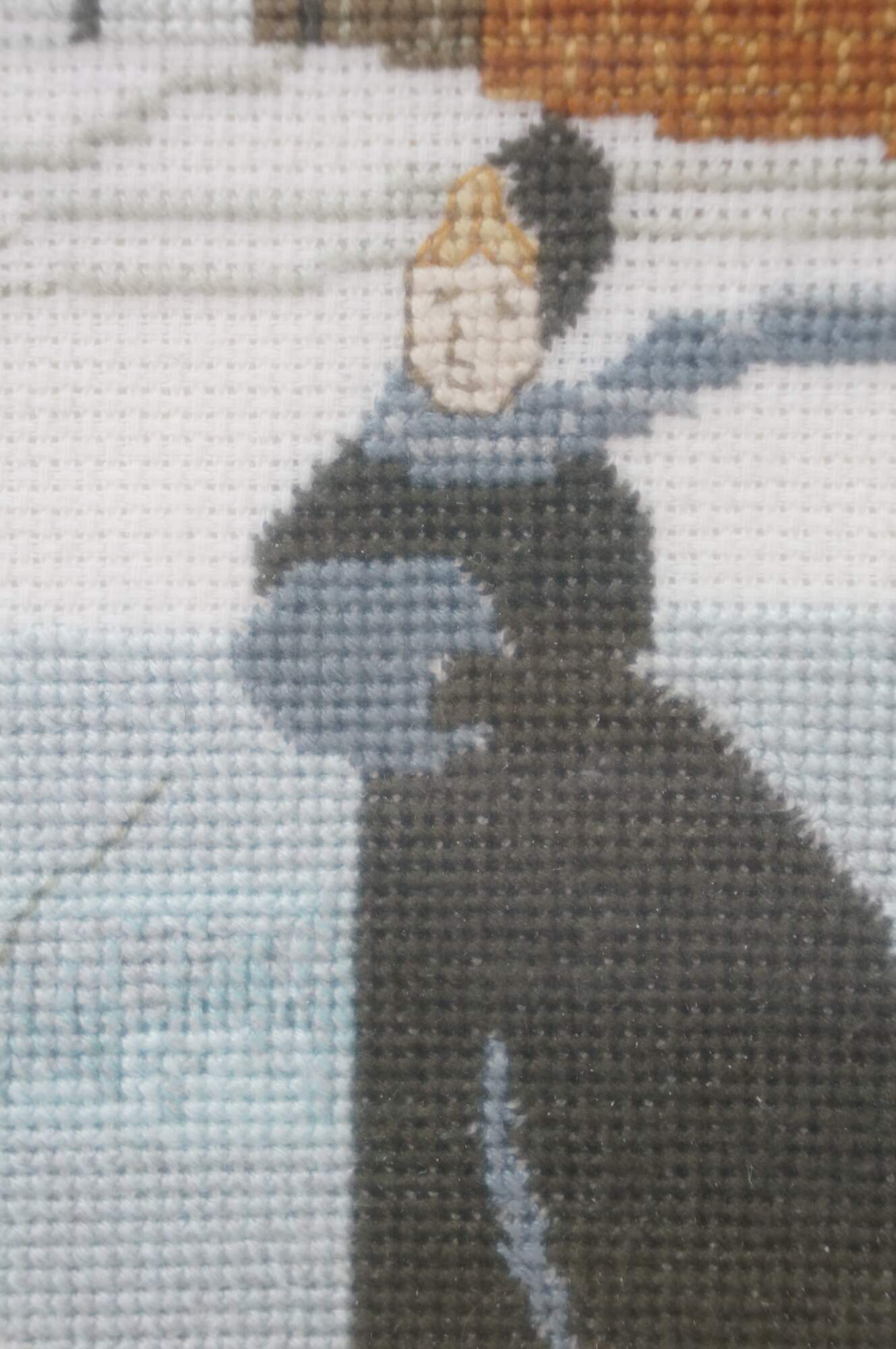 Finished and framed cross-stitch based on the P. Buckley Moss "Solitary Skater" pattern.