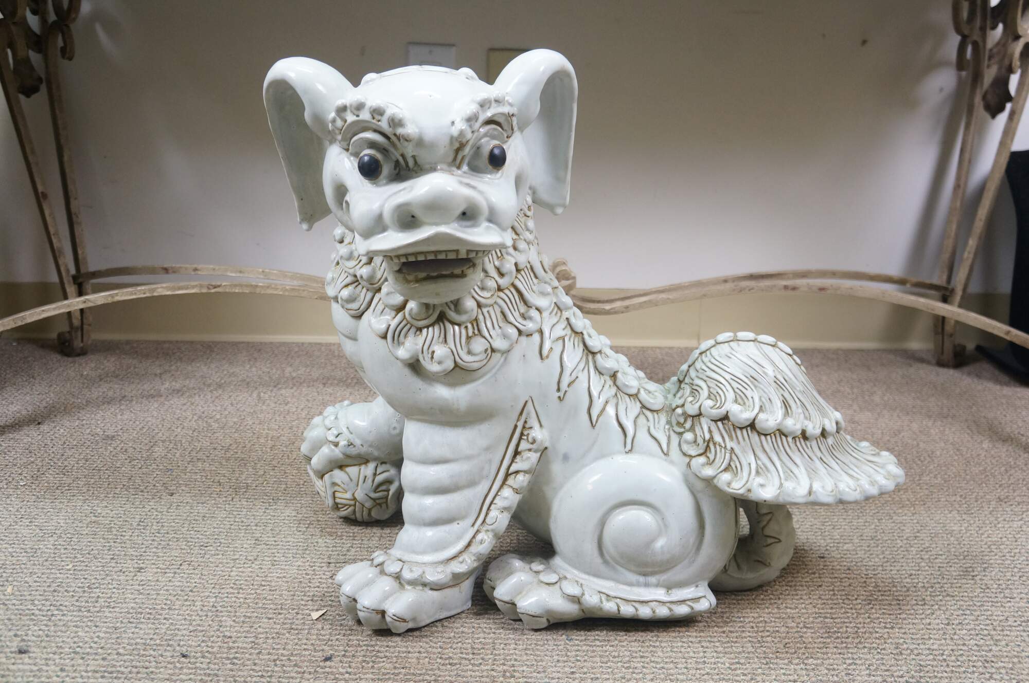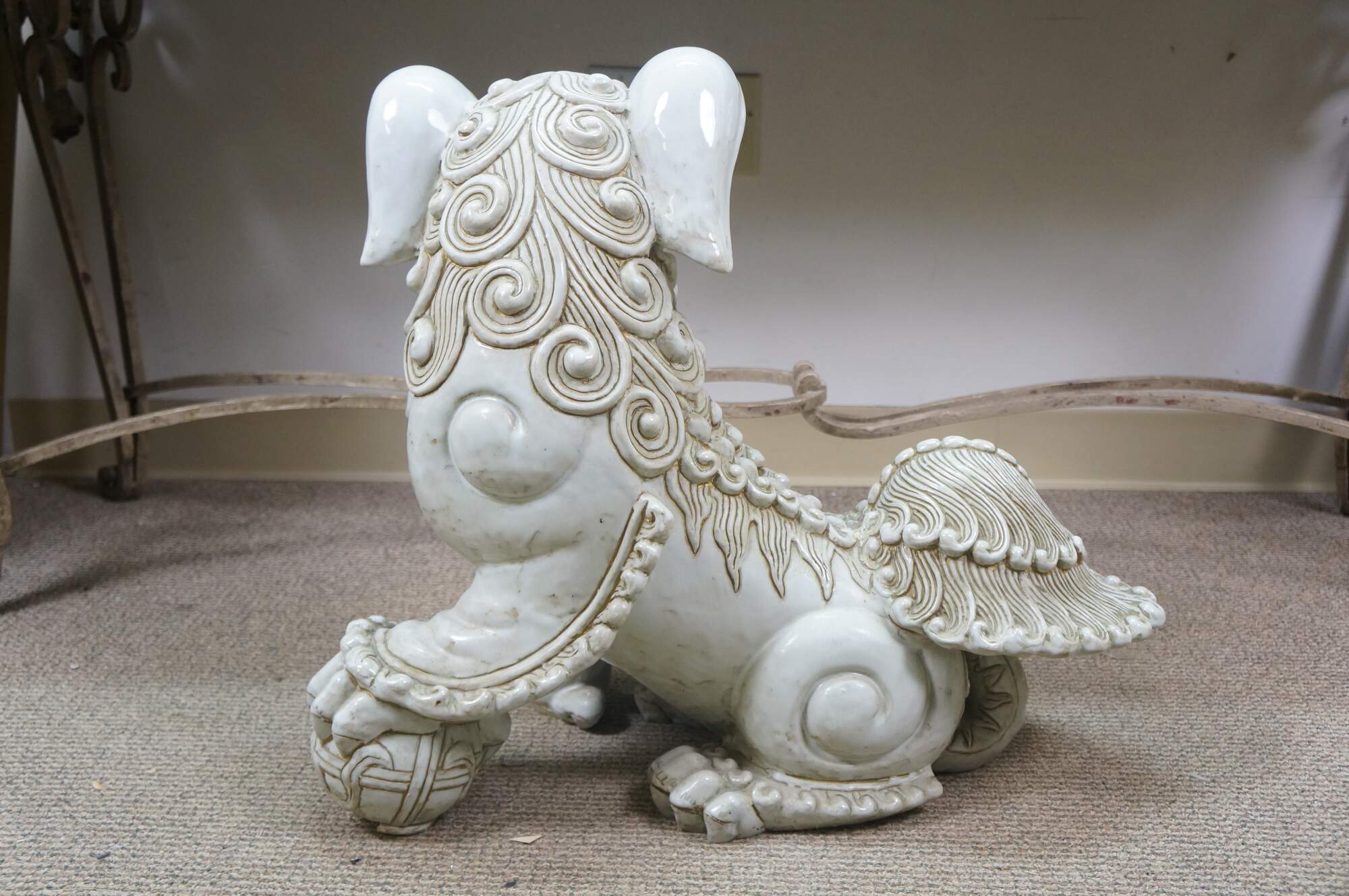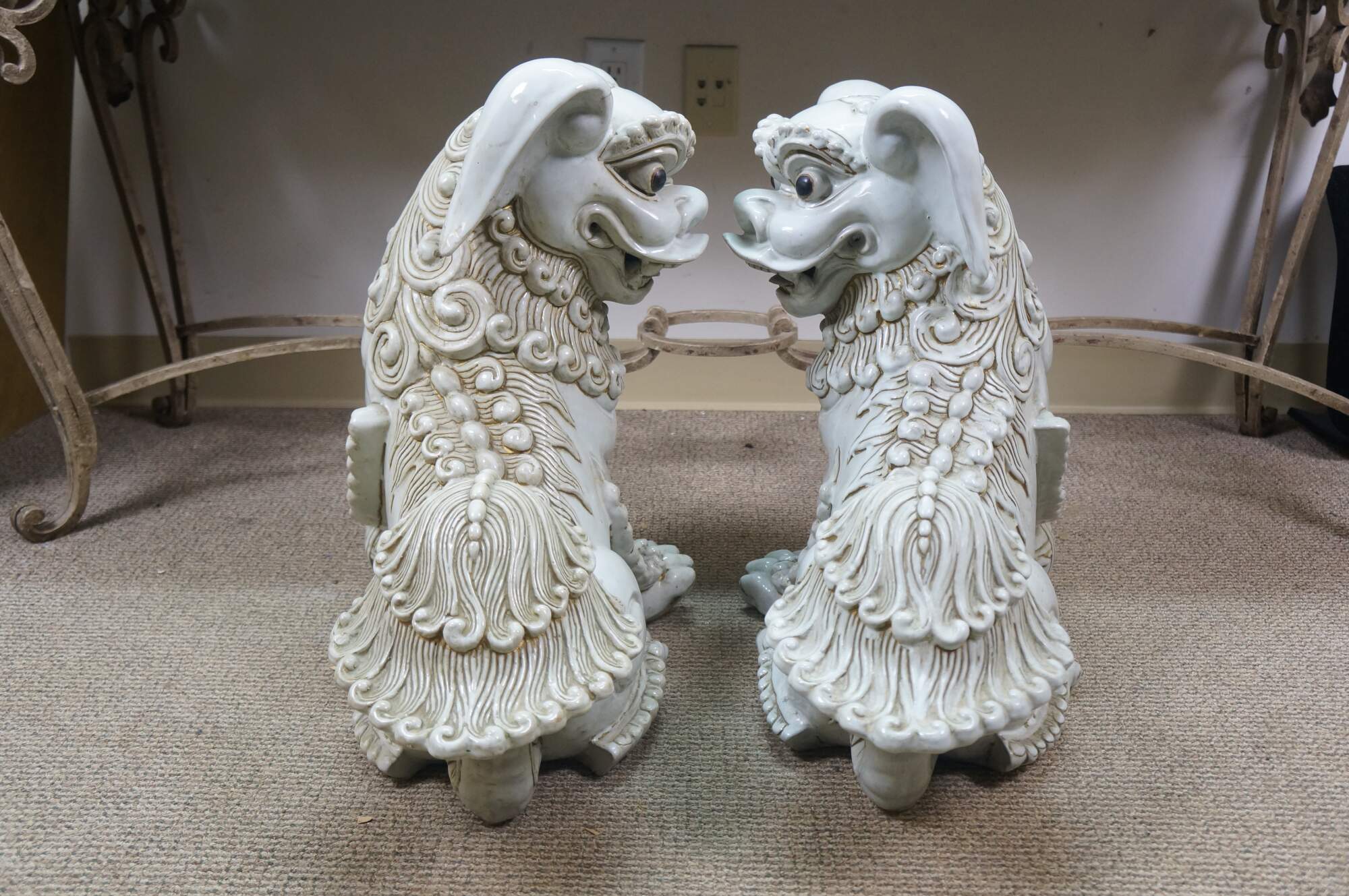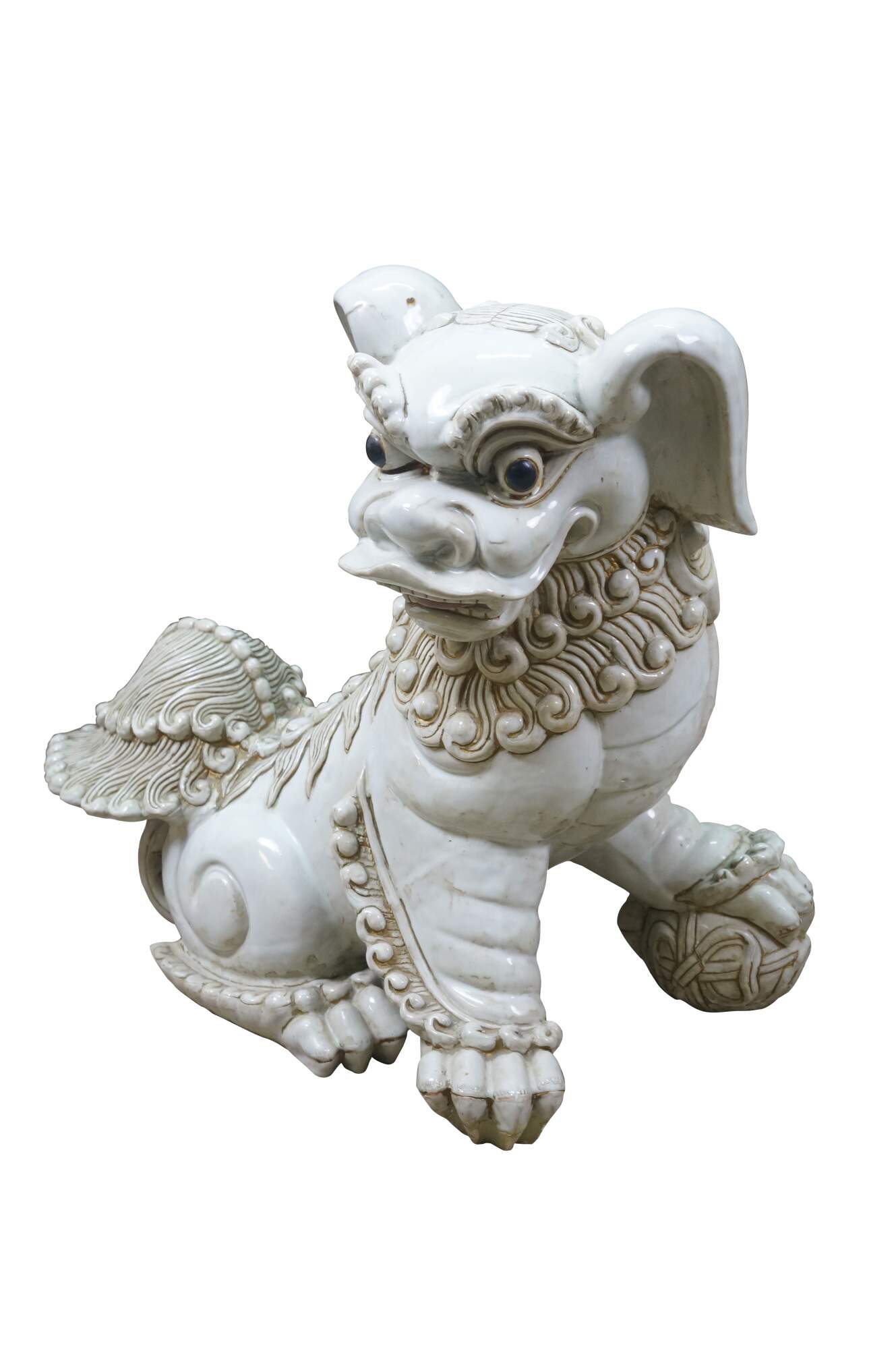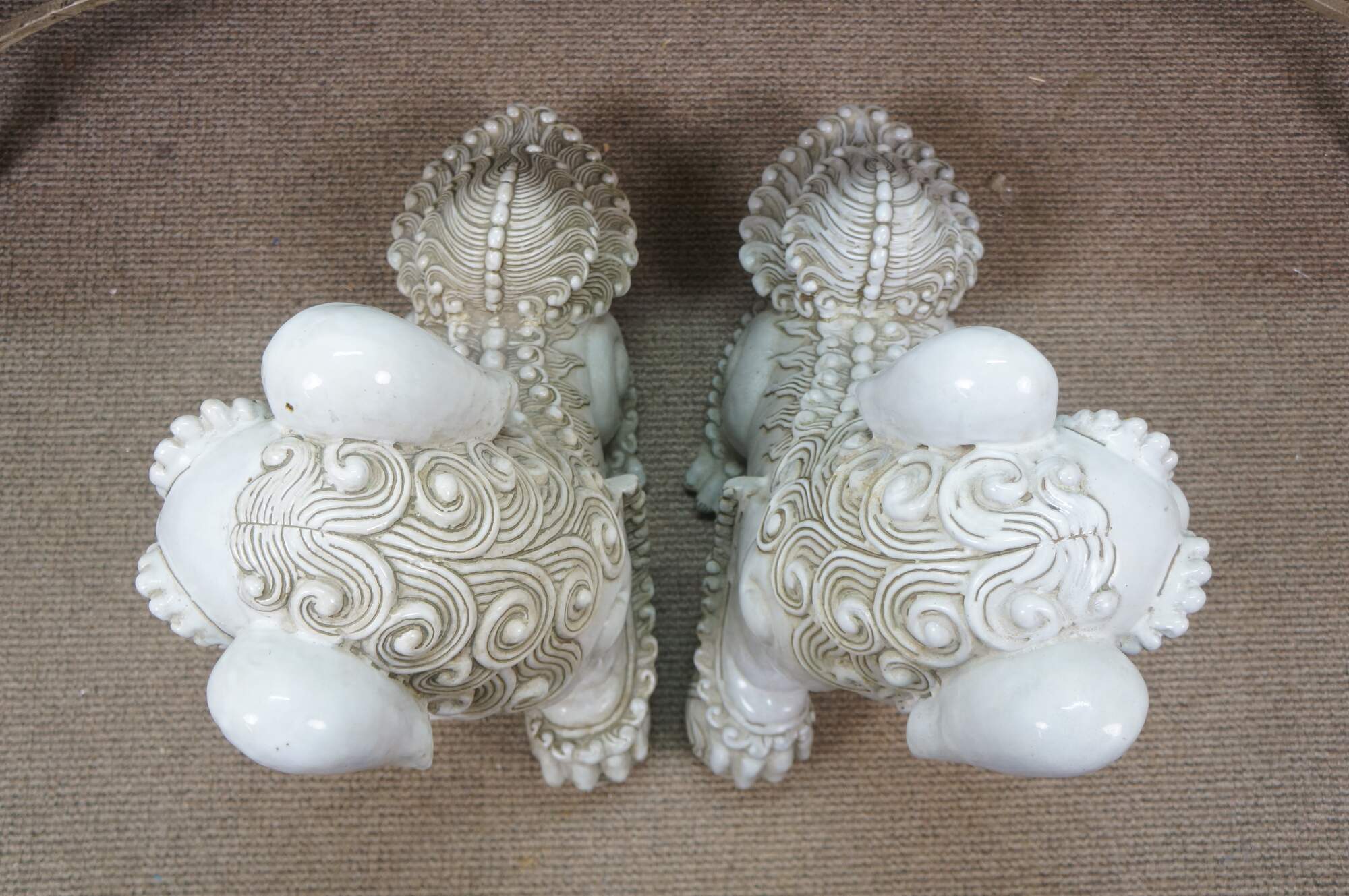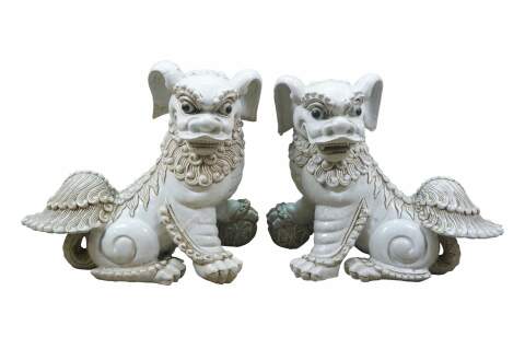 A large and impressive pair of blanc de chine porcelain Chinese guardian lions / Foo Dogs / Shishi. Made from high-quality kaolin clay and fired at high temperatures to achieve a lustrous, translucent white color. These mythical lion like statues represent protection and wealth - as protectors of temples, palaces, and homes, symbolizing power, prosperity, and warding off evil spirits, traditionally placed in pairs (left and right facing) to represent yin and yang.