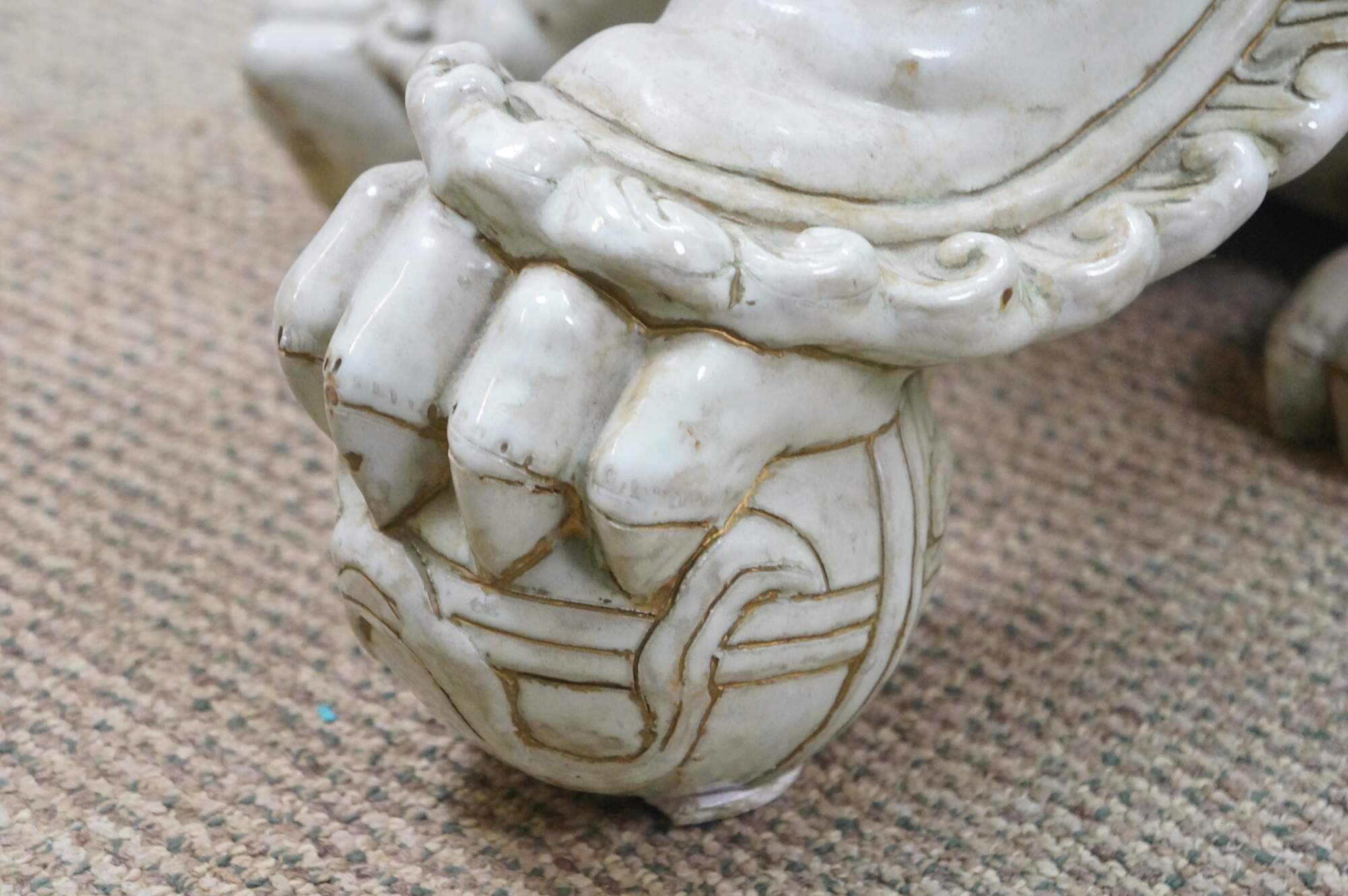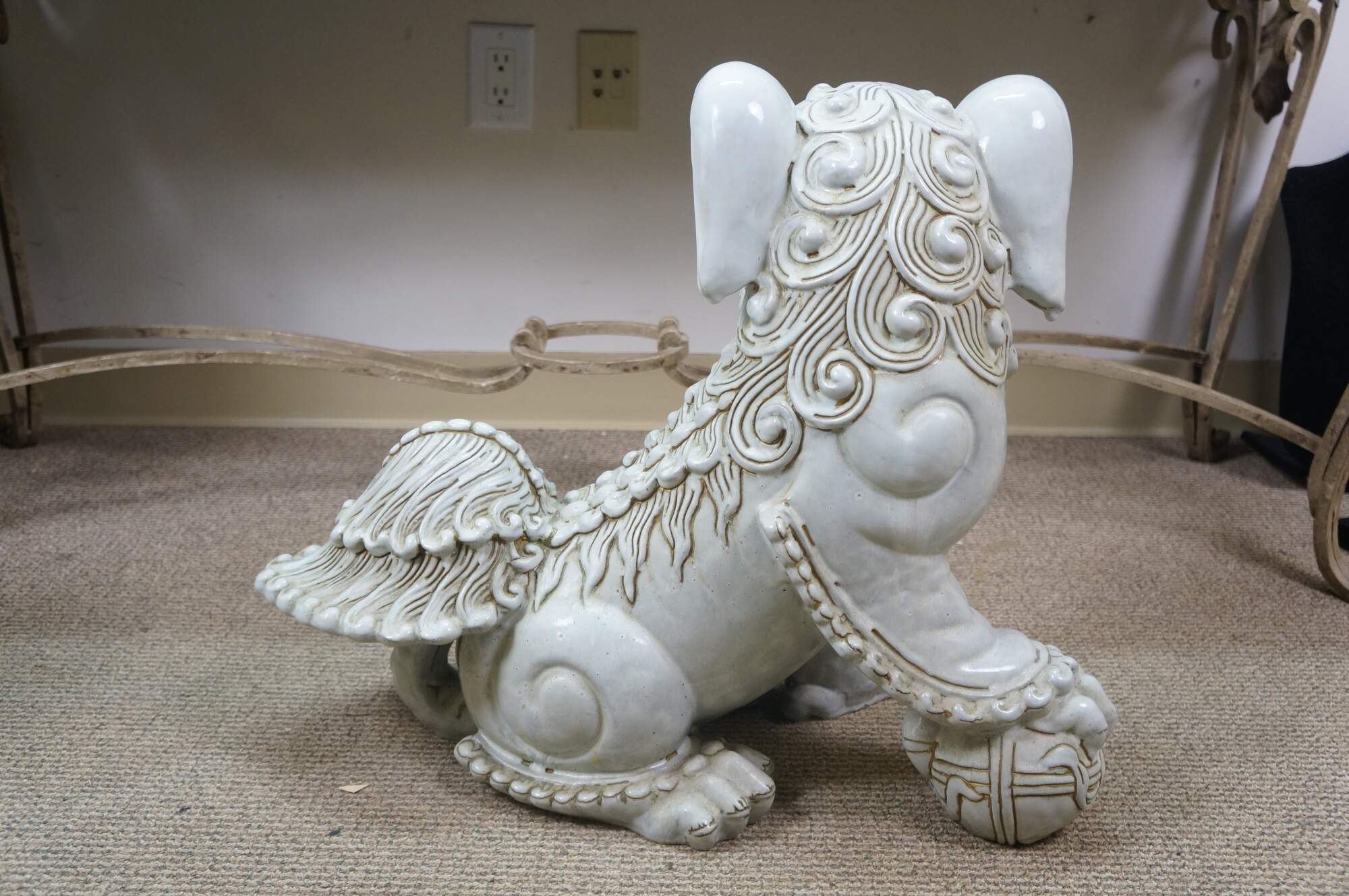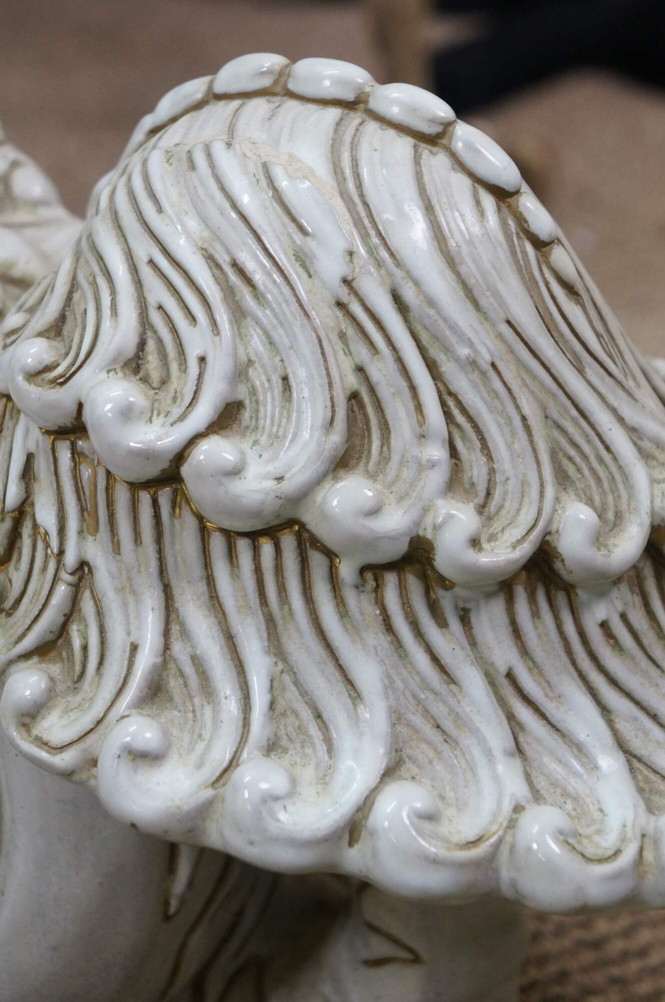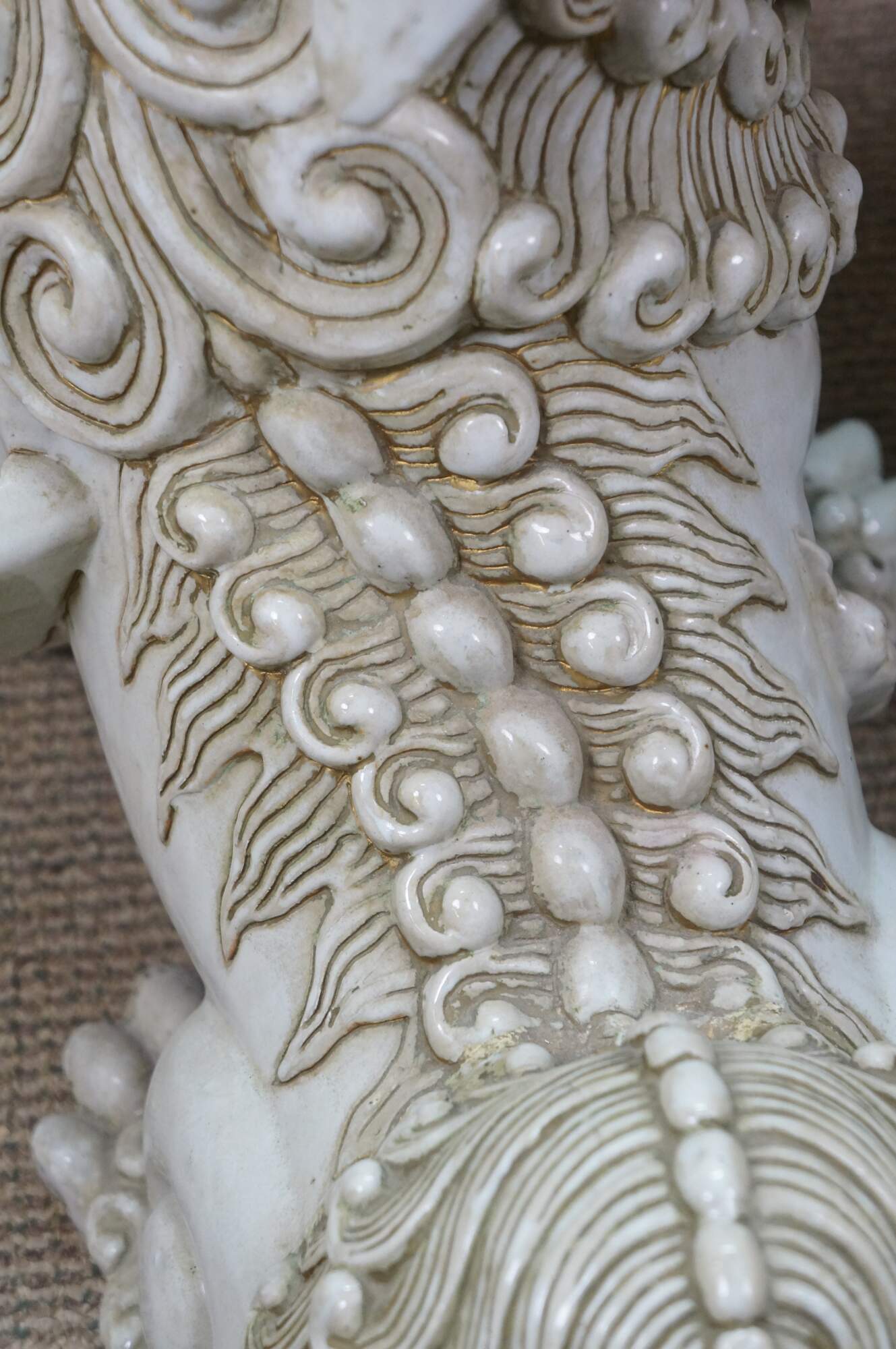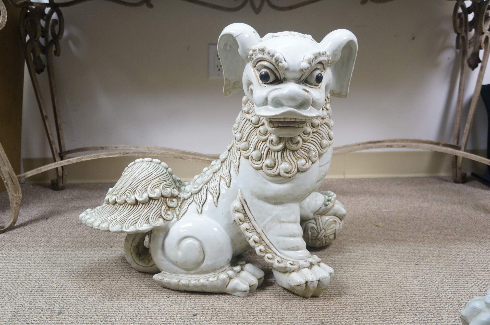 A large and impressive pair of blanc de chine porcelain Chinese guardian lions / Foo Dogs / Shishi. Made from high-quality kaolin clay and fired at high temperatures to achieve a lustrous, translucent white color. These mythical lion like statues represent protection and wealth - as protectors of temples, palaces, and homes, symbolizing power, prosperity, and warding off evil spirits, traditionally placed in pairs (left and right facing) to represent yin and yang.