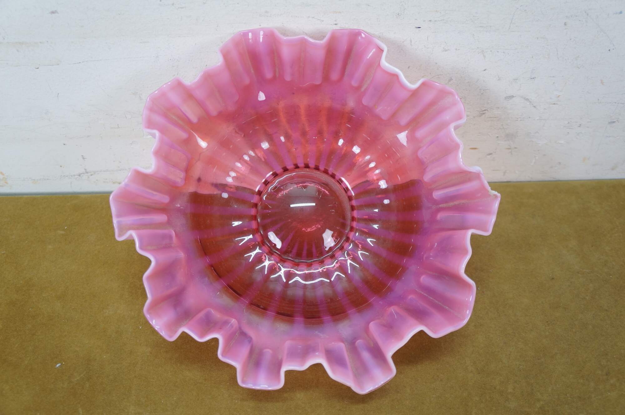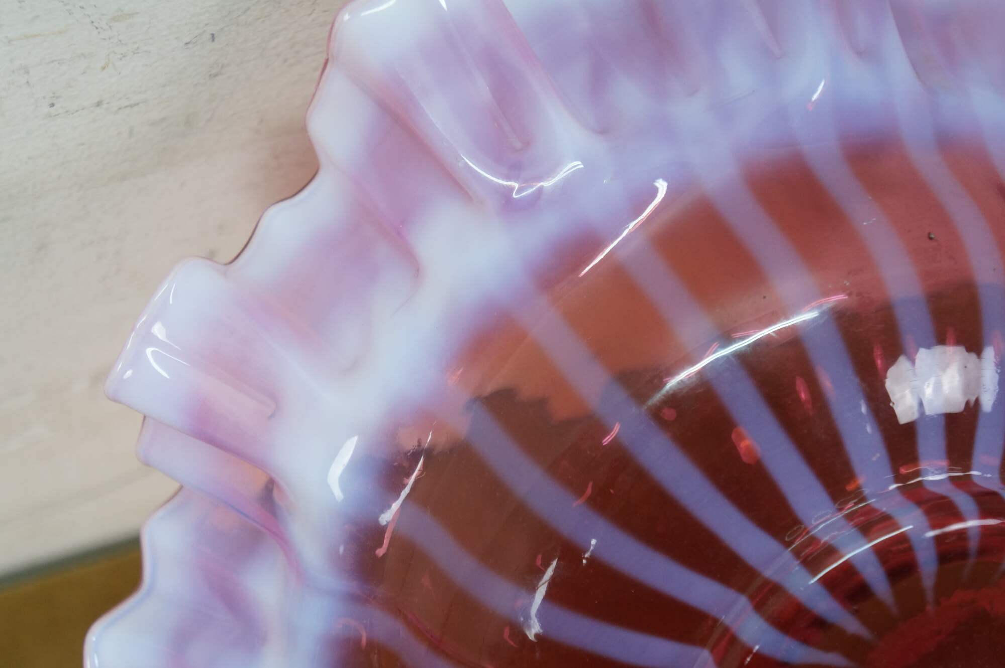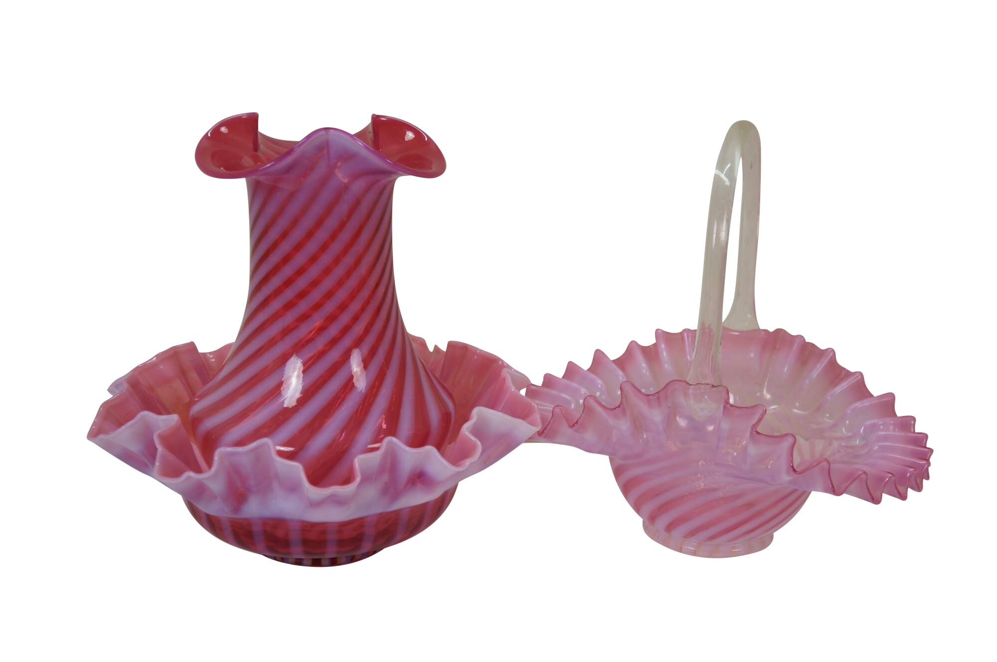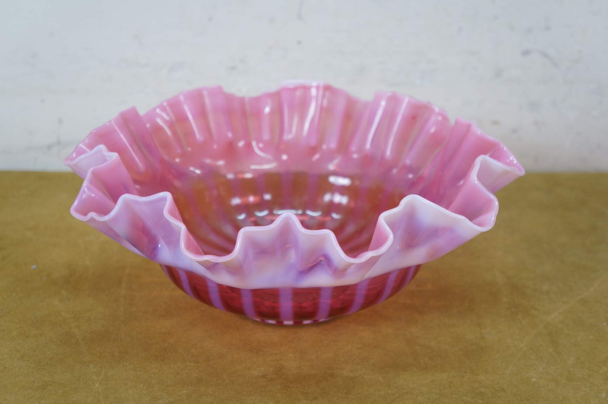 3 mid to early century Fenton cranberry / ruby red opalescent art glass compotes featuring ruffled edge / clambroth designs with swirls and stripes. Includes a vase, basket and centerpiece bowl / candy / nut / bob bon dish.