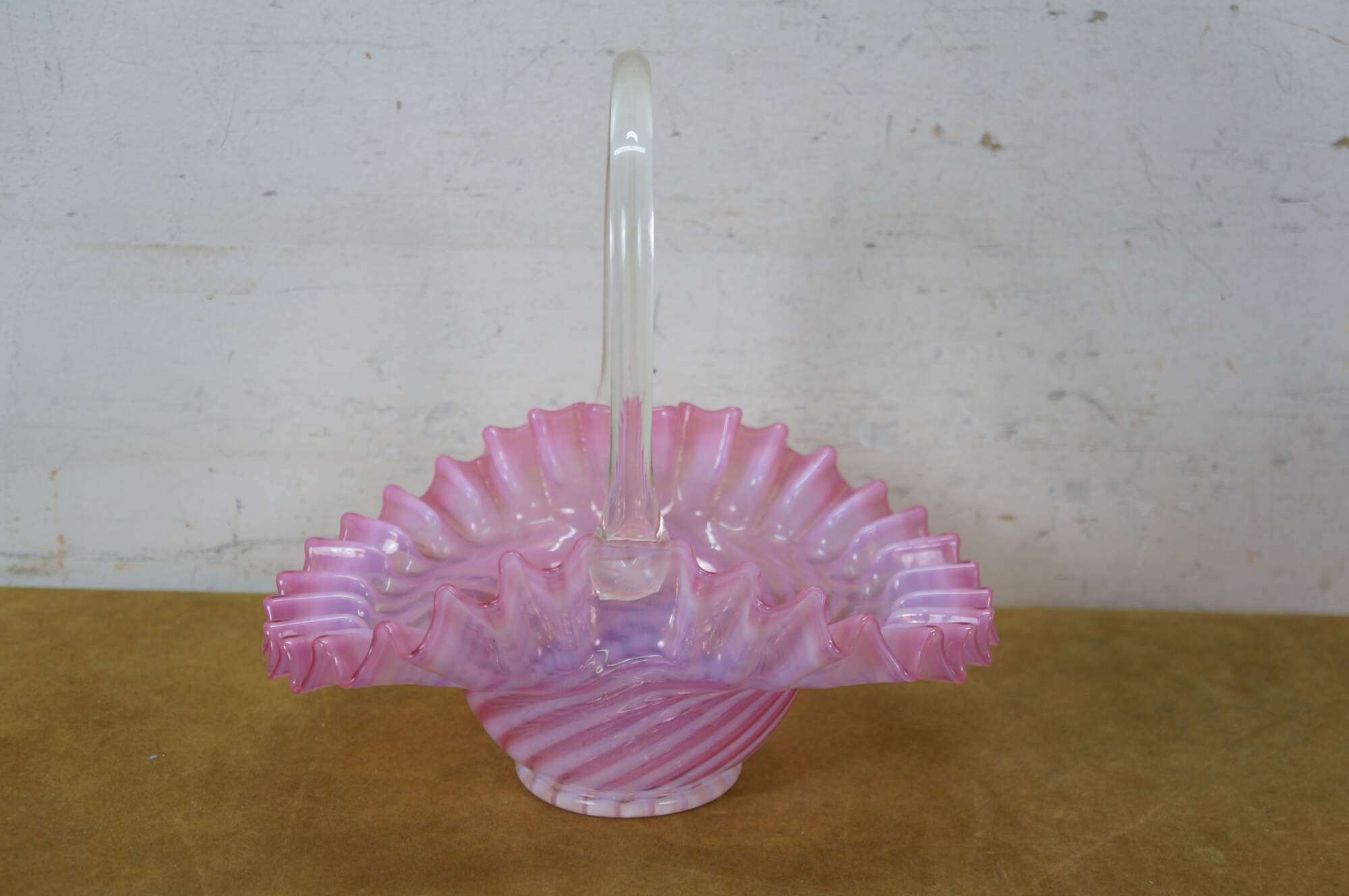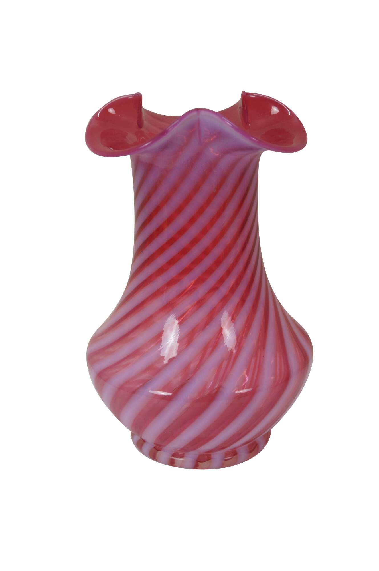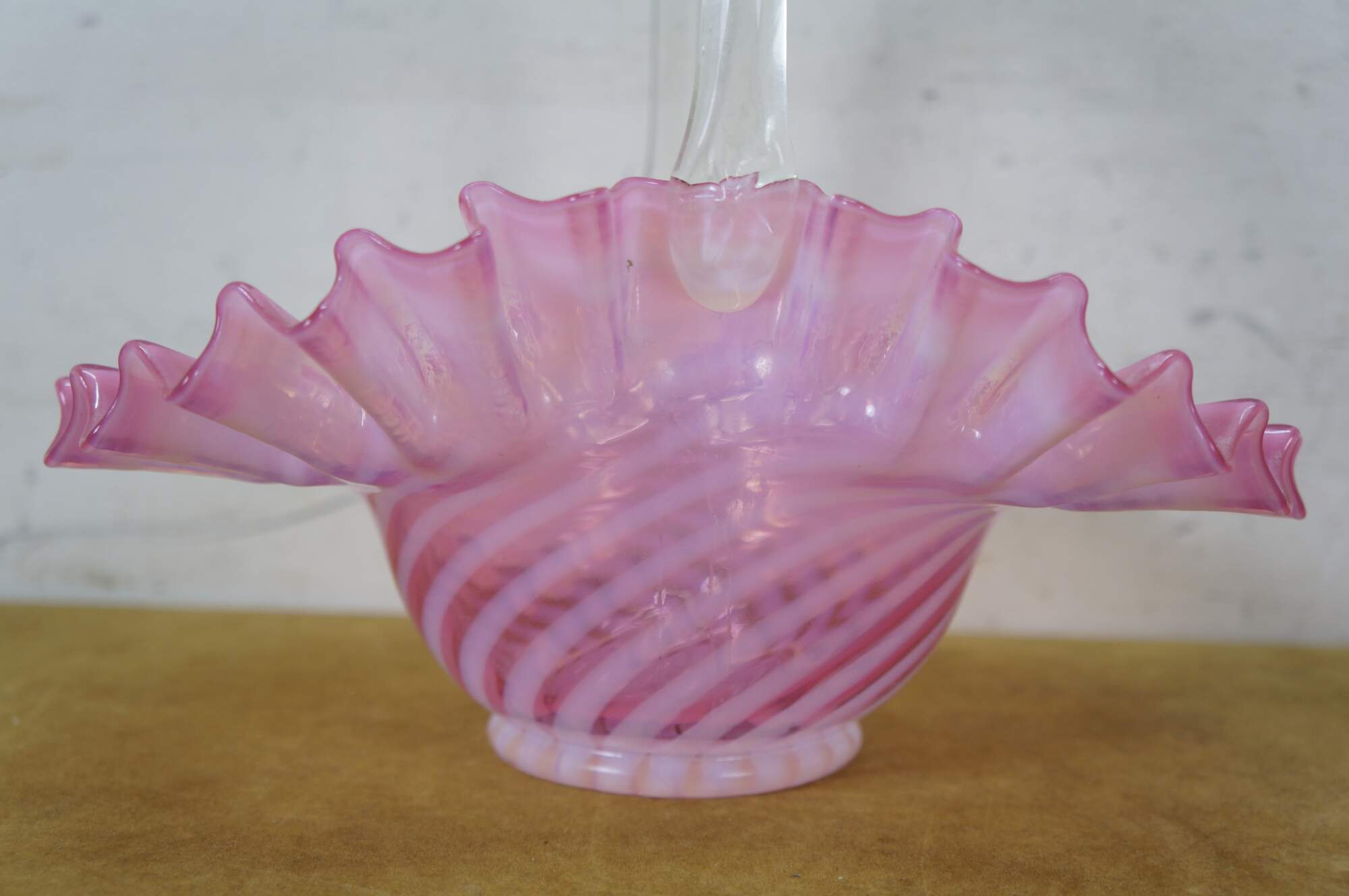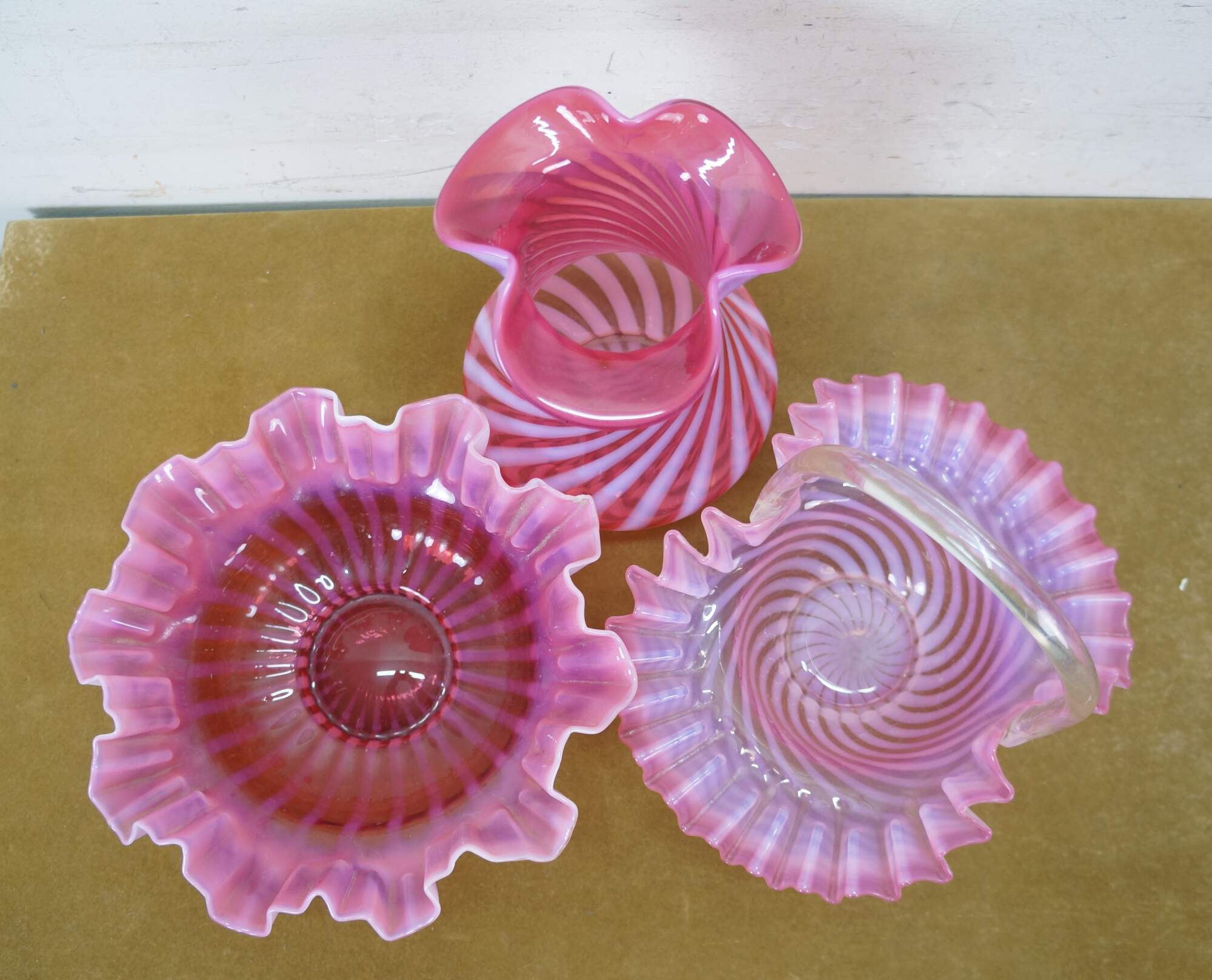 3 mid to early century Fenton cranberry / ruby red opalescent art glass compotes featuring ruffled edge / clambroth designs with swirls and stripes. Includes a vase, basket and centerpiece bowl / candy / nut / bob bon dish.