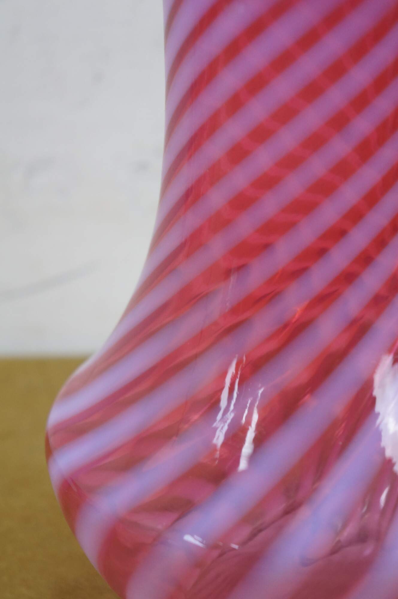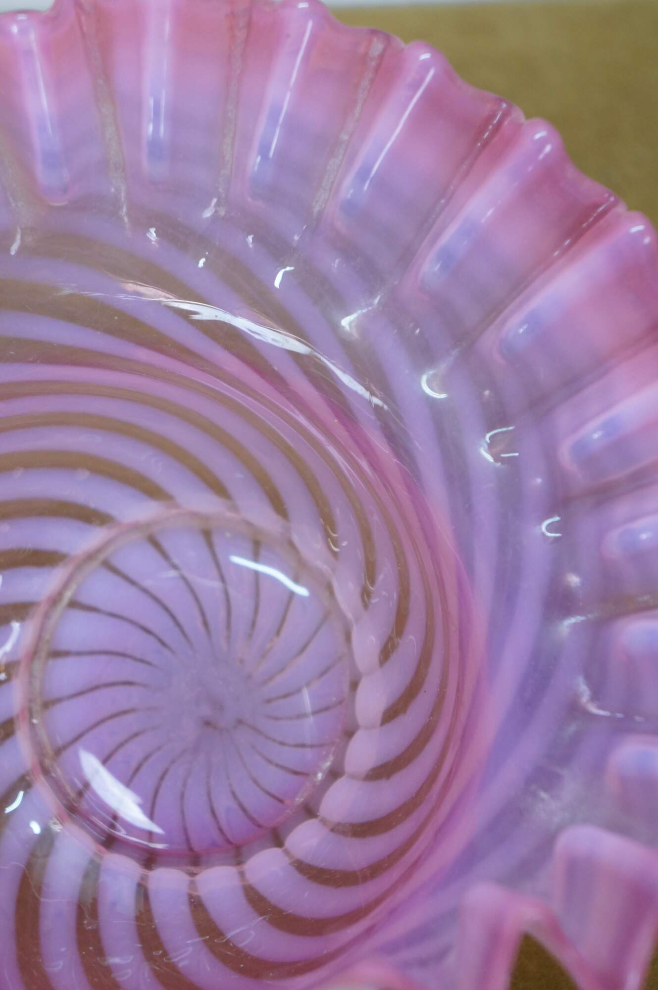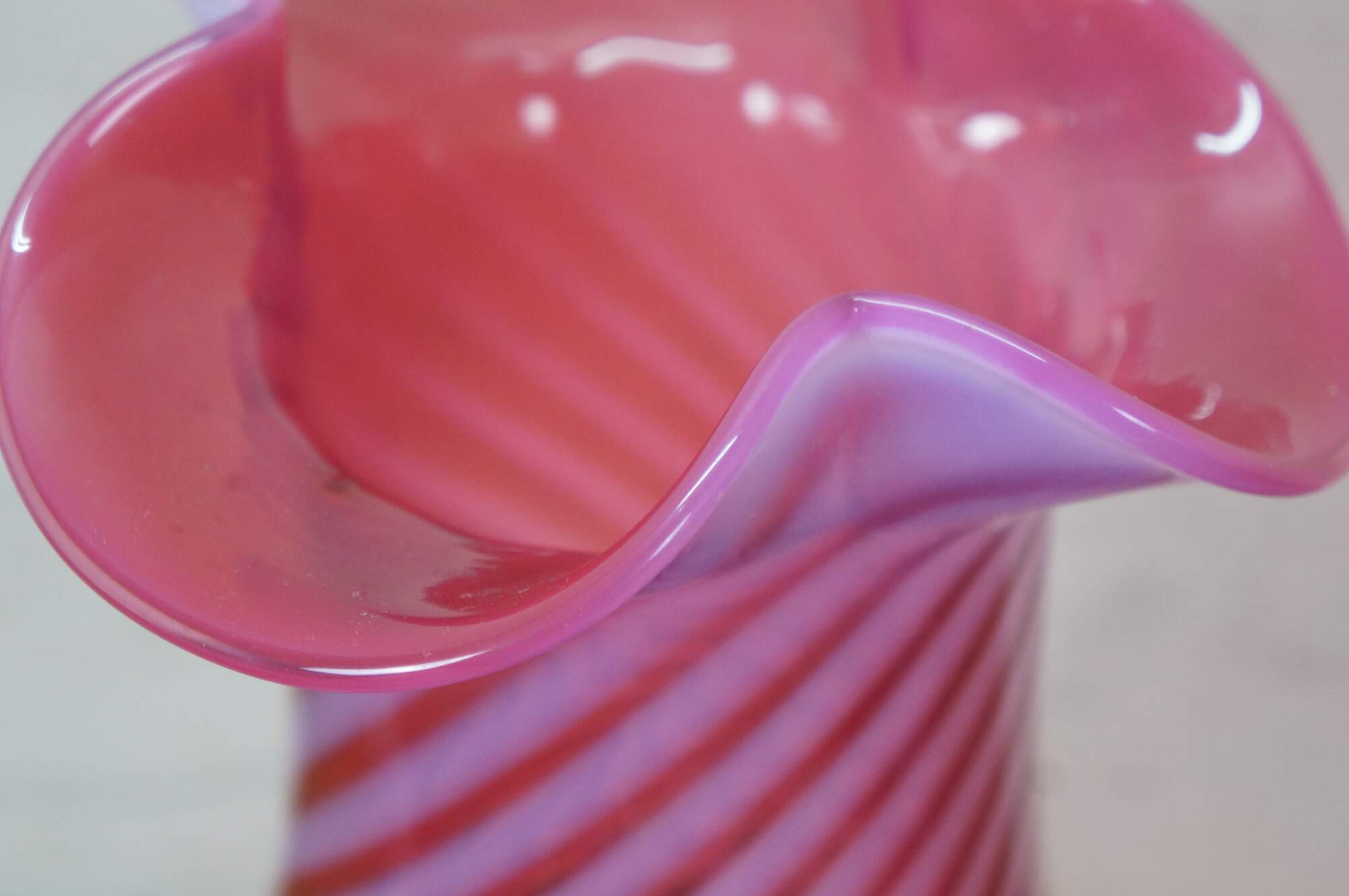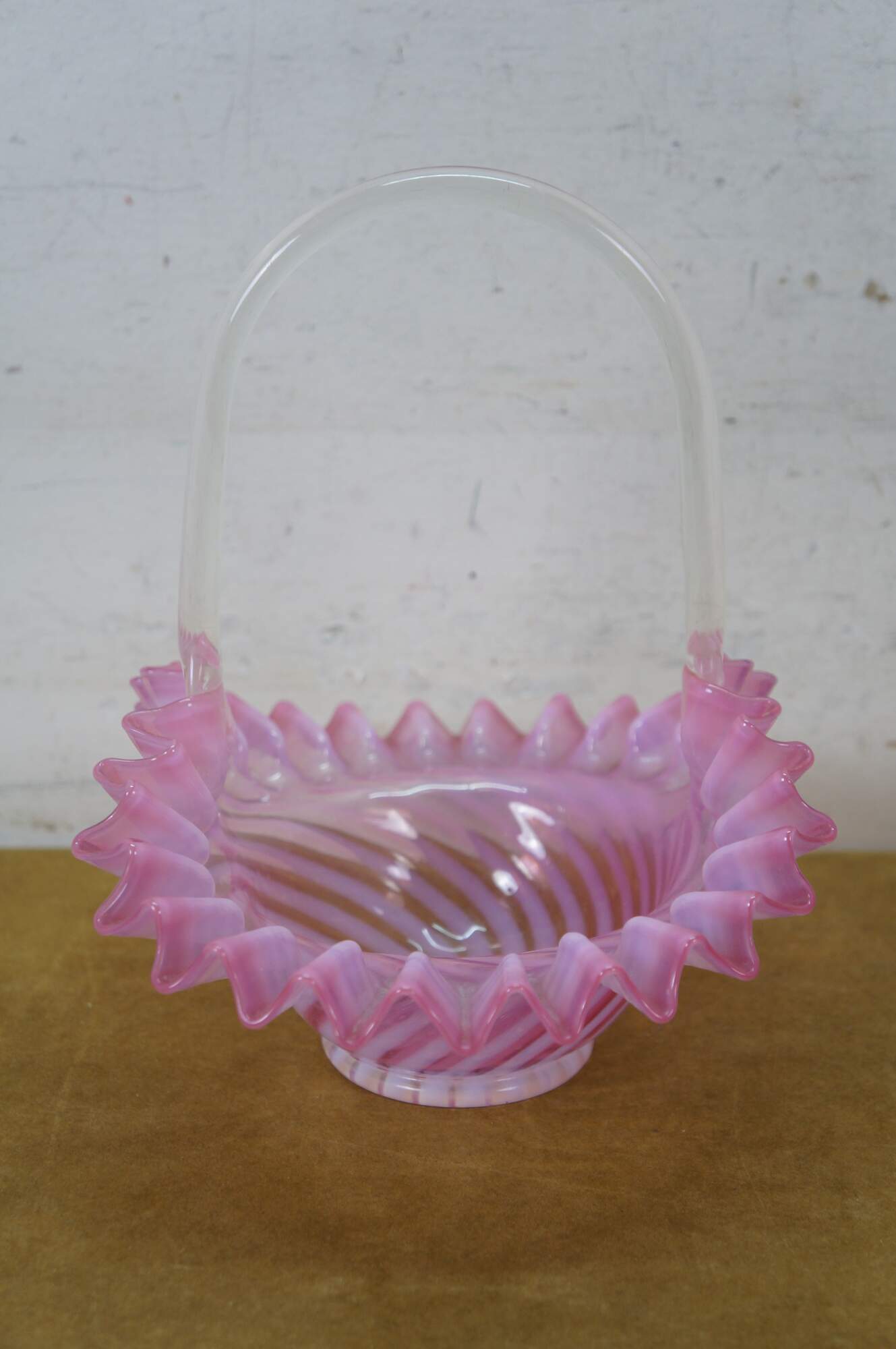 3 mid to early century Fenton cranberry / ruby red opalescent art glass compotes featuring ruffled edge / clambroth designs with swirls and stripes. Includes a vase, basket and centerpiece bowl / candy / nut / bob bon dish.