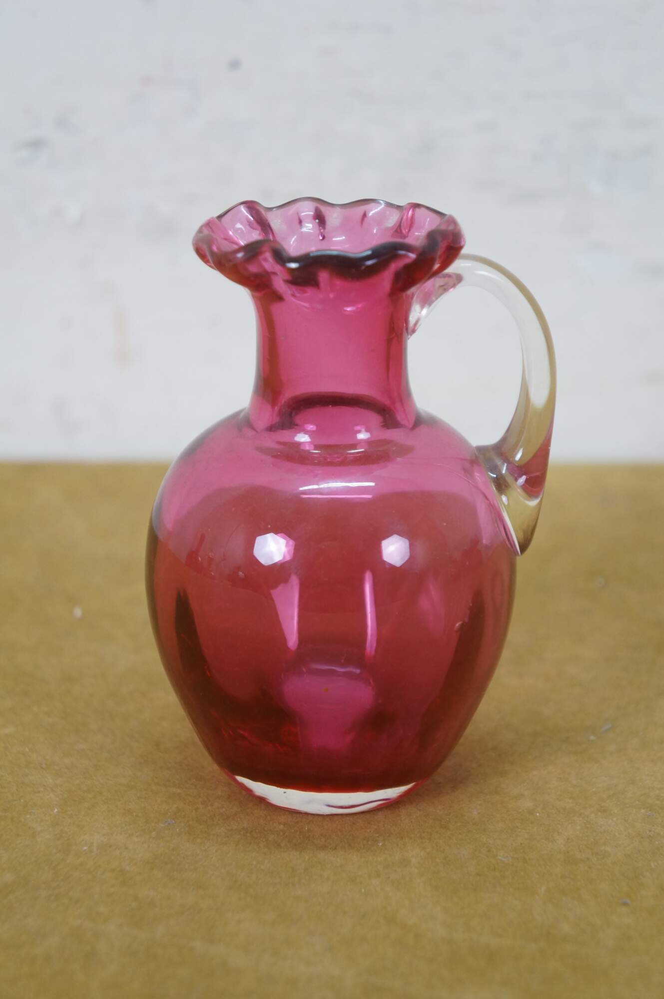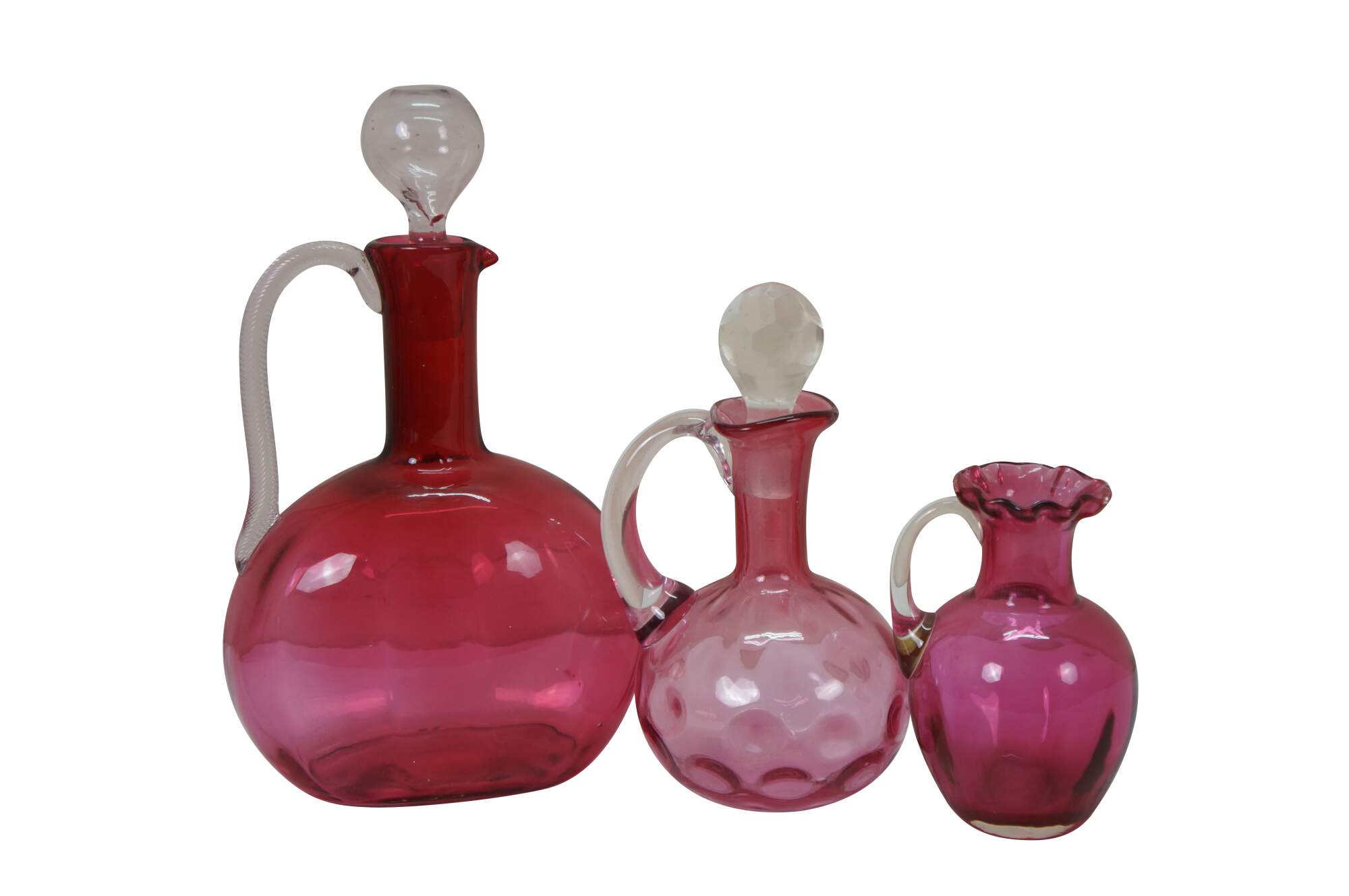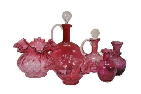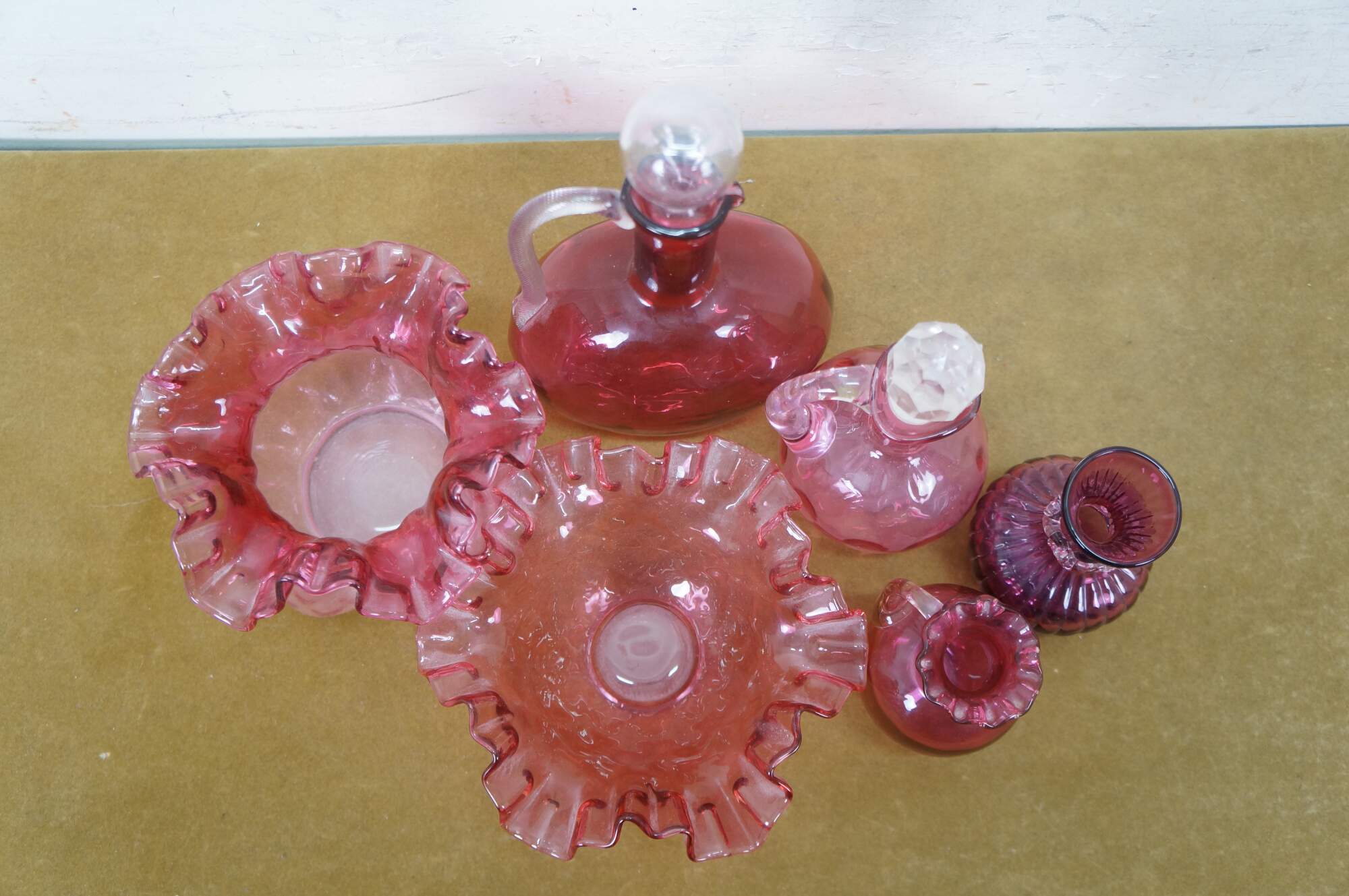 6 Cranberry Art Glass Ruffled Pitchers Decanters Vase Bowl Compote Fenton
