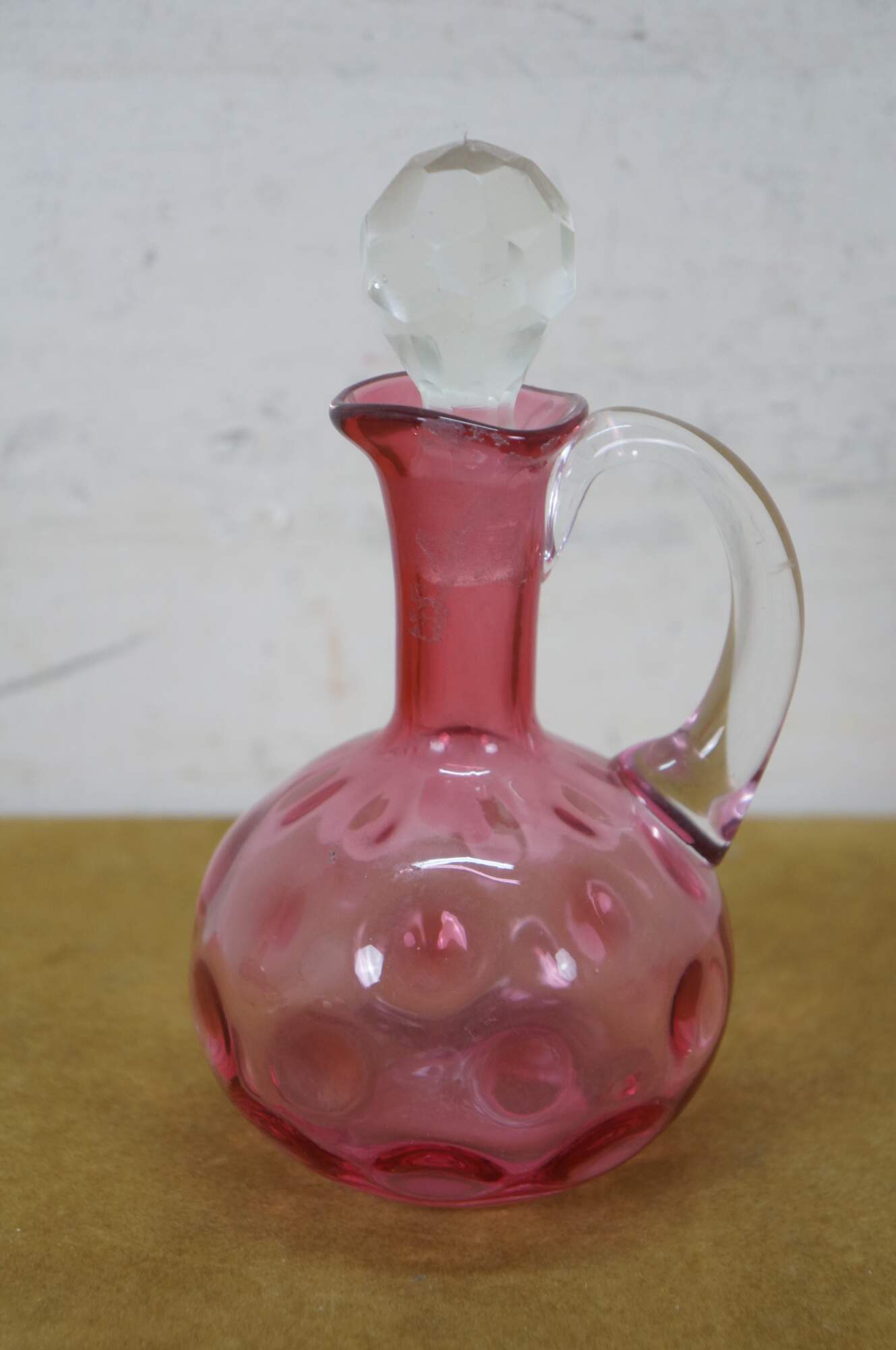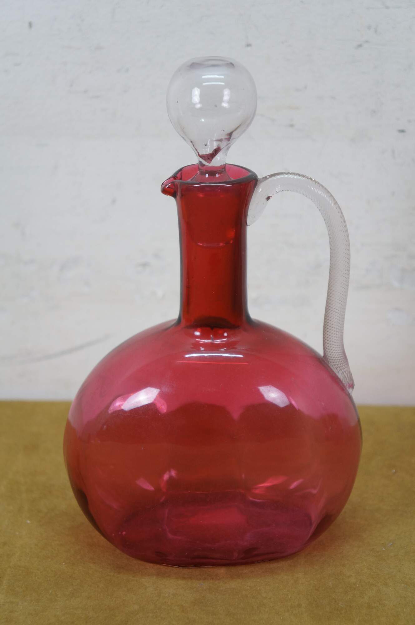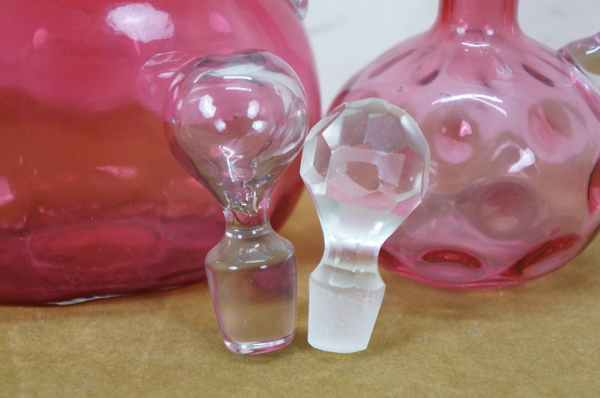 Six mid to early century cranberry art glass serving pieces featuring an English Victorian decanter with polished pontil and stopper, a Fenton coin dot / thumbprint cruet, a Victorian ruffled creamer pitcher, a Pilgrim Glass optic bud vase with an applied clear glass neck decoration, and two Fenton ruffled clambroth bowls / compotes.