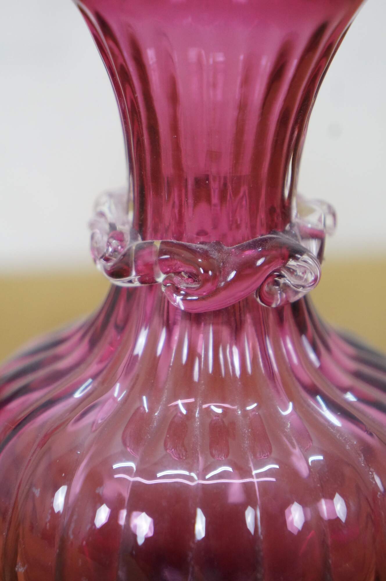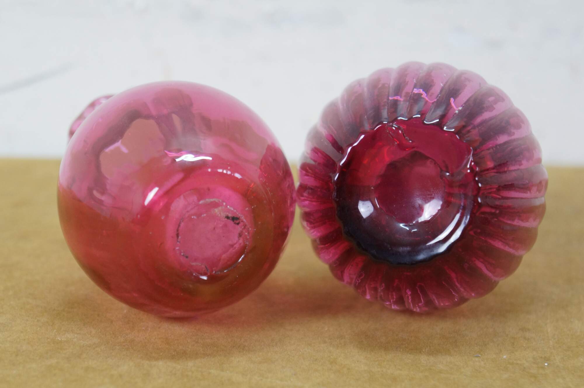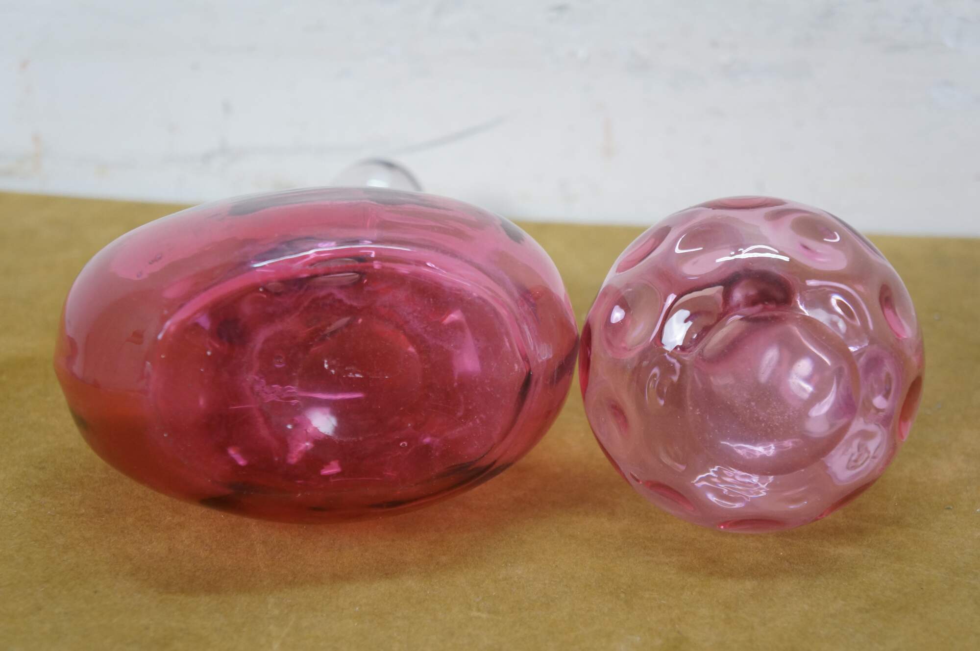 Six mid to early century cranberry art glass serving pieces featuring an English Victorian decanter with polished pontil and stopper, a Fenton coin dot / thumbprint cruet, a Victorian ruffled creamer pitcher, a Pilgrim Glass optic bud vase with an applied clear glass neck decoration, and two Fenton ruffled clambroth bowls / compotes.