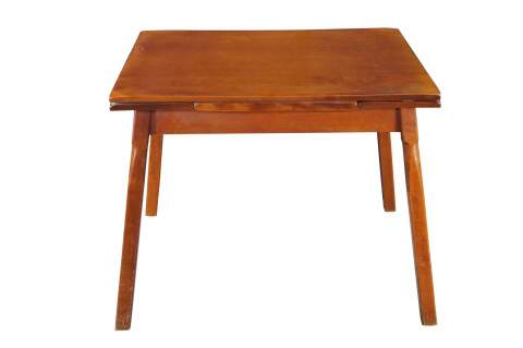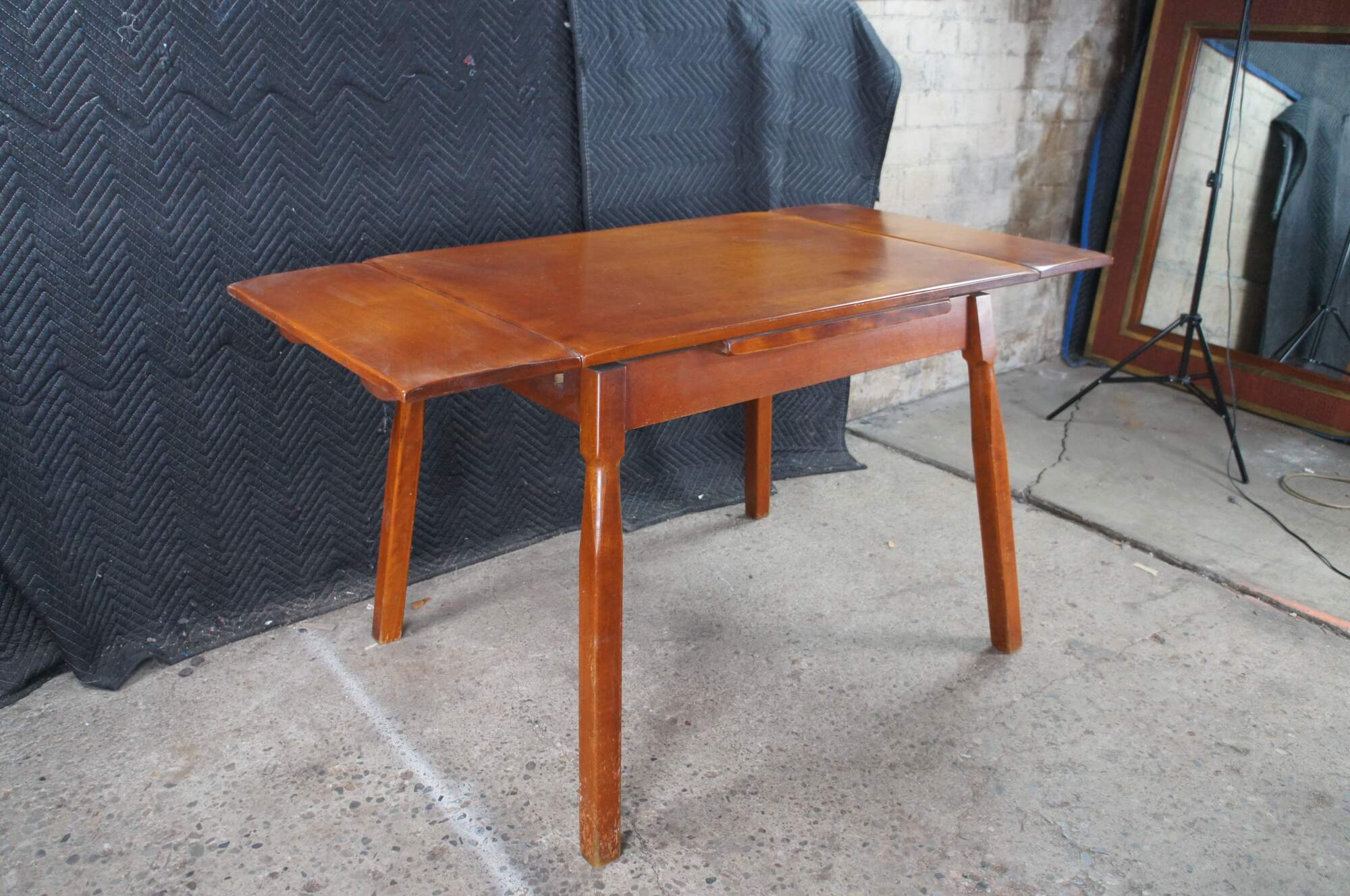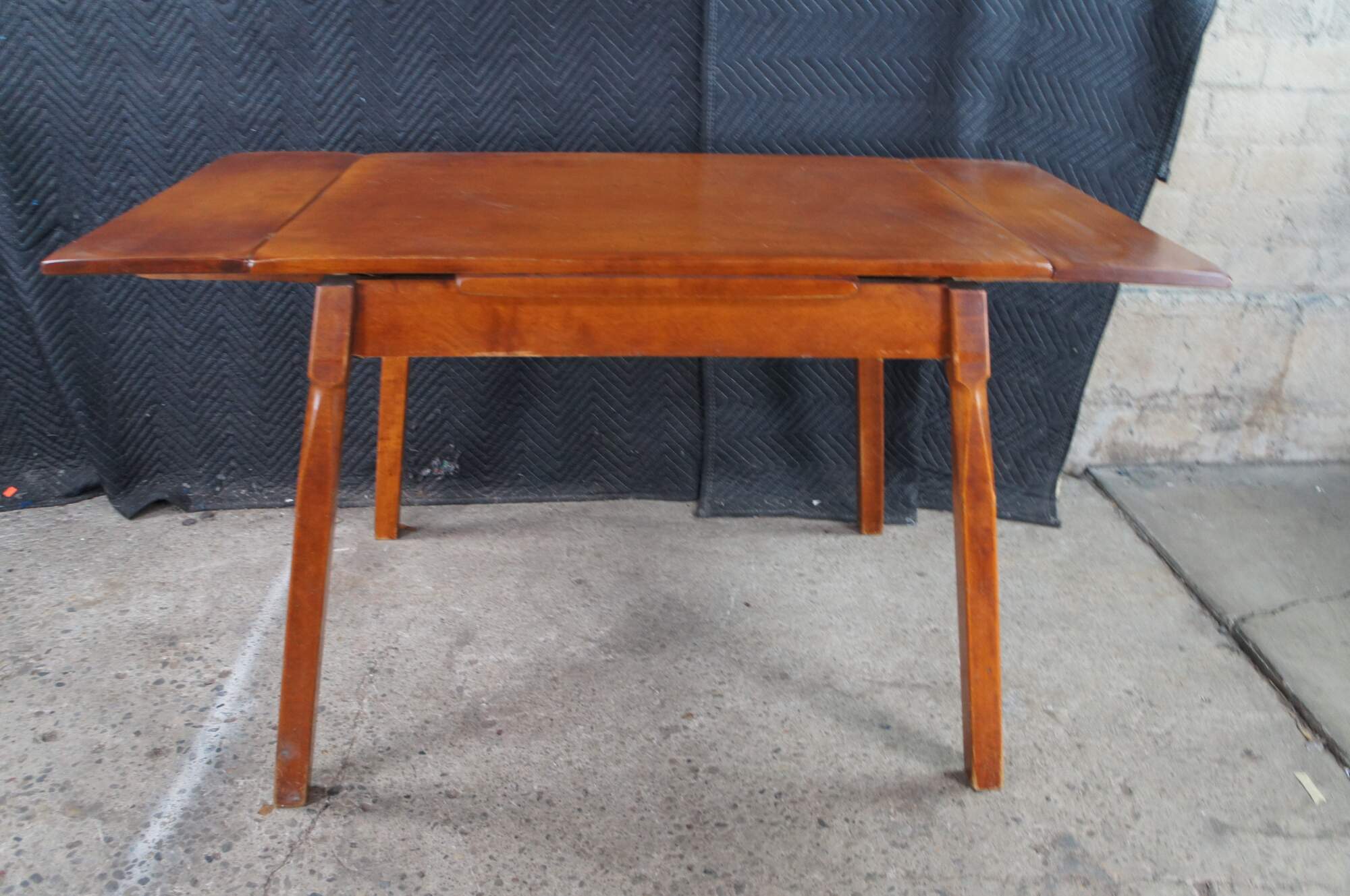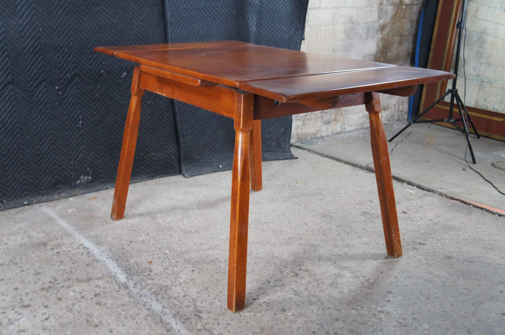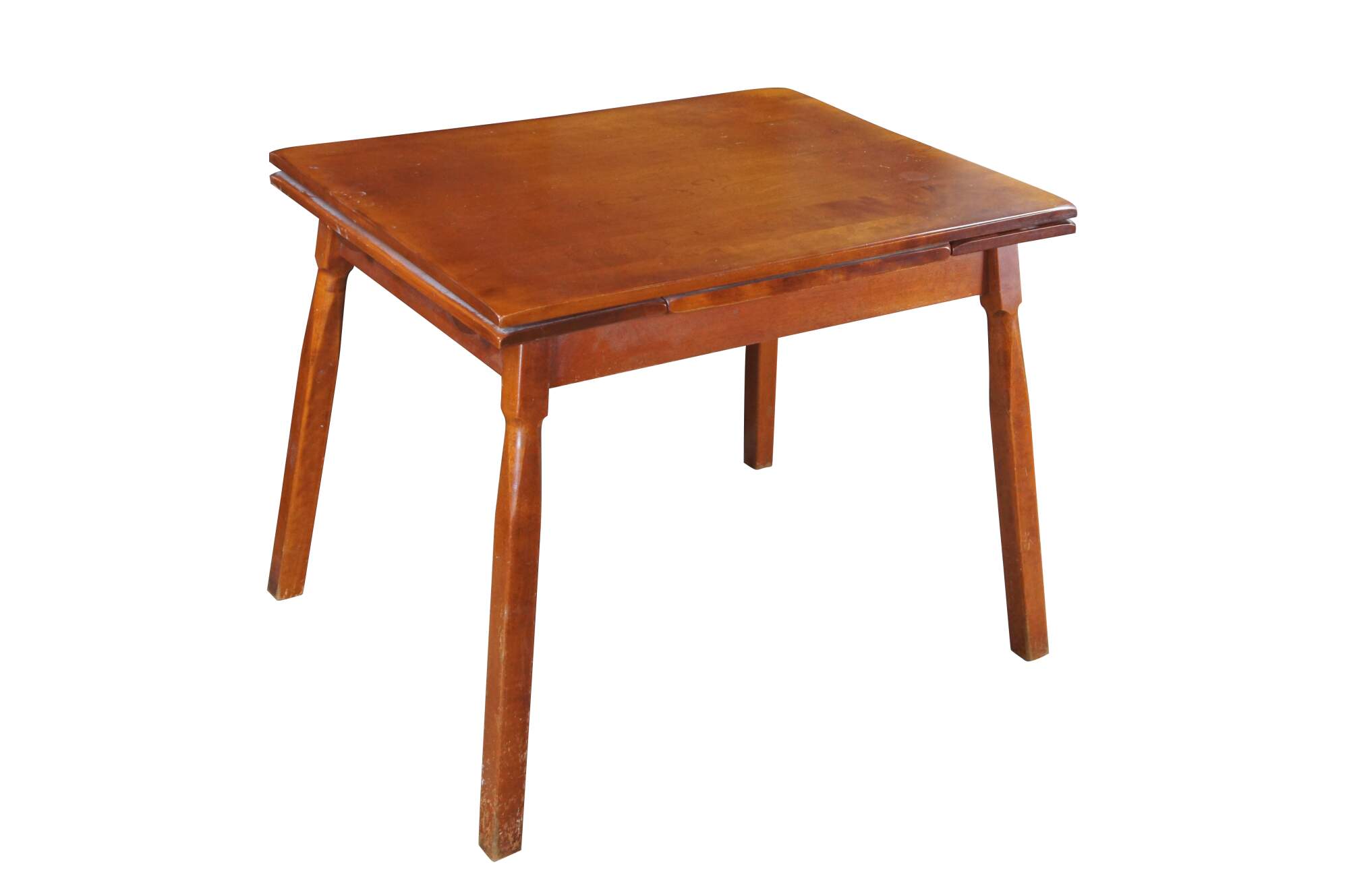 A Quaint Mid Century Heywood-Wakefield Dining Table. Features a rectangular frame made from maple with two draw leafs for extension. The table is supported by angular square legs. The perfect table for smaller scale dining area or breakfast nook.