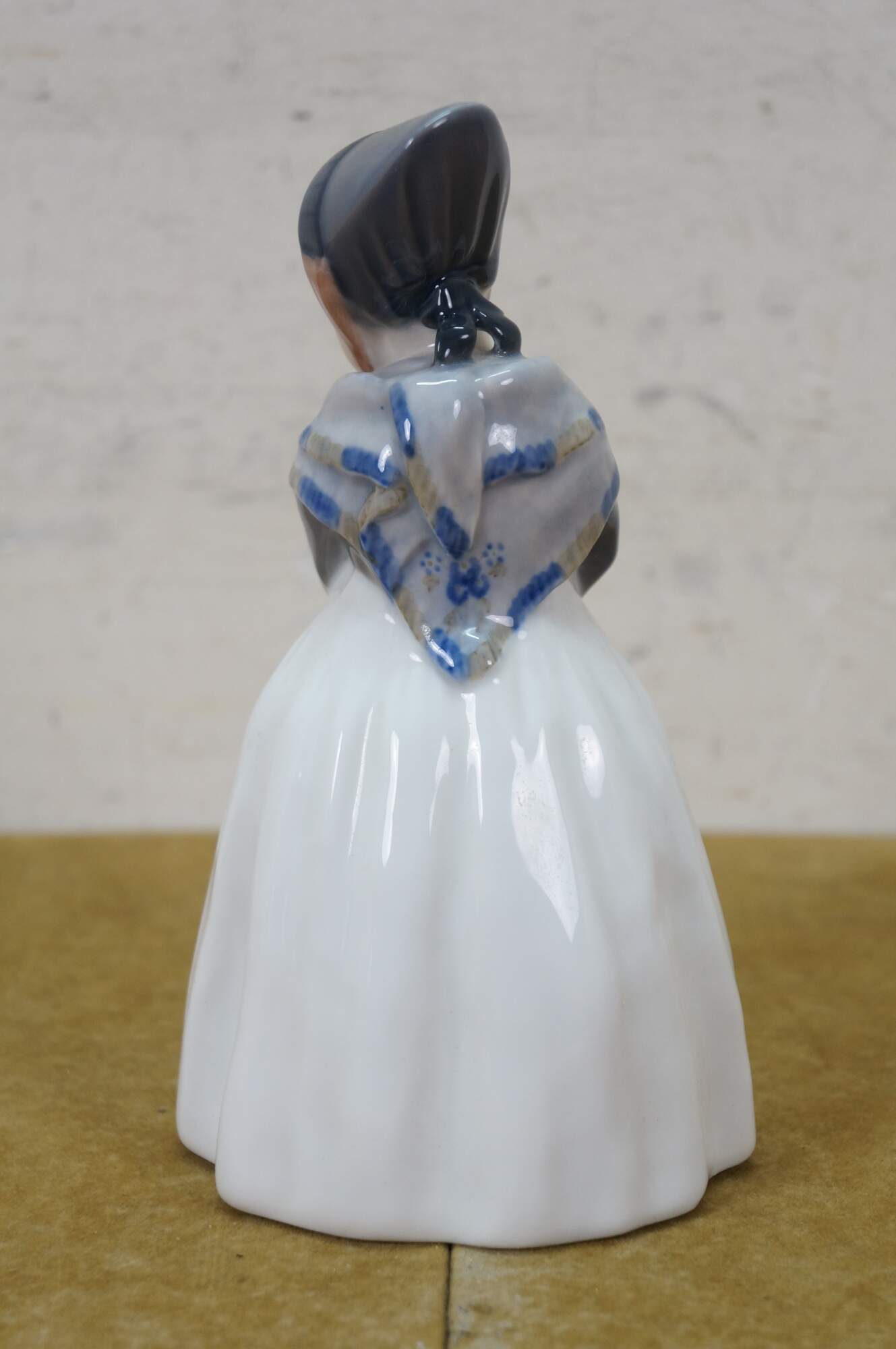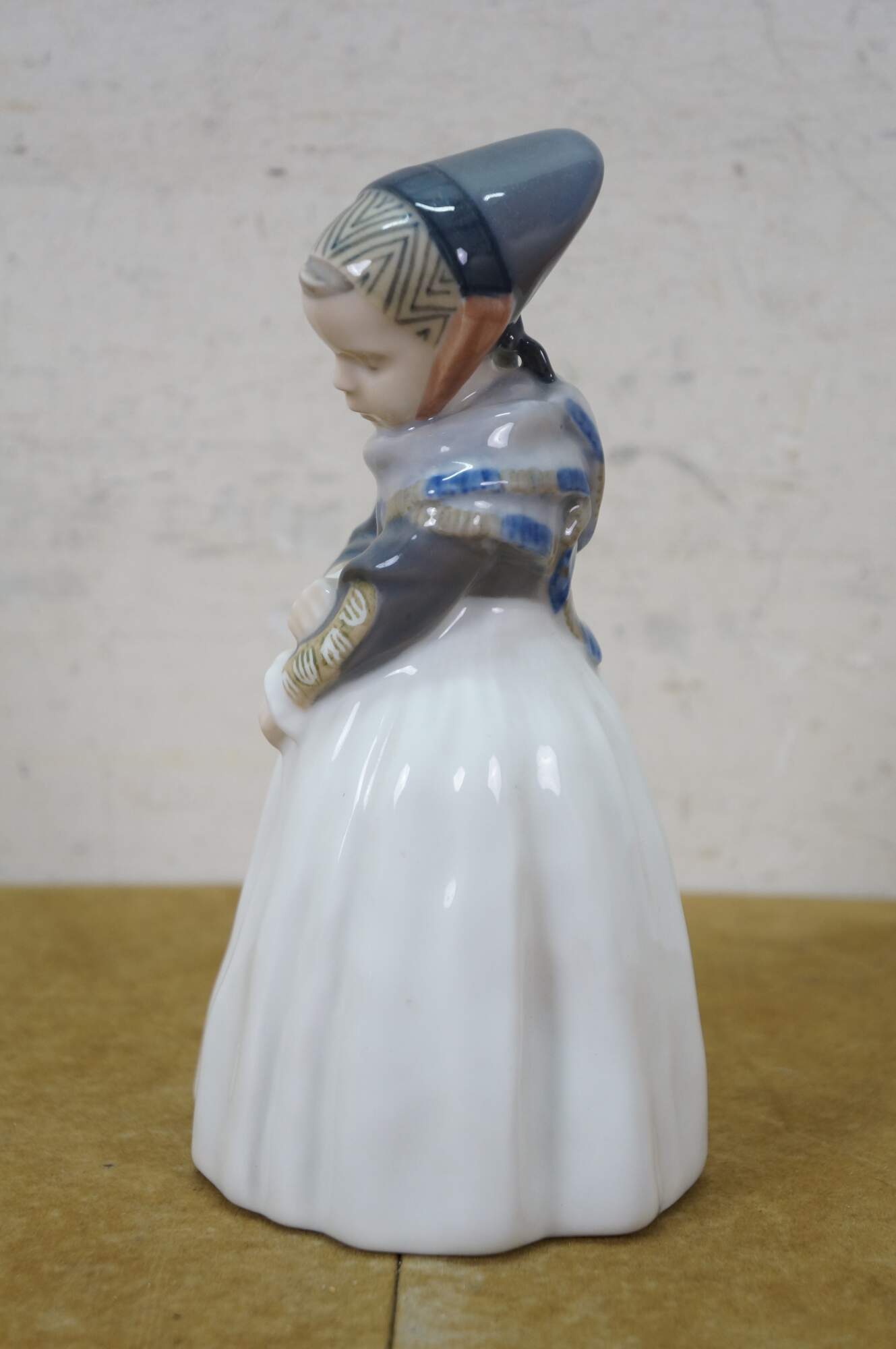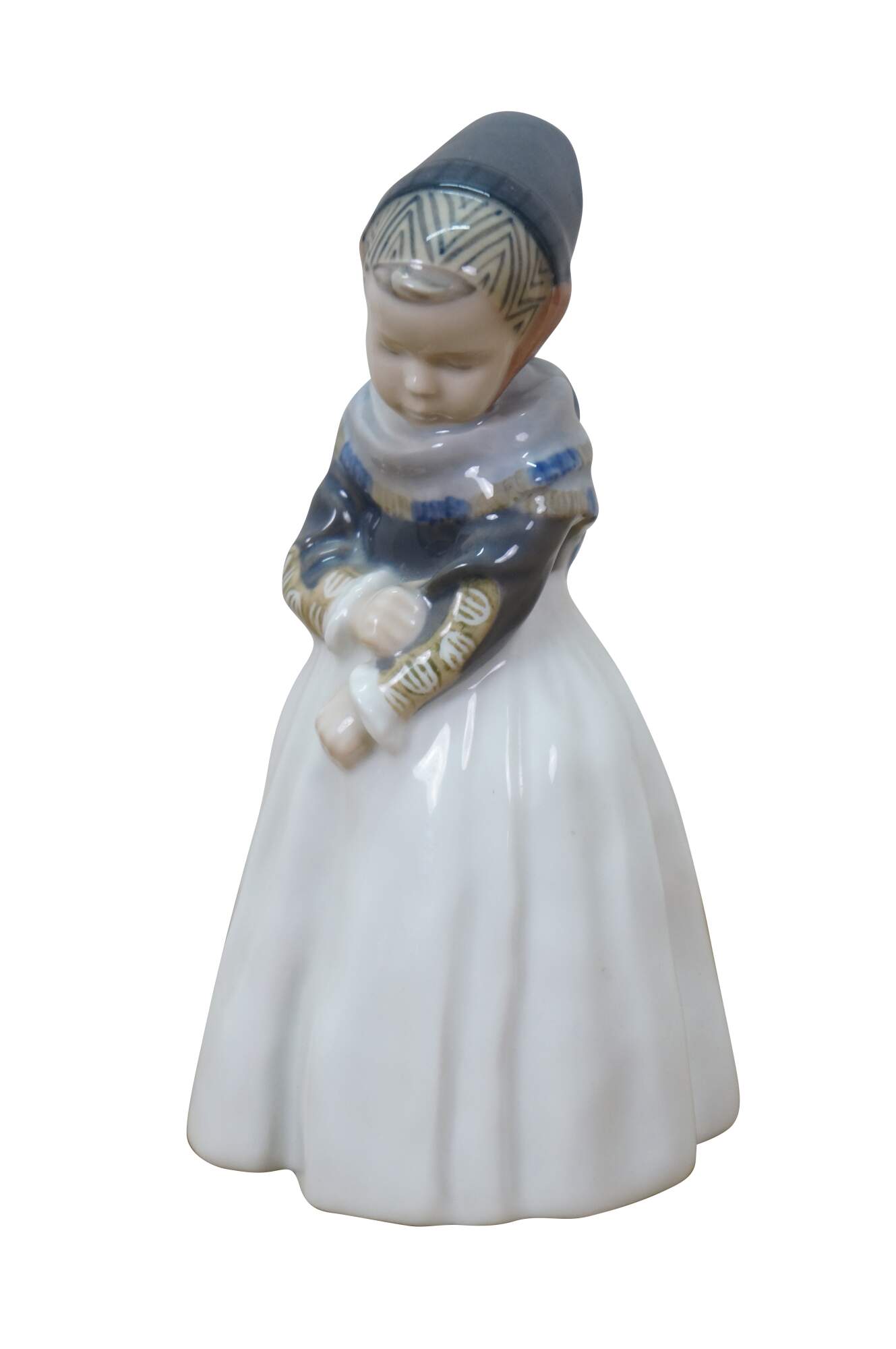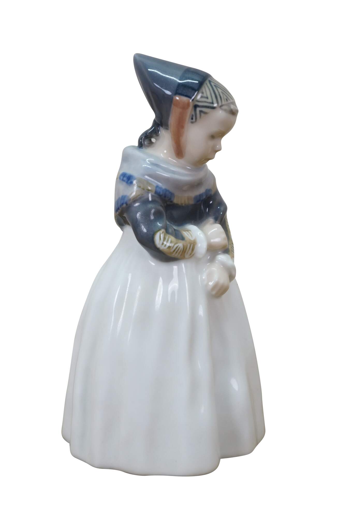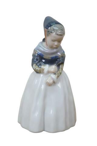1969-1974 Royal Copenhagen Amager Girl porcelain figurine, model 1251. Designed in 1911 by Lotte Benter and produced in Denmark, it depicts a young girl in traditional Danish regional dress.