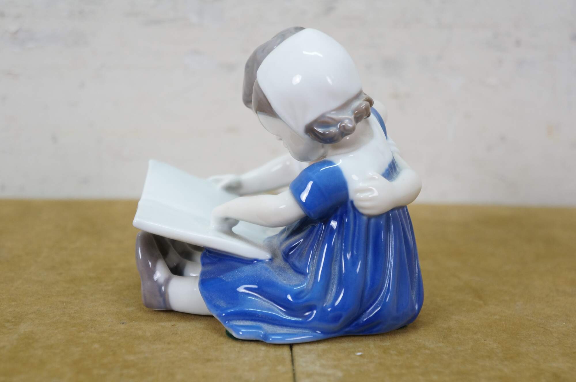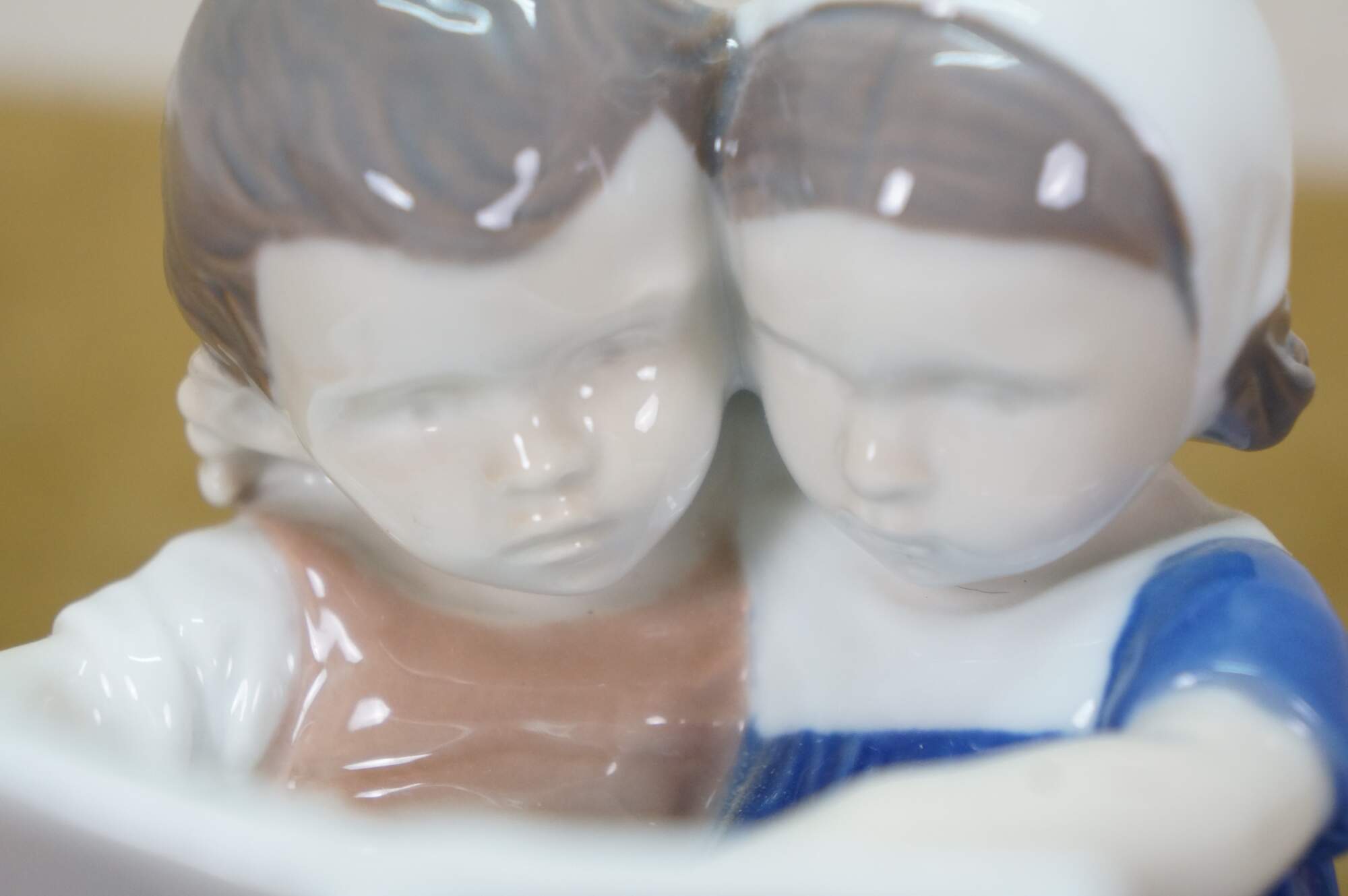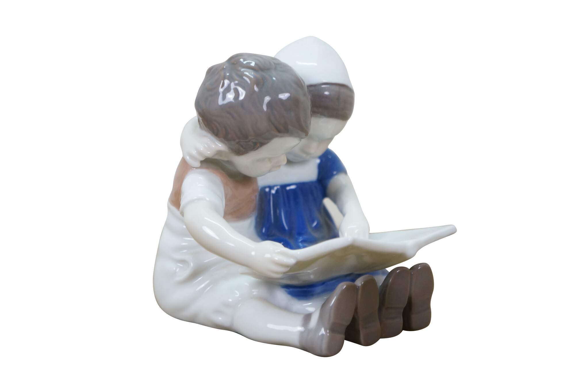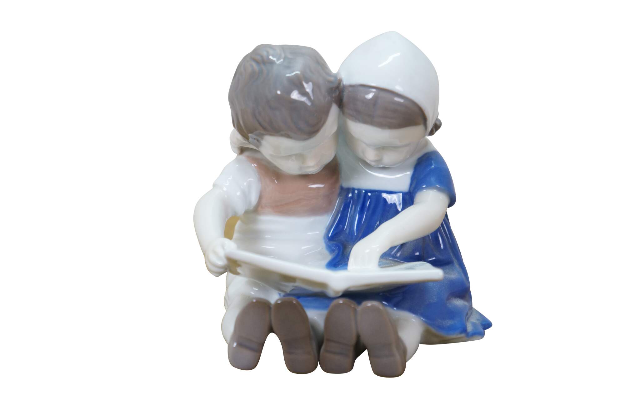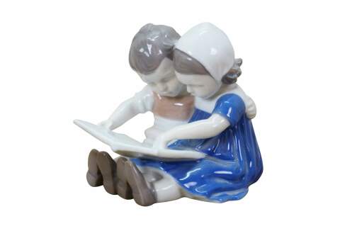 Antique 1915-1947 Bing & Grøndahl porcelain figurine titled Children Reading, model 1567. It depicts a young boy and girl seated together, reading a book. Designed by artist Ingeborg Plockross Irminger.