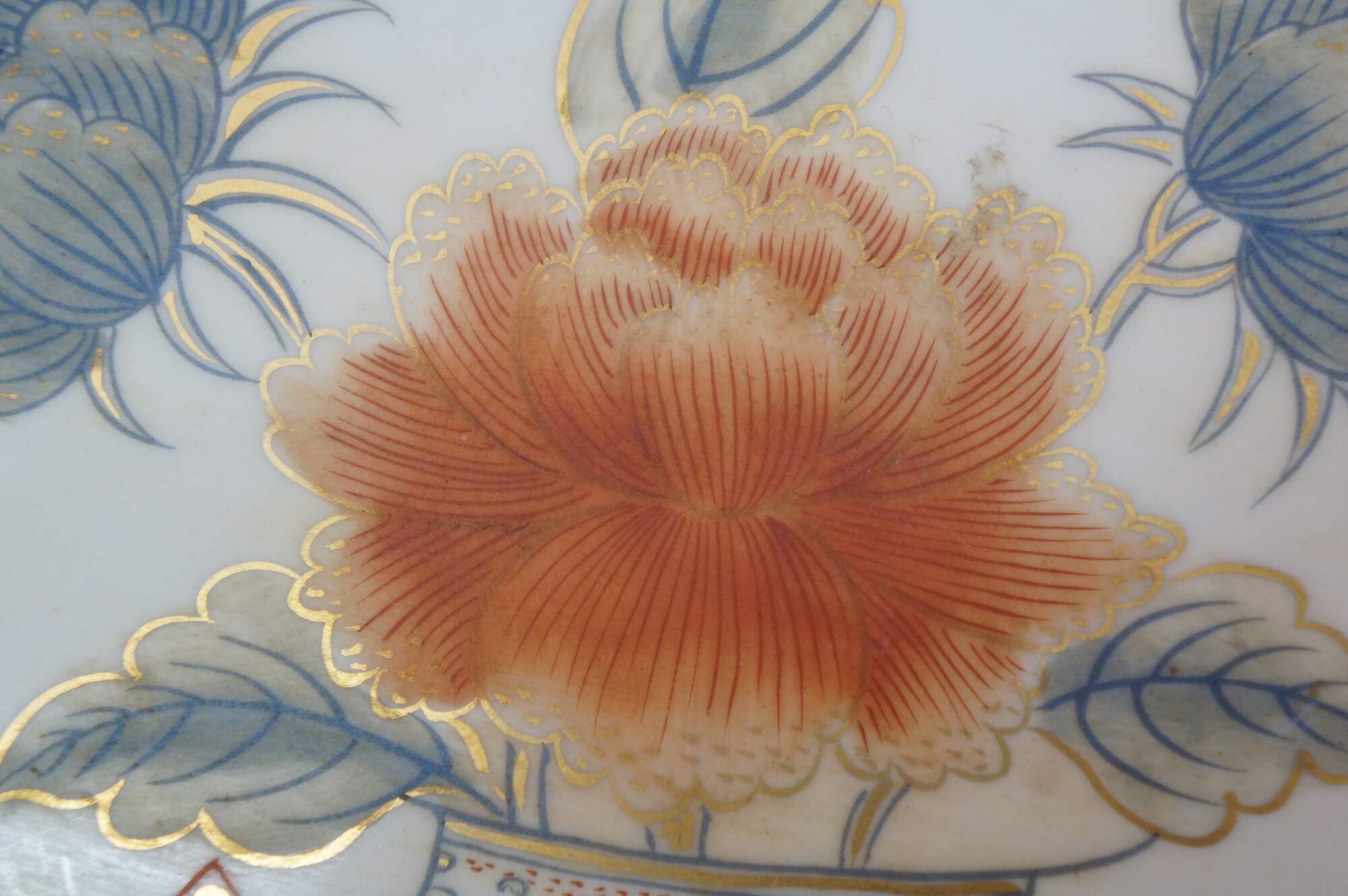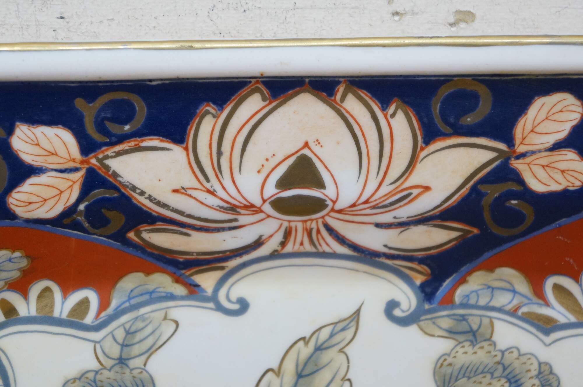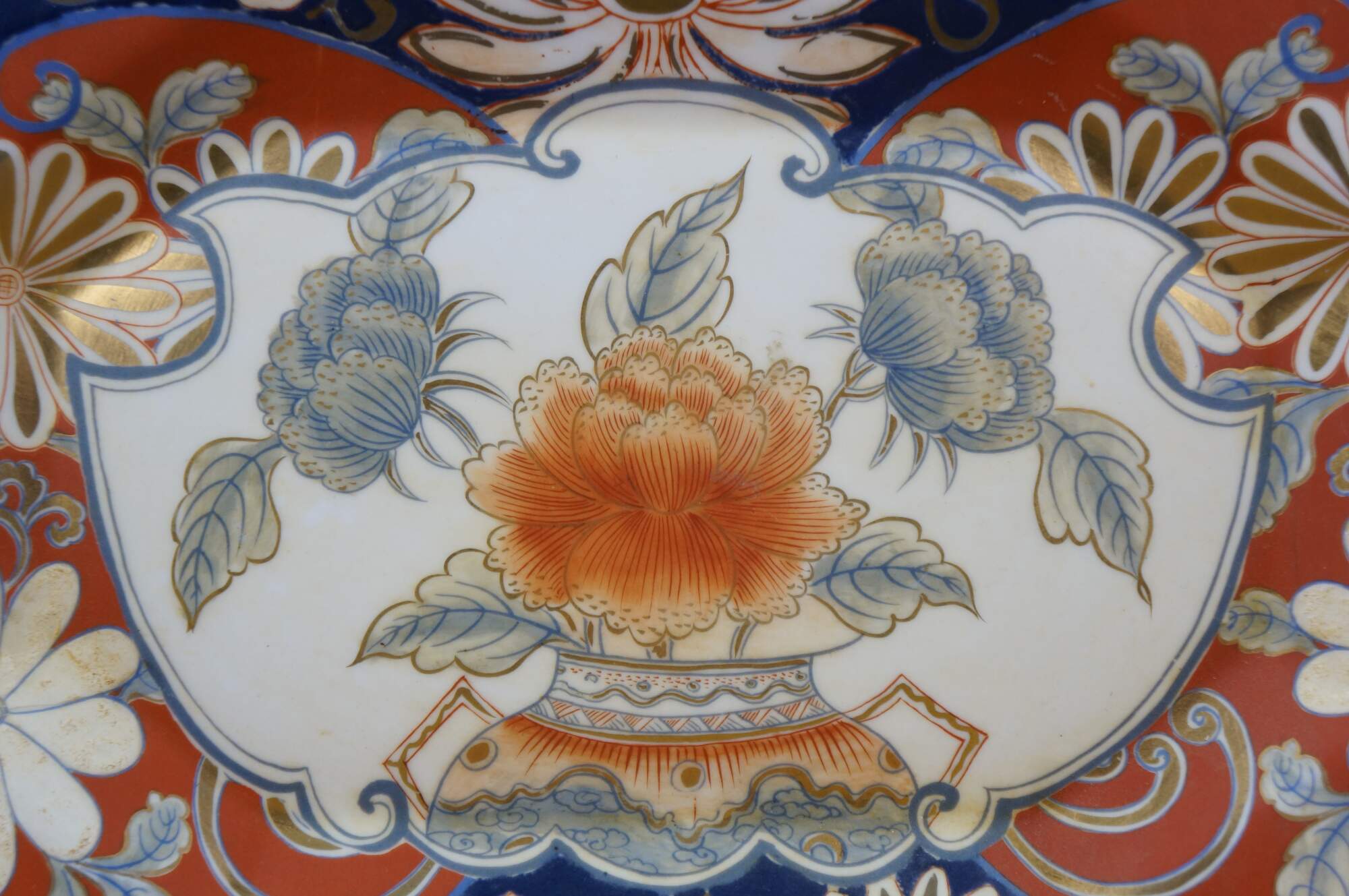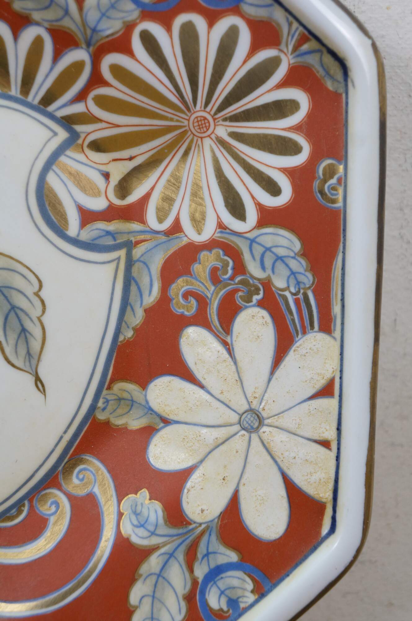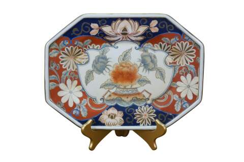Antique Japanese Imari porcelain octagonal floral Chrysanthemums plate or serving dish featuring traditional bright colors, including a rich underglaze blue and overglaze red-orange, accented with gold gilt.