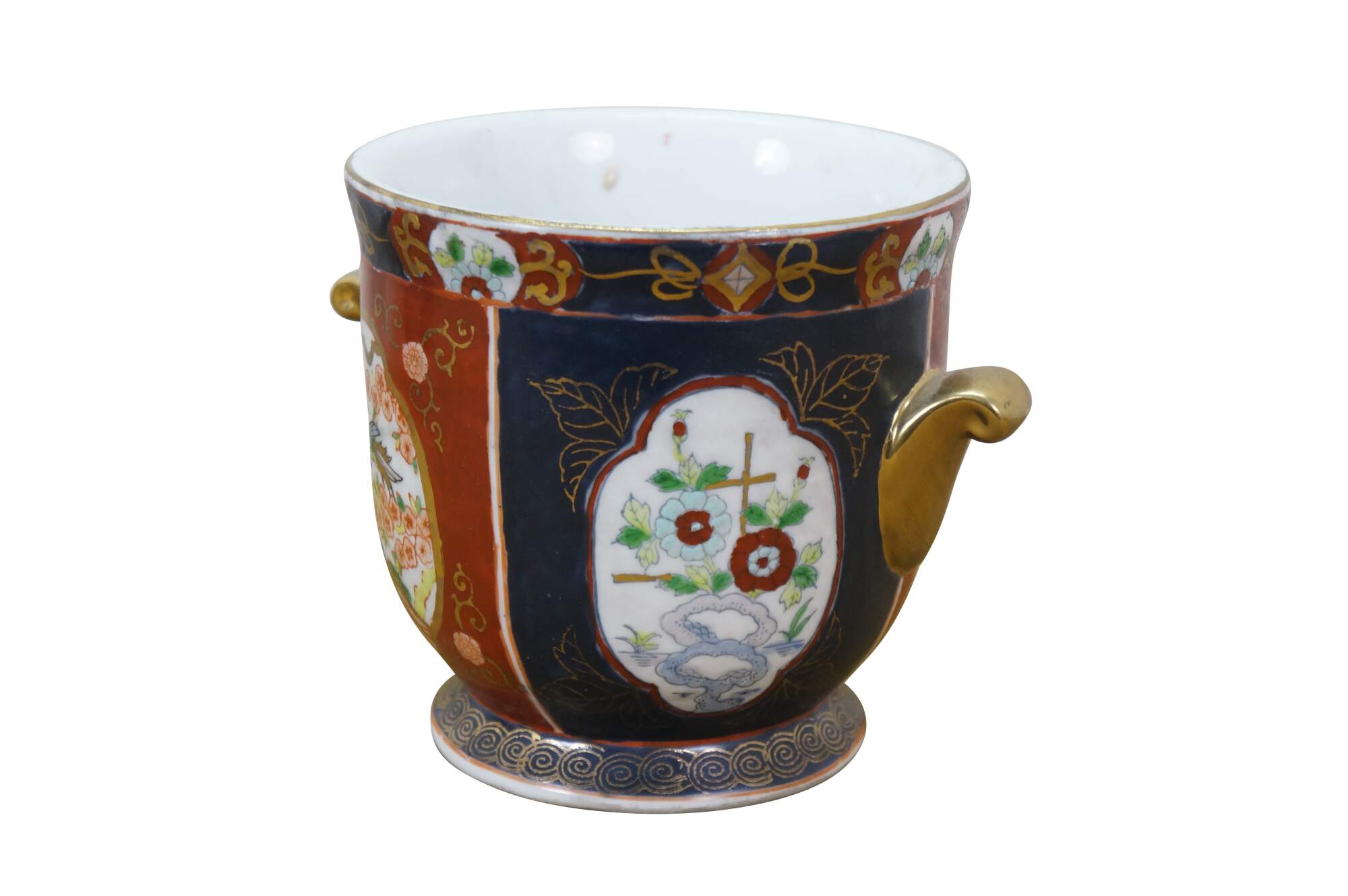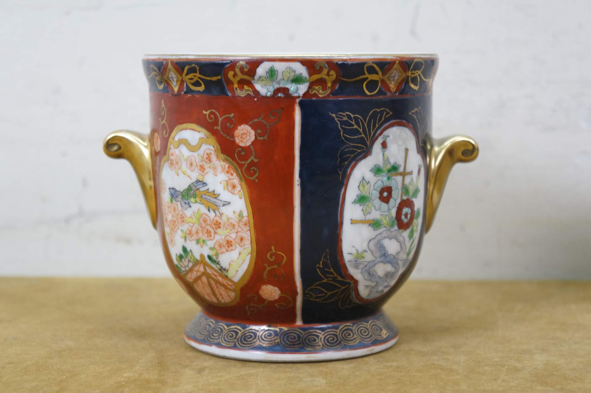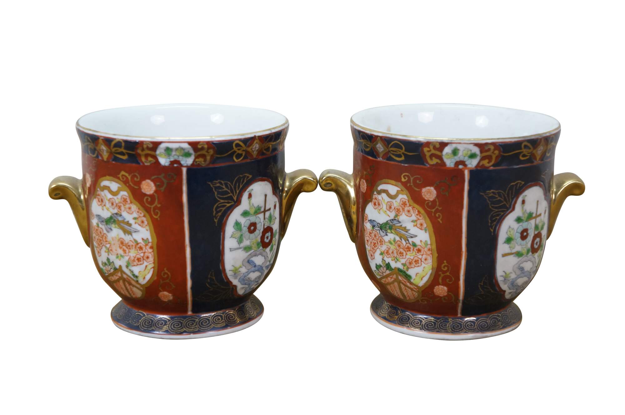Pair of vintage Japanese hand-painted Gold Imari style porcelain cachepots / urns / planters. They feature the classic Imari palette of cobalt blue, rust red, and gold accent handles. The design includes panels with floral and bird motifs.