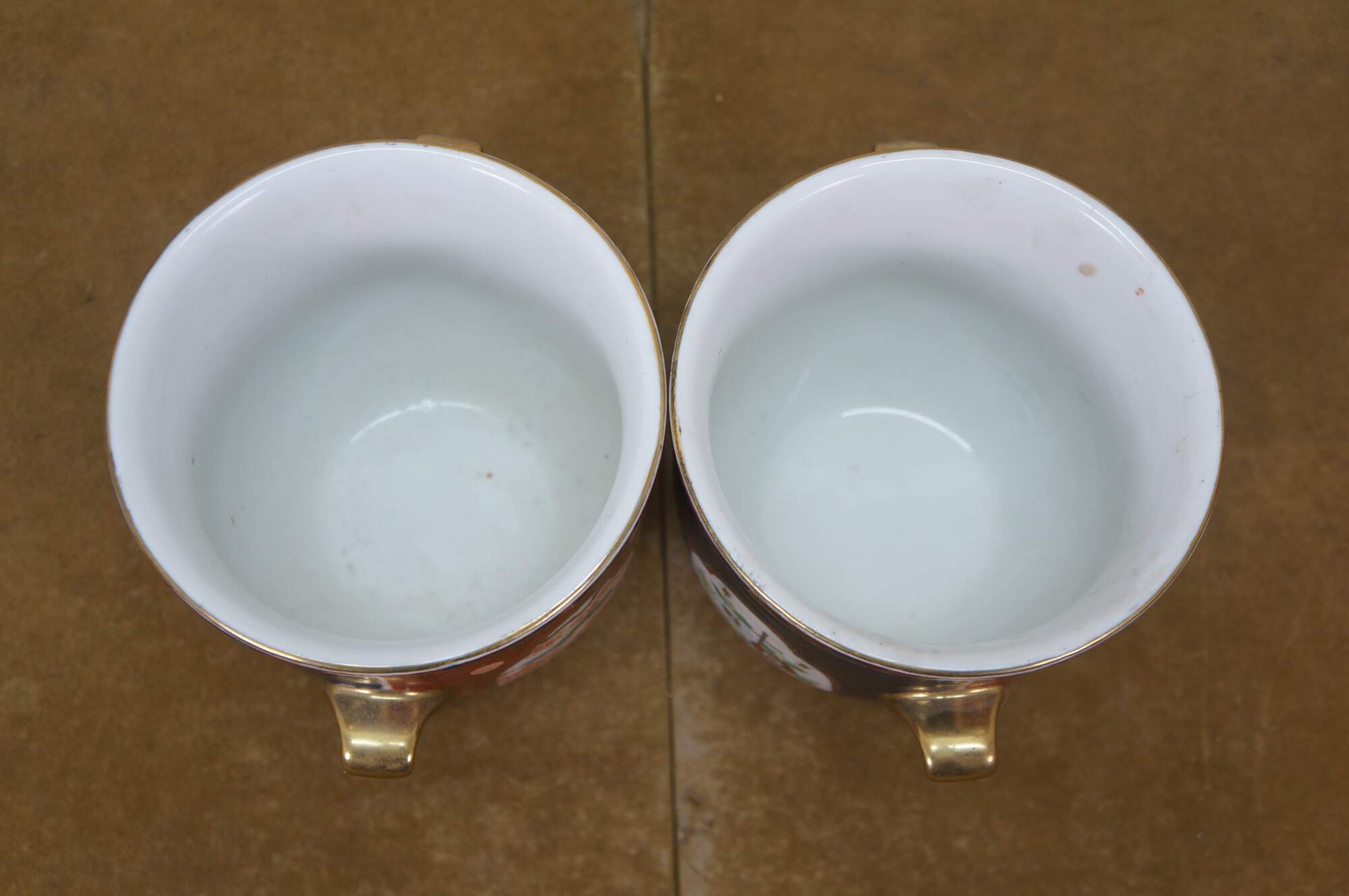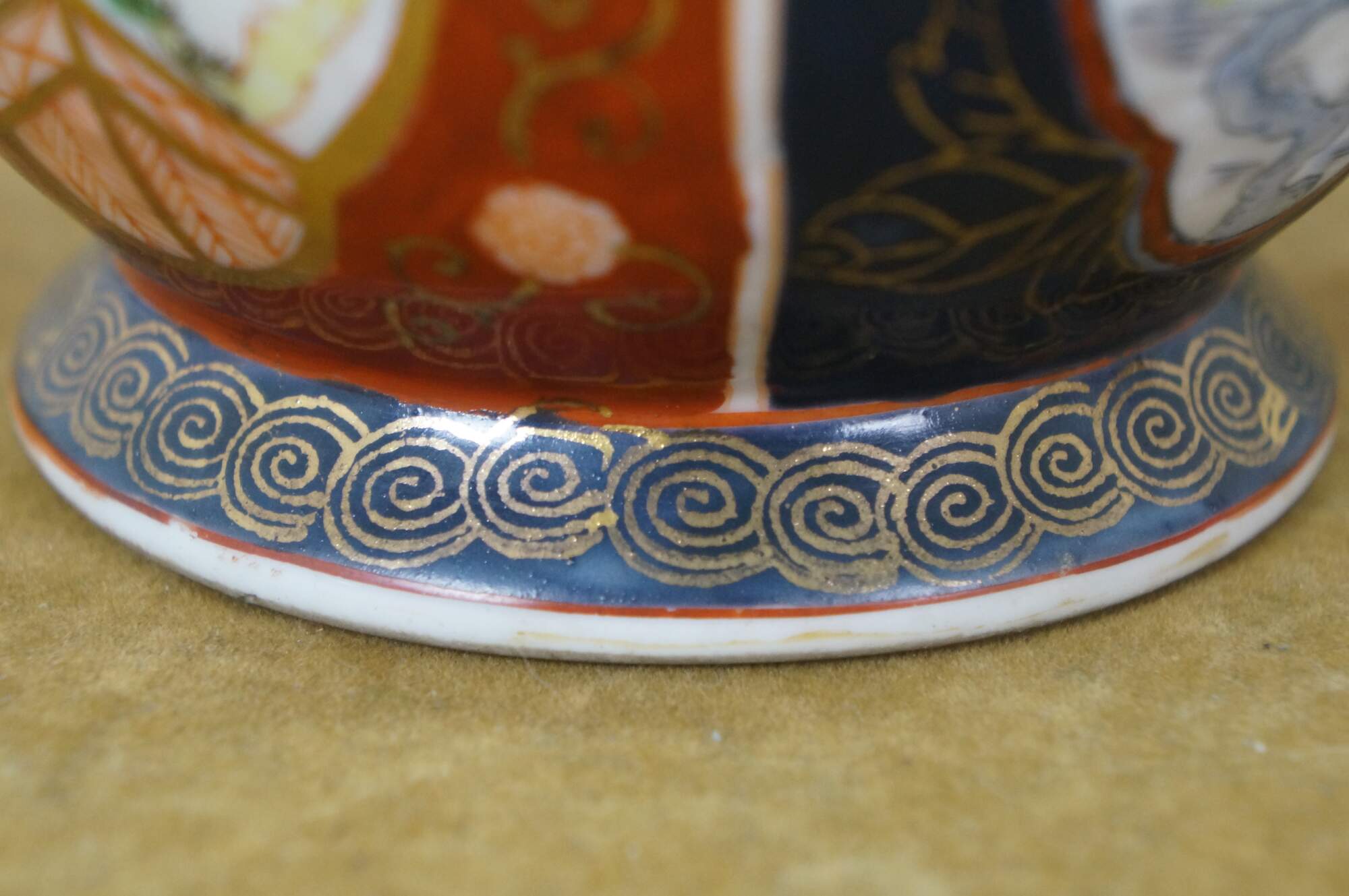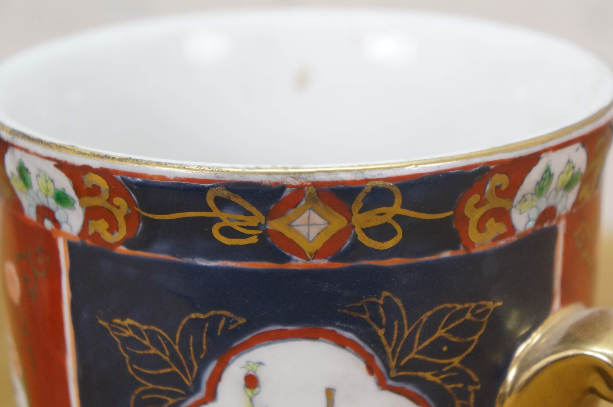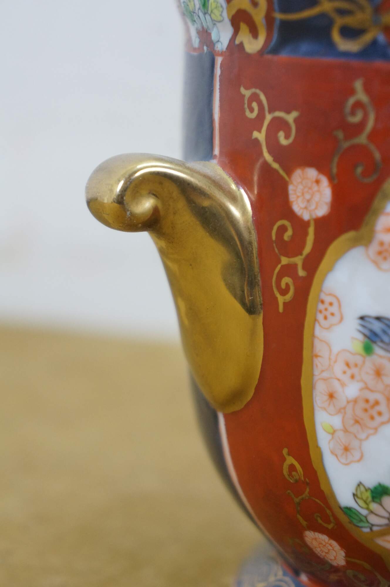 Pair of vintage Japanese hand-painted Gold Imari style porcelain cachepots / urns / planters. They feature the classic Imari palette of cobalt blue, rust red, and gold accent handles. The design includes panels with floral and bird motifs.