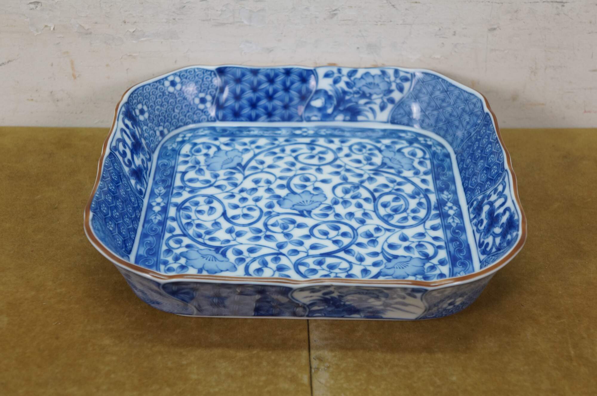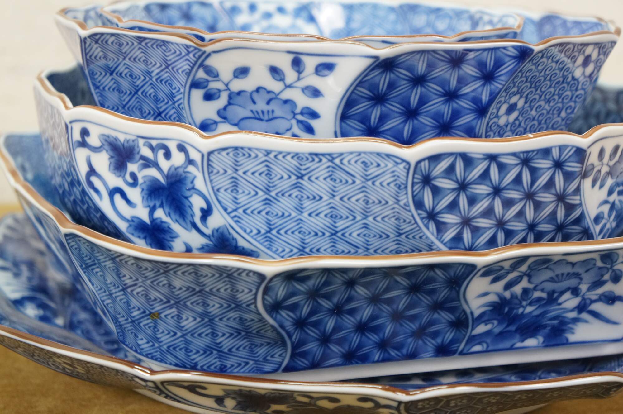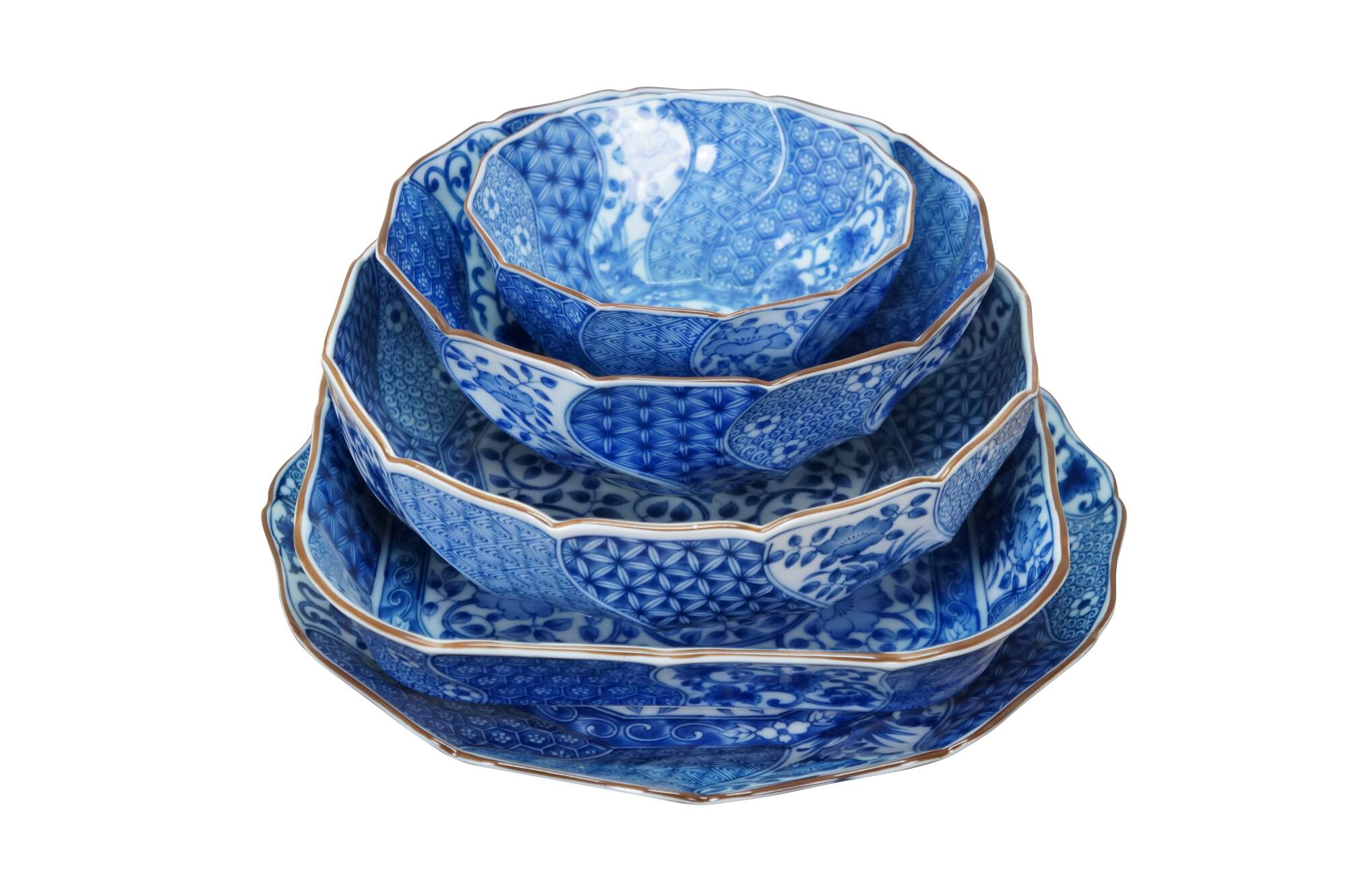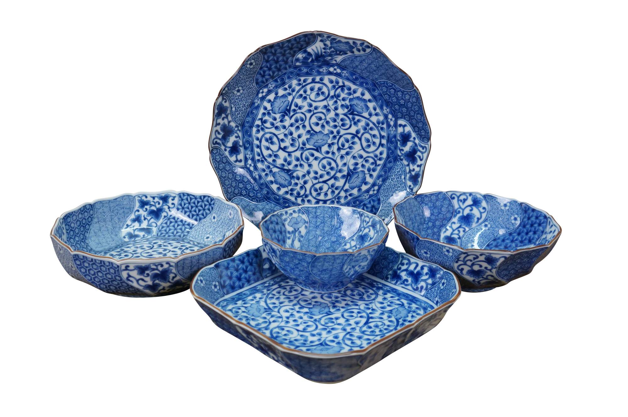 Vintage Japanese Minoyaki Nejiri Shouzui porcelain serving pieces featuring a distinctive blue and white arabesque (Sometsuke) pattern with wavy rim. Includes three bowls, a large centerpiece plate / platter, and square casserole dish.