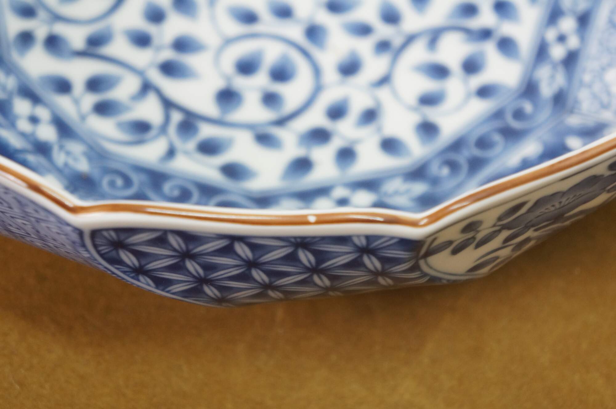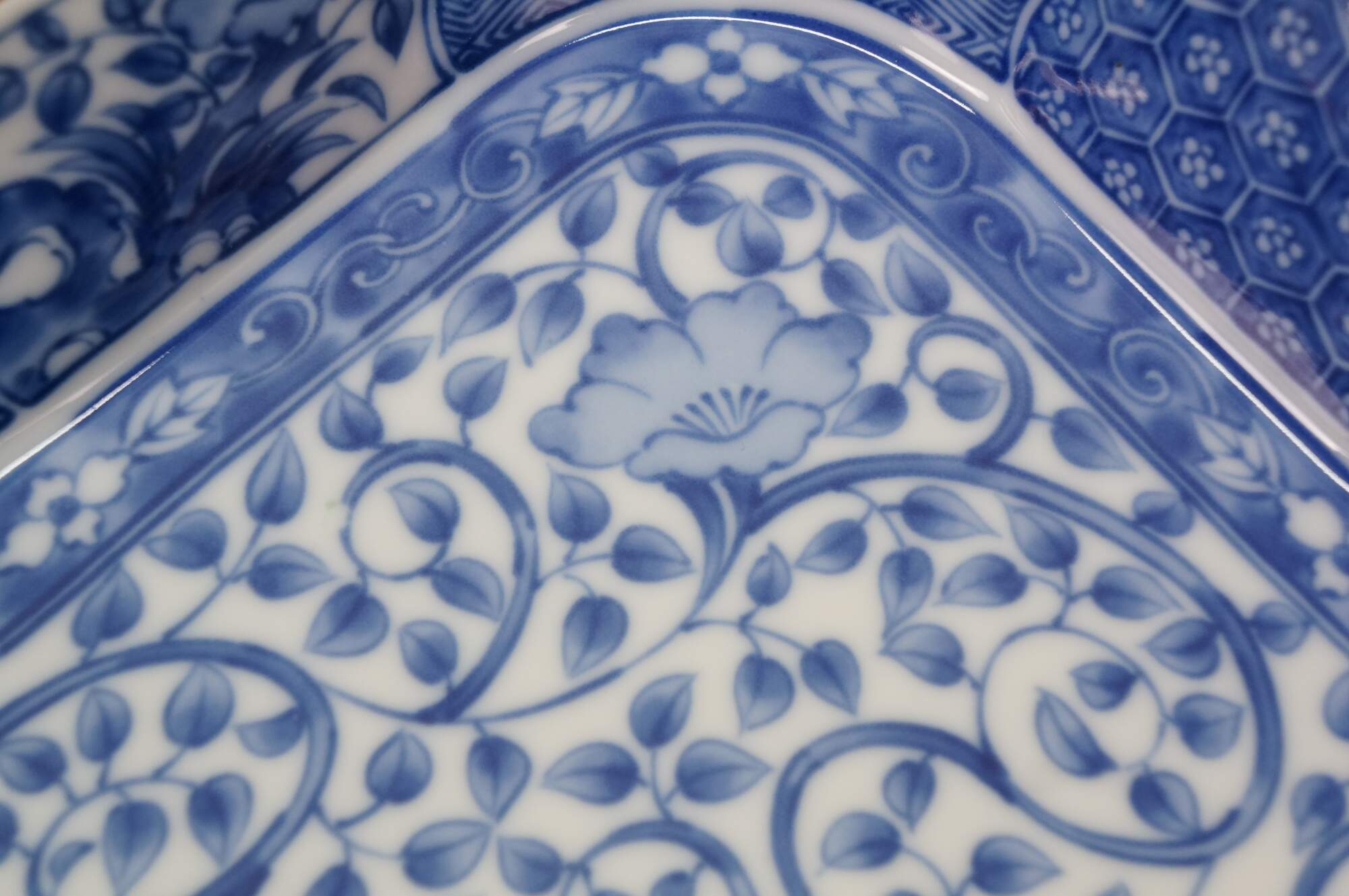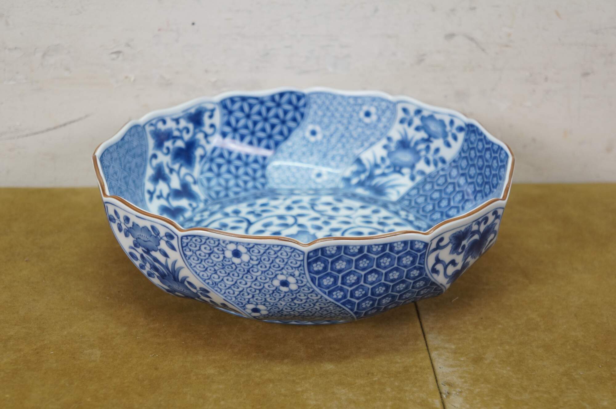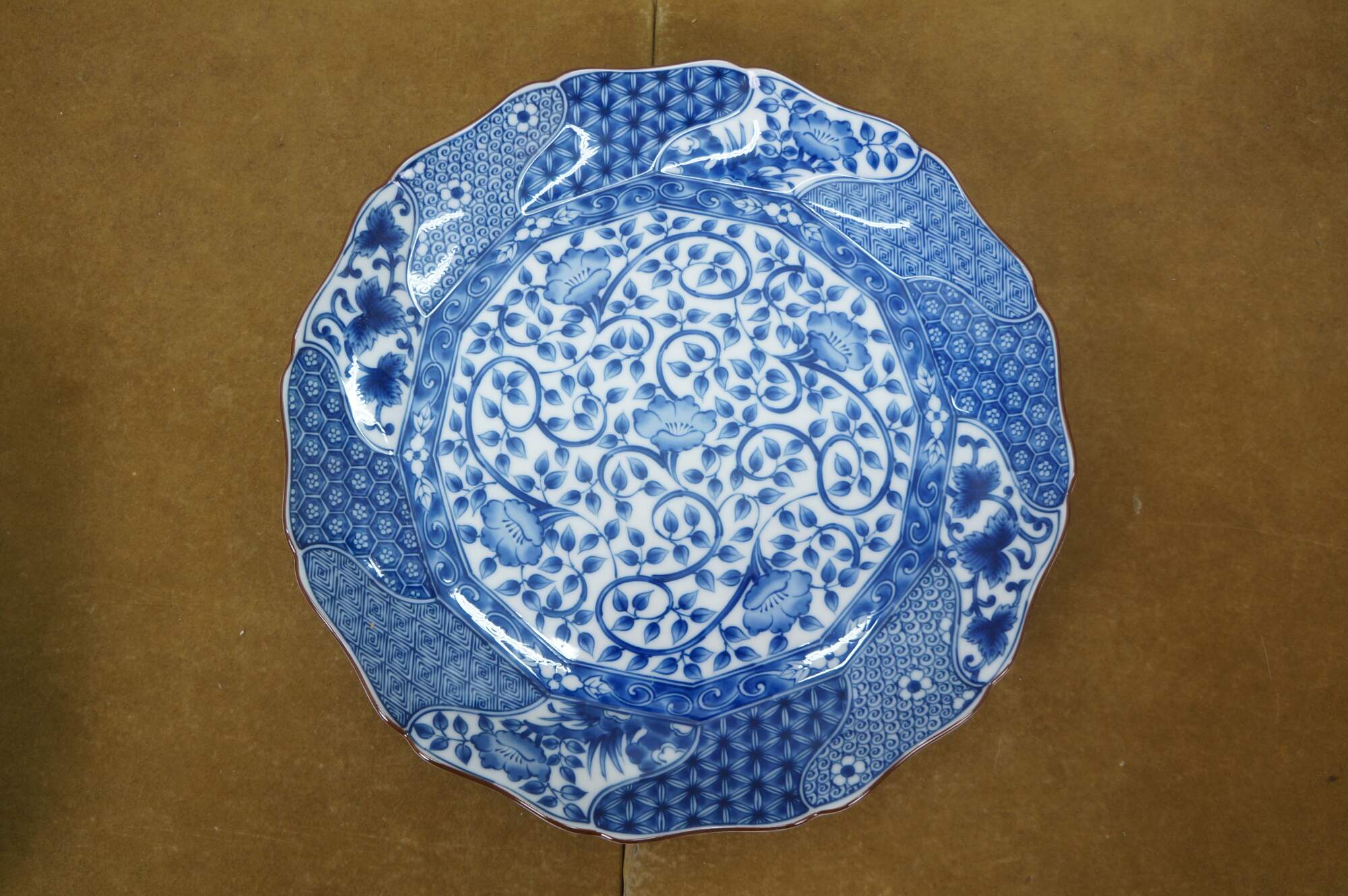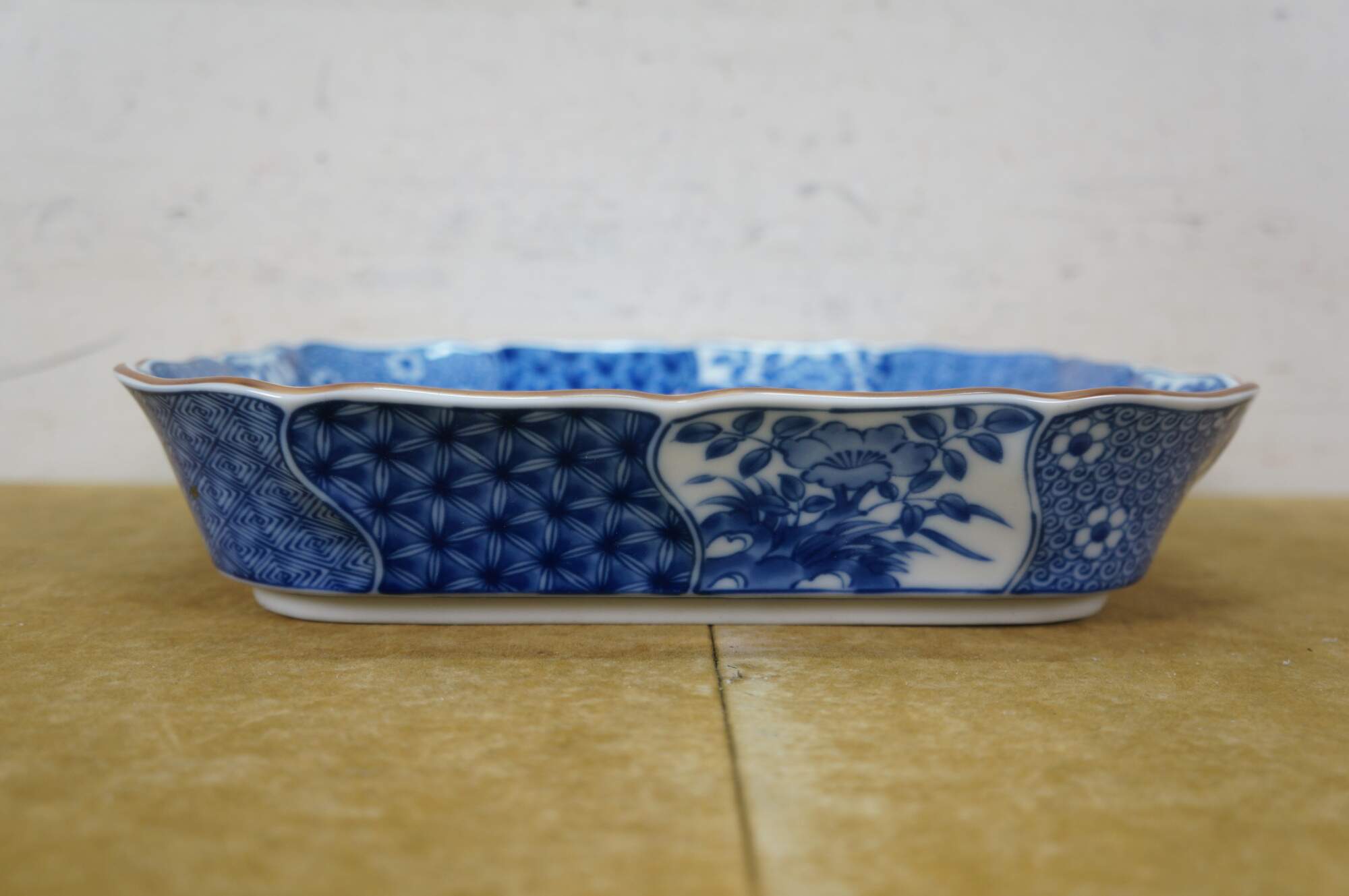 Vintage Japanese Minoyaki Nejiri Shouzui porcelain serving pieces featuring a distinctive blue and white arabesque (Sometsuke) pattern with wavy rim. Includes three bowls, a large centerpiece plate / platter, and square casserole dish.