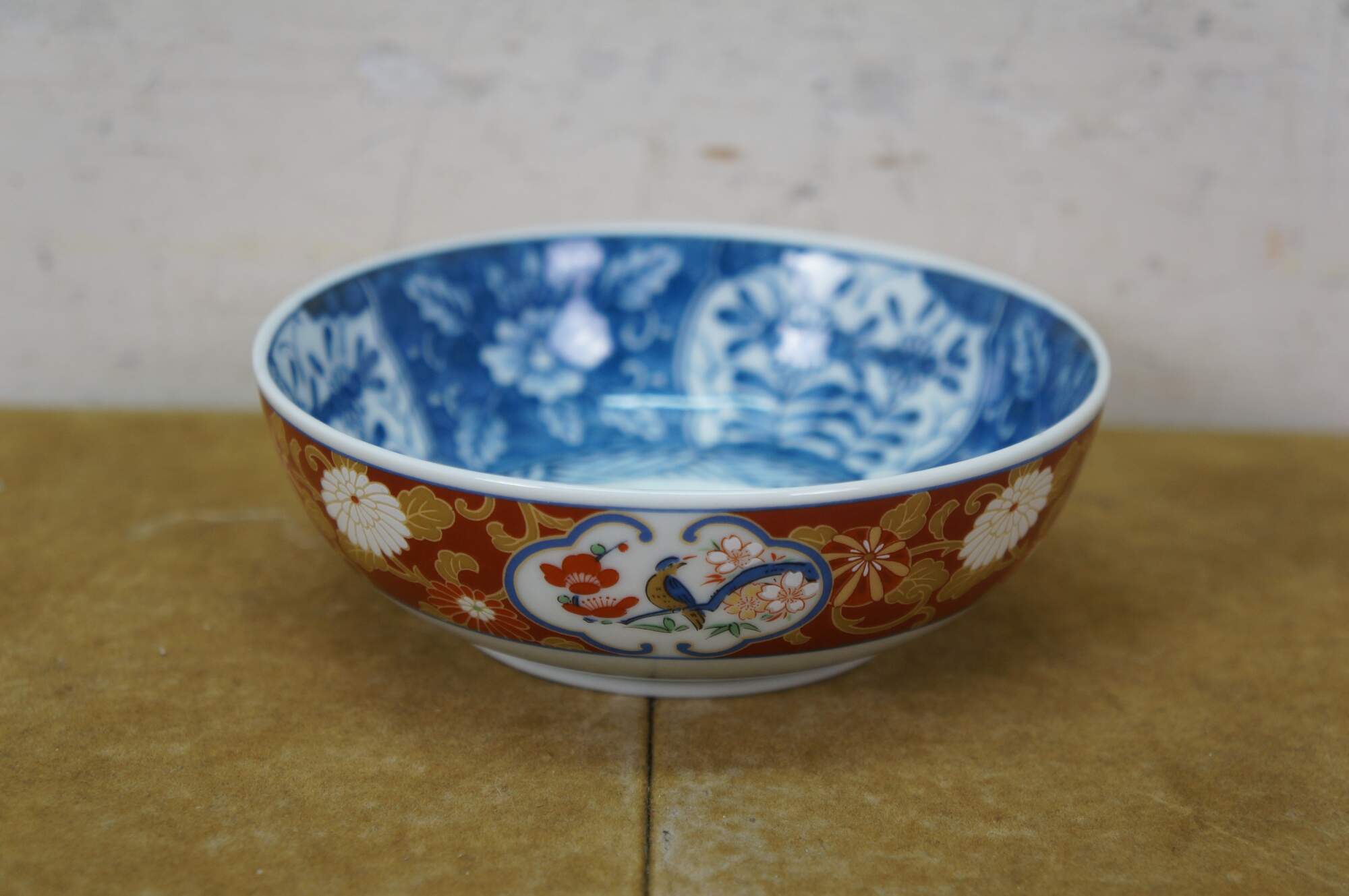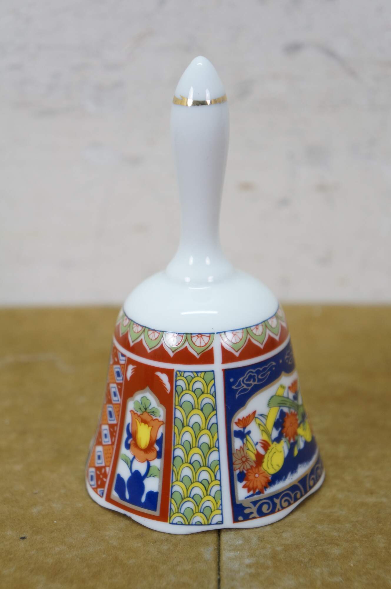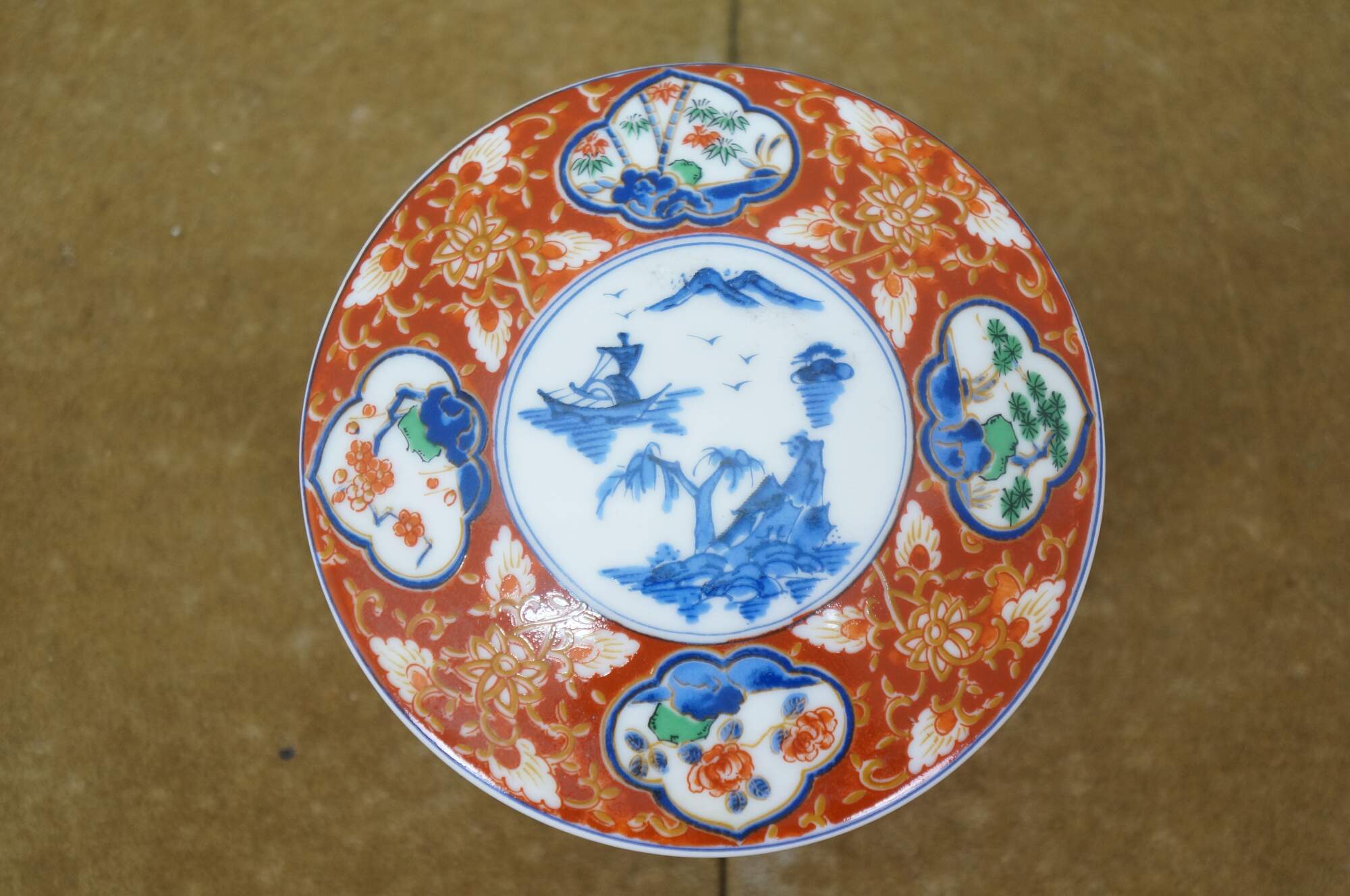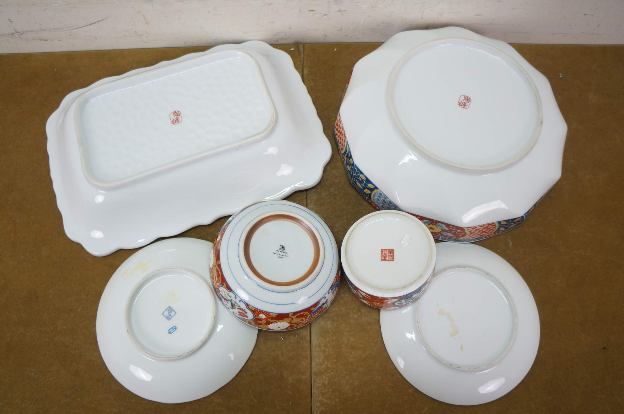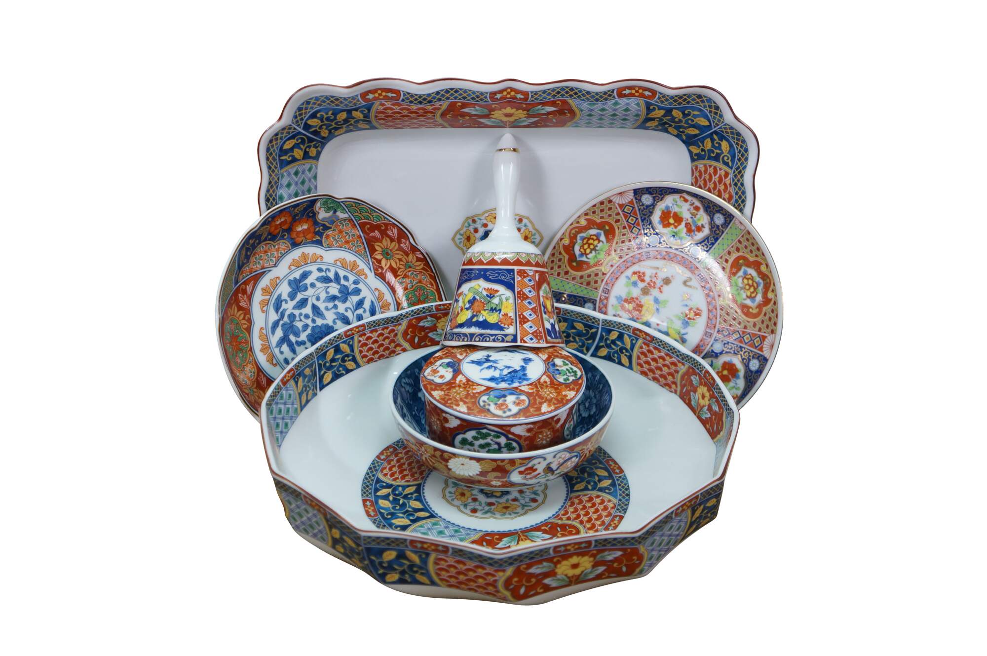 Vintage Lot of Japanese Imari porcelain serving pieces. Including large centerpiece bowl, platter, plates, bowl, lidded box and dinner bell.