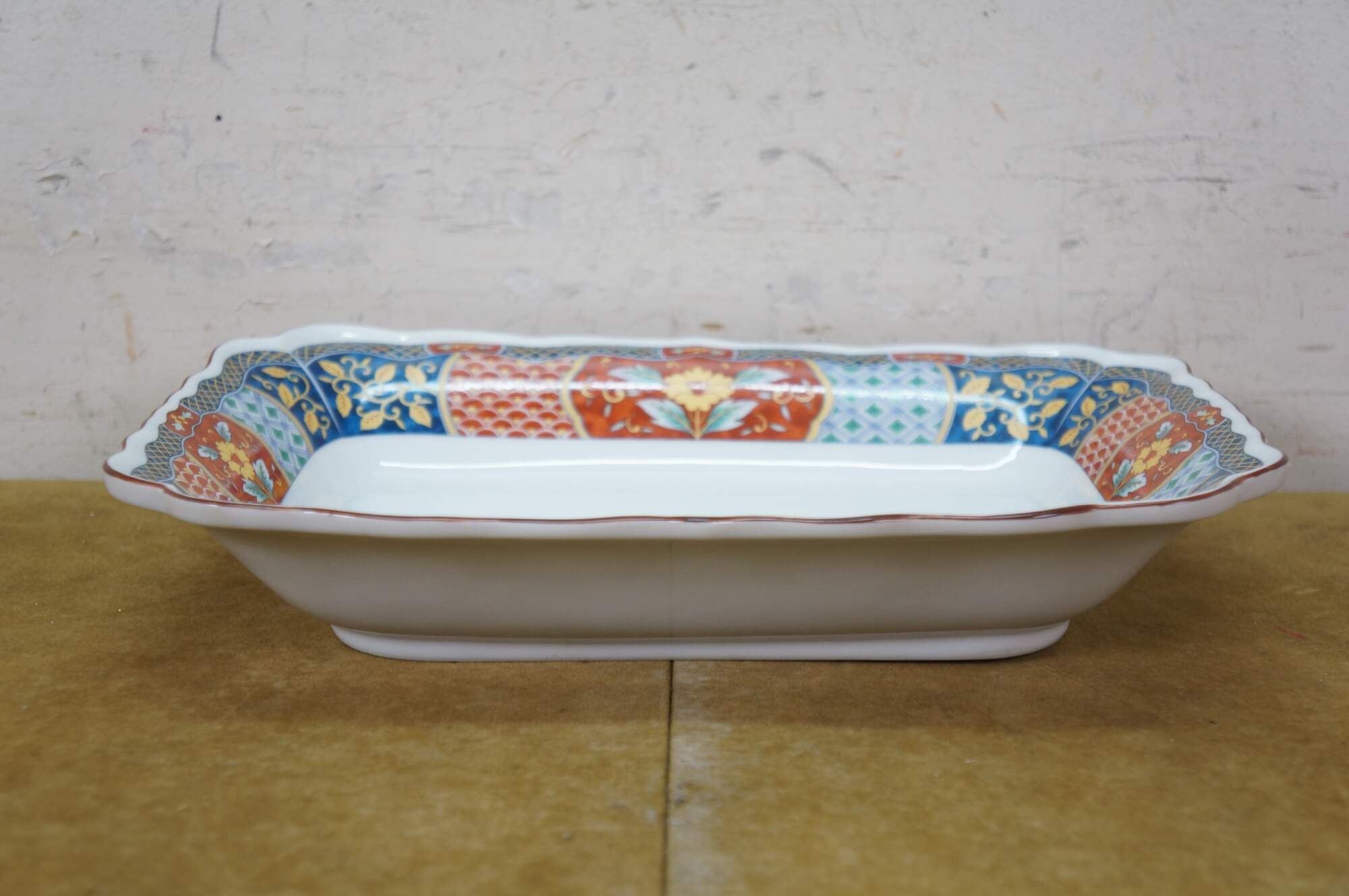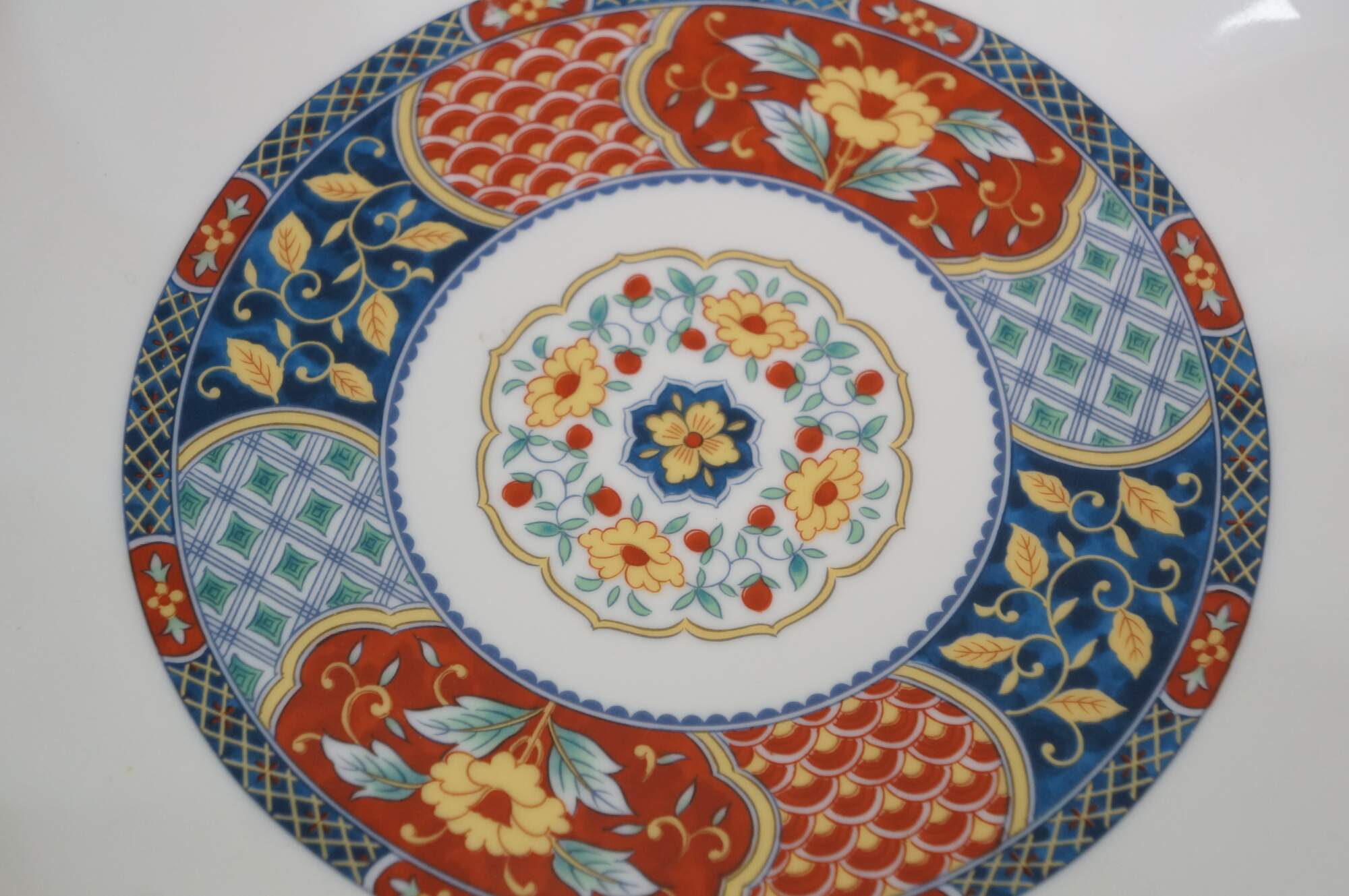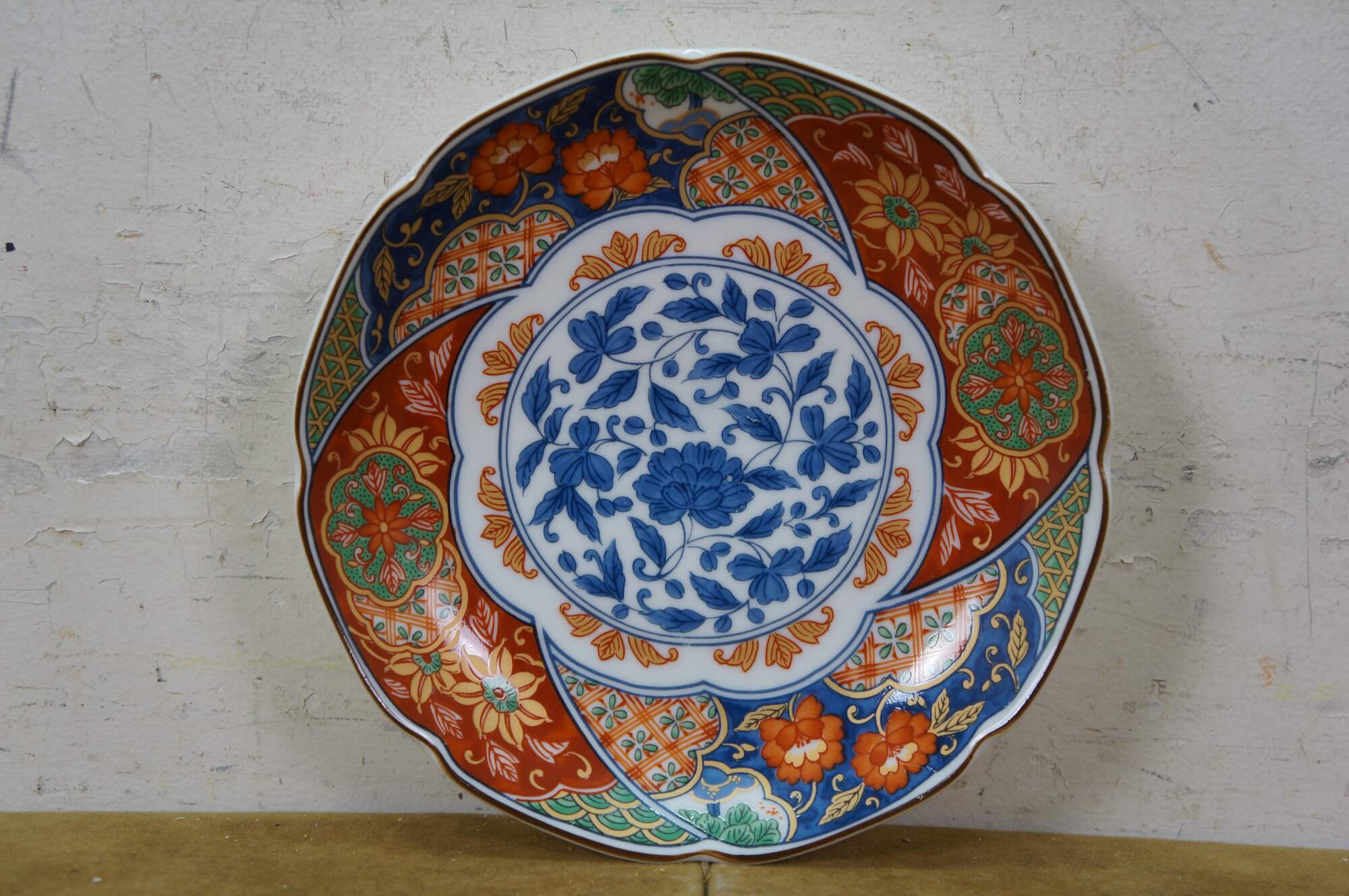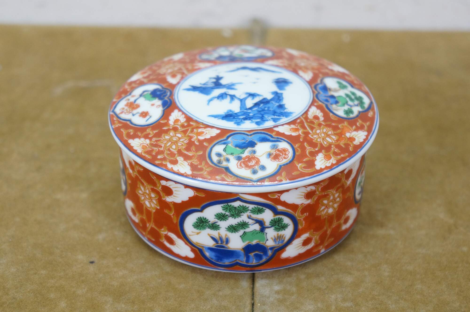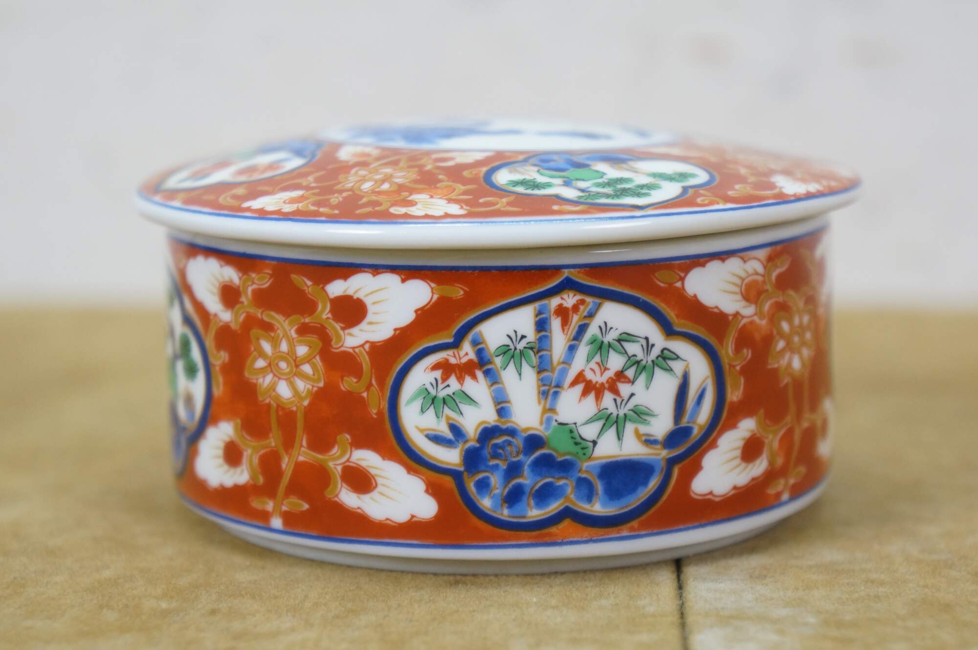 Vintage Lot of Japanese Imari porcelain serving pieces. Including large centerpiece bowl, platter, plates, bowl, lidded box and dinner bell.