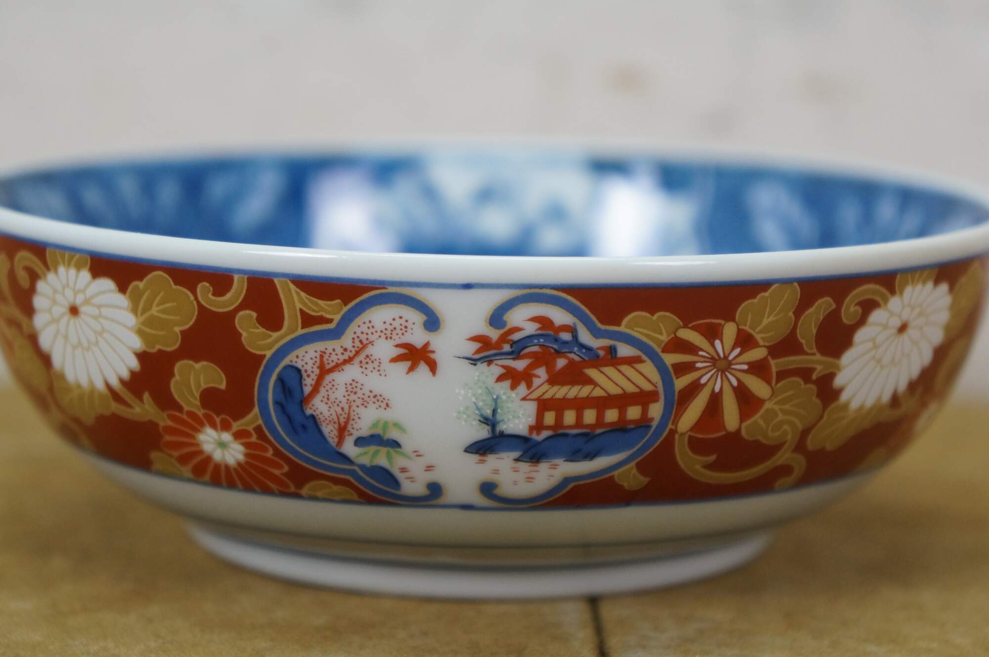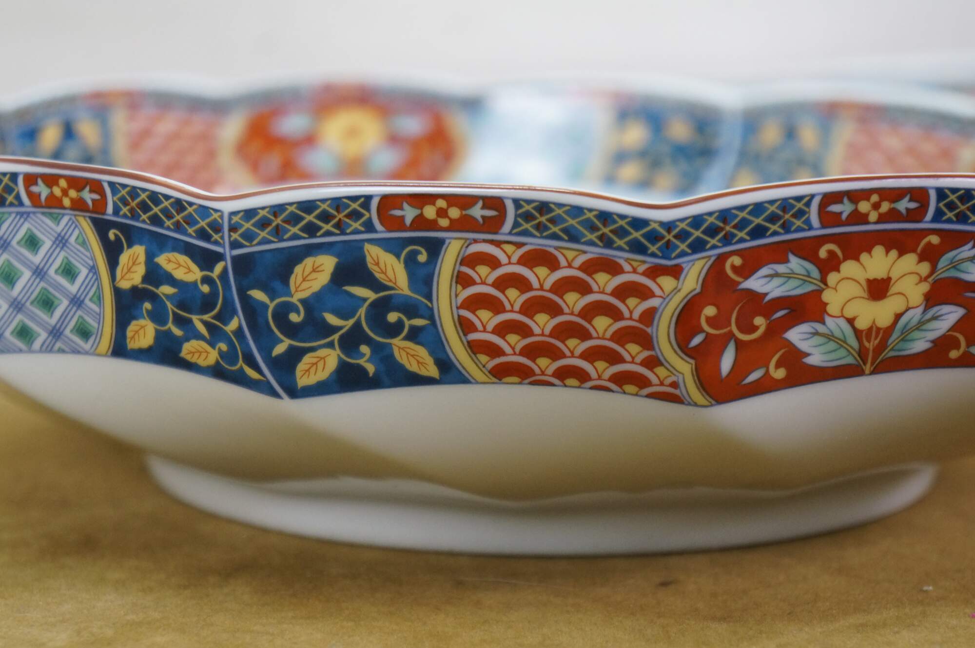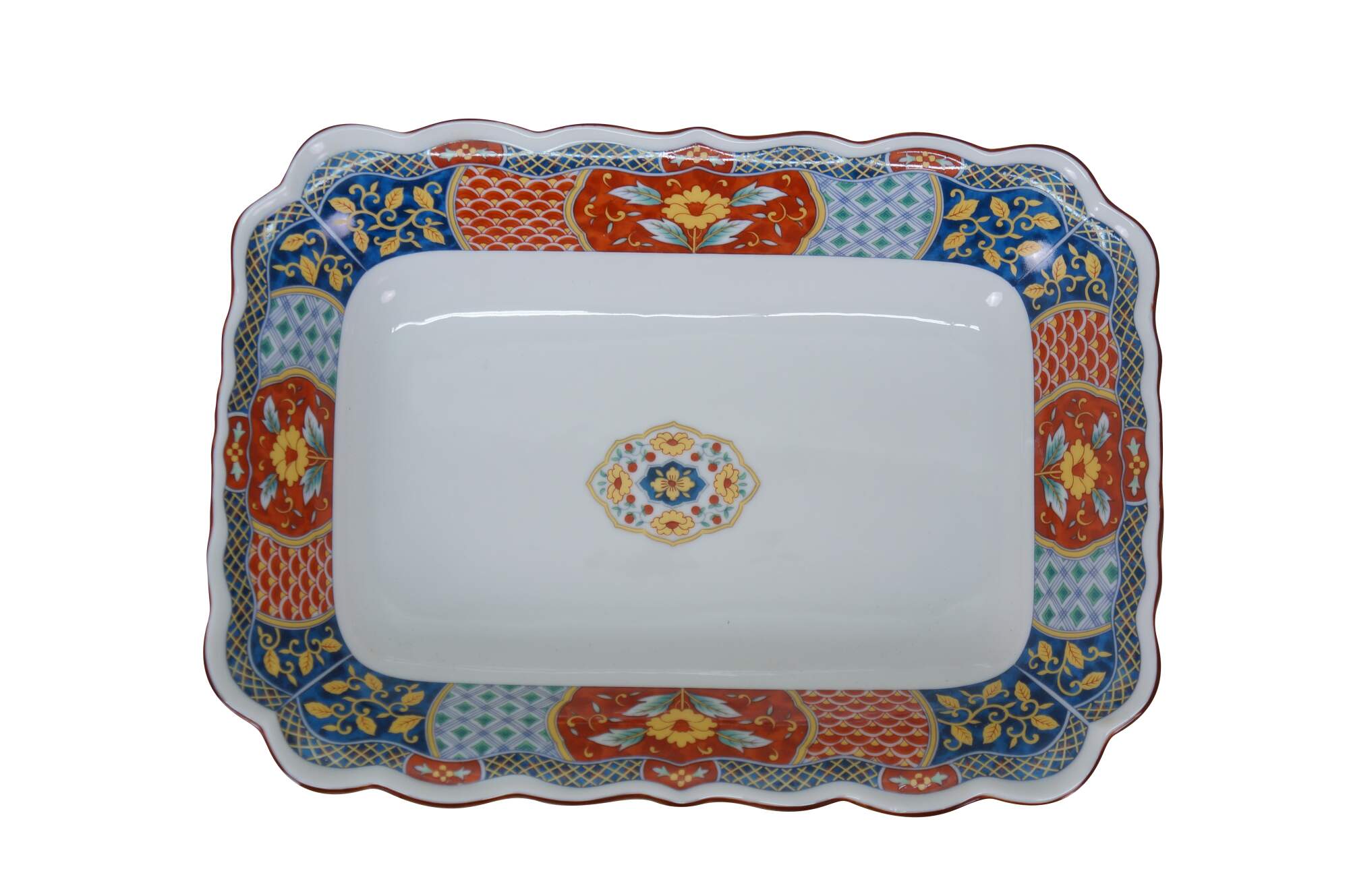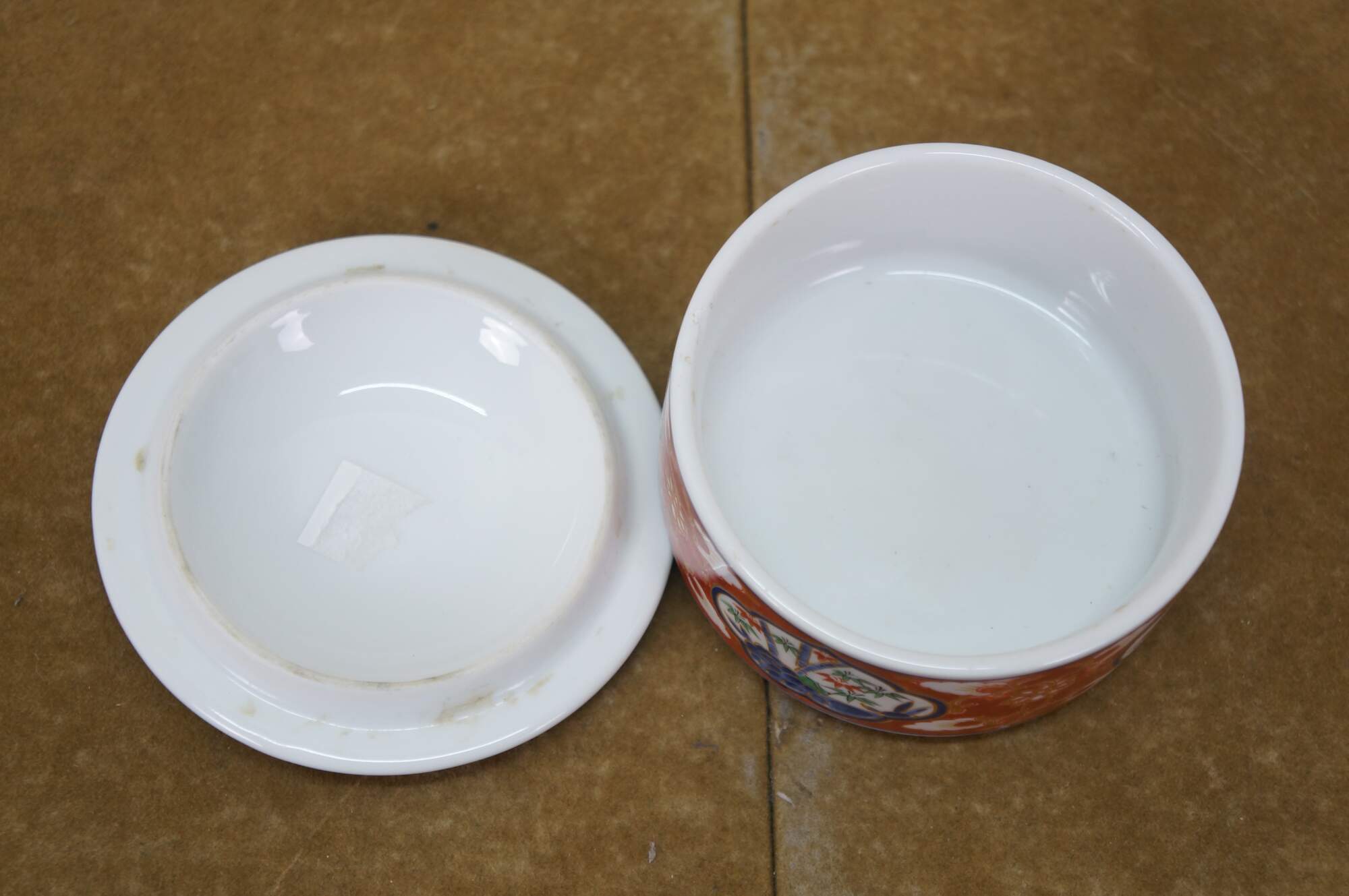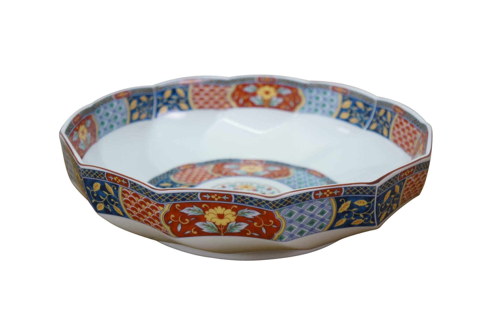 Vintage Lot of Japanese Imari porcelain serving pieces. Including large centerpiece bowl, platter, plates, bowl, lidded box and dinner bell.