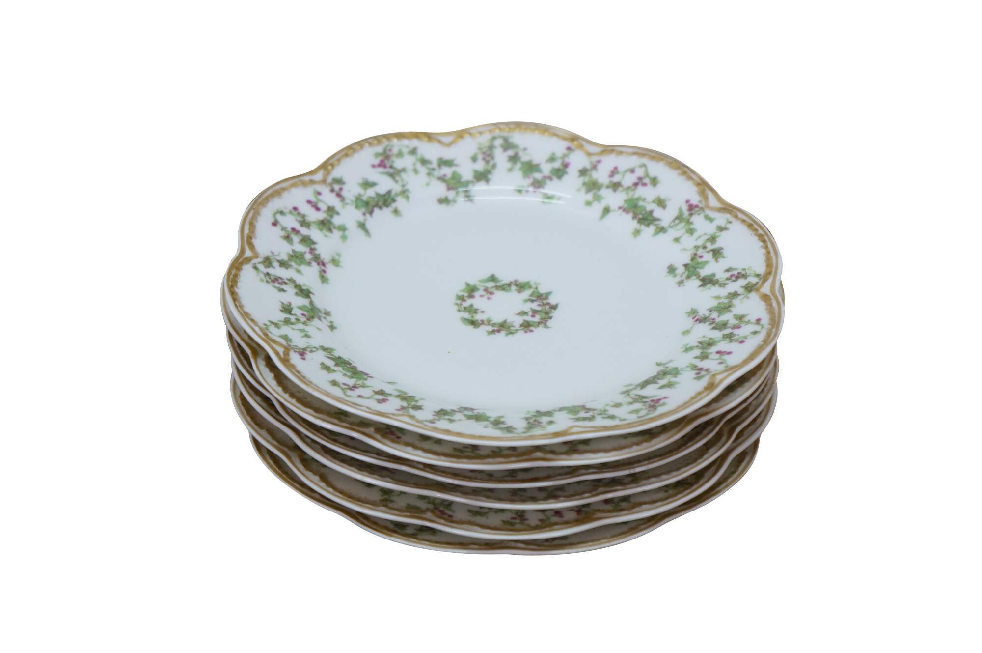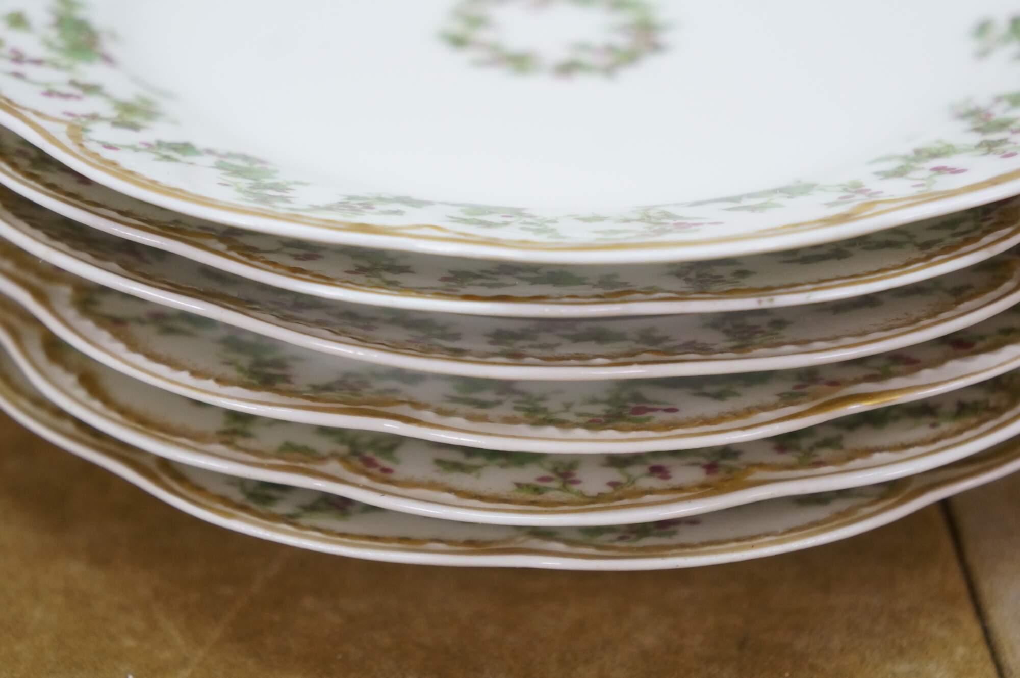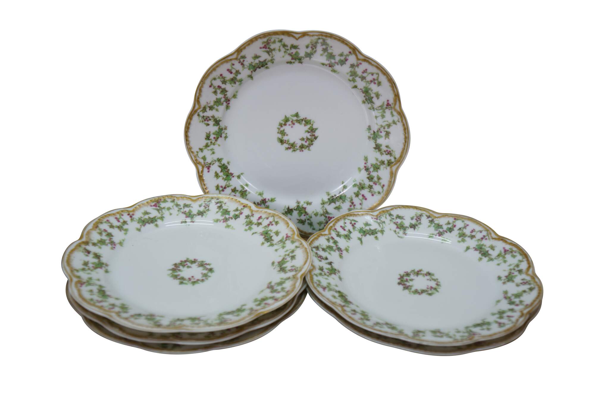 Six rare antique Haviland Limoges Schleiger France scalloped Holly Berries Christmas wreath plates.