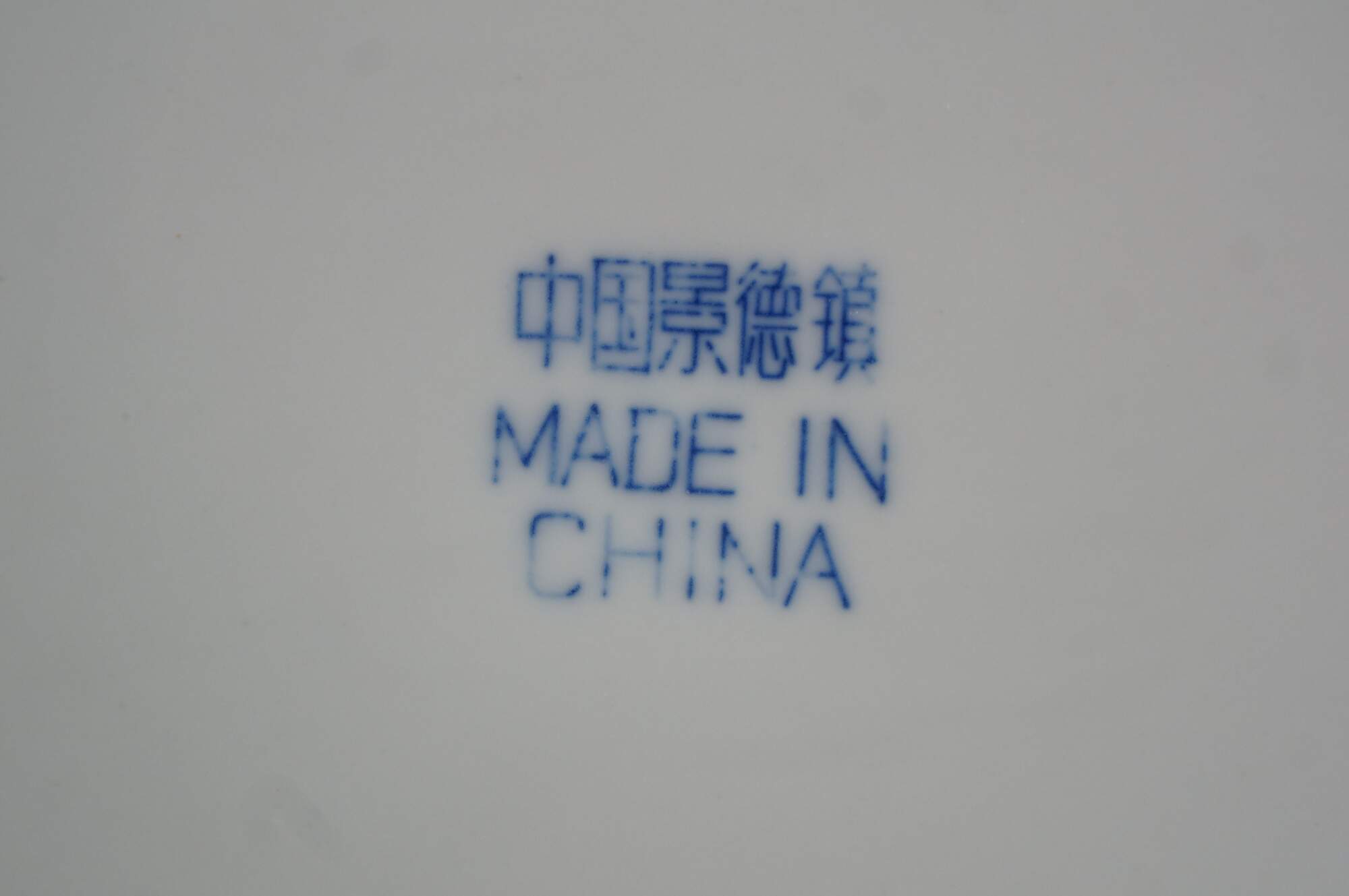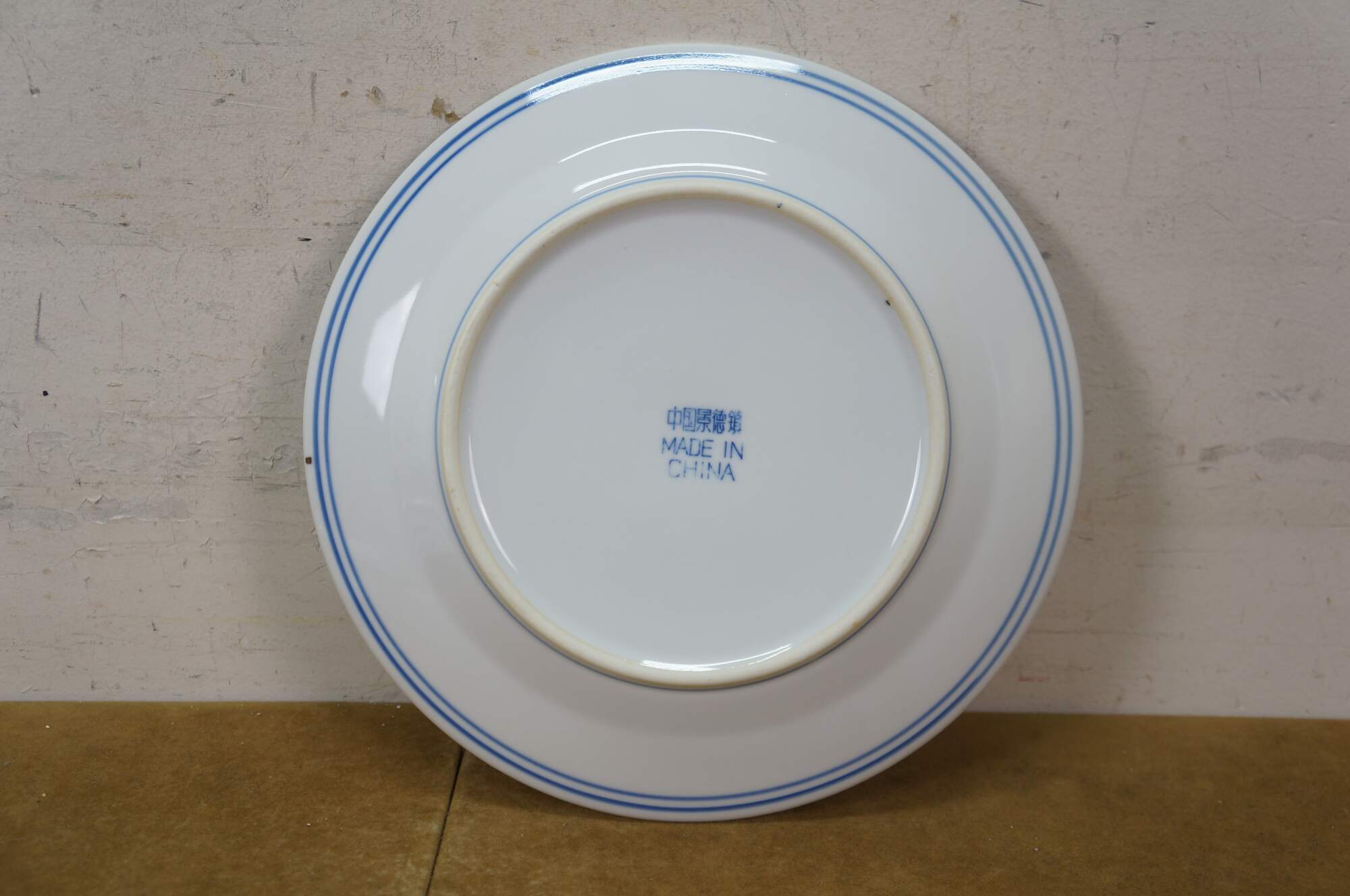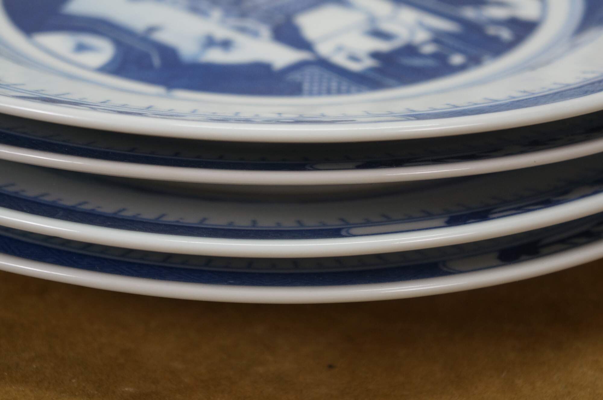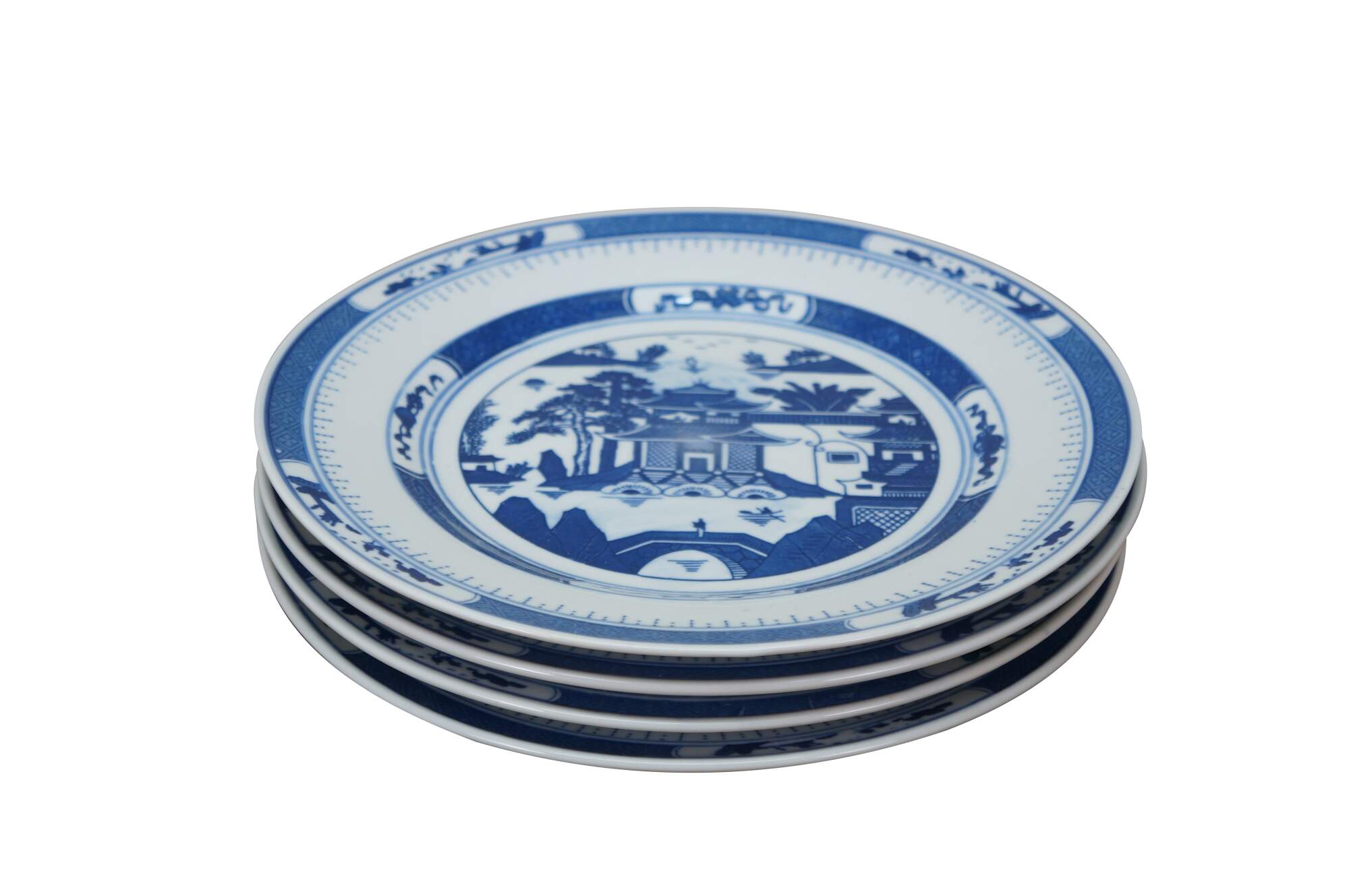 Vintage Chinese Canton Chinoiserie blue & white porcelain plates, featuring traditional harbor scenes with pagodas, figures, boats, and willow trees.