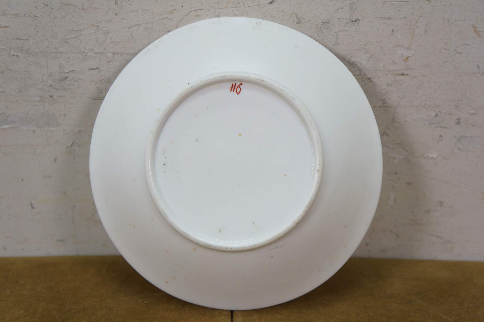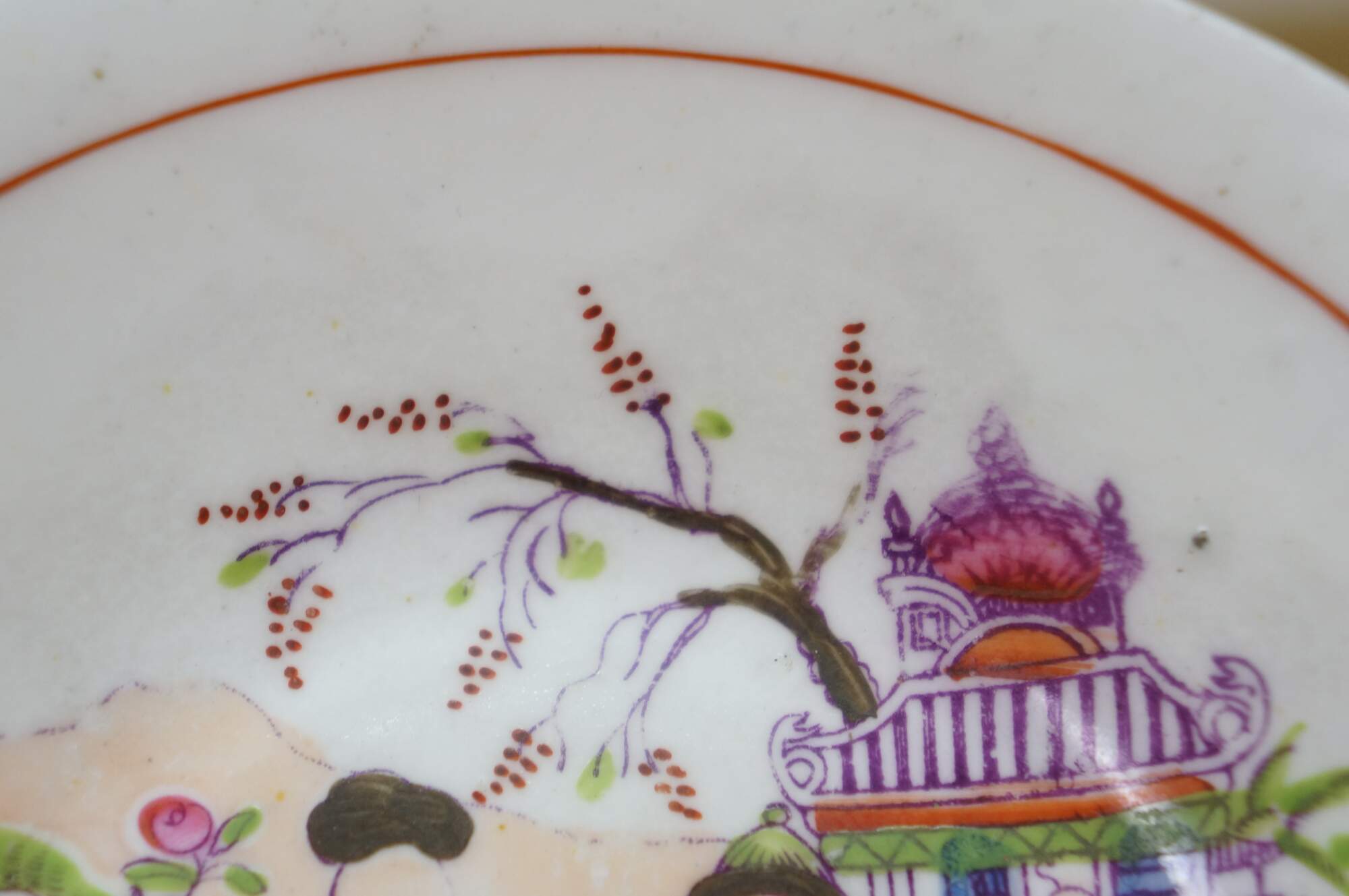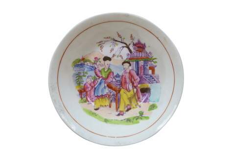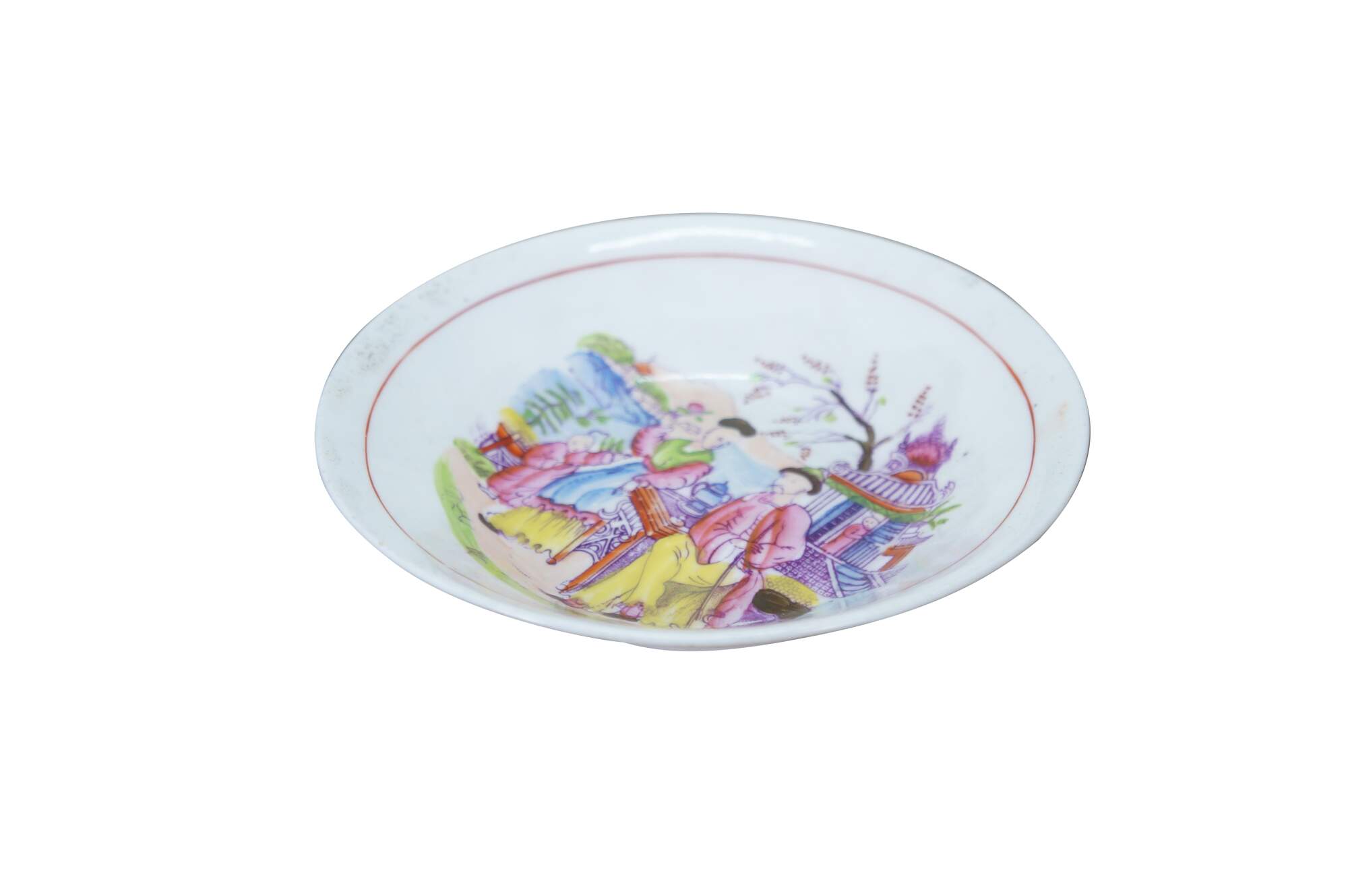 Antique Chinese export porcelain bowl featuring a hand-painted Famille Rose Mandarin Chinoiserie scene with two figures having tea in the garden, with Pagoda in the distance.