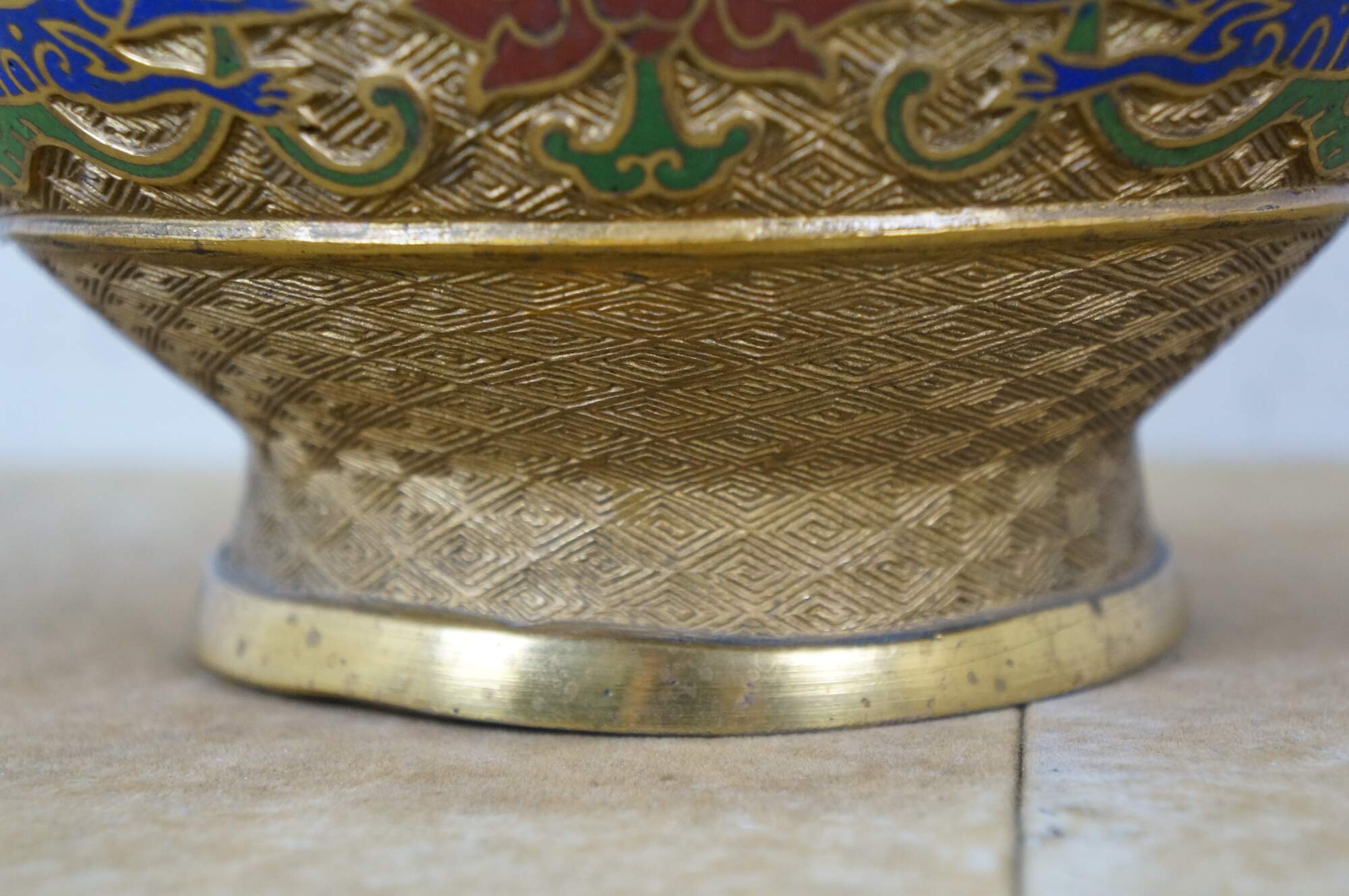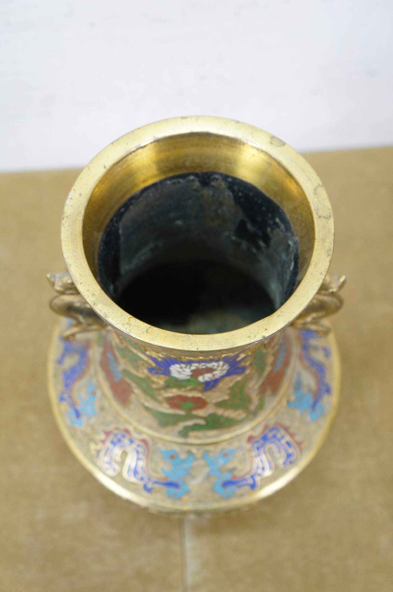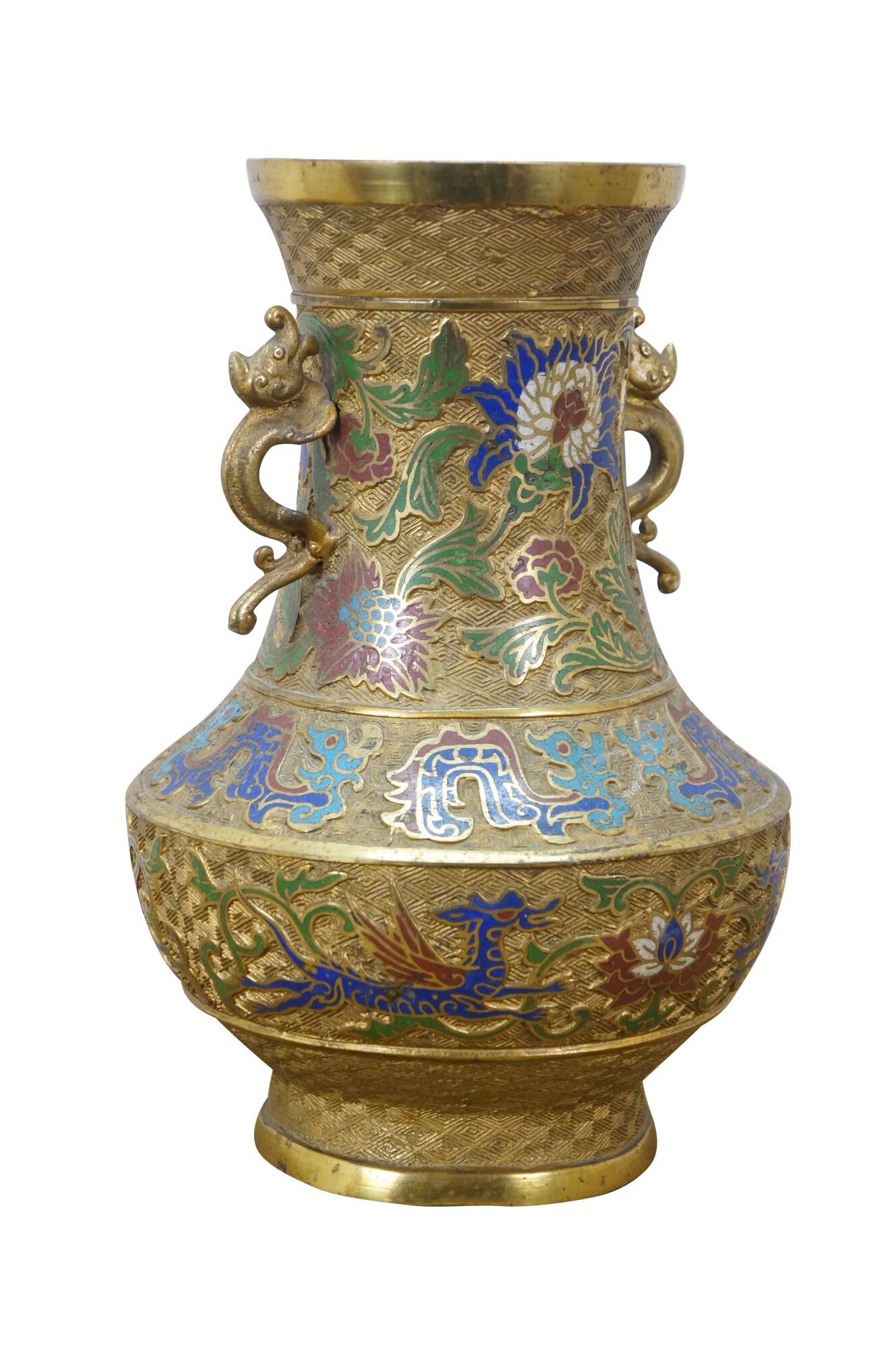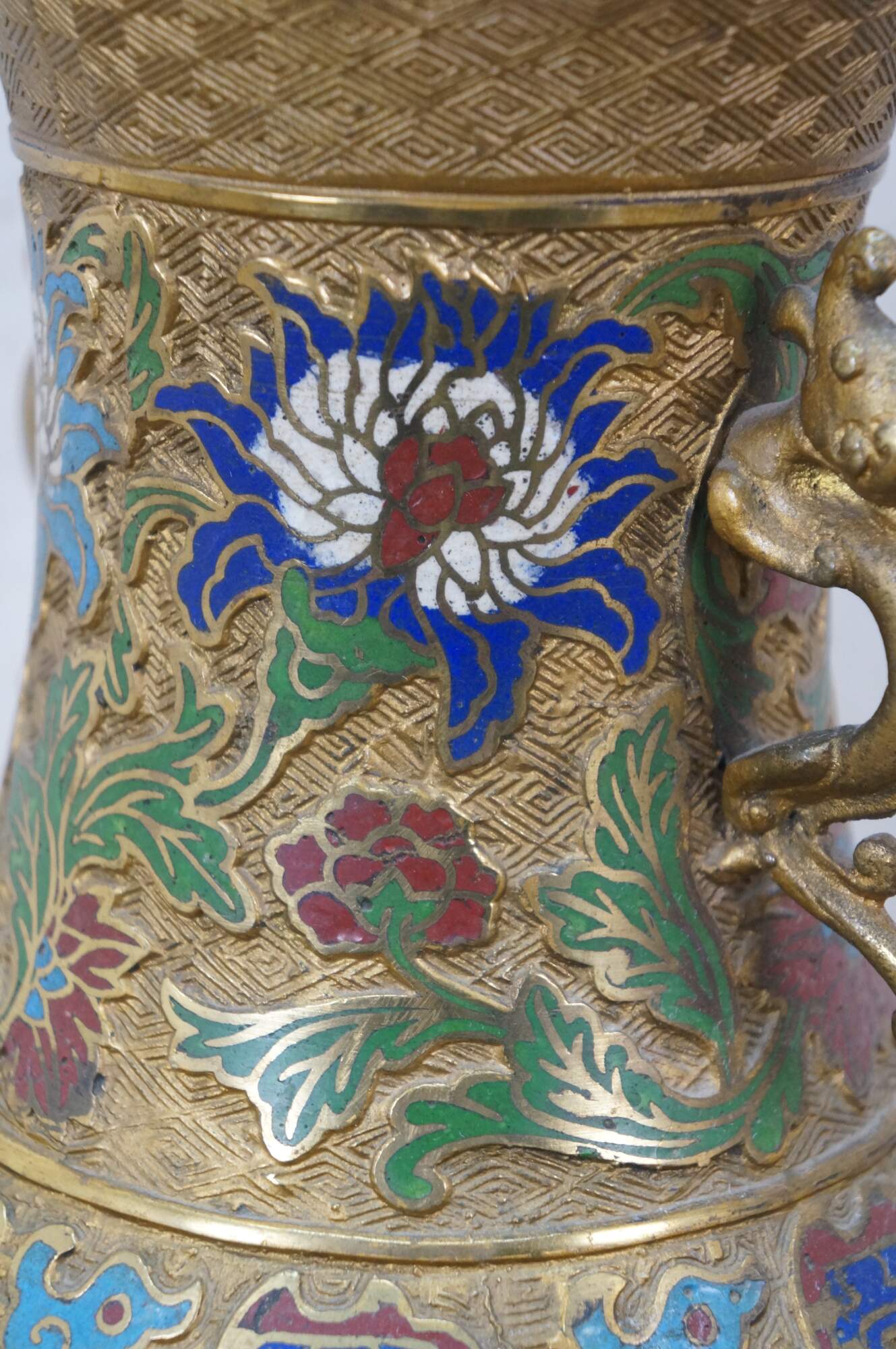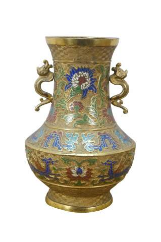 Exquisite antique Japanese bronze champlevé and cloisonné enamel vase with dragon handles. It features decorative patterns of lotus and chrysanthemum flowers, vines, and dragons. Made in Japan.