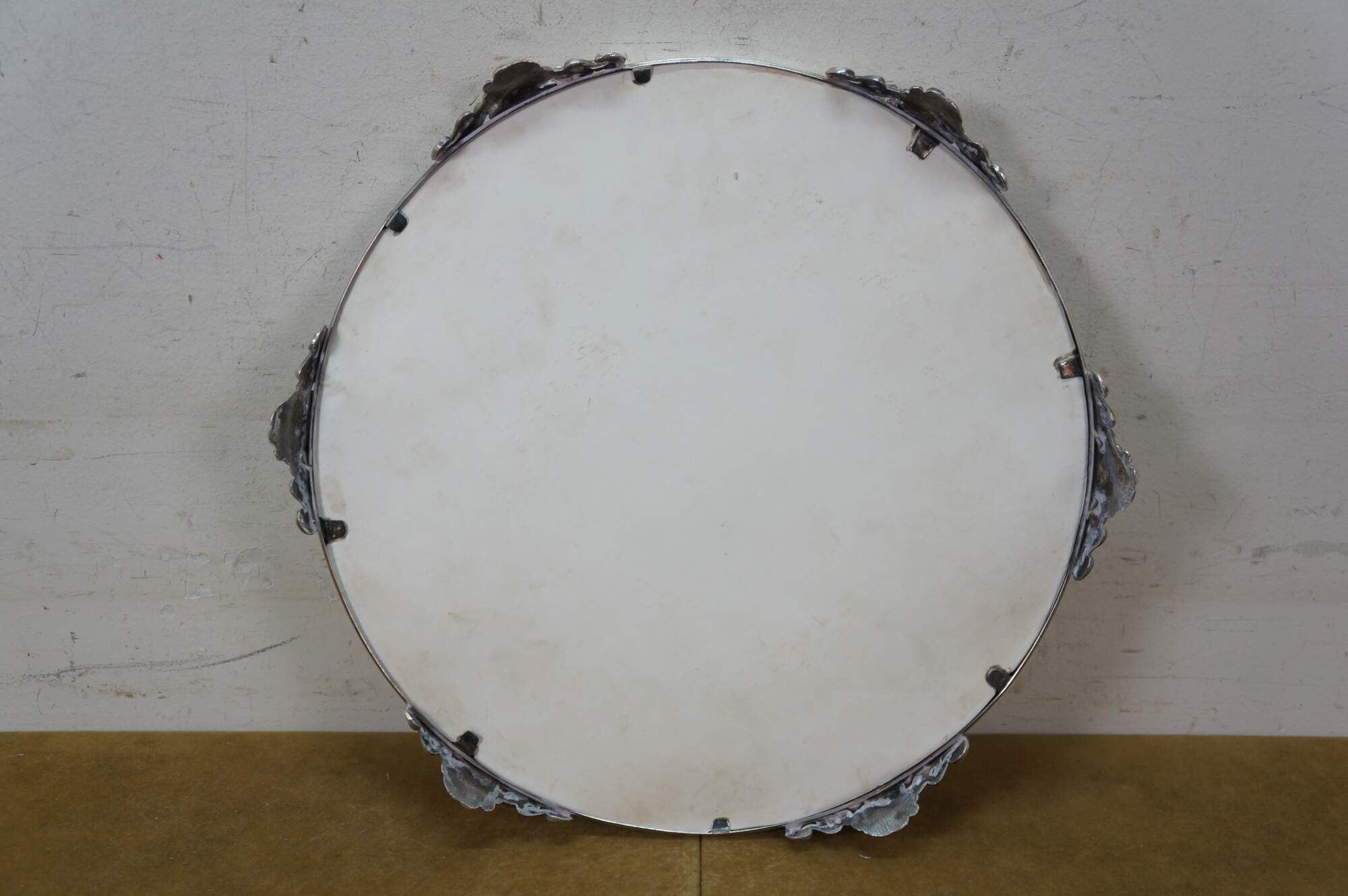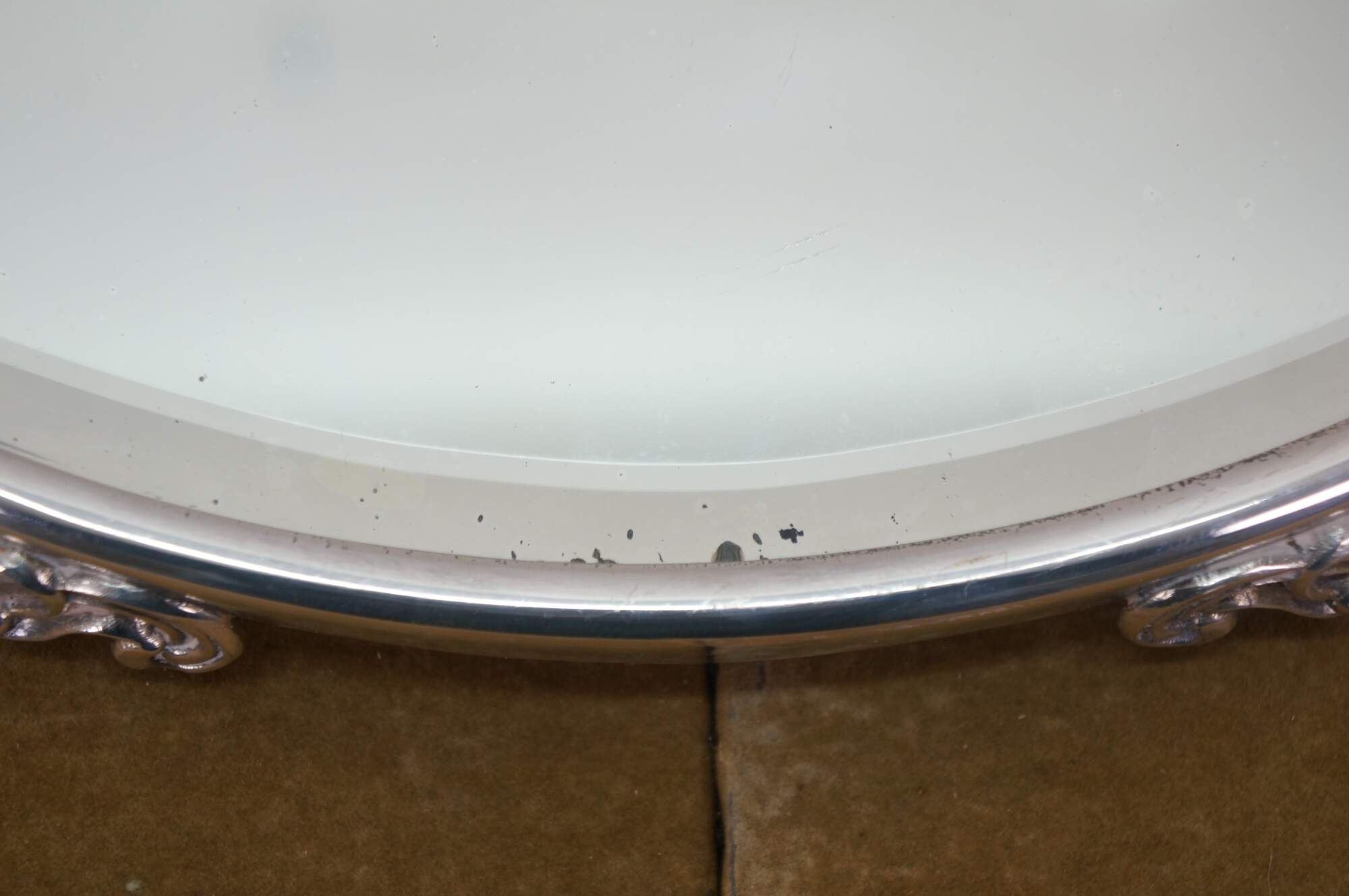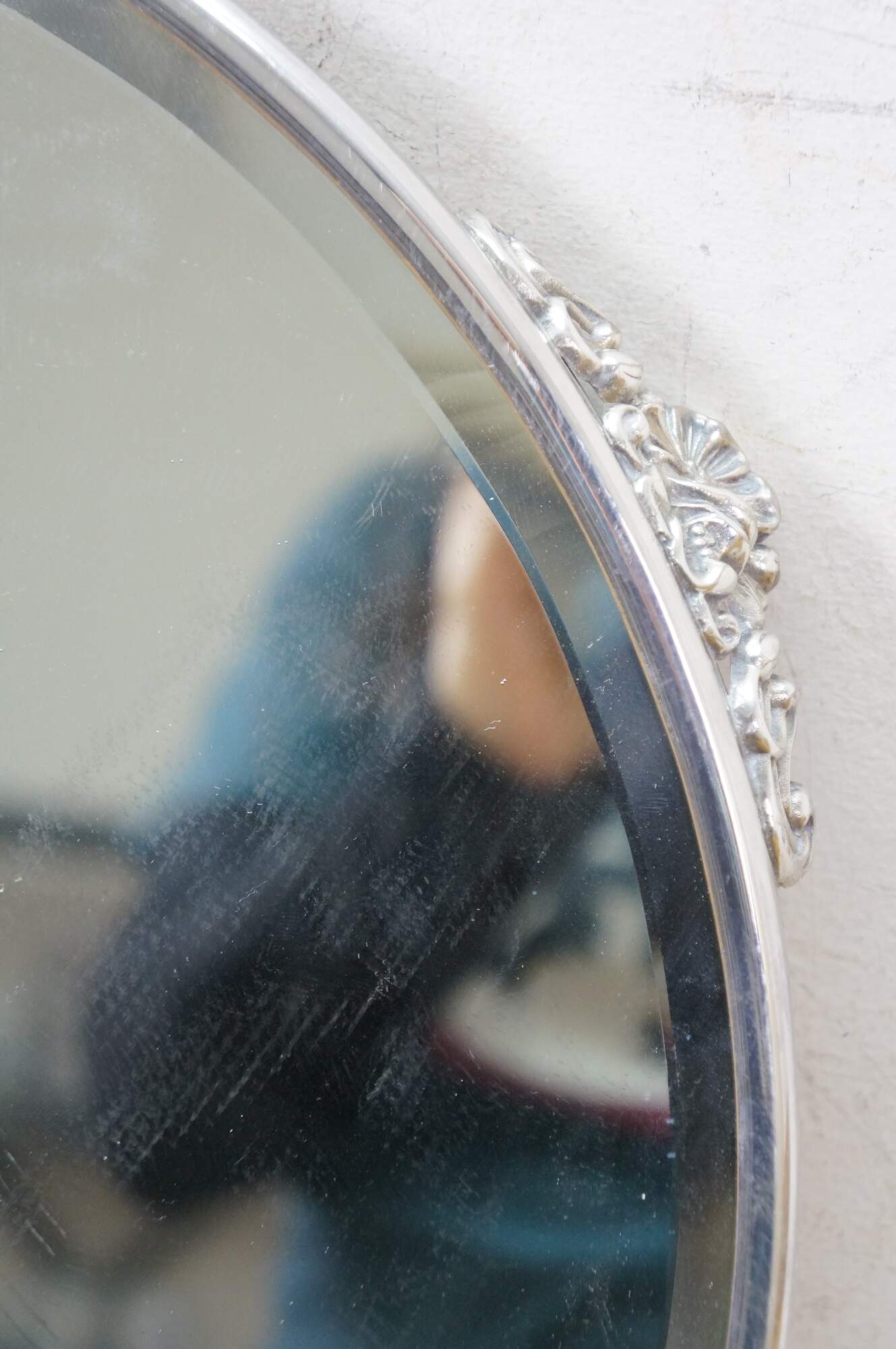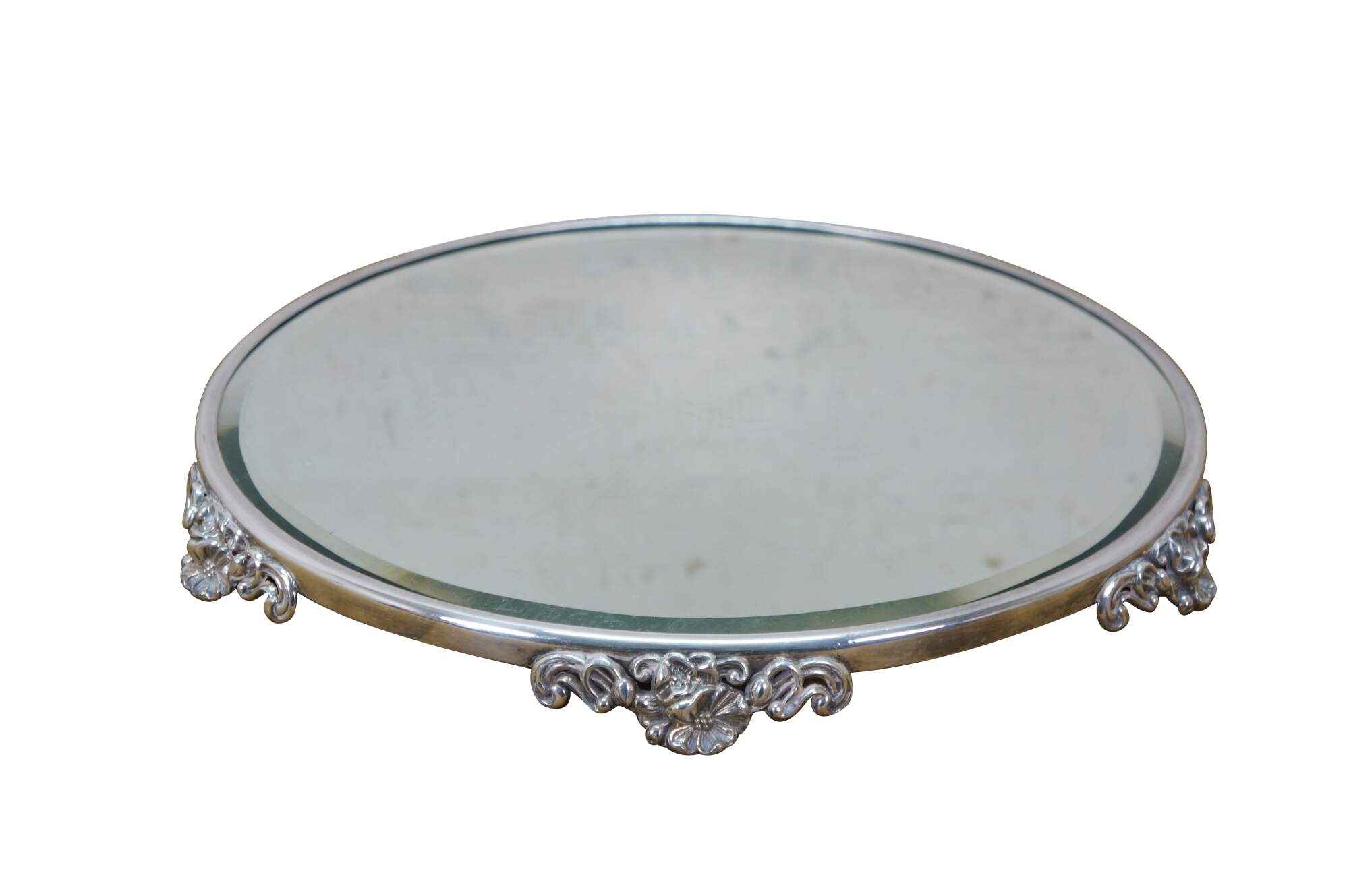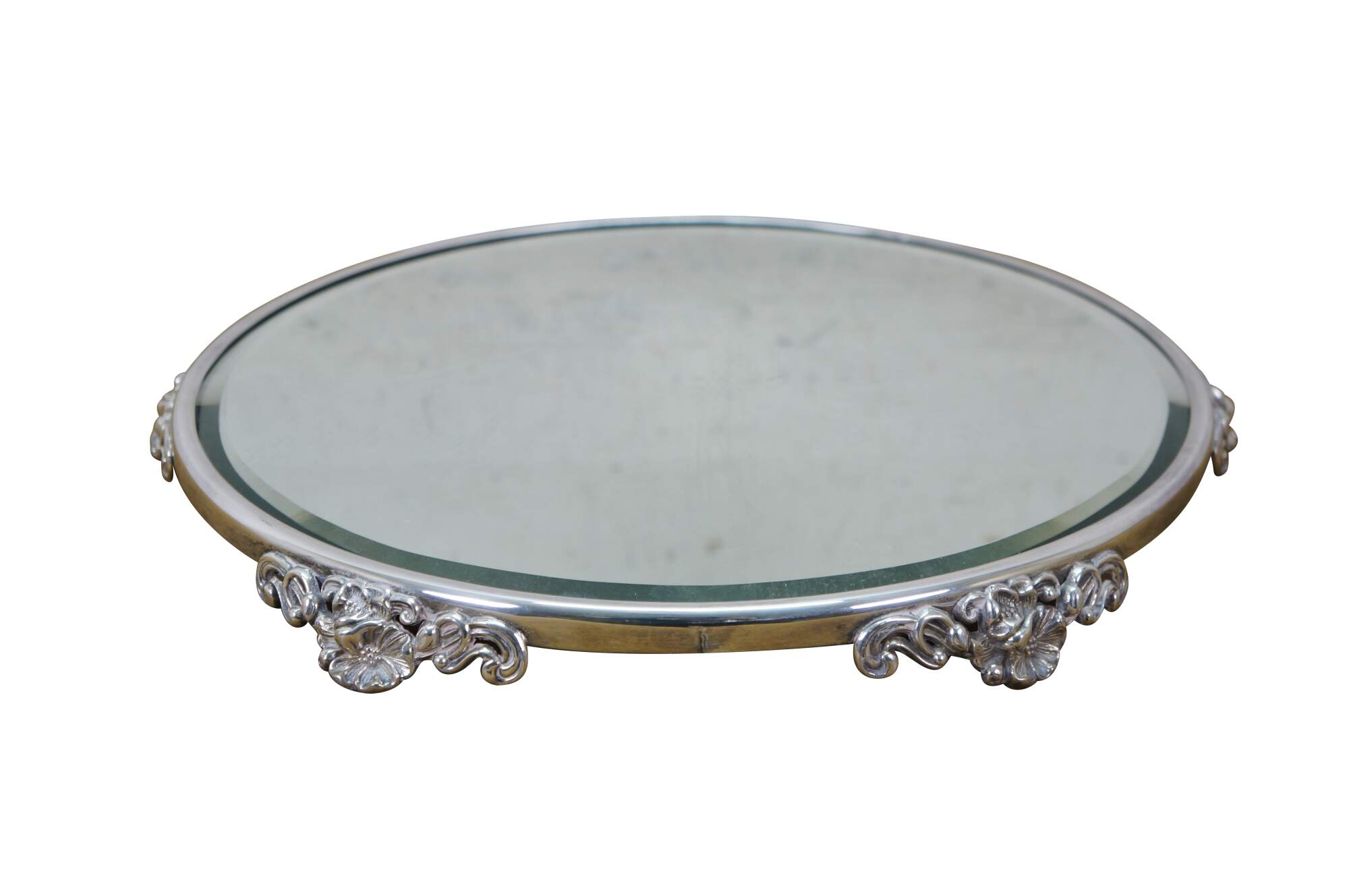 Antique Victorian silver-plated beveled mirrored plateau / centerpiece bar / dresser / vanity tray with ornate Art Nouveau floral scrolled feet.