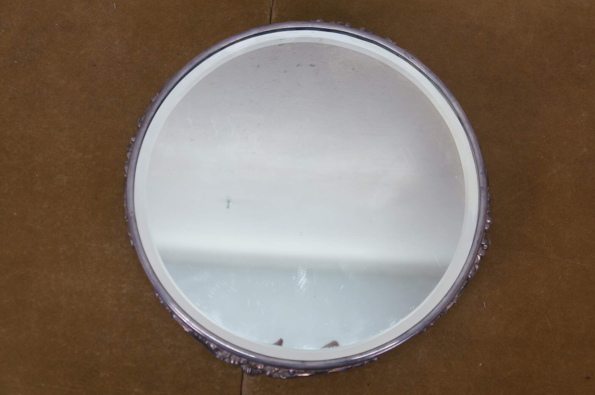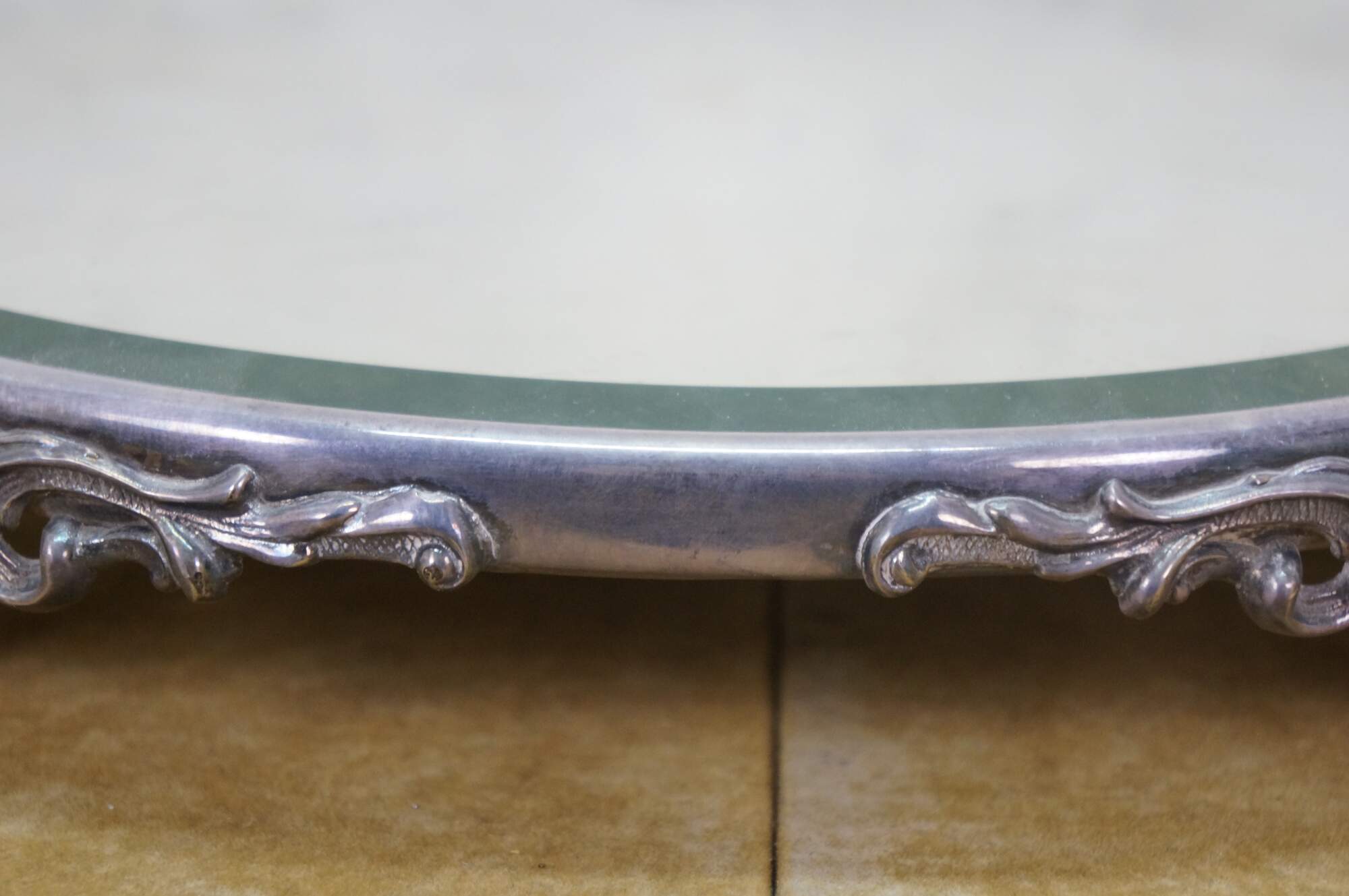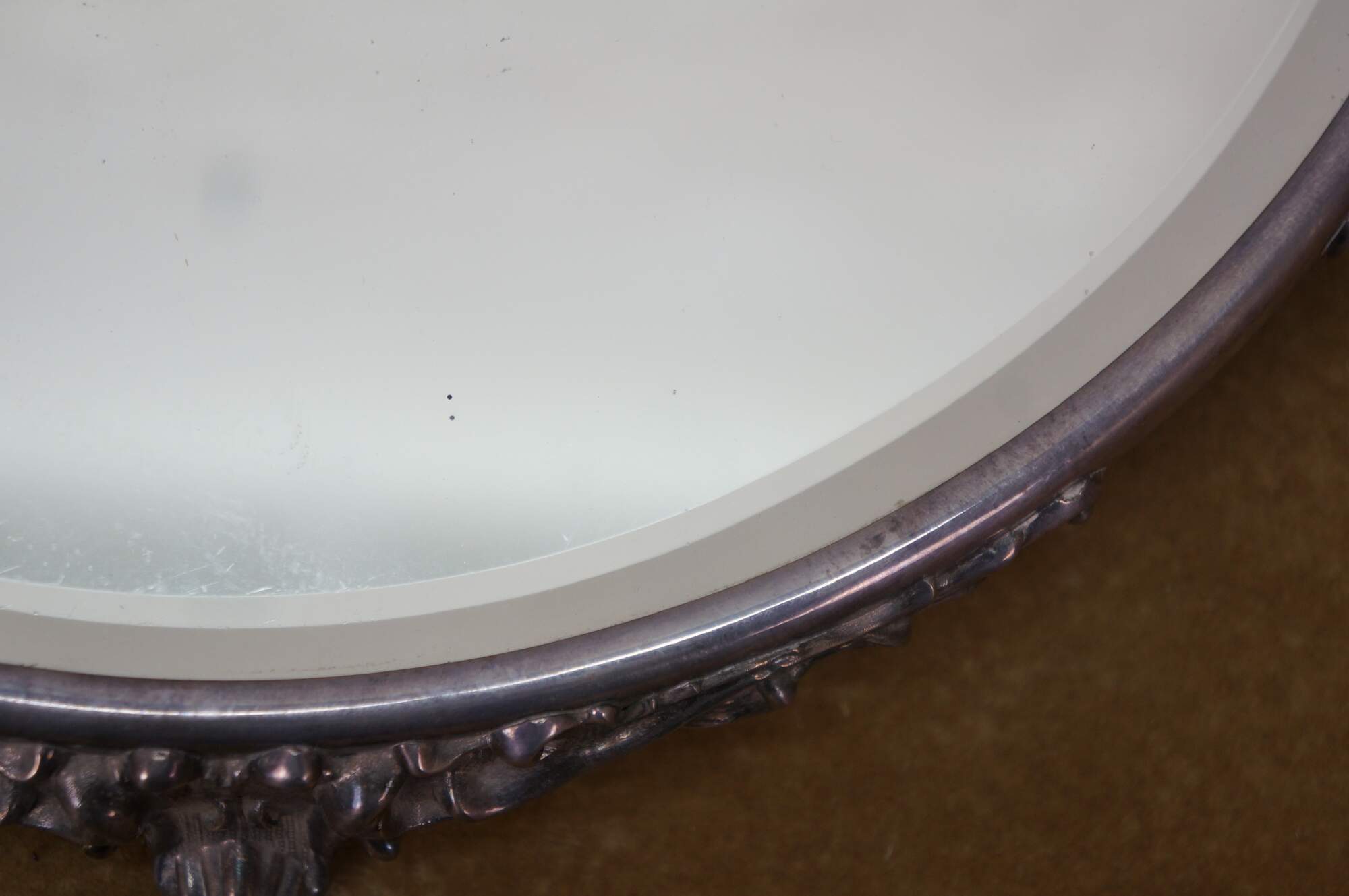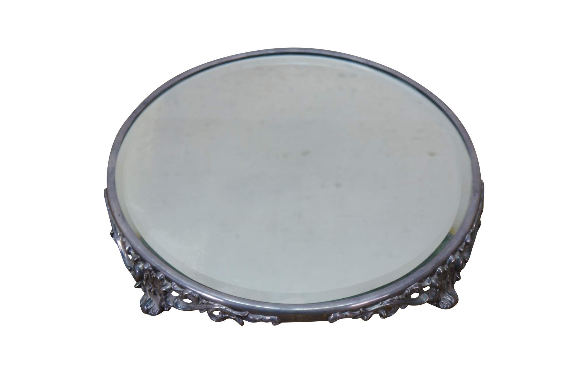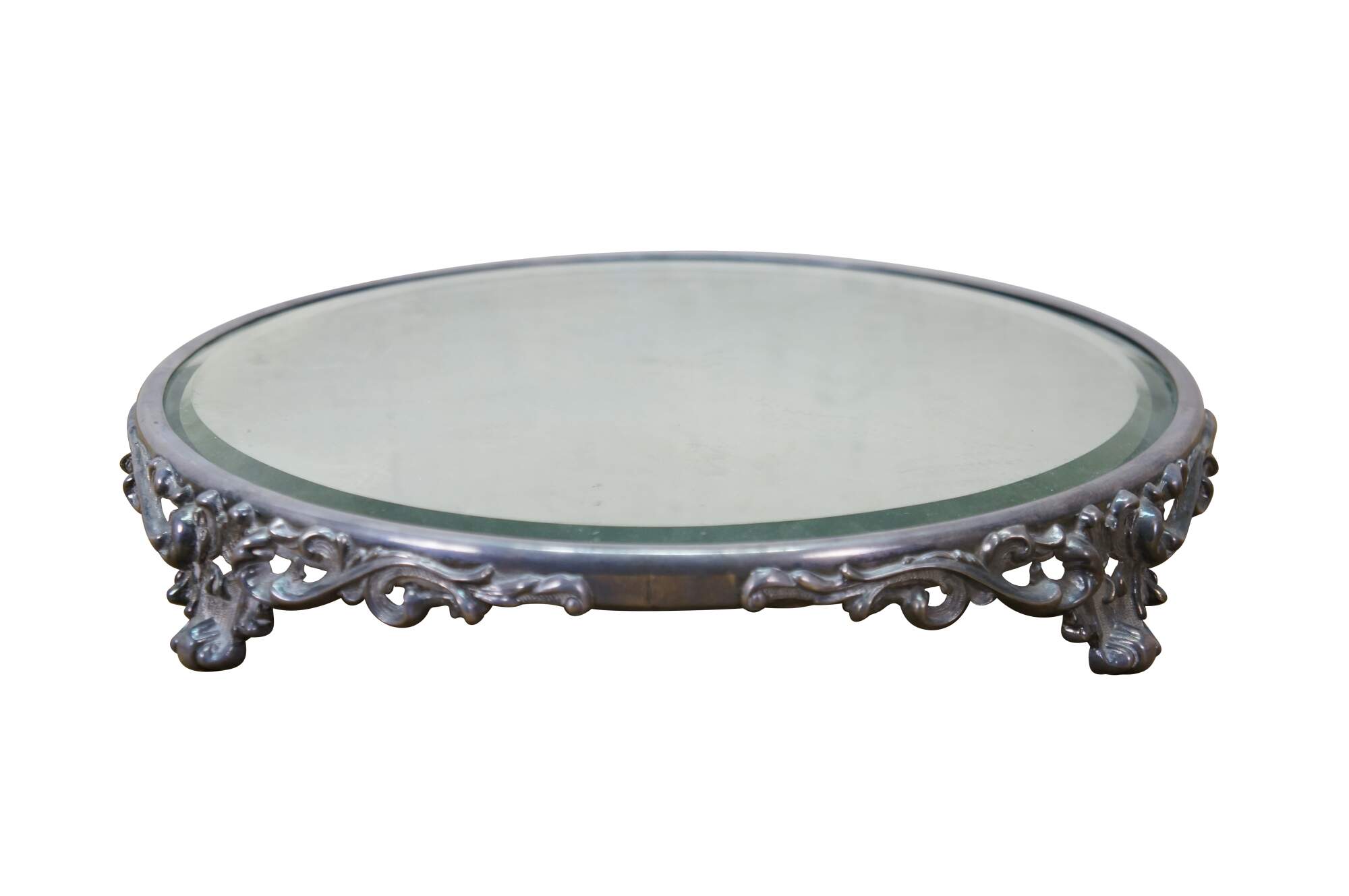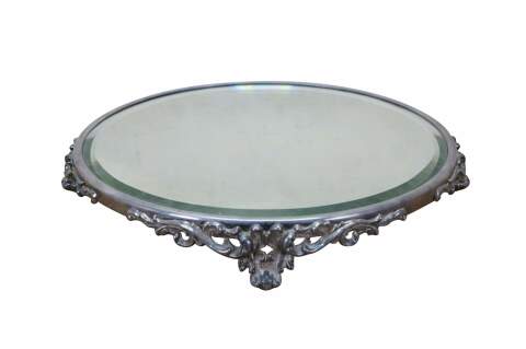 Antique Victorian silver-plated beveled mirrored plateau / centerpiece bar / dresser / vanity tray with ornate Art Nouveau scrolled acanthus design.