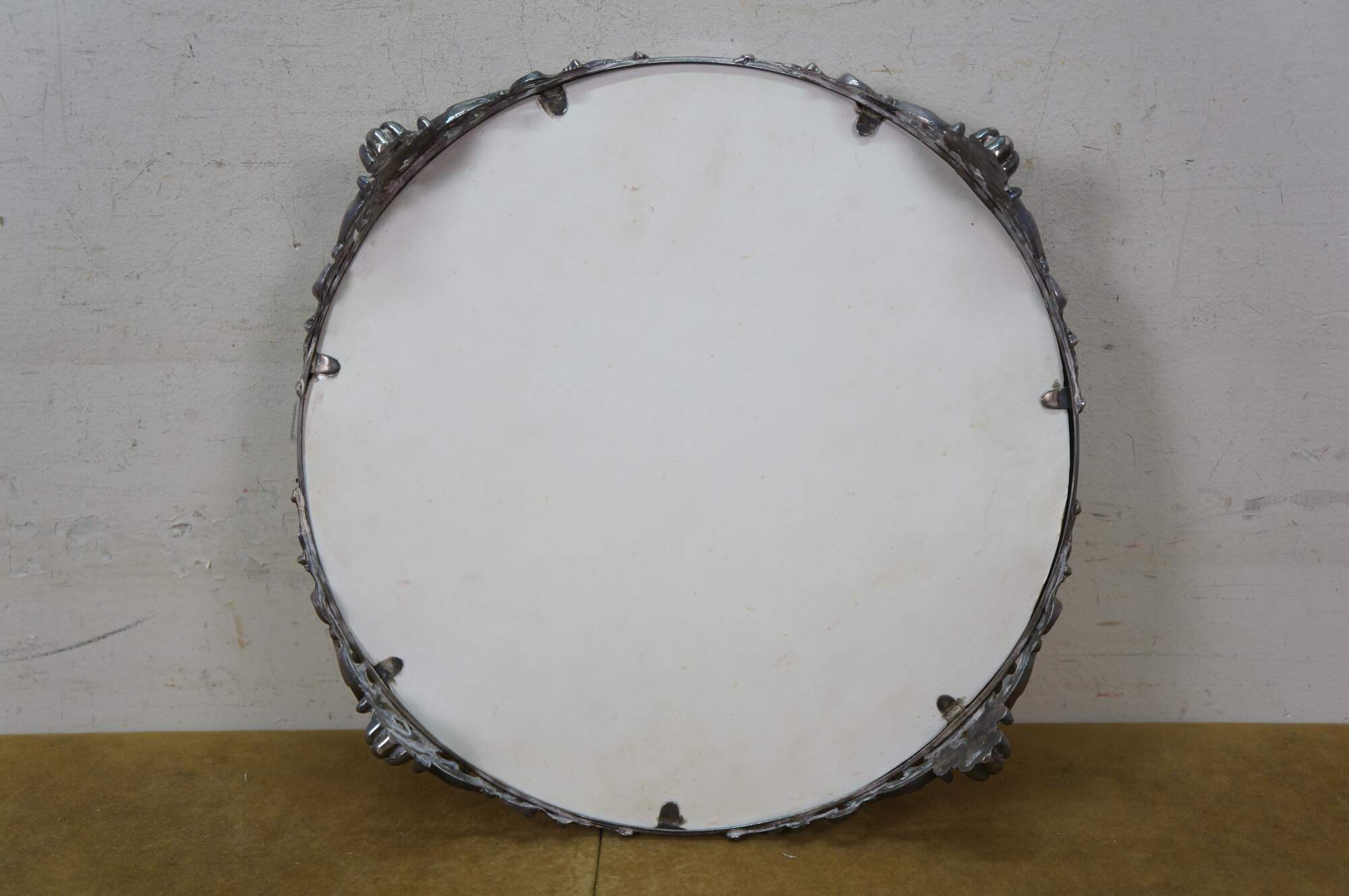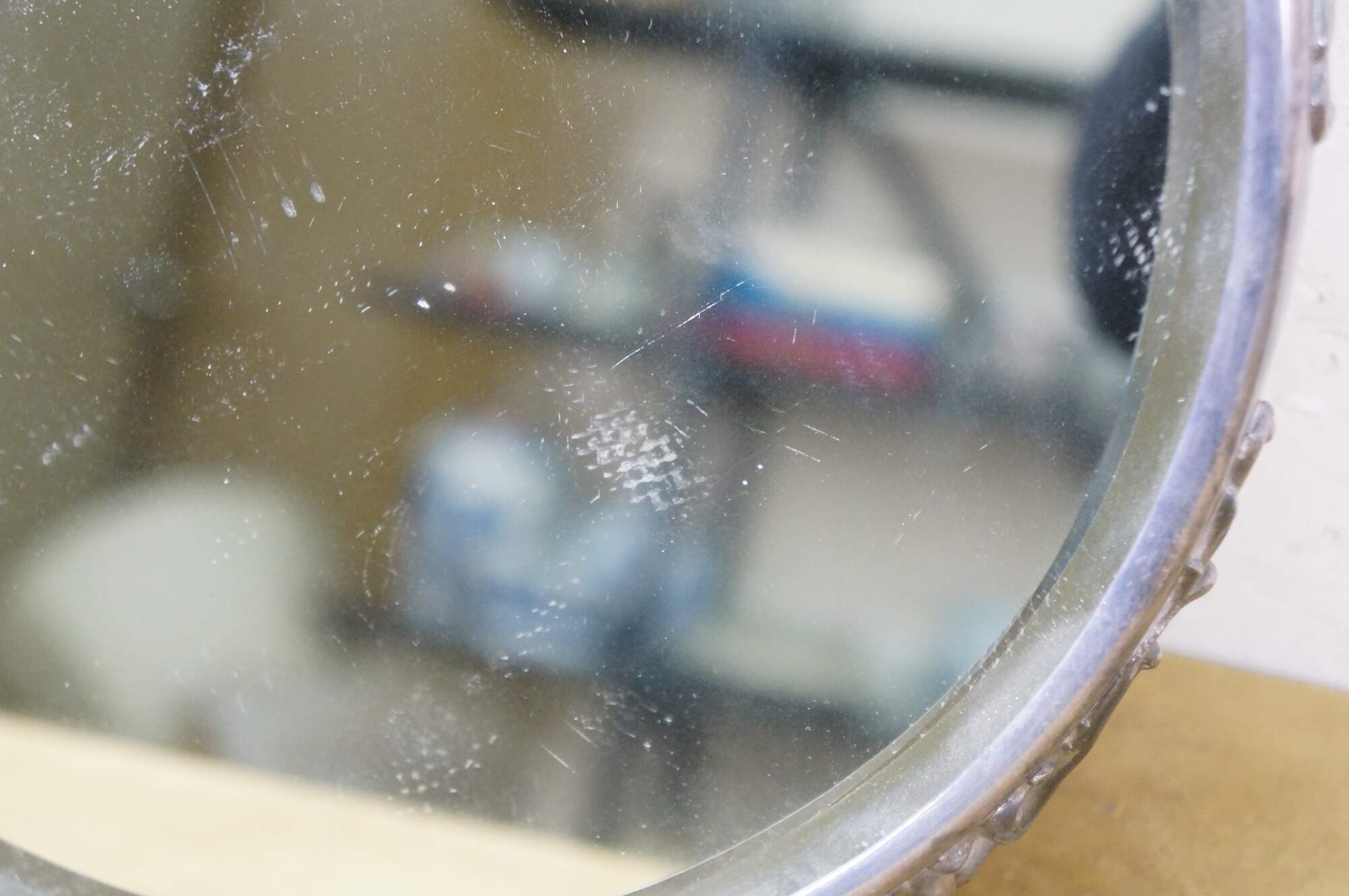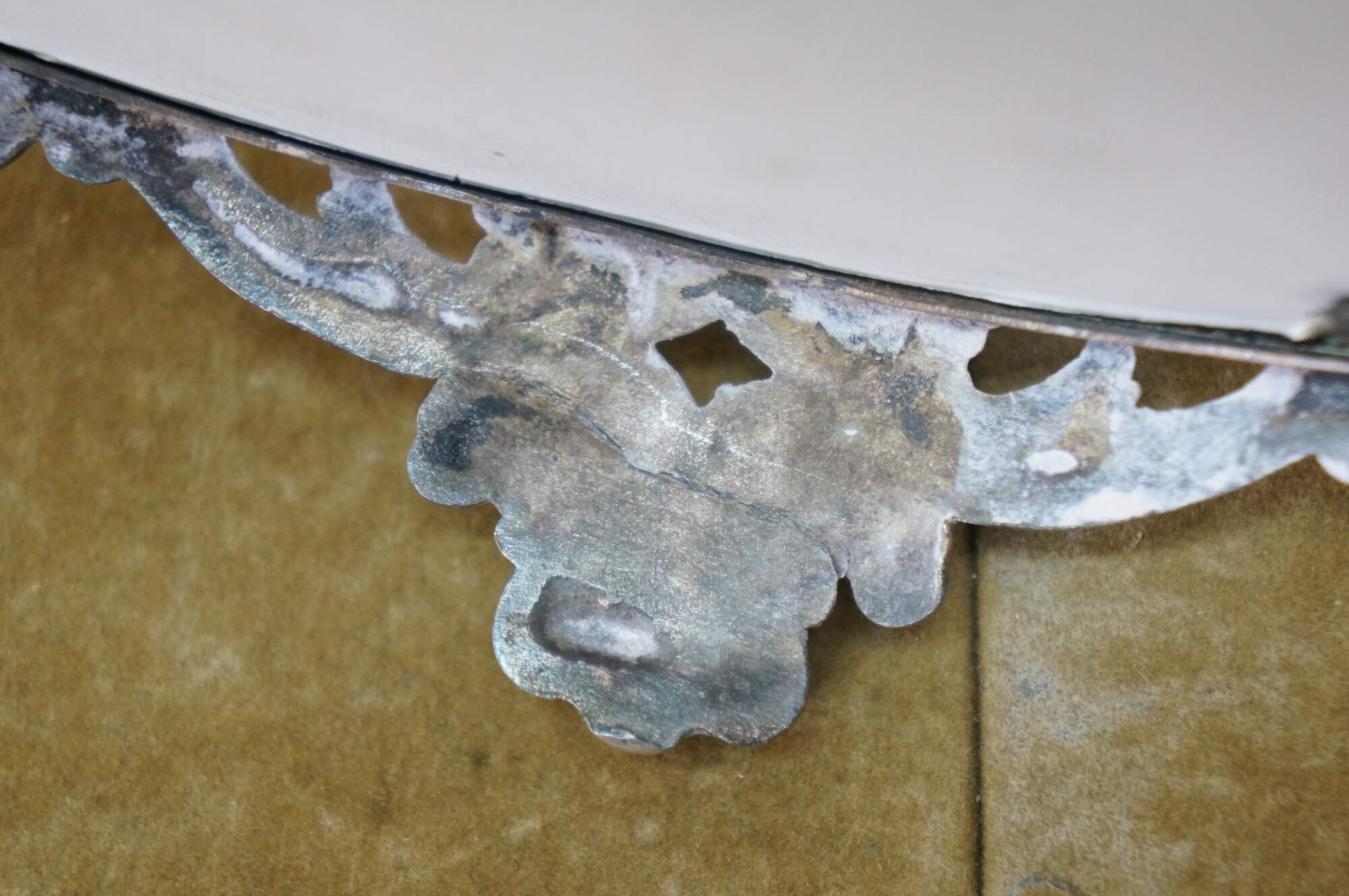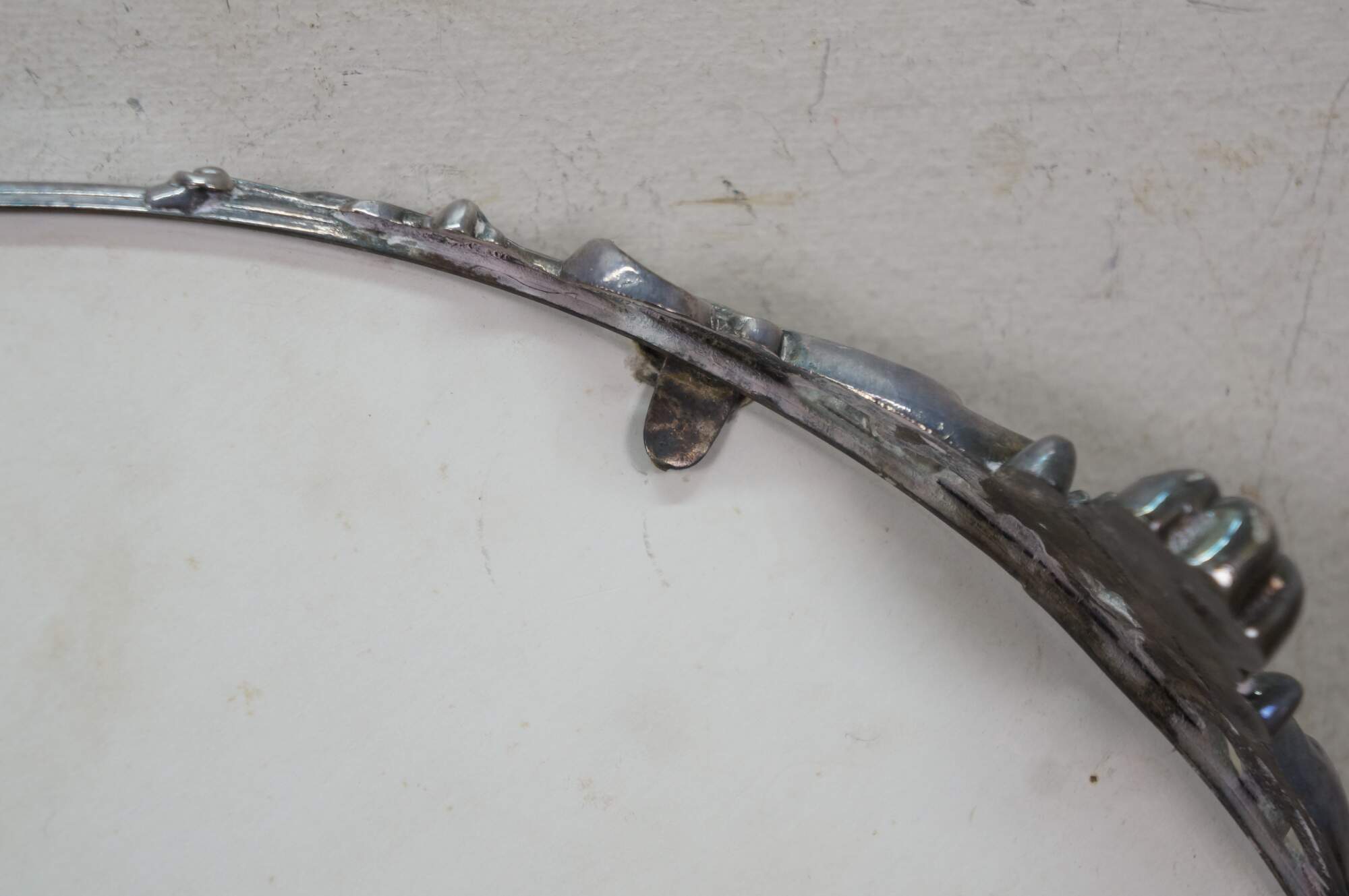 Gentle wear/tarnish; crease in one foot, scuffing to mirror.