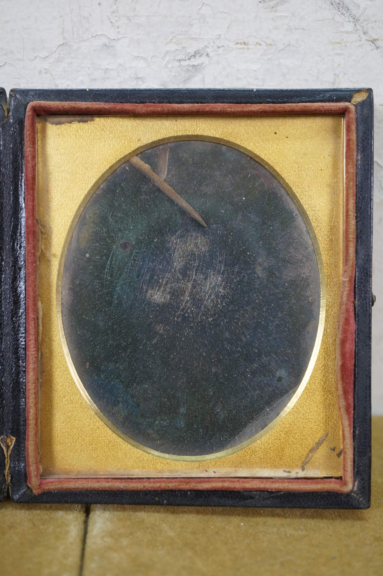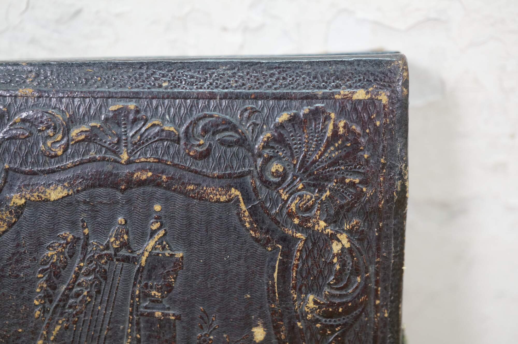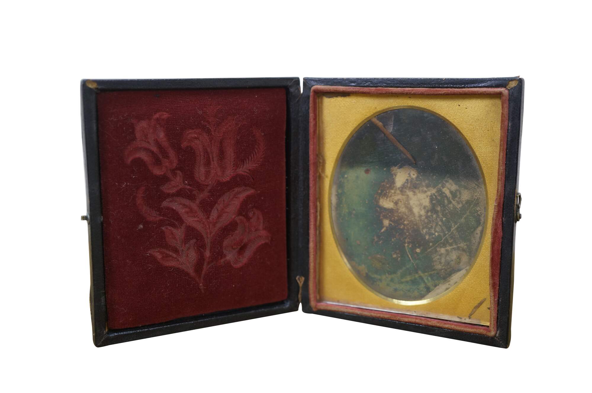 Antique, mid-1800s daguerreotype case, made of leather or gutta-percha, designed to hold an early photograph. The case features an ornate, embossed harp design on the cover. Daguerreotypes were the first commercially practical photographic process, popular from 1839 into the early 1860s. The cases were designed to protect the delicate image, which was made on a silver-coated copper plate.
