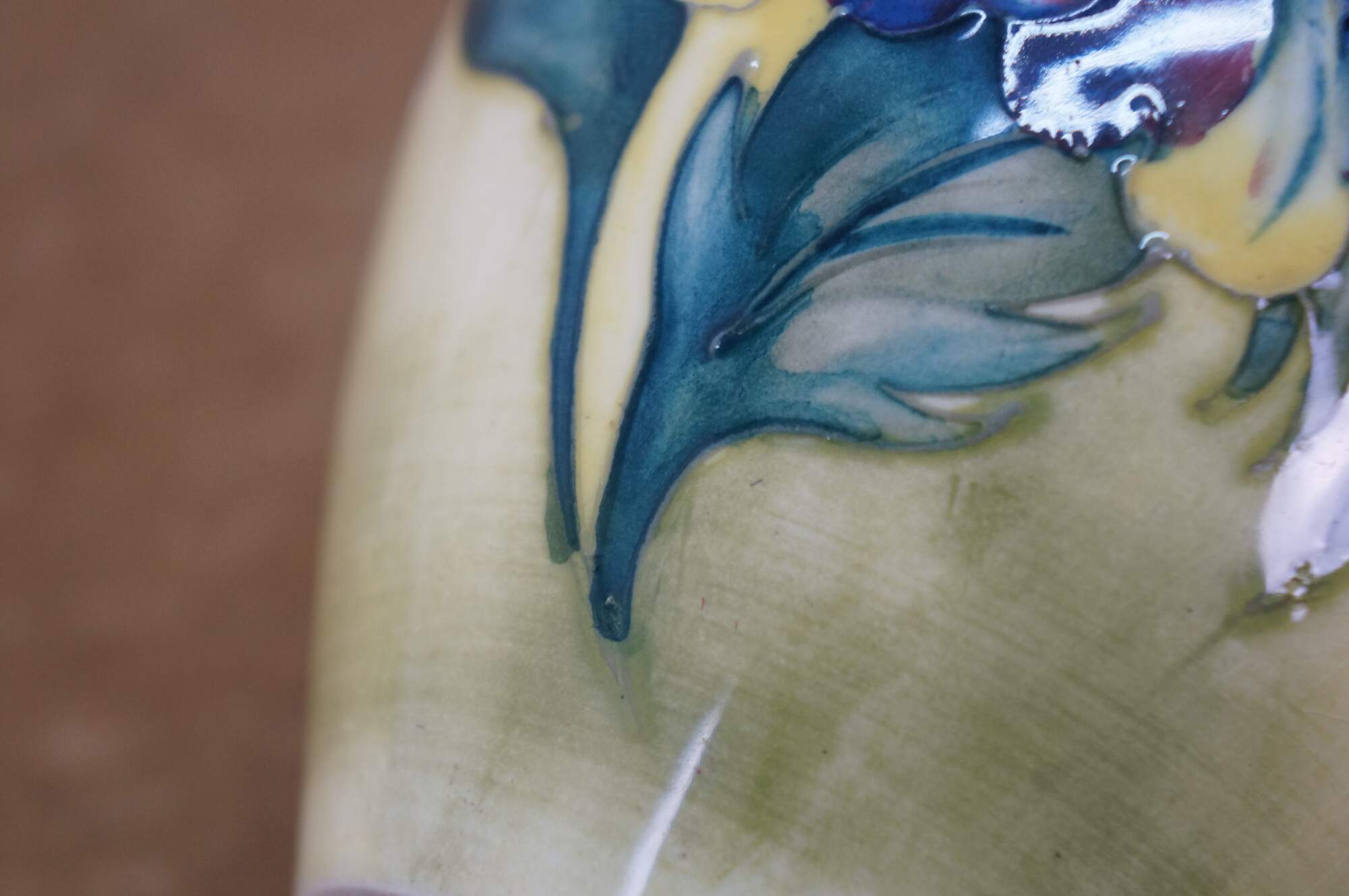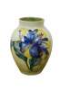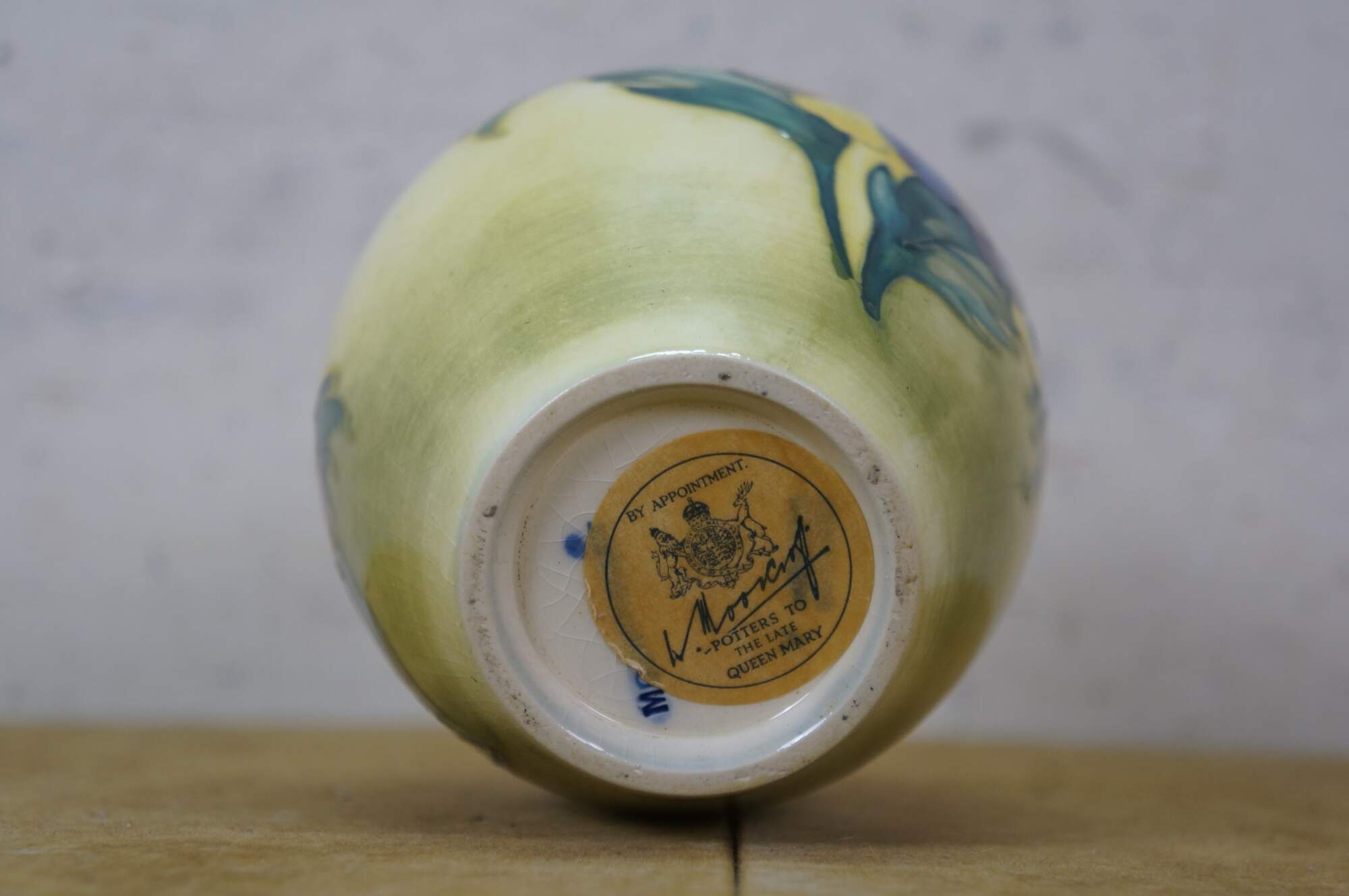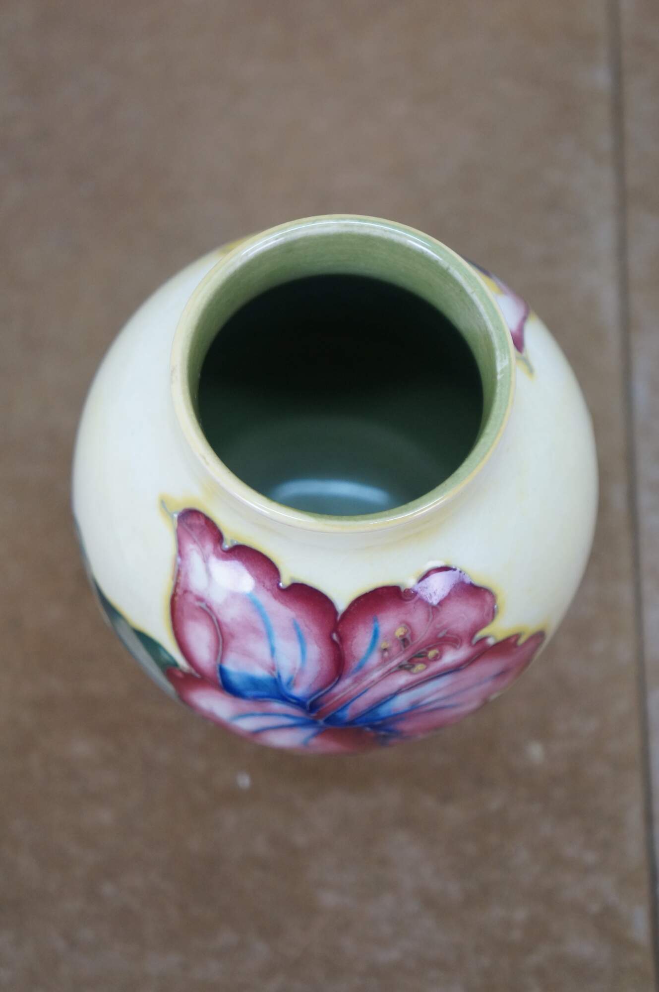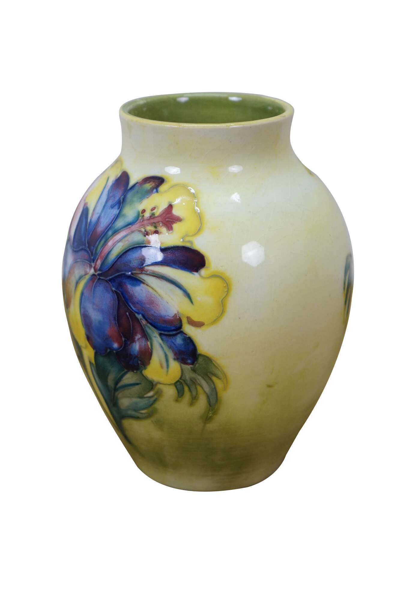 Mid Century Moorcroft pottery vase in the Hibiscus pattern. The vase features large blue and yellow hibiscus flowers with green leaves on a cream-yellow-colored ground. It was produced by the British pottery company Moorcroft between 1947 and 1953. The pattern was designed by Walter Moorcroft and crafted in Stoke-on-Trent, England.