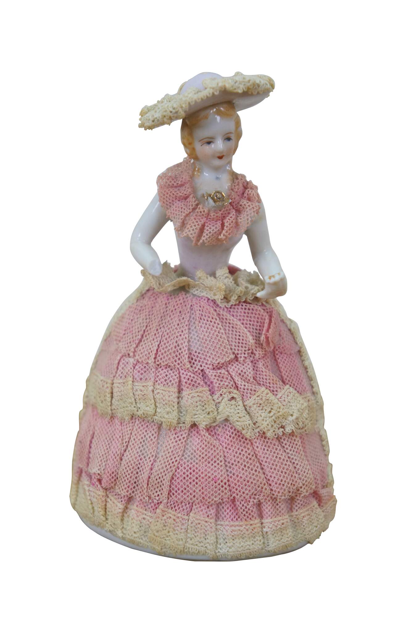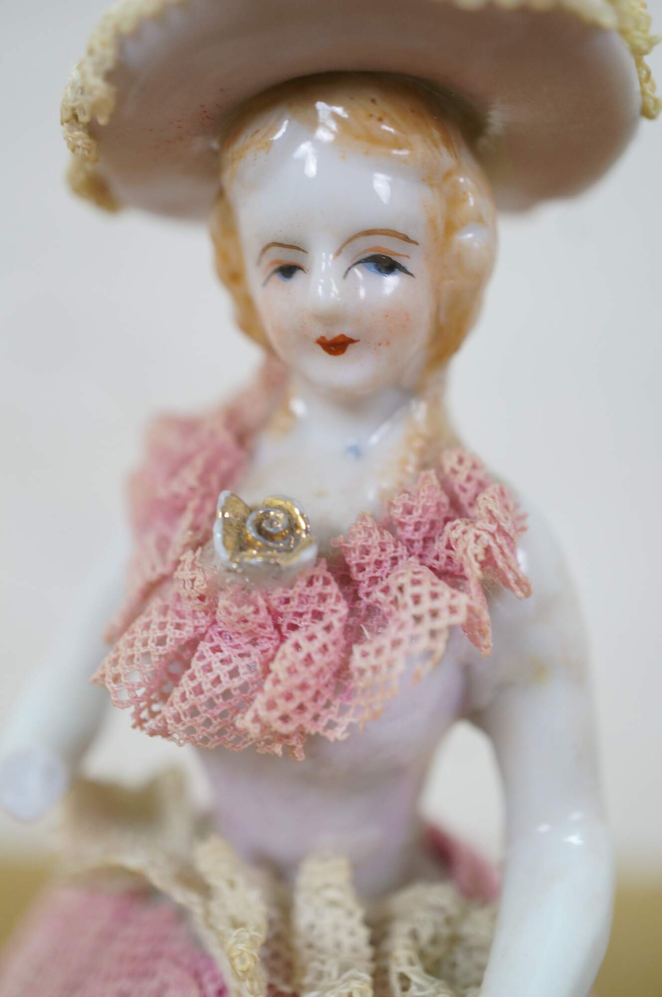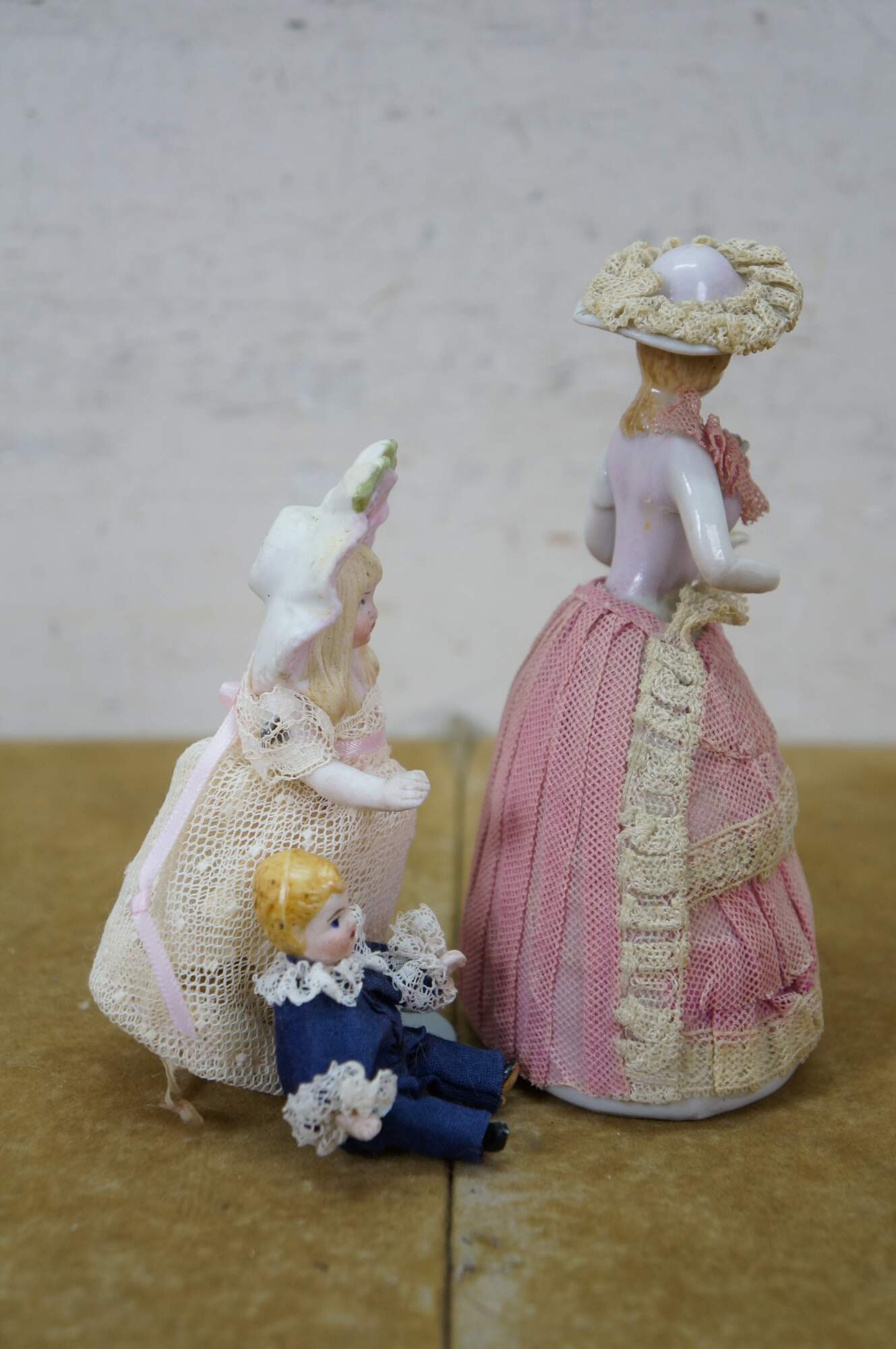 Three vintage German porcelain doll figurines. One Dresden Style Victorian woman in lace dress, and two Bisque - little boy and girl figurines.