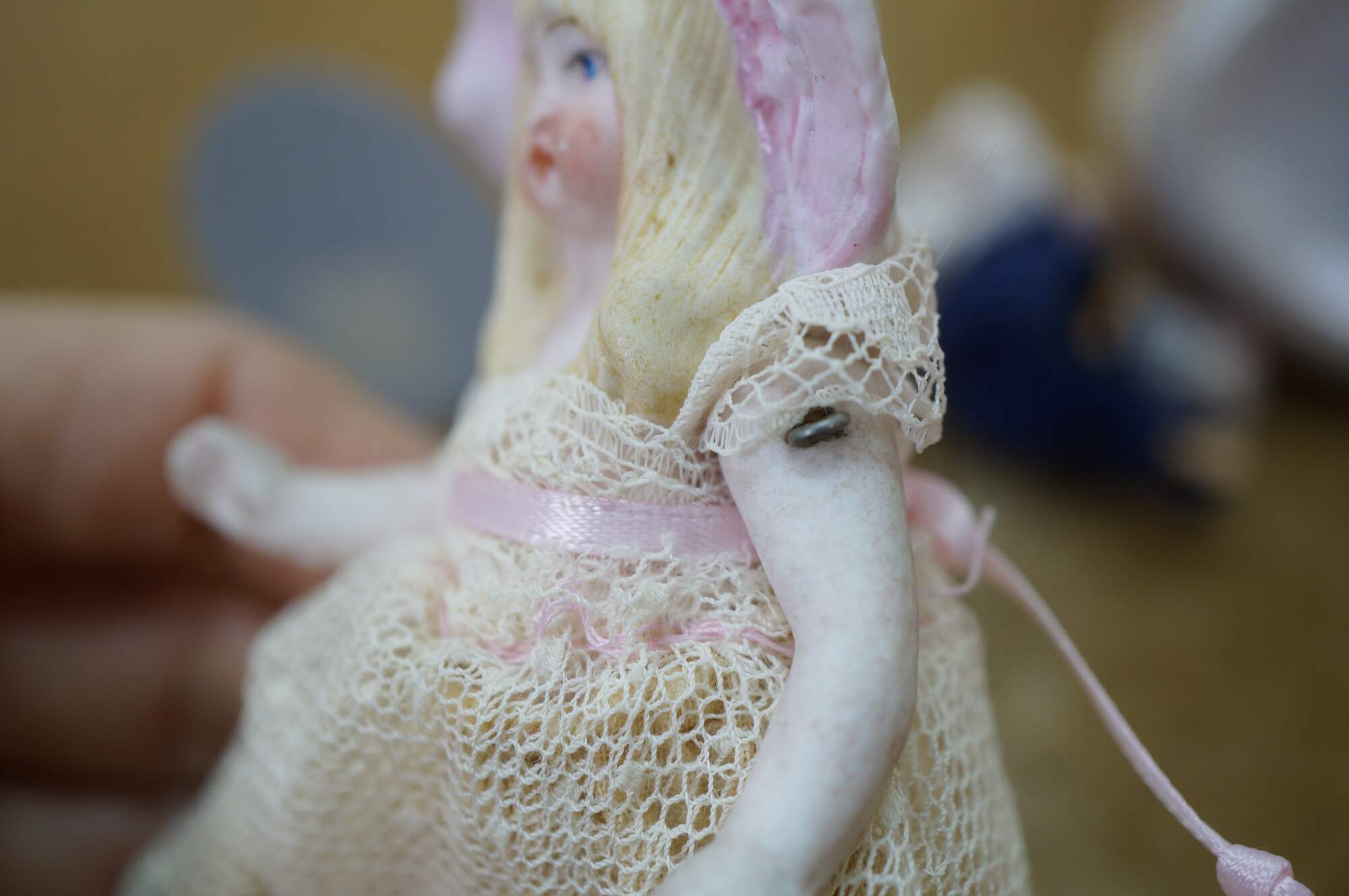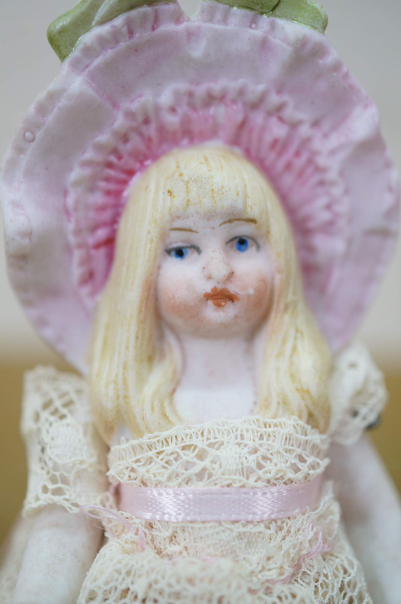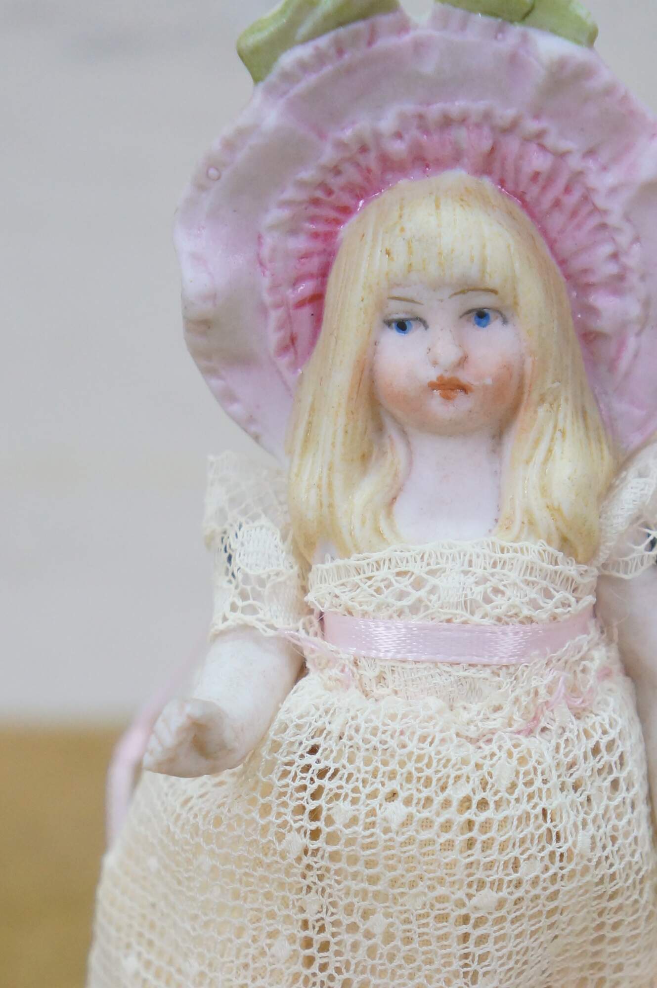Three vintage German porcelain doll figurines. One Dresden Style Victorian woman in lace dress, and two Bisque - little boy and girl figurines.