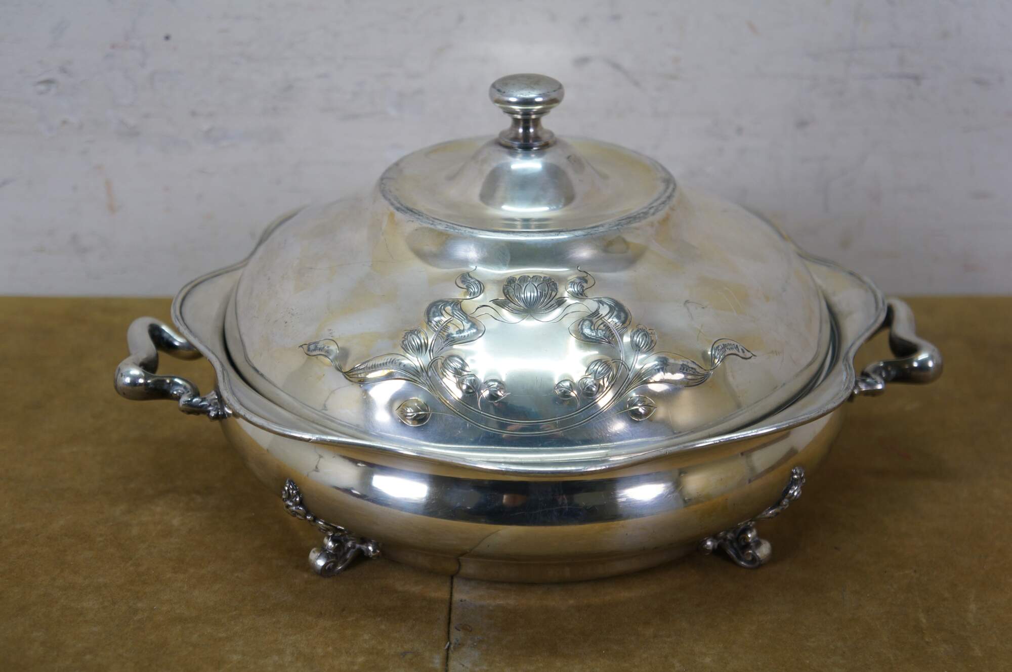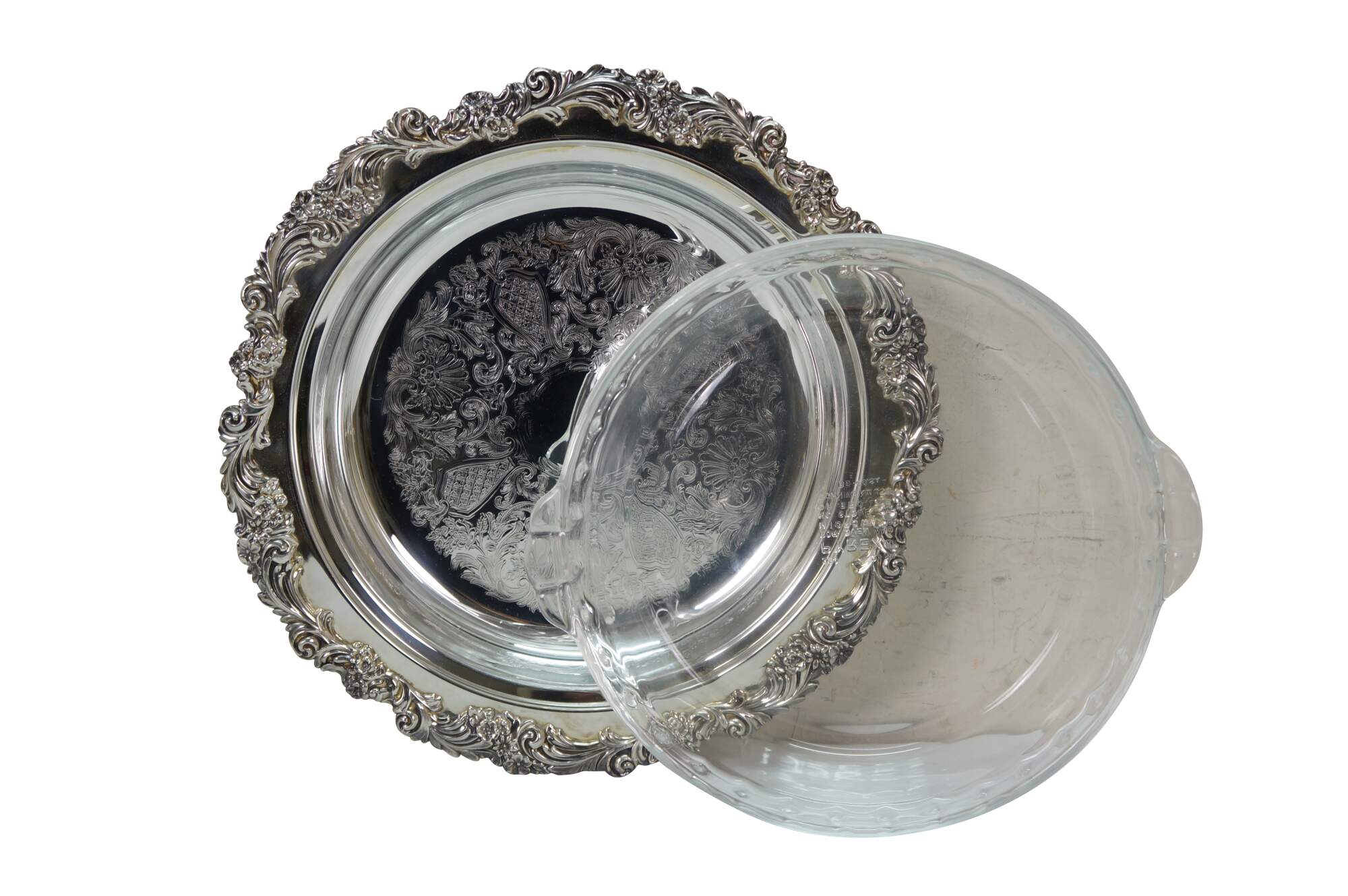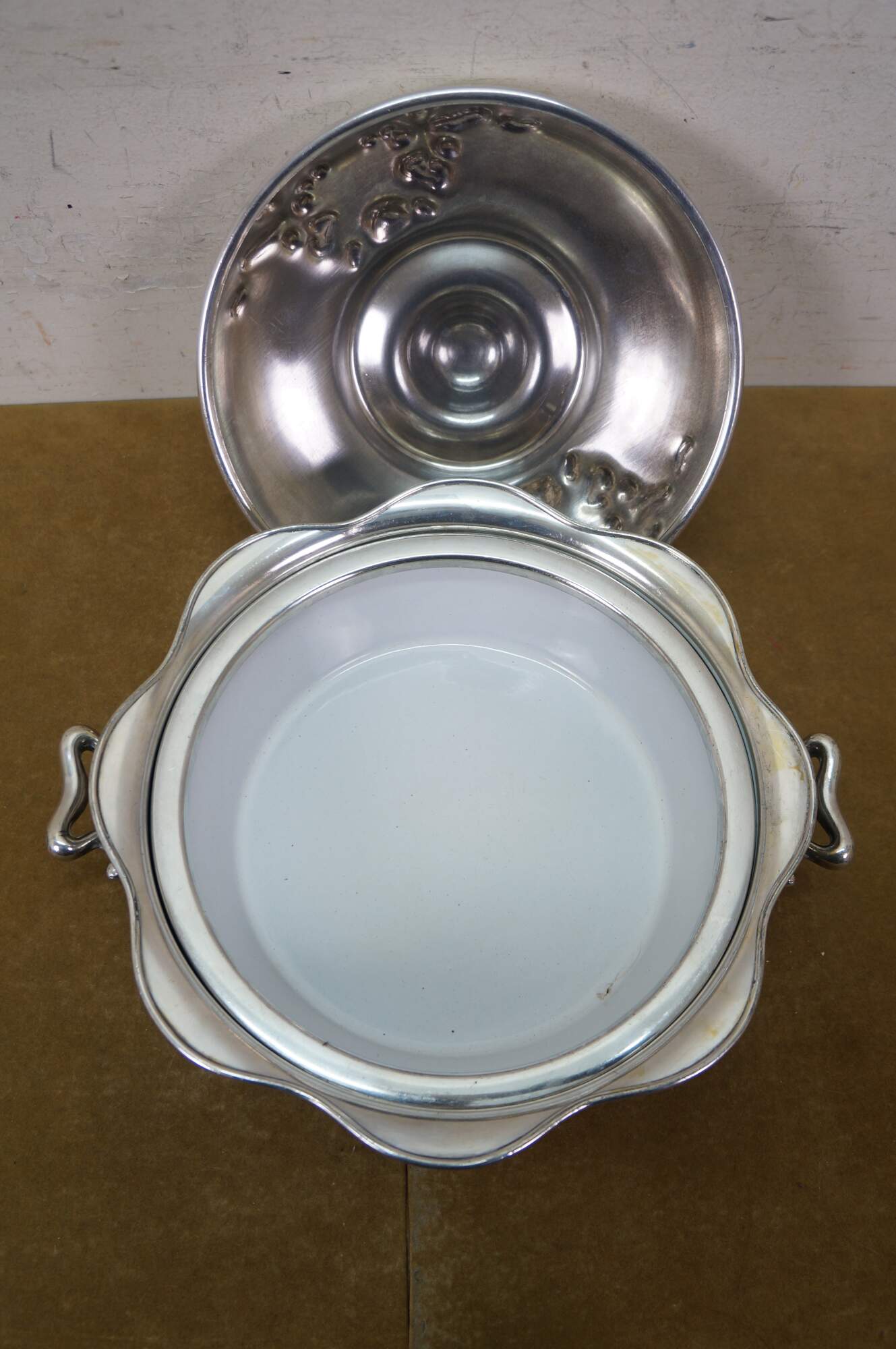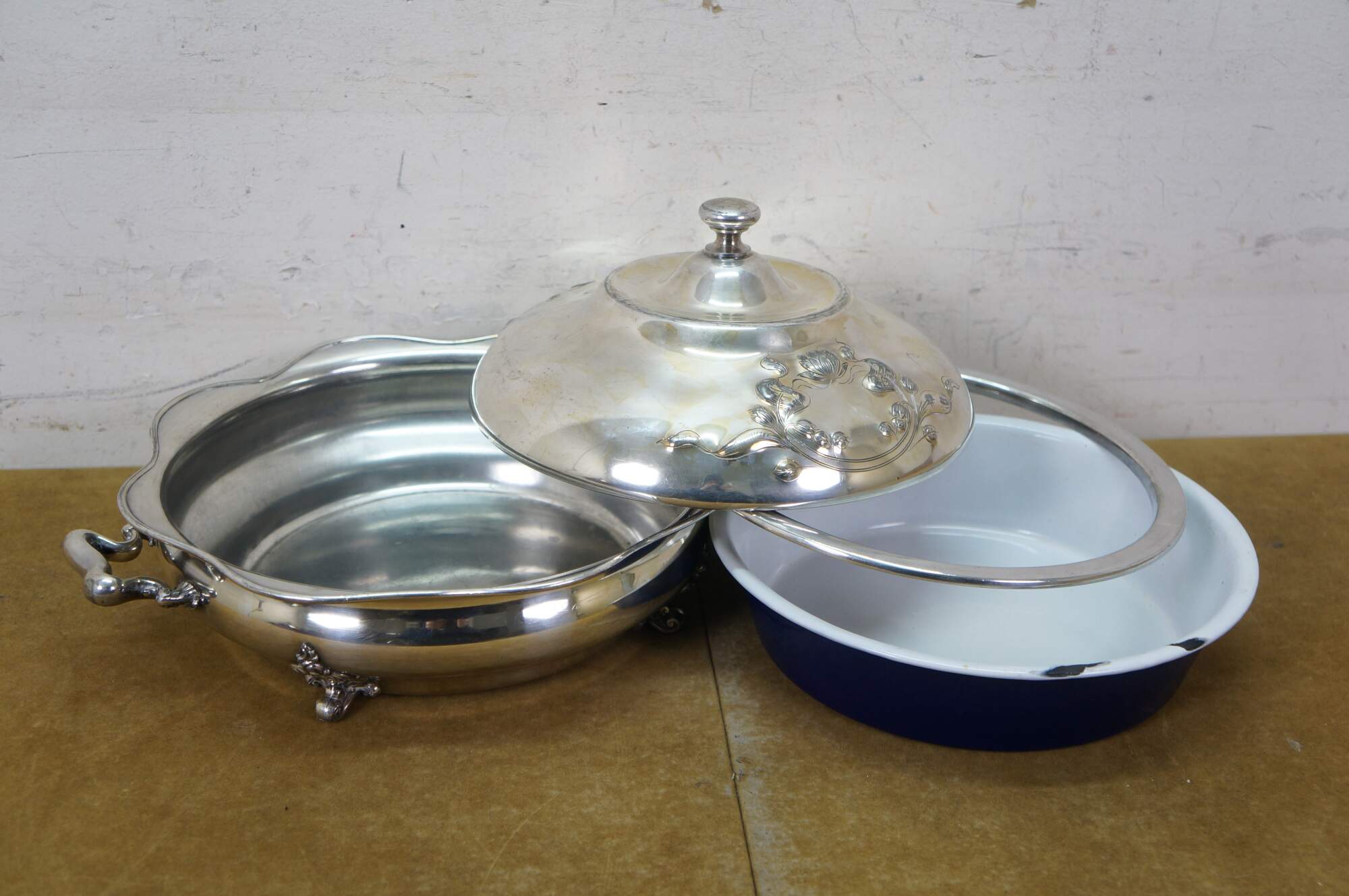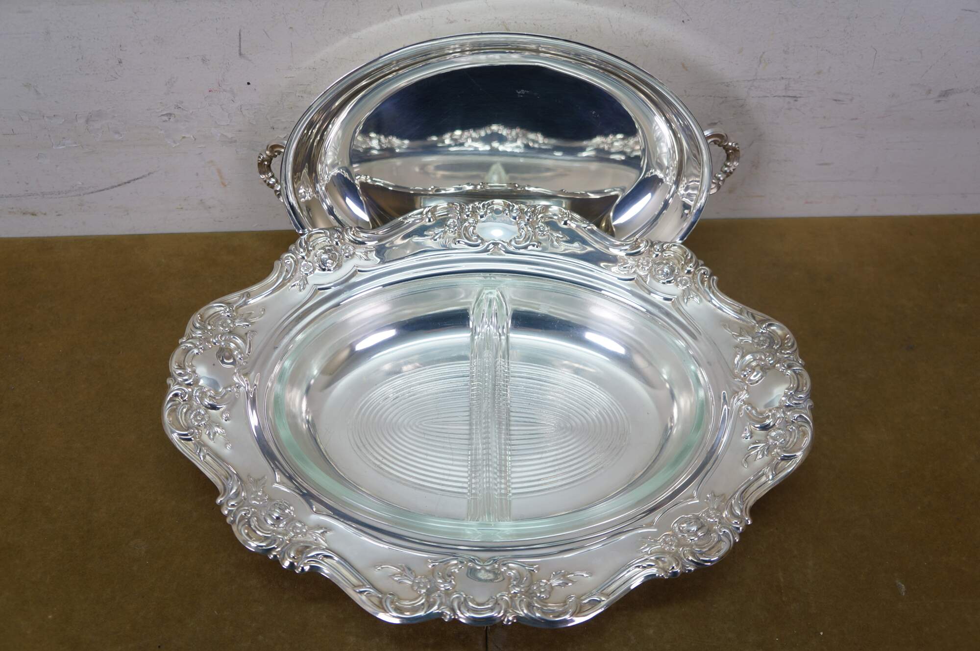 Three vintage lidded, footed silver plate tureens or casserole dishes. One Reed & Barton Burgundy scalloped floral acanthus platter with pyrex insert; one 4pc antique Eureka 2607 quadruple silver plate lidded / handled / footed tureen with enamelware insert and dish guard; and one 3pc Towle 4066 scalloped oval tureen with divided dish insert.