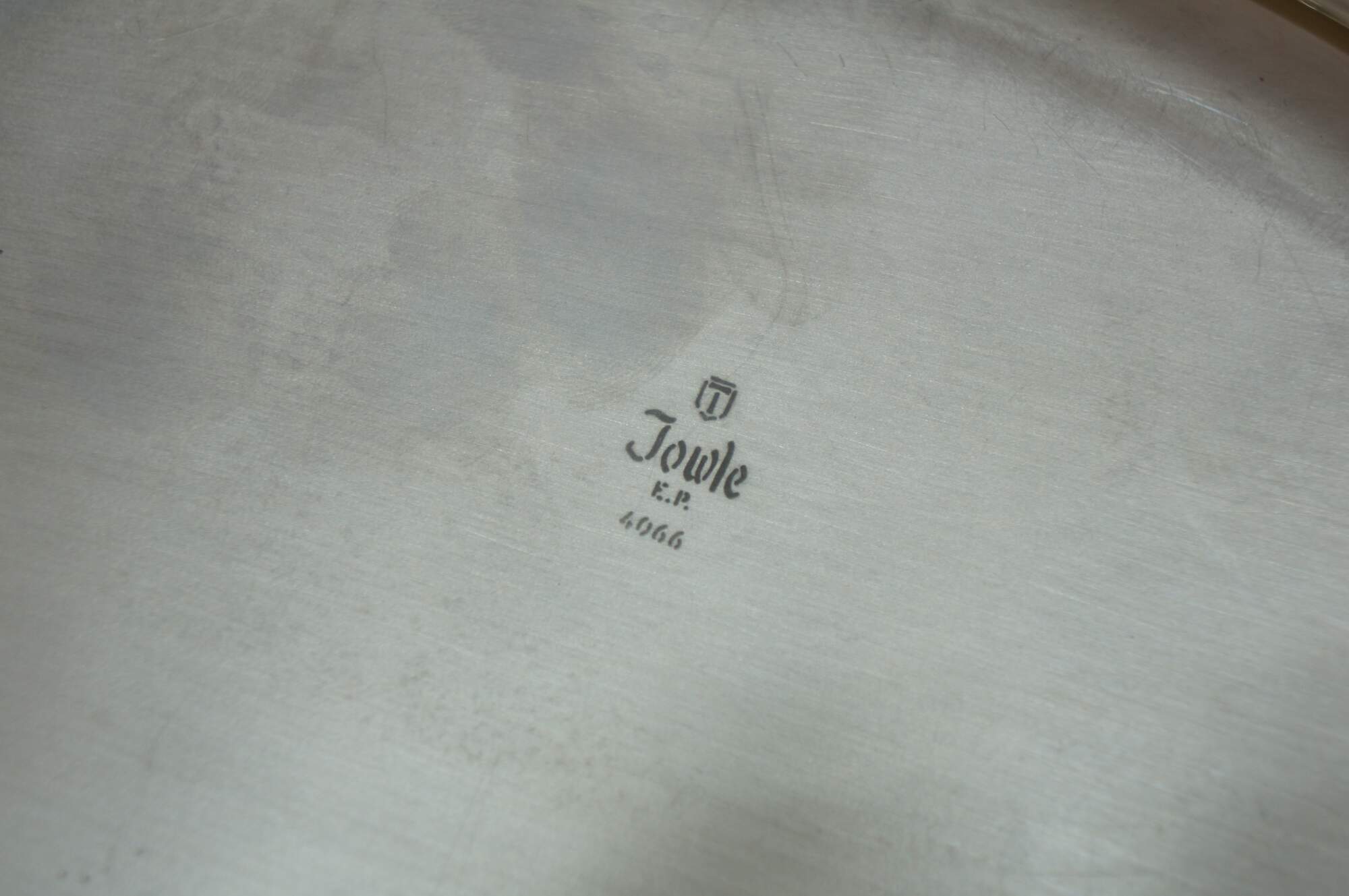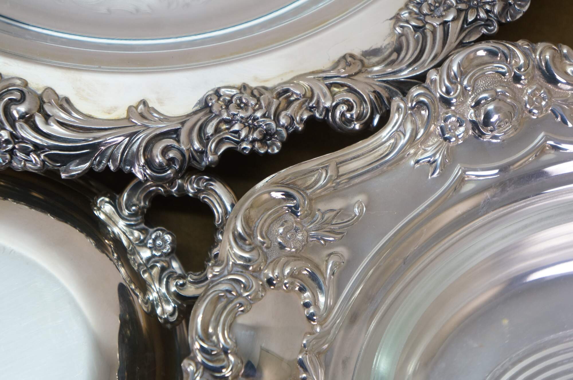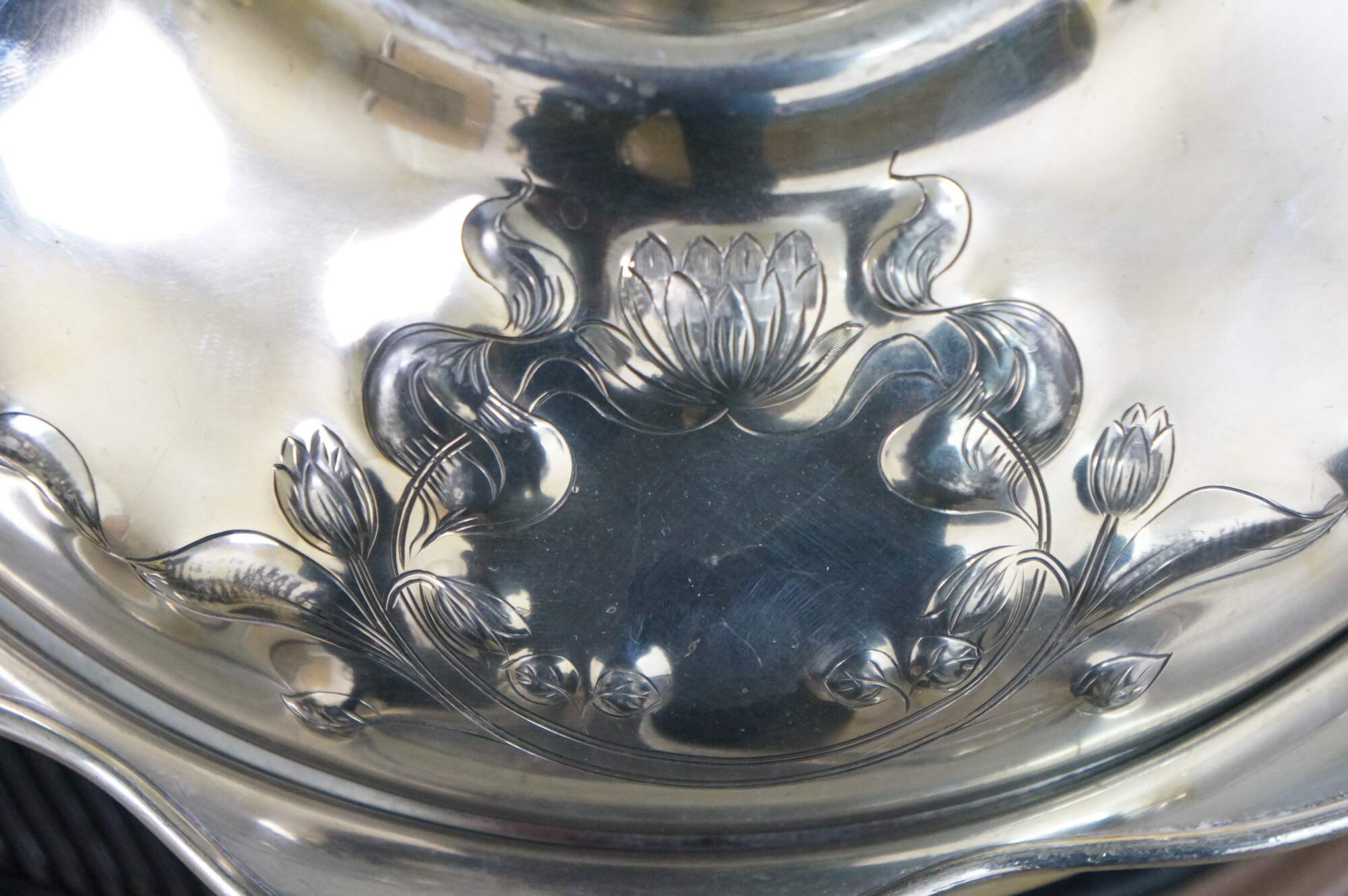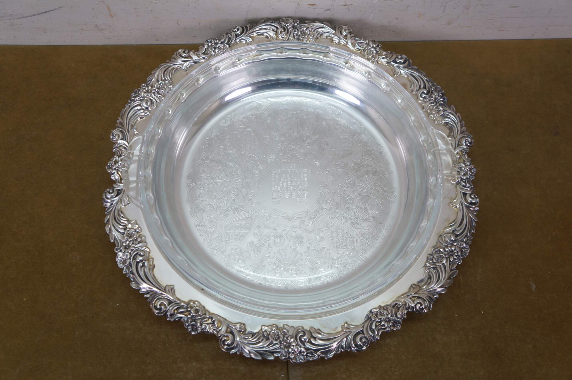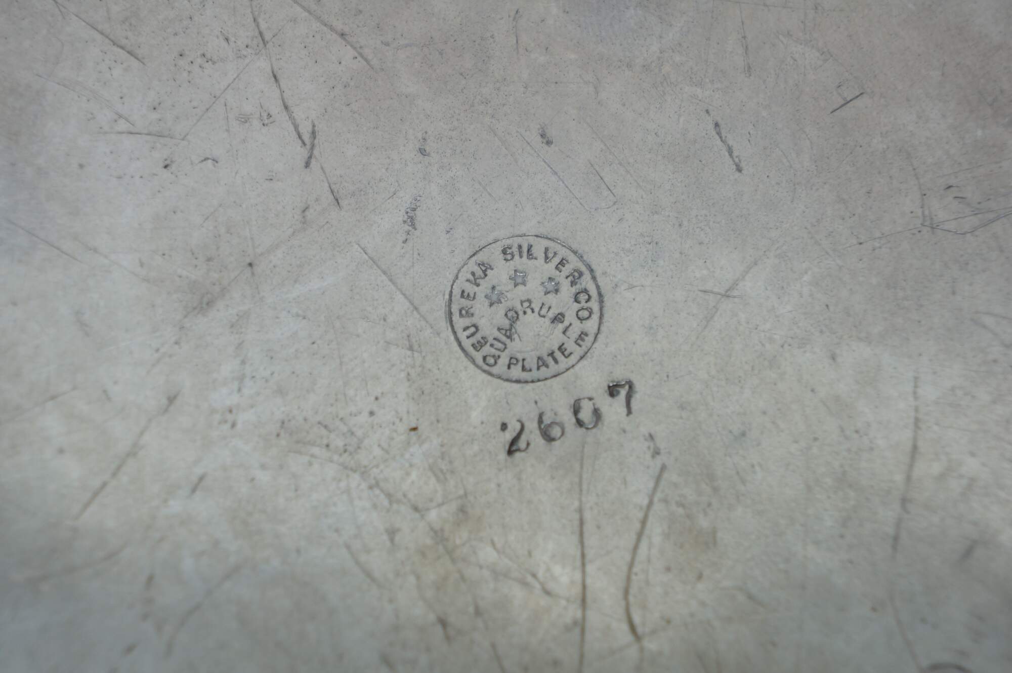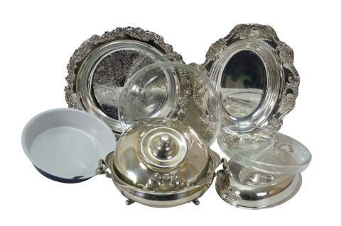 Three vintage lidded, footed silver plate tureens or casserole dishes. One Reed & Barton Burgundy scalloped floral acanthus platter with pyrex insert; one 4pc antique Eureka 2607 quadruple silver plate lidded / handled / footed tureen with enamelware insert and dish guard; and one 3pc Towle 4066 scalloped oval tureen with divided dish insert.